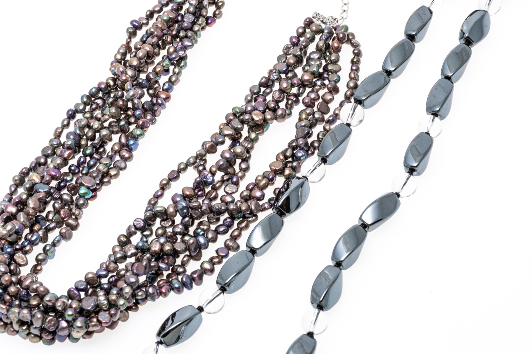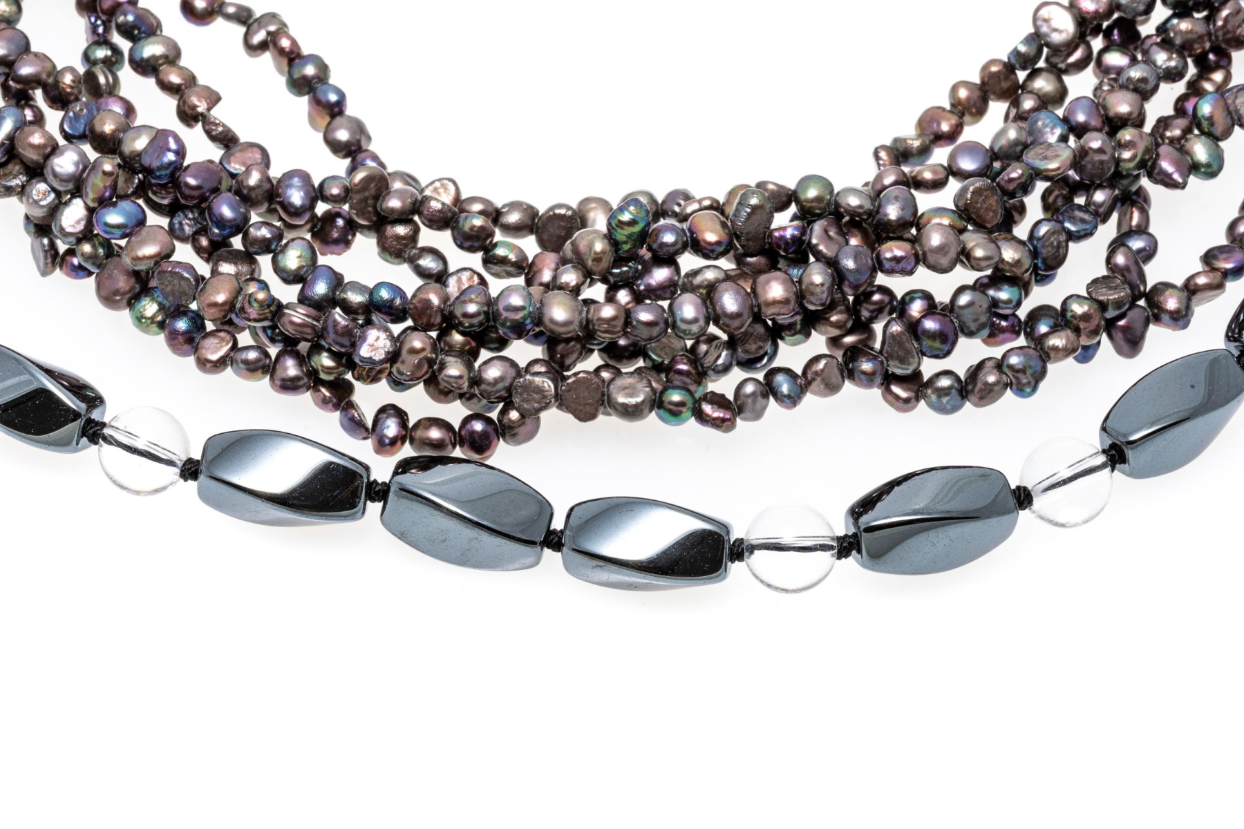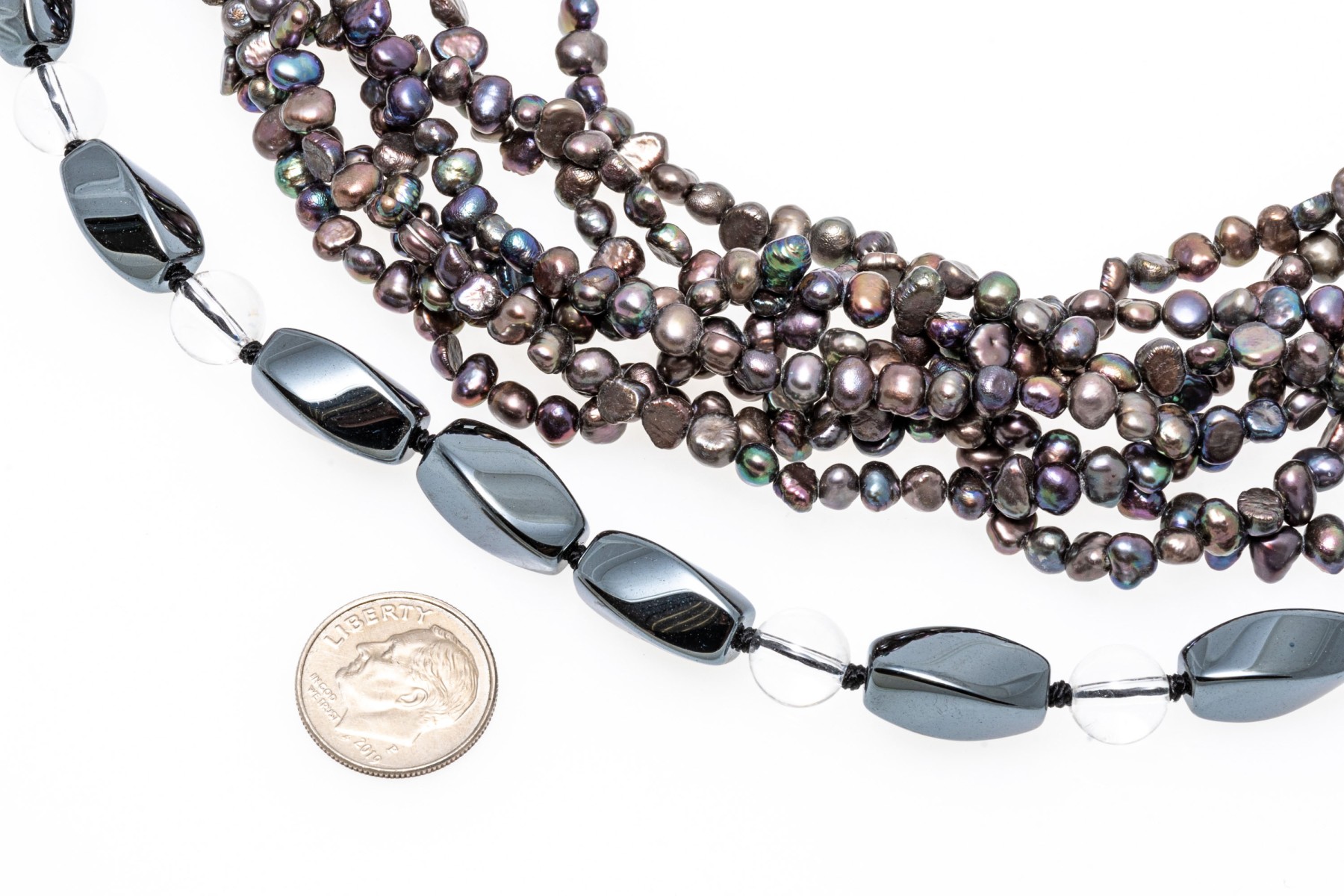 Impactful lot of contemporary hematite and grey cultured freshwater necklaces, finished with sterling silver lobster claw style clasps