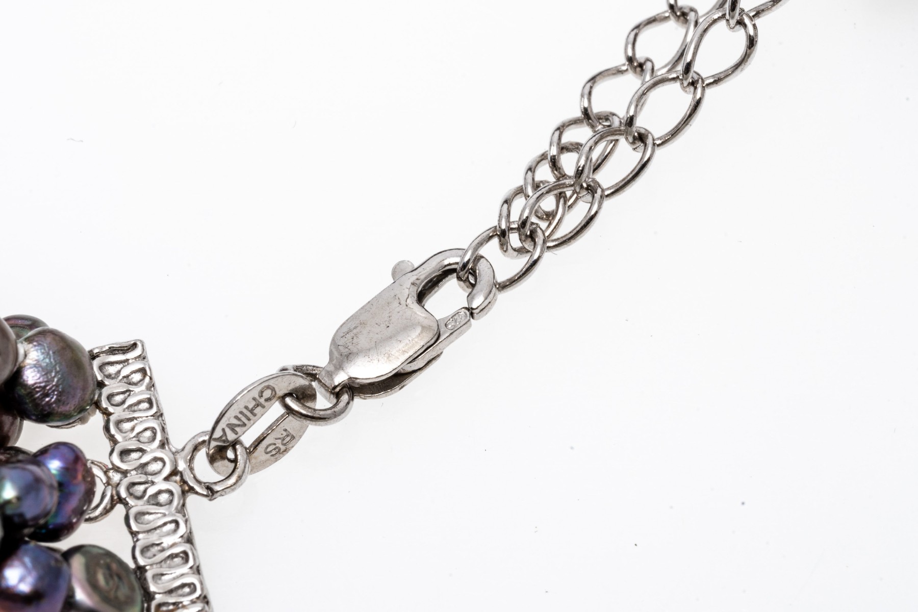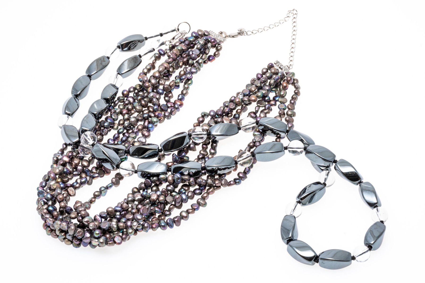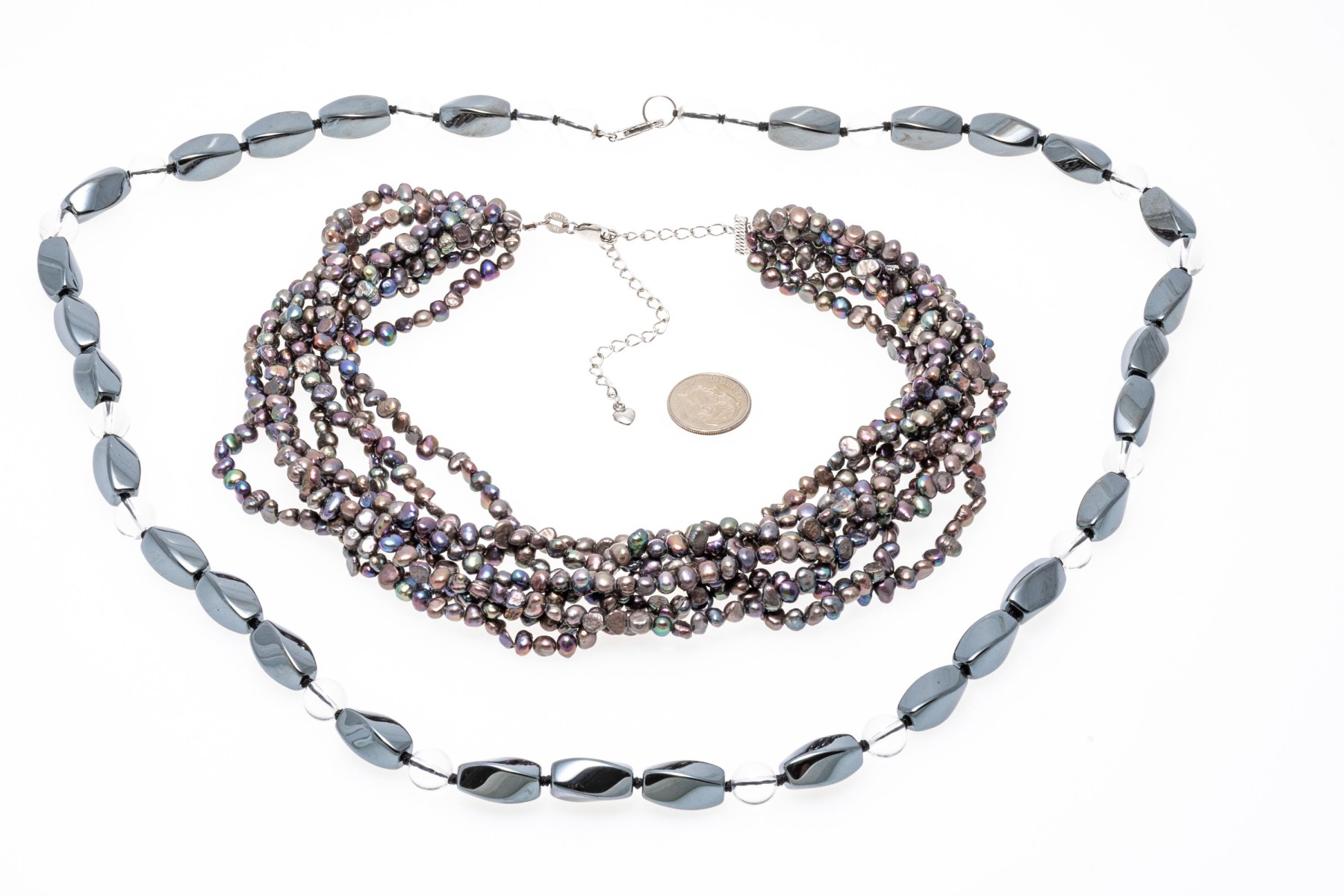 Impactful lot of contemporary hematite and grey cultured freshwater necklaces, finished with sterling silver lobster claw style clasps