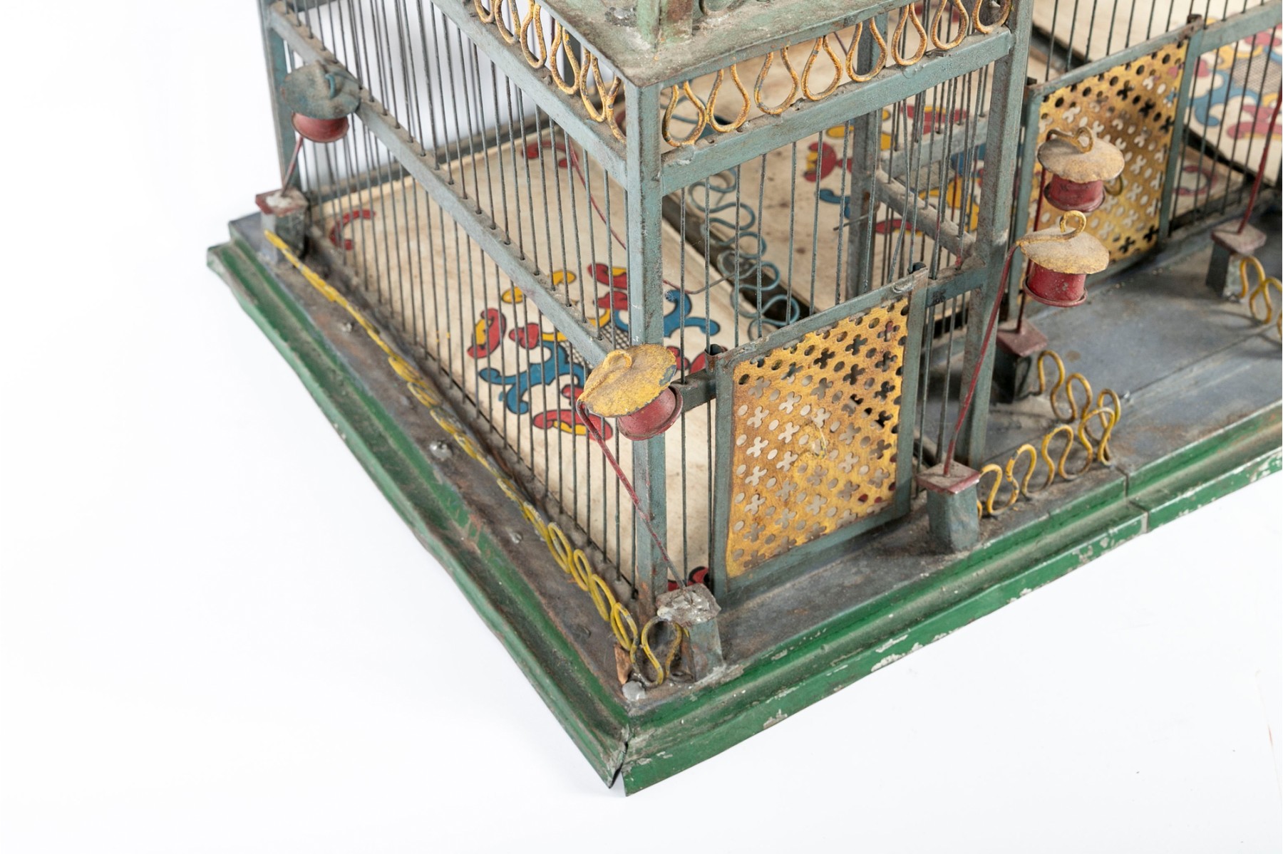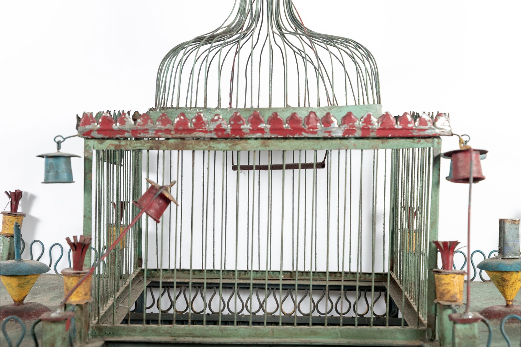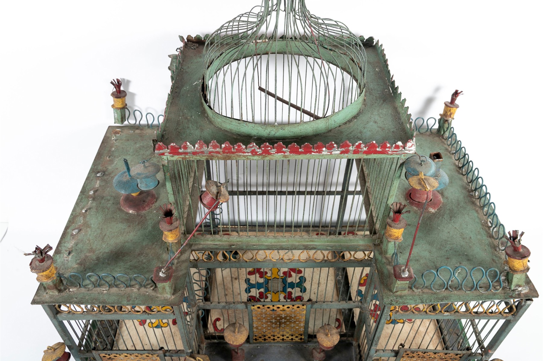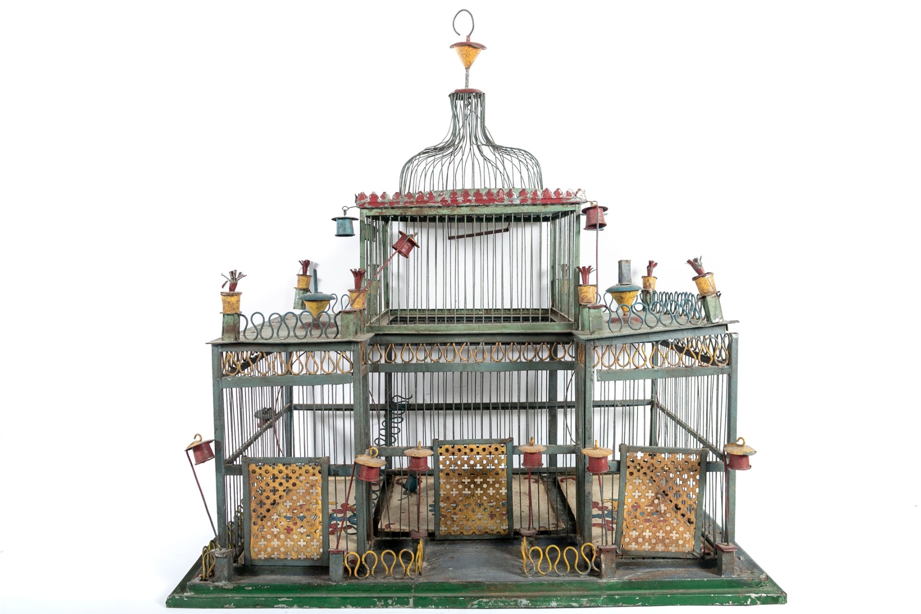 An impressive 1880's French tole birdcage in sage green, red, and yellow, displaying a rectangular main body with a raised second story topped with a domed cupola. The second story is flanked by fenced balconies with blue conical finials at the centers. The interior features three slide-out tray floors painted white with elegantly branching medallions.