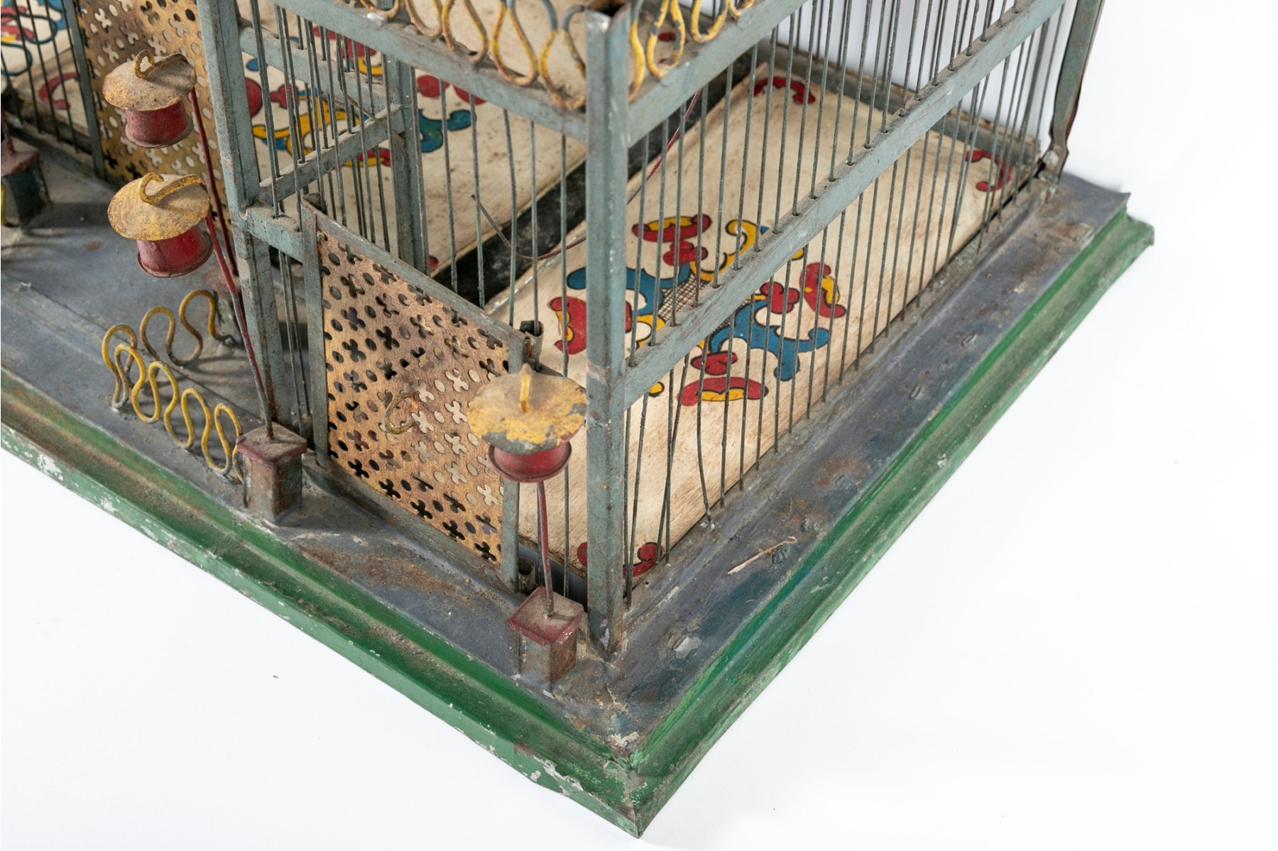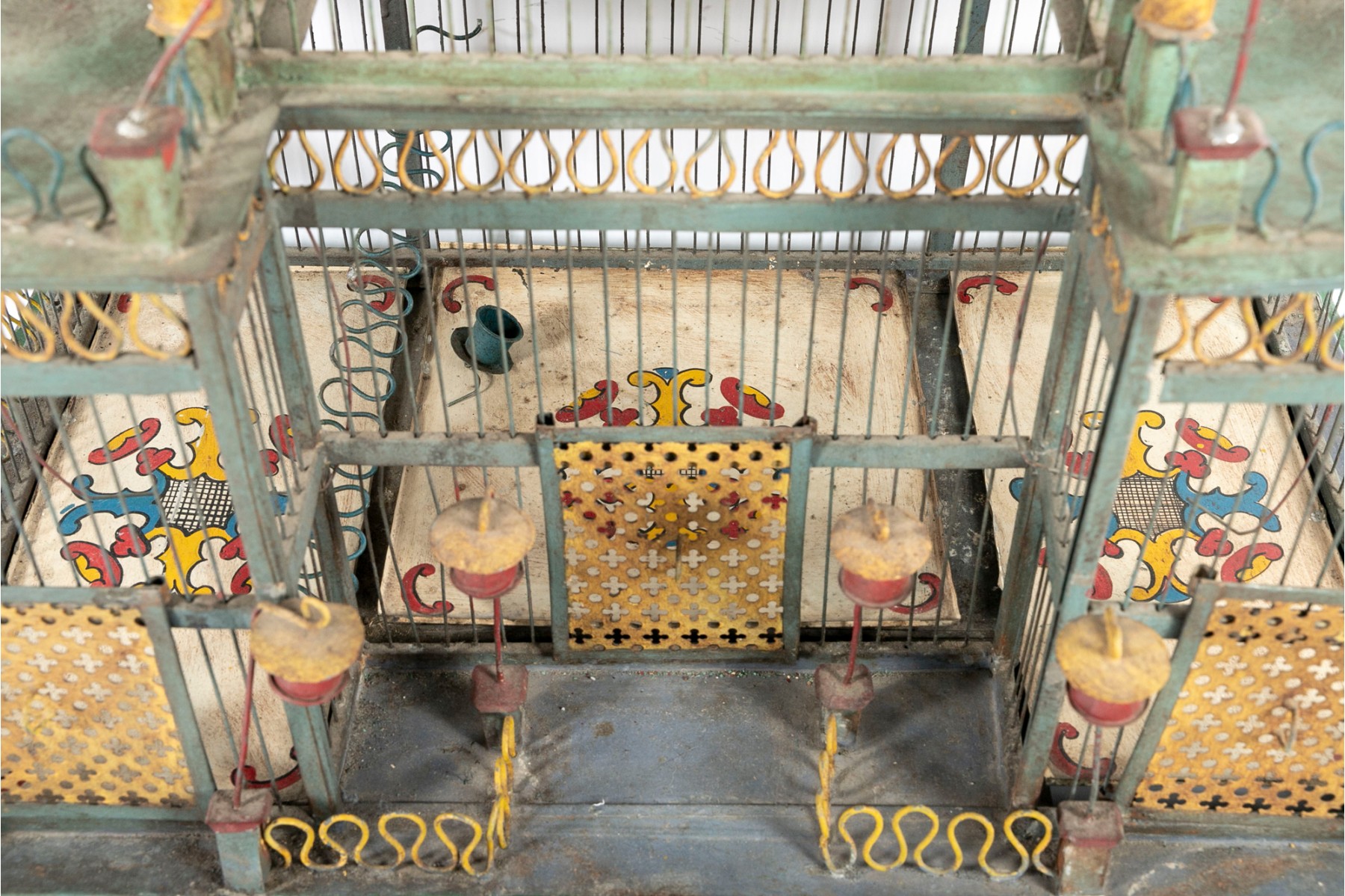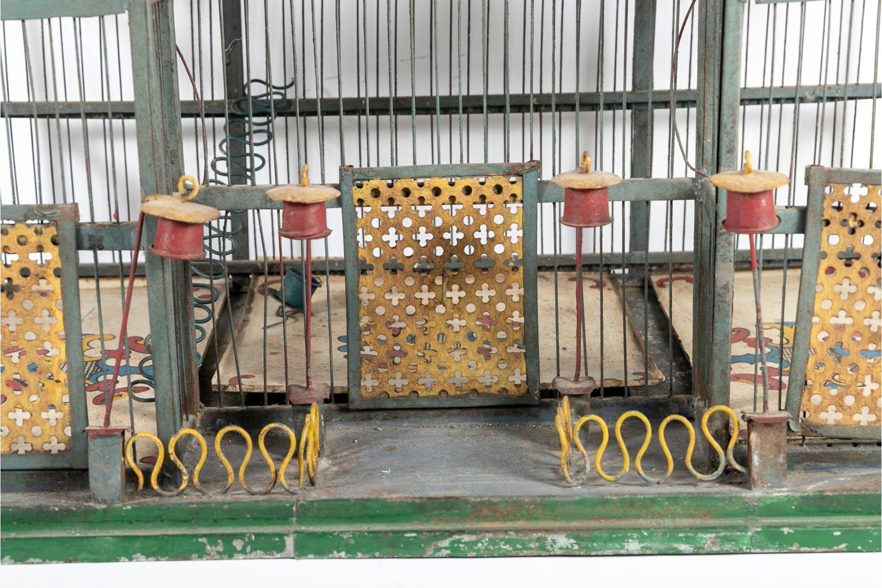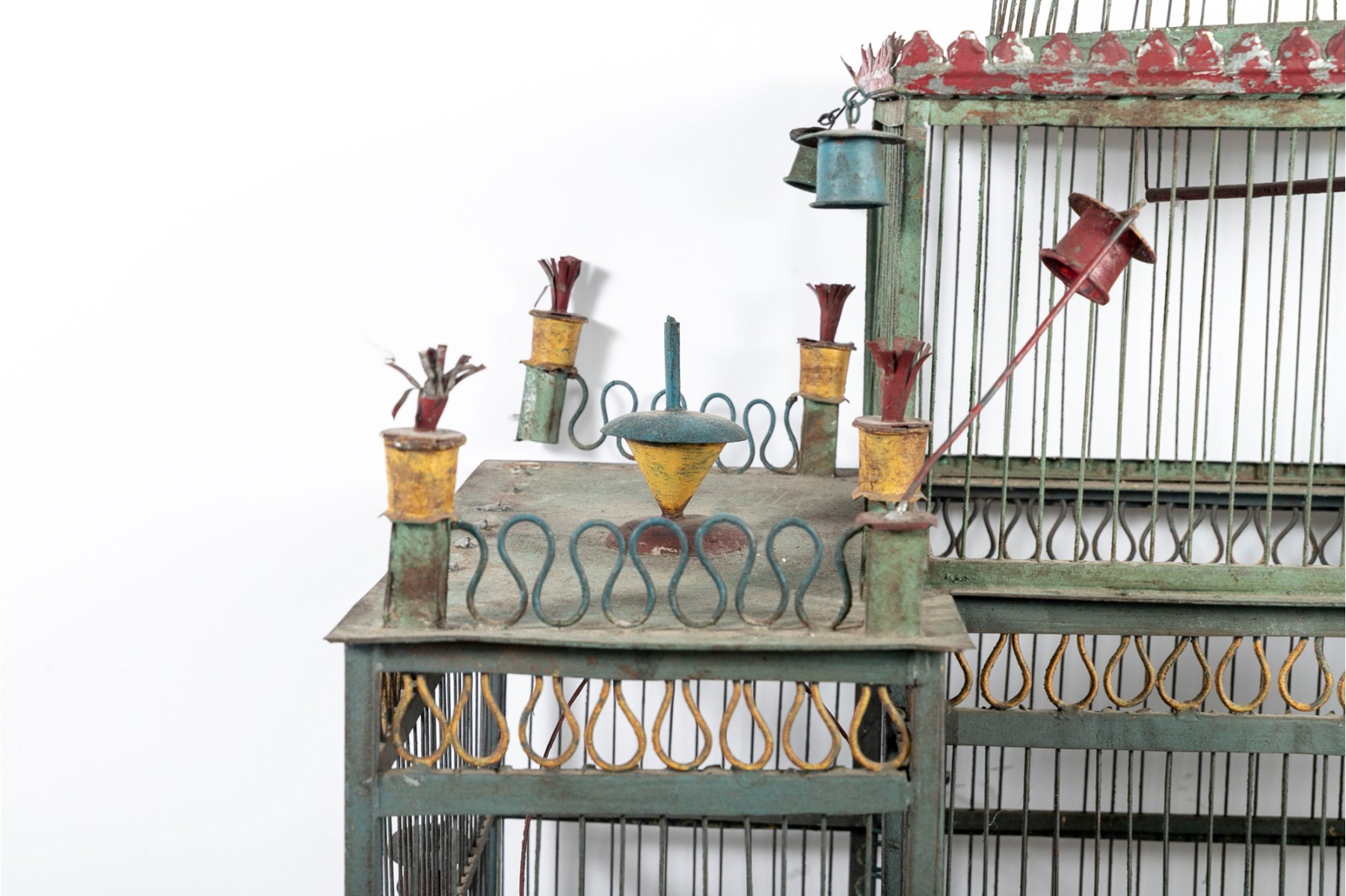 An impressive 1880's French tole birdcage in sage green, red, and yellow, displaying a rectangular main body with a raised second story topped with a domed cupola. The second story is flanked by fenced balconies with blue conical finials at the centers. The interior features three slide-out tray floors painted white with elegantly branching medallions.
