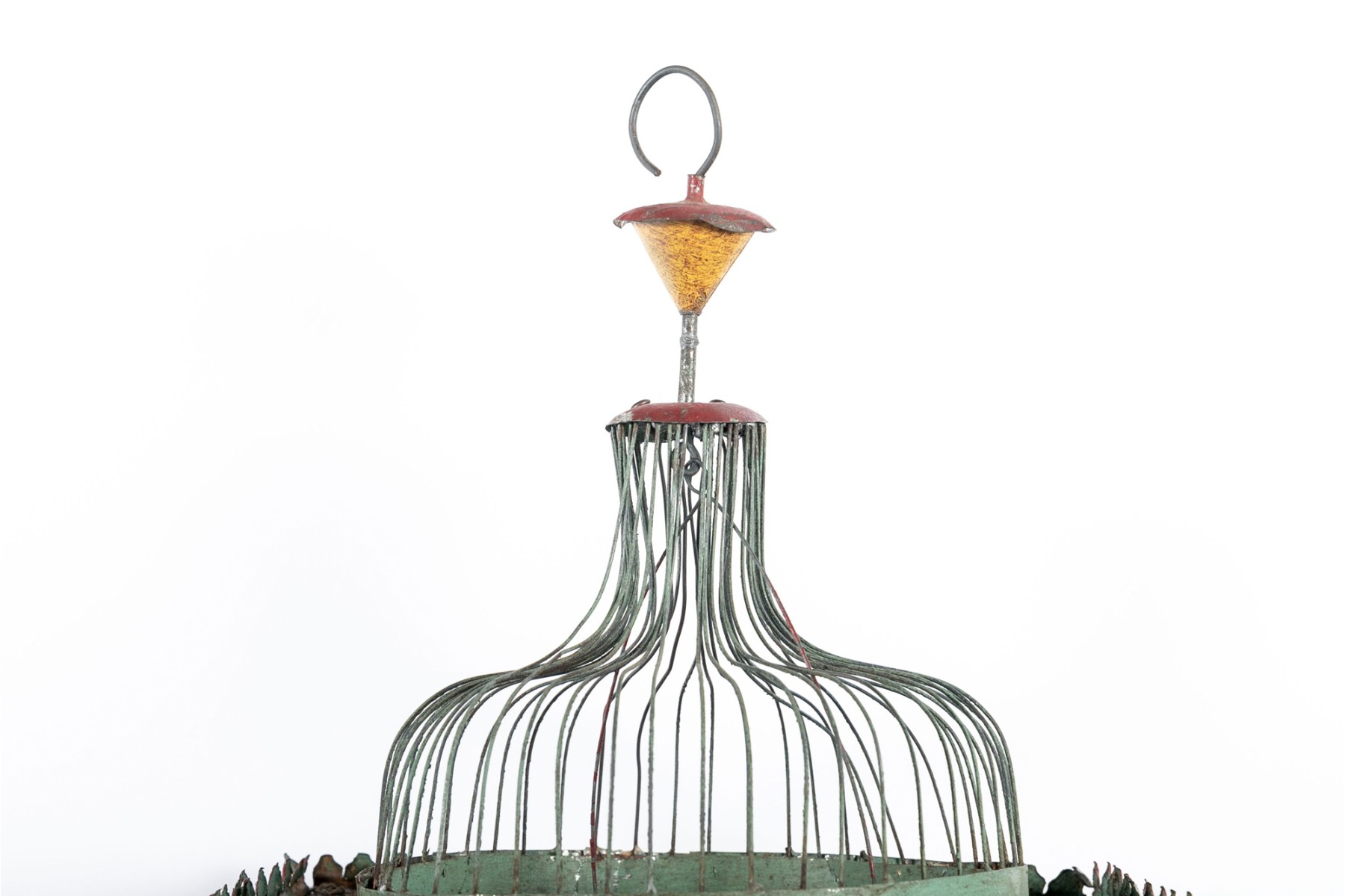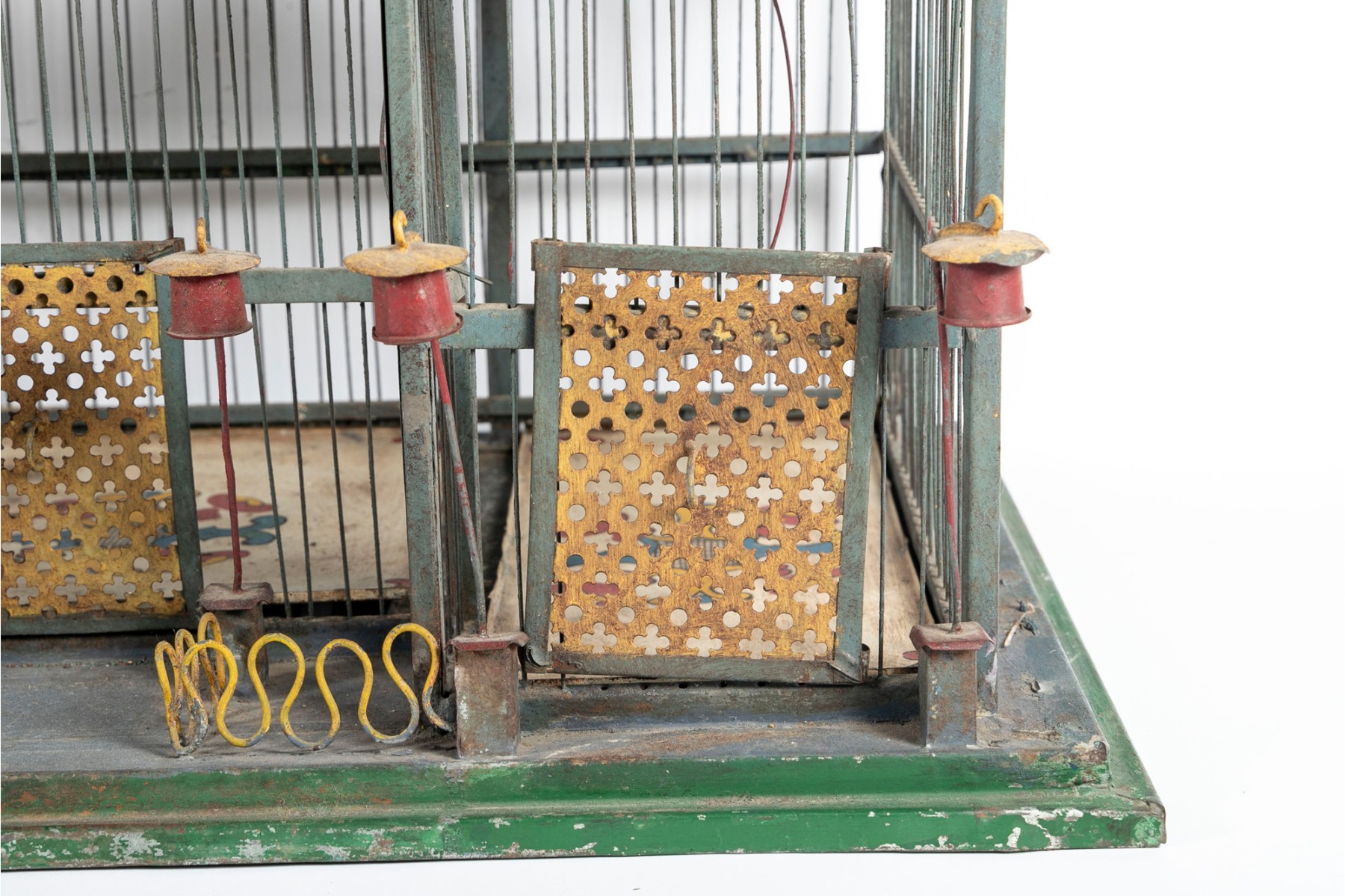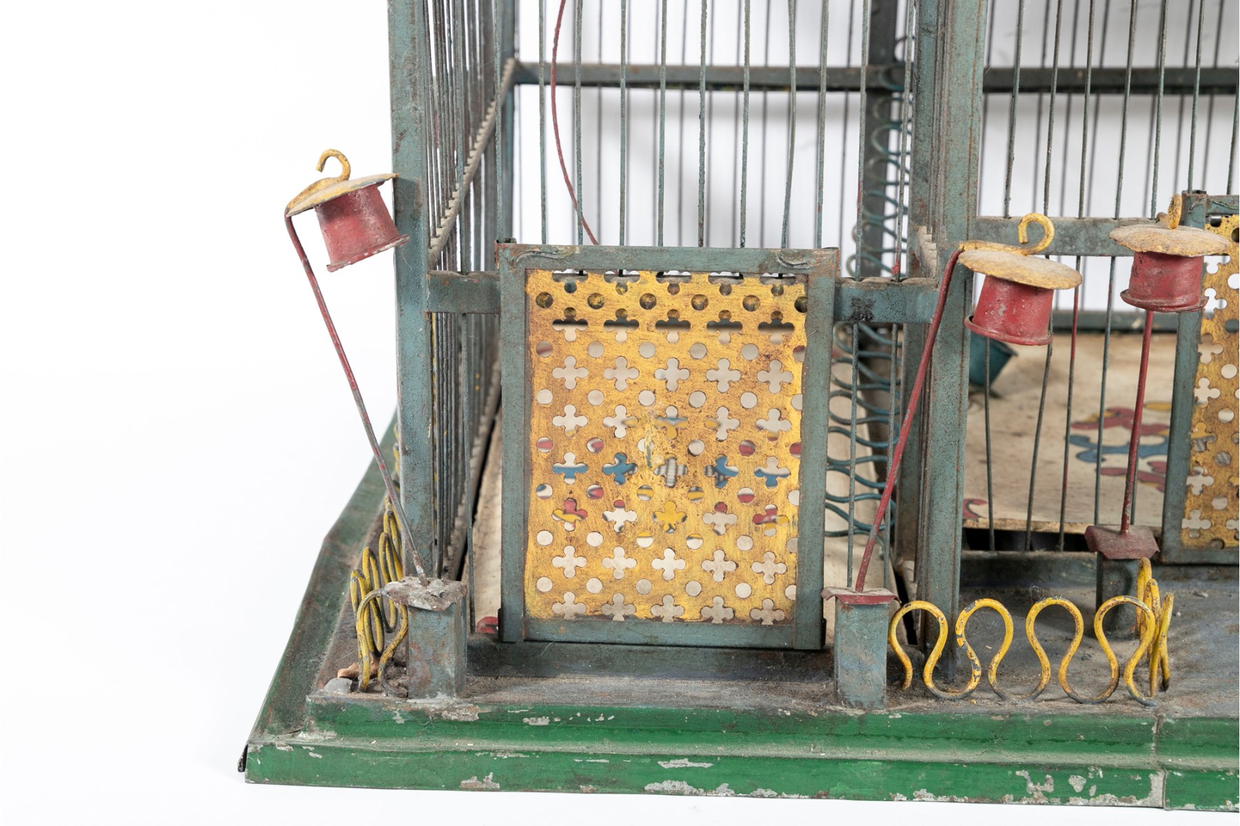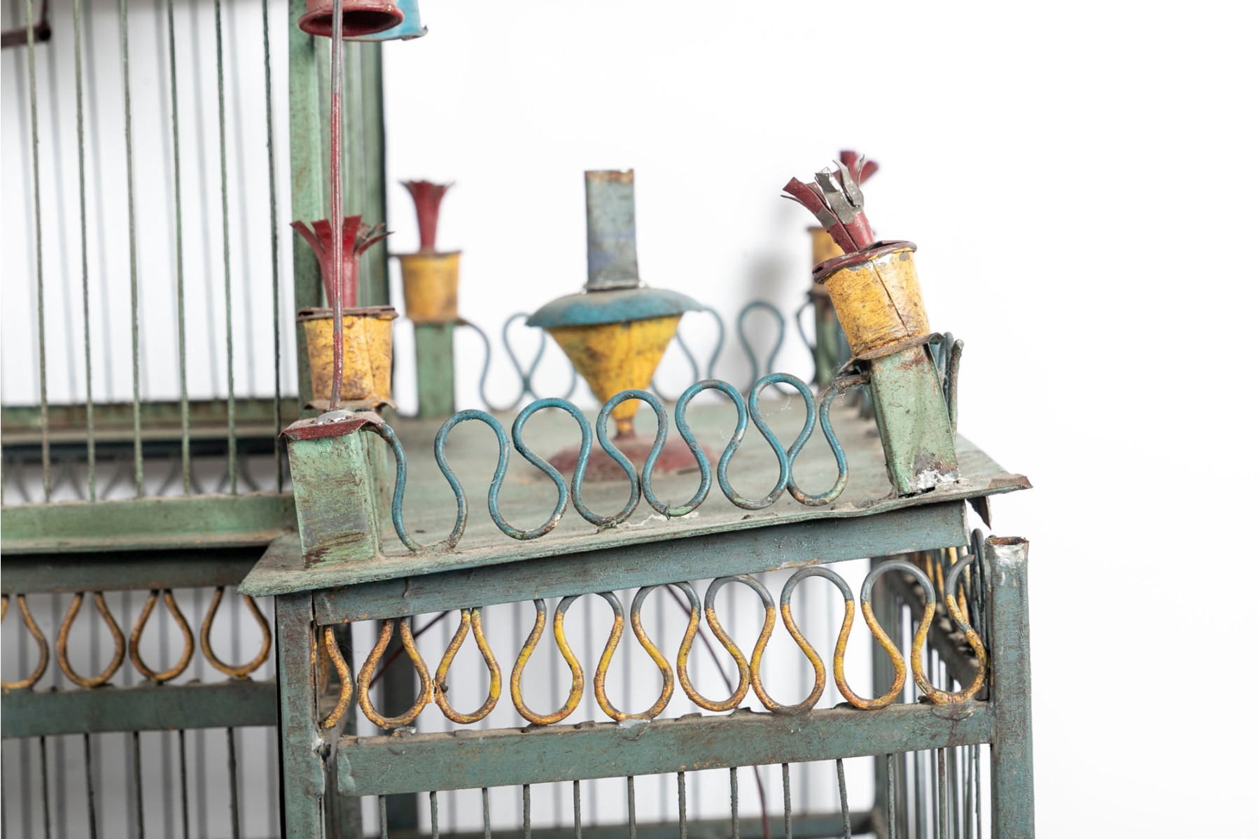 An impressive 1880's French tole birdcage in sage green, red, and yellow, displaying a rectangular main body with a raised second story topped with a domed cupola. The second story is flanked by fenced balconies with blue conical finials at the centers. The interior features three slide-out tray floors painted white with elegantly branching medallions.