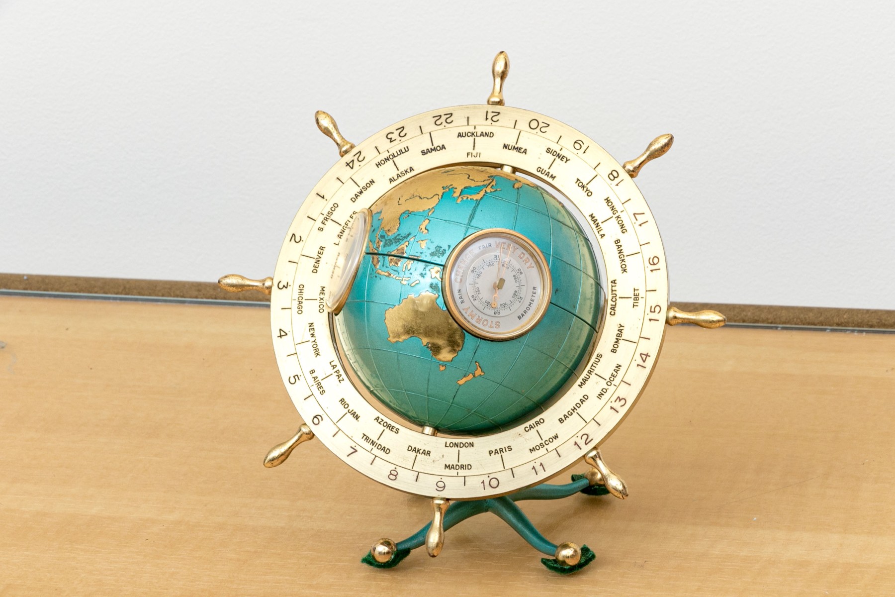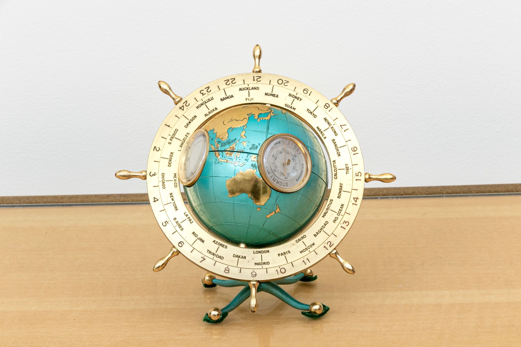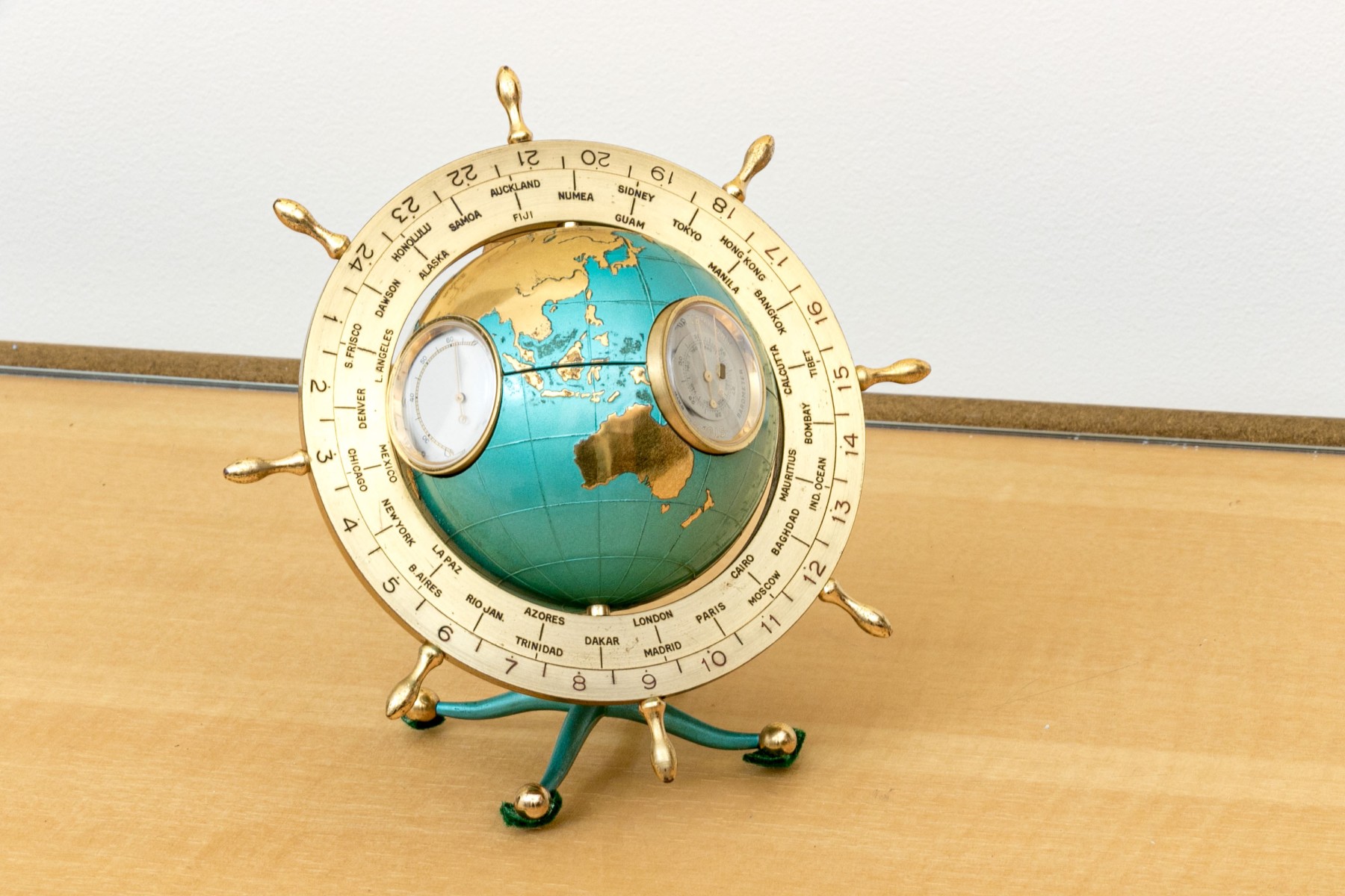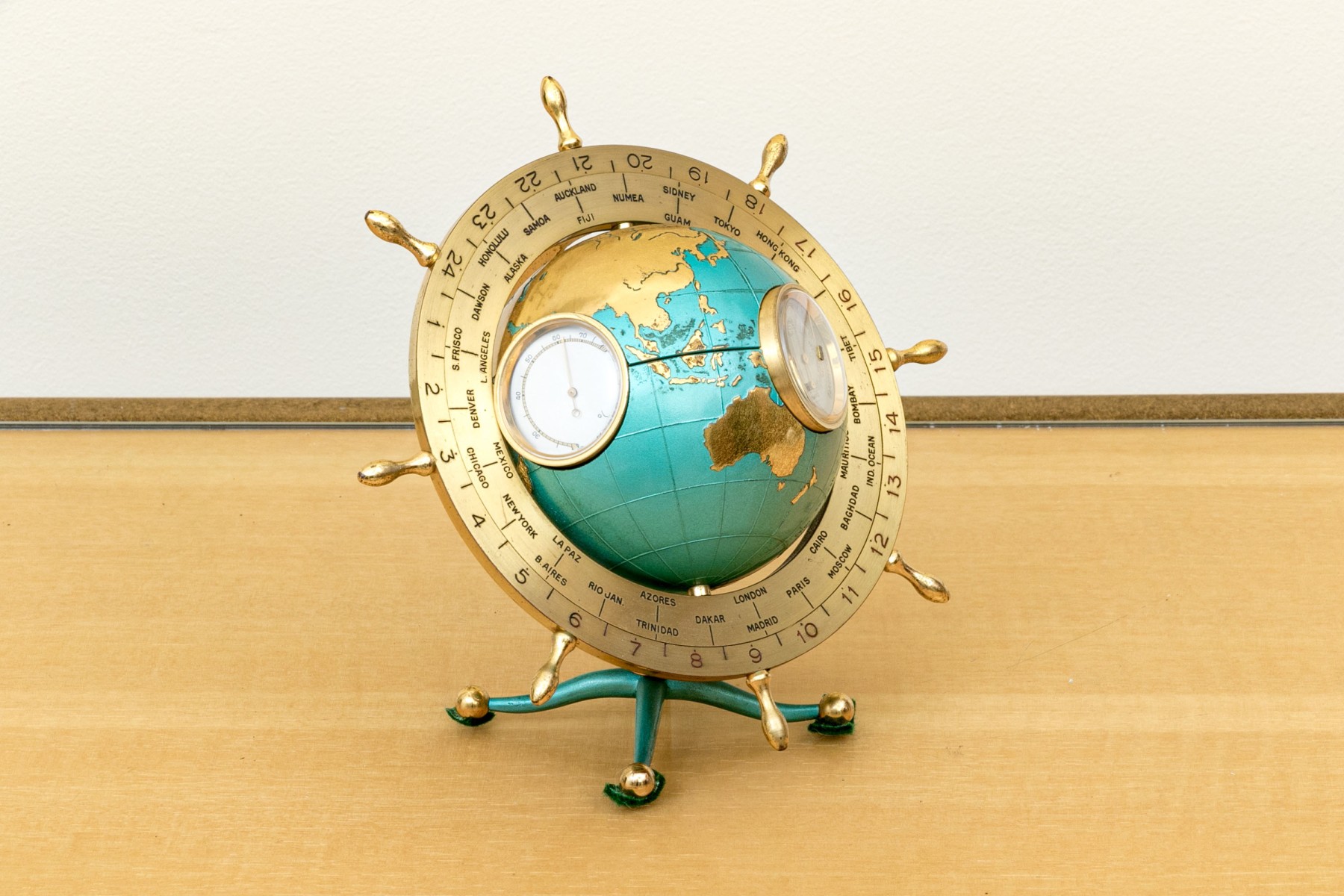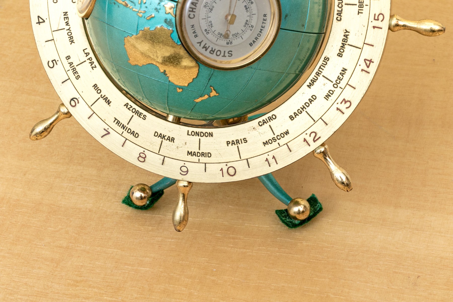 An impressive 1960's Angelus Swiss world weather station in brass, depicting a globe within a ship's wheel with various measurements and dials including a barometer, gyroscope, and clock. The globe is enameled eye-catching teal, with polished brass continents for excellent contrast. Raised on a four-prong stand on ball feet.