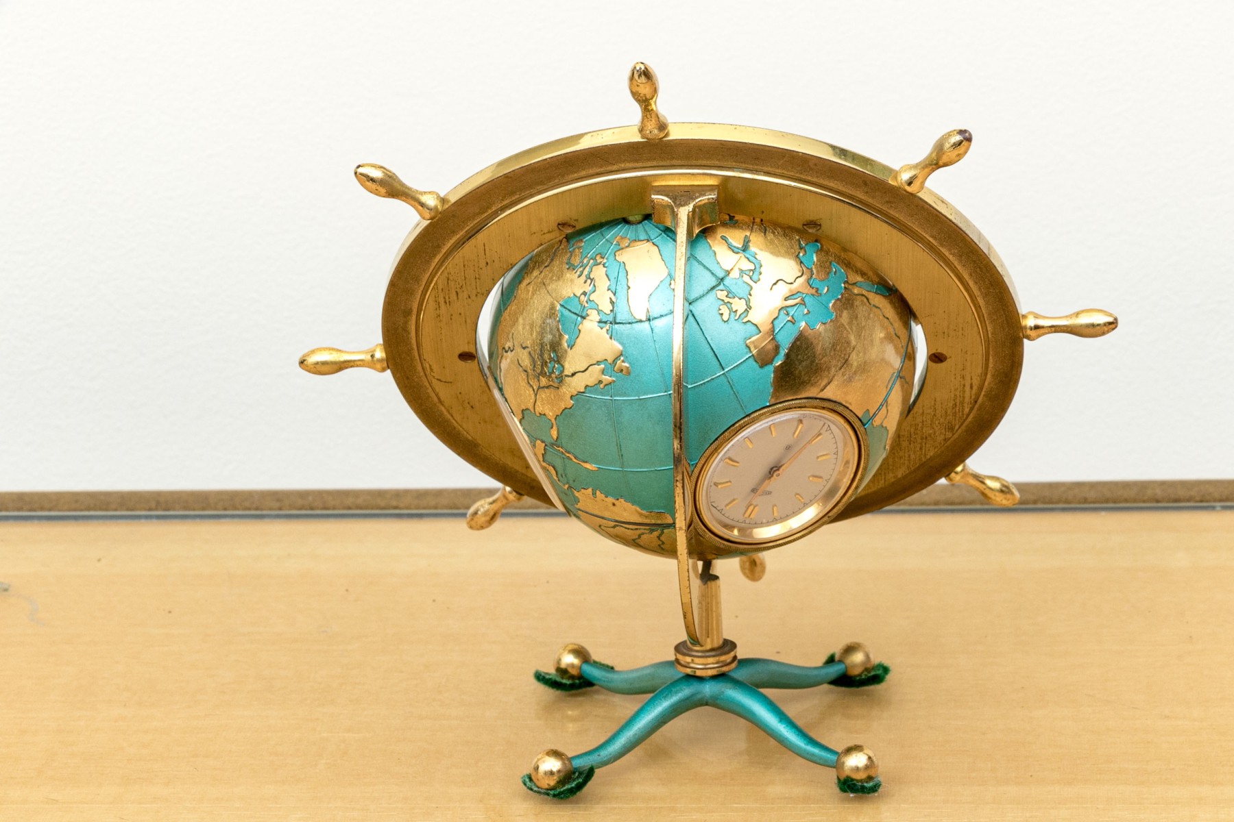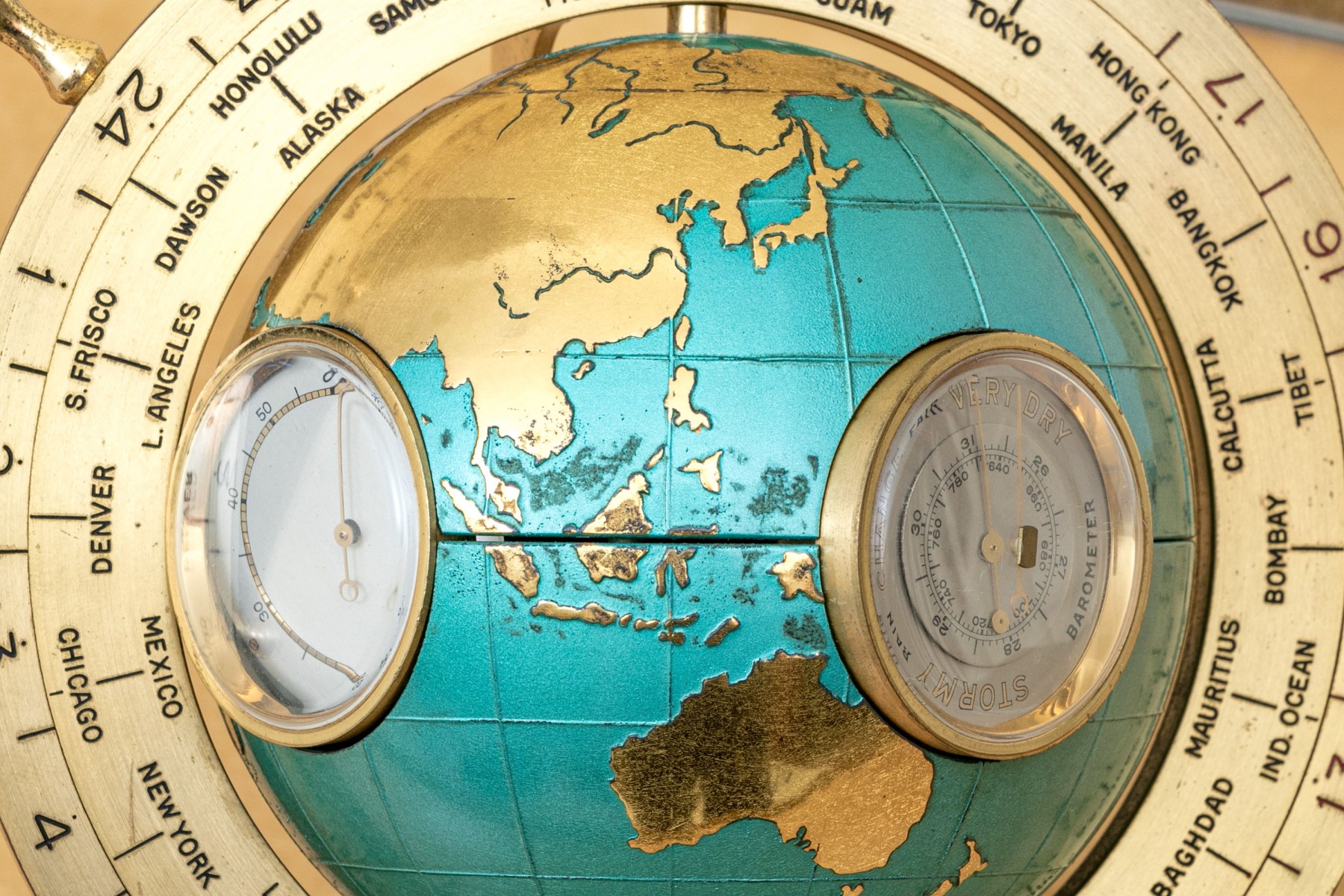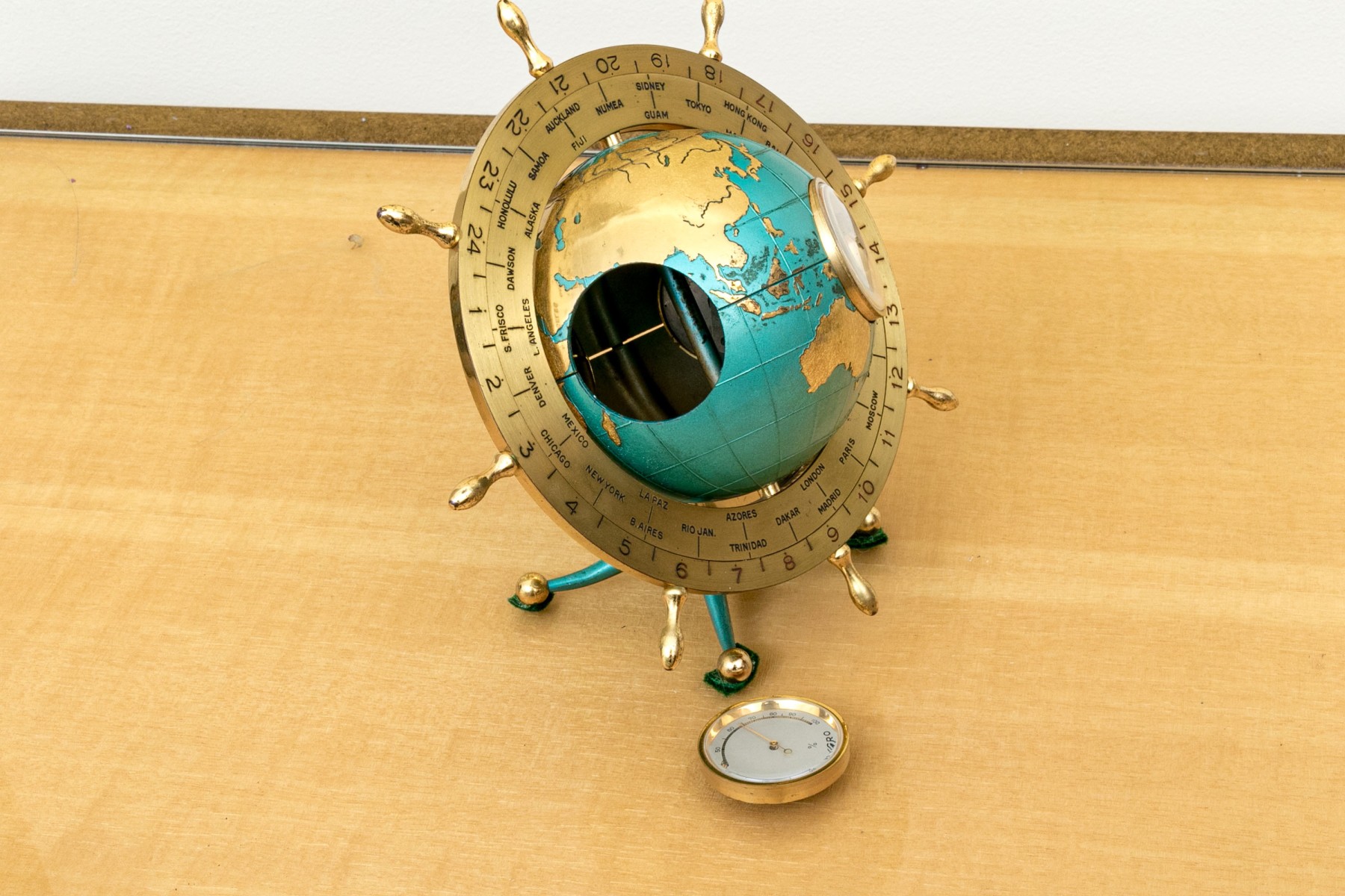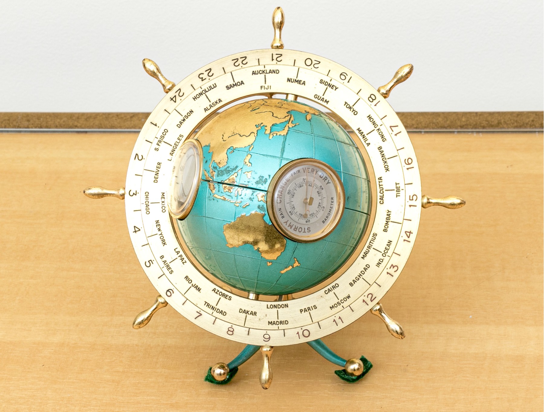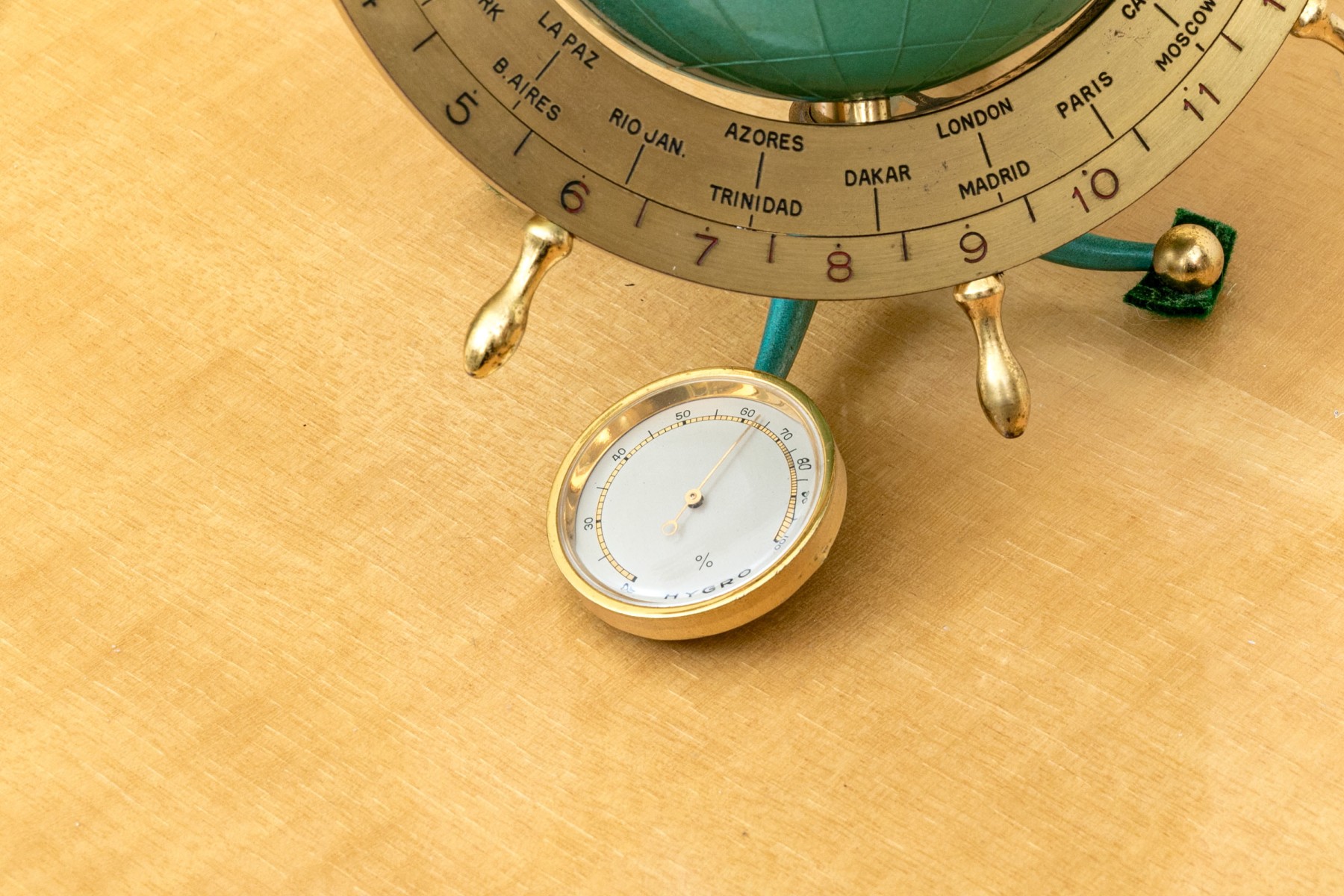 An impressive 1960's Angelus Swiss world weather station in brass, depicting a globe within a ship's wheel with various measurements and dials including a barometer, gyroscope, and clock. The globe is enameled eye-catching teal, with polished brass continents for excellent contrast. Raised on a four-prong stand on ball feet.
