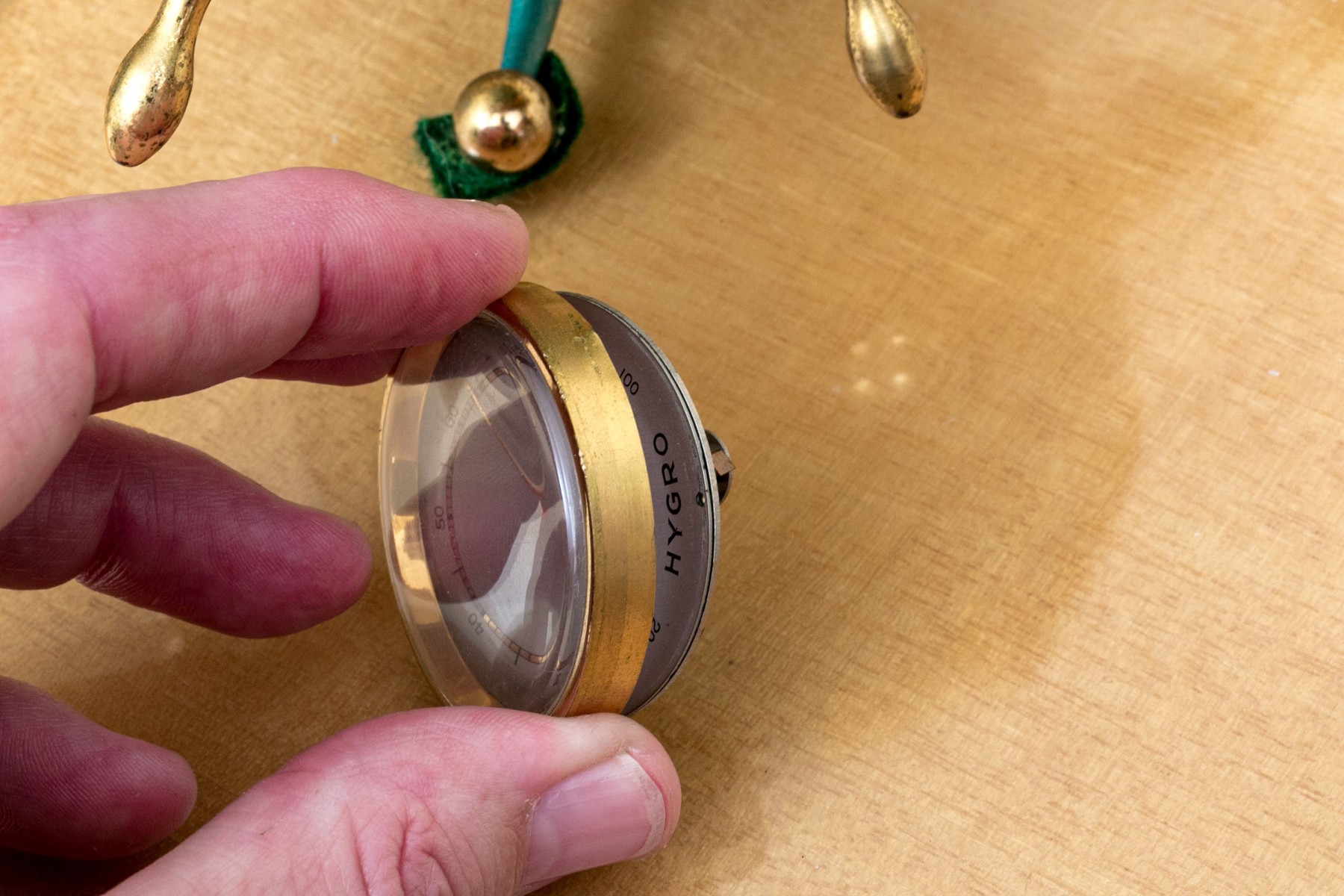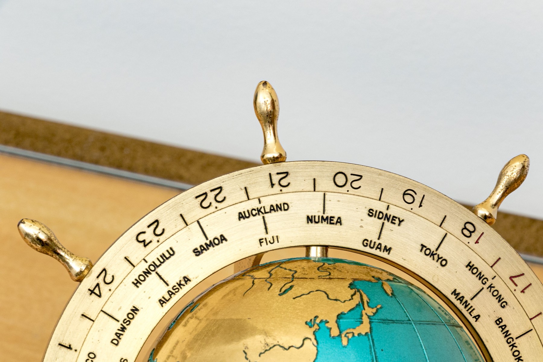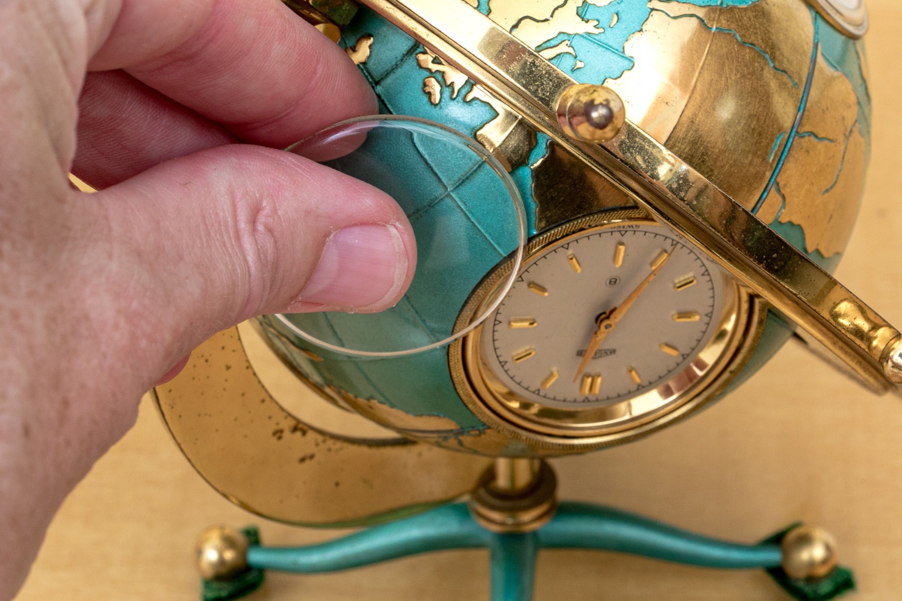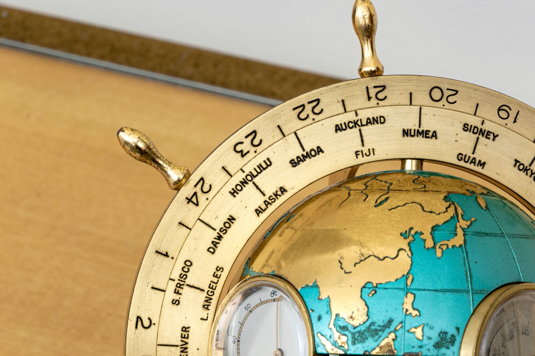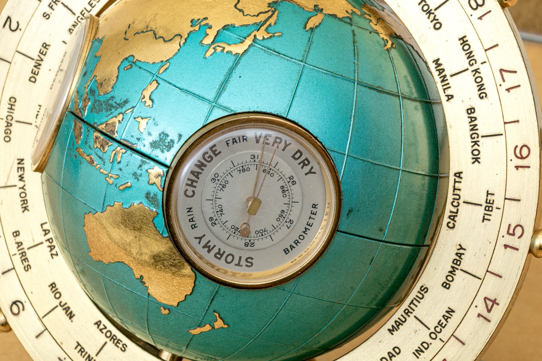 An impressive 1960's Angelus Swiss world weather station in brass, depicting a globe within a ship's wheel with various measurements and dials including a barometer, gyroscope, and clock. The globe is enameled eye-catching teal, with polished brass continents for excellent contrast. Raised on a four-prong stand on ball feet.