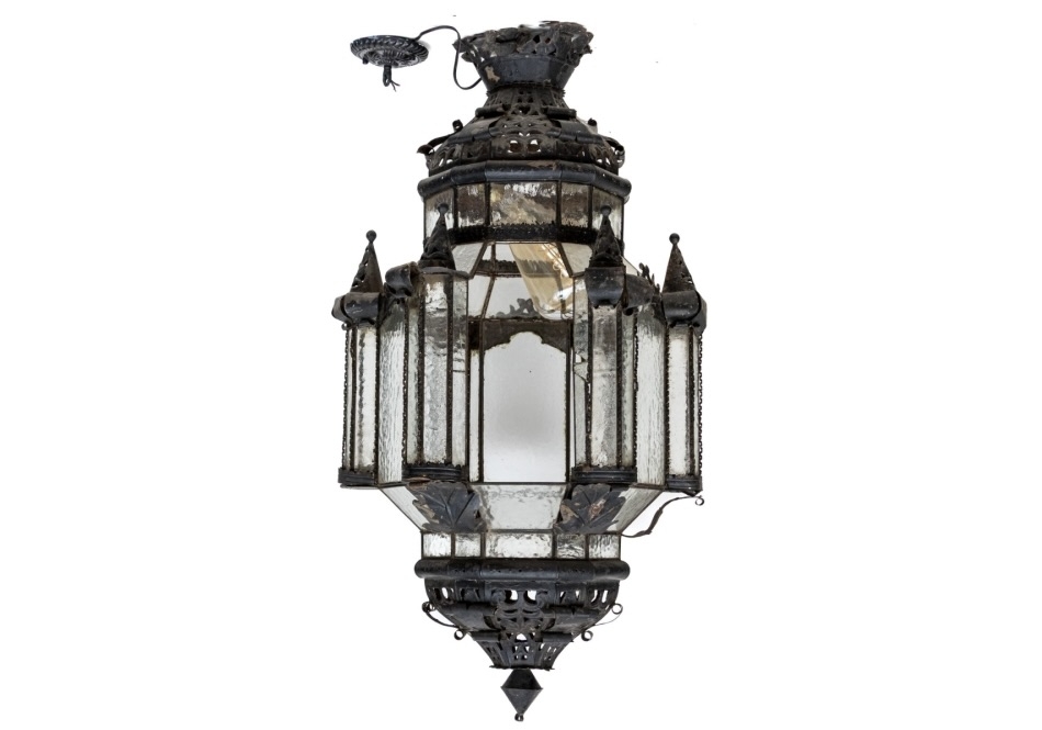 A gorgeous antique pendant light with great Moroccan influence, showcasing a faceted cylindrical profile with architectural tower forms surrounding a wavy glass paneled body with a single light bulb within. The black finished metal frame features gorgeous pierced patterns, adding to the ornate and impressive presence.