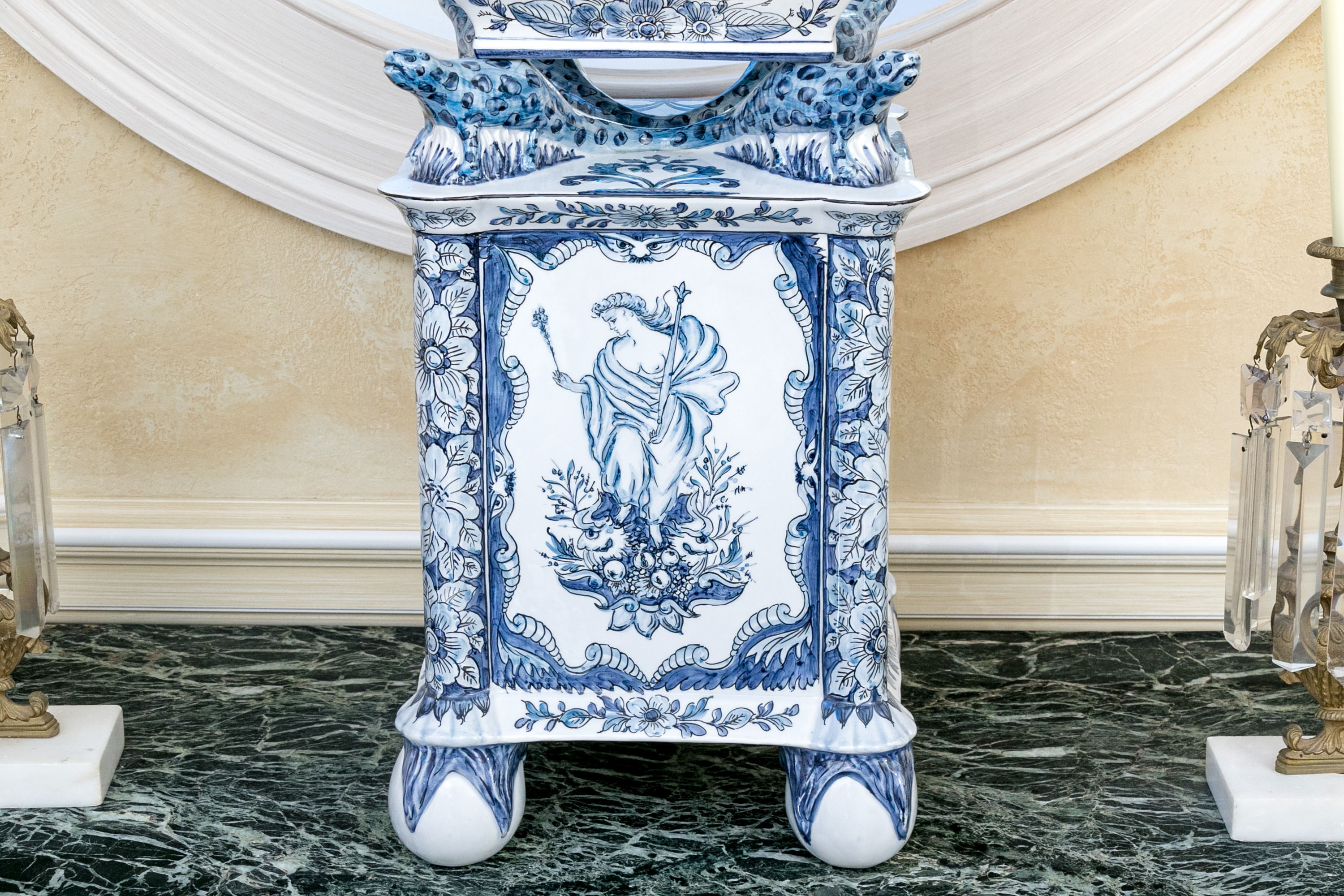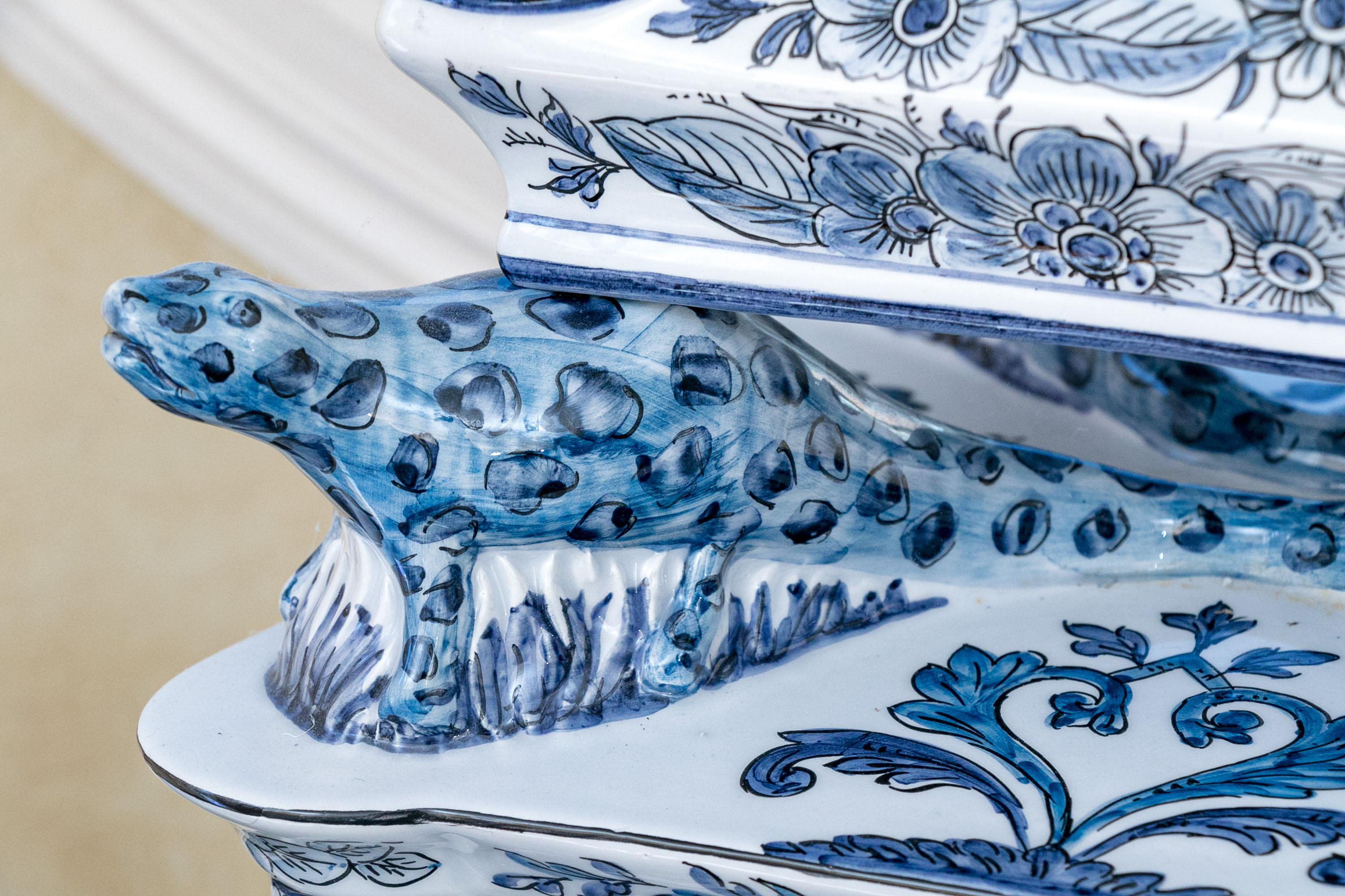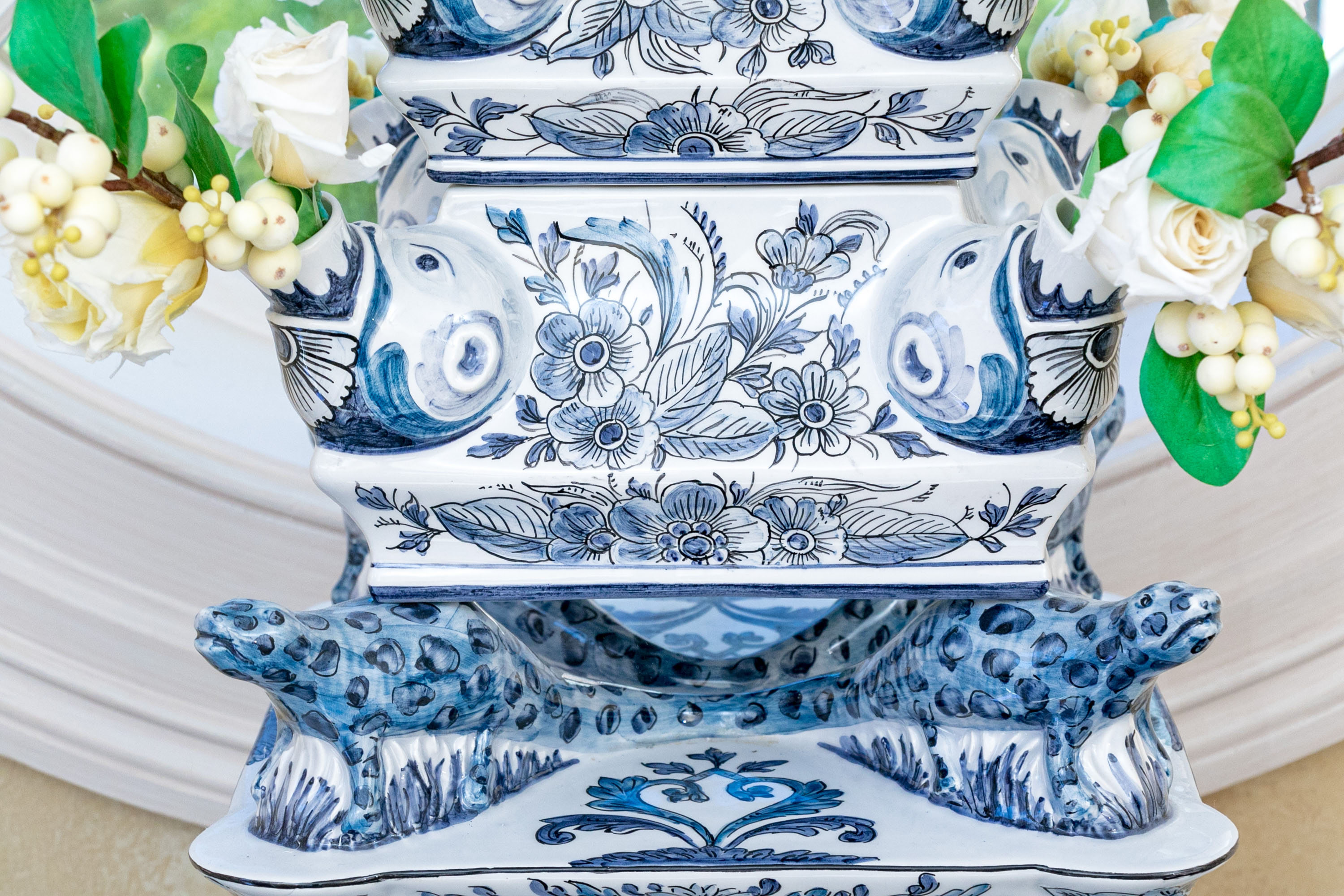 A tall Delft style obelisk form tulip vase with twenty-four spouts, constructed in four sections. Six tiers support the angled spouts, hand-decorated with blue floral sprays in monochromatic blue. The tiers are supported by four sculptural spotted lizards on a rectangular base with figural Neoclassical decocration, all raised on ball and claw feet.