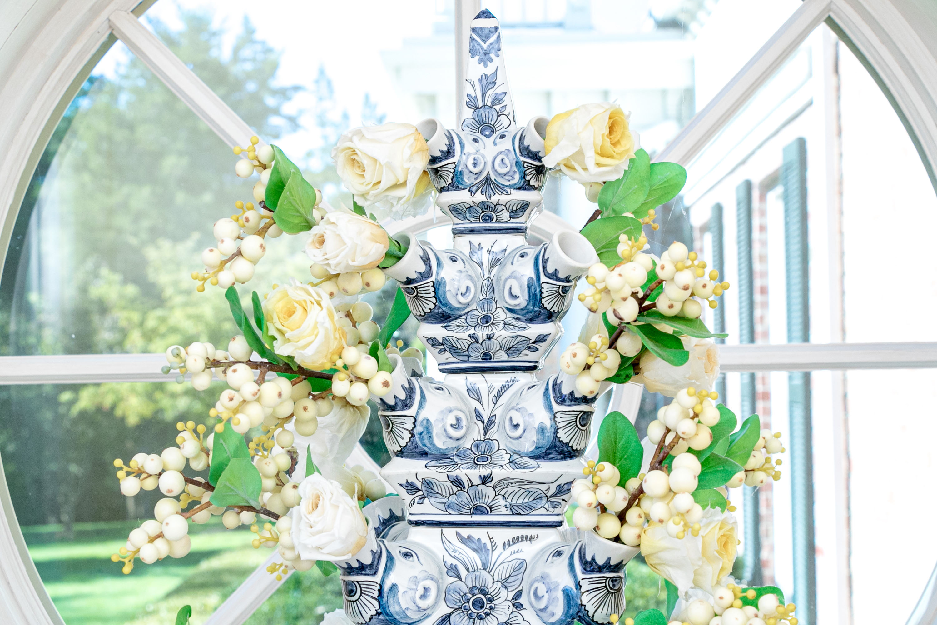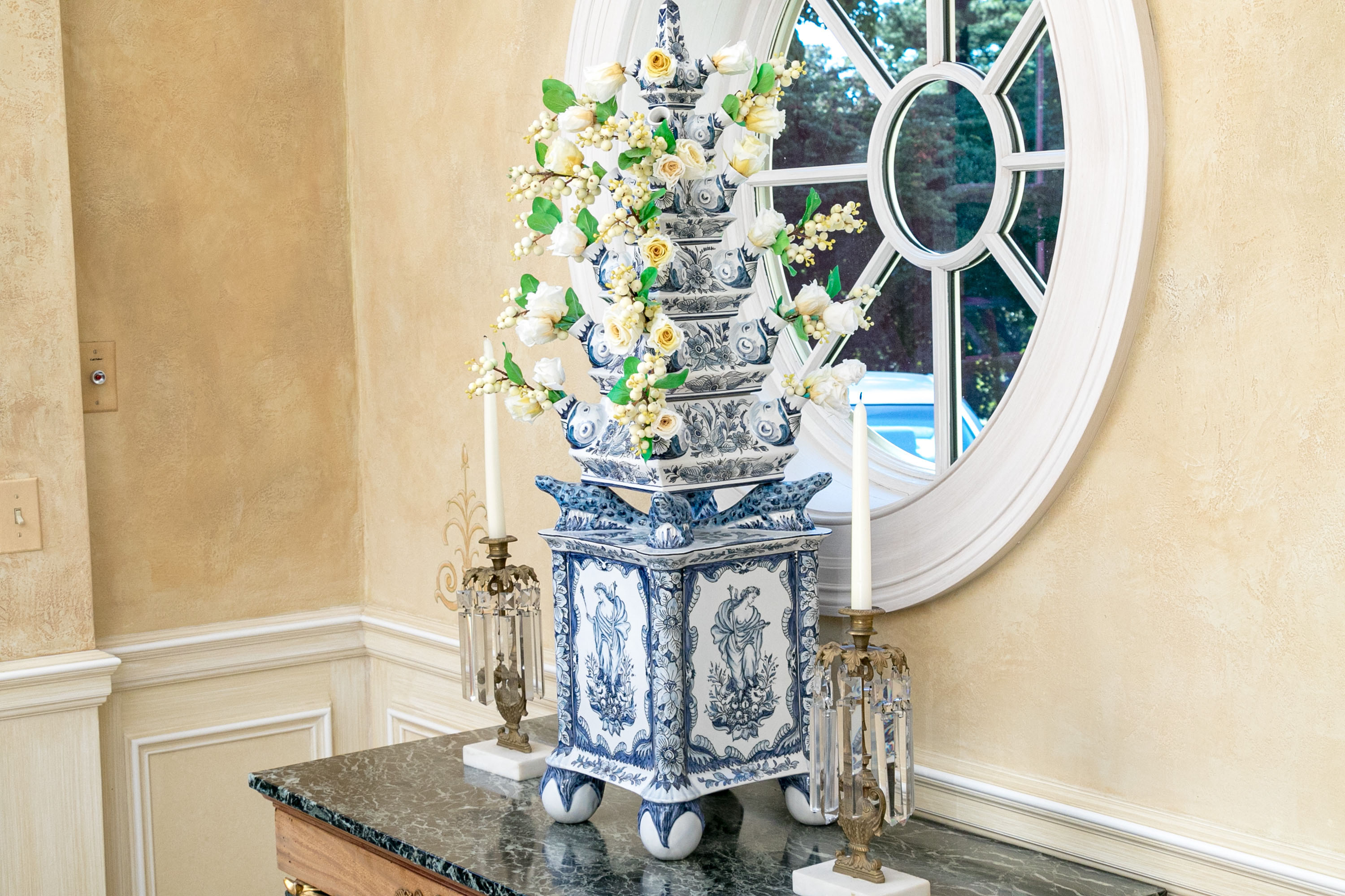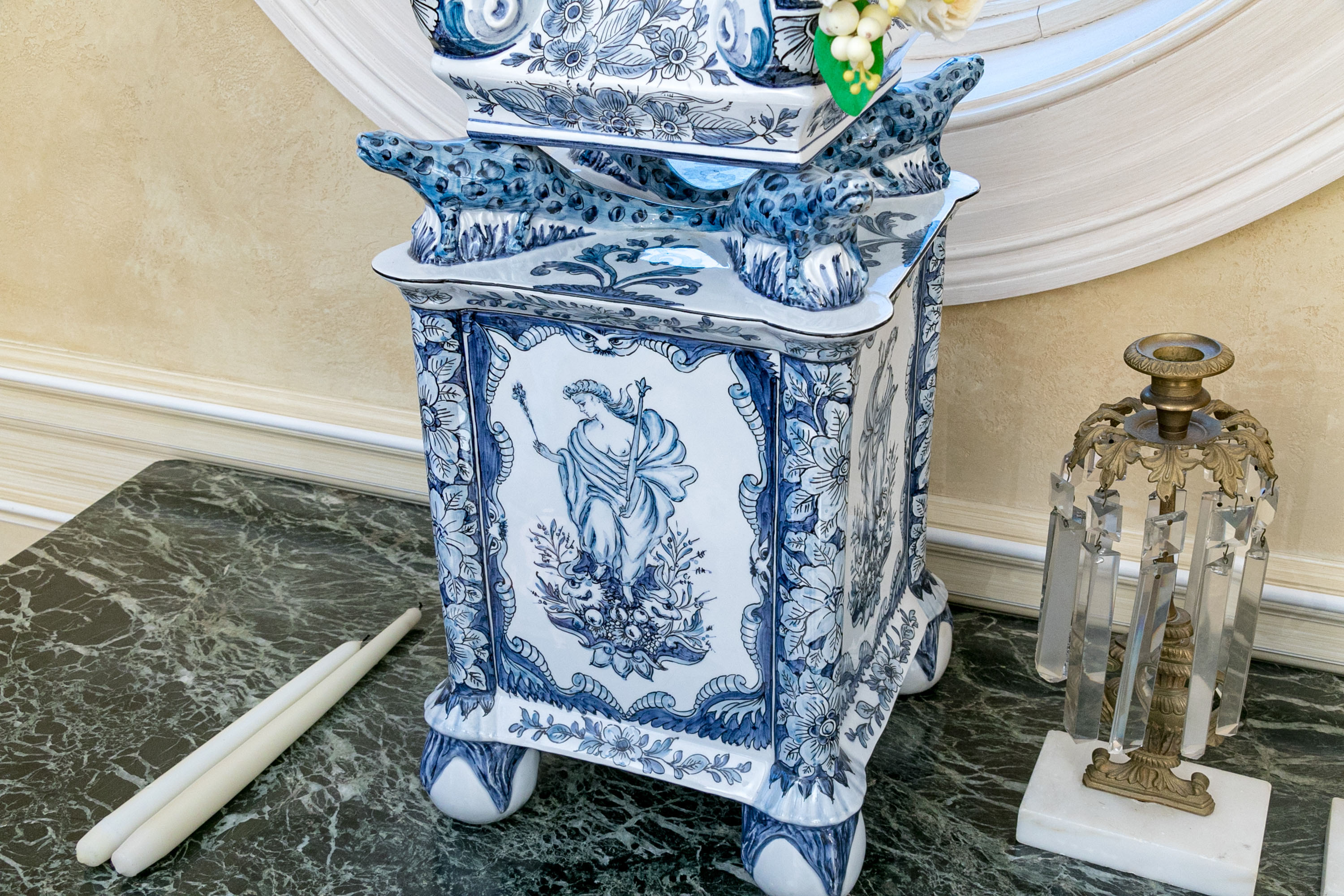 A tall Delft style obelisk form tulip vase with twenty-four spouts, constructed in four sections. Six tiers support the angled spouts, hand-decorated with blue floral sprays in monochromatic blue. The tiers are supported by four sculptural spotted lizards on a rectangular base with figural Neoclassical decocration, all raised on ball and claw feet.