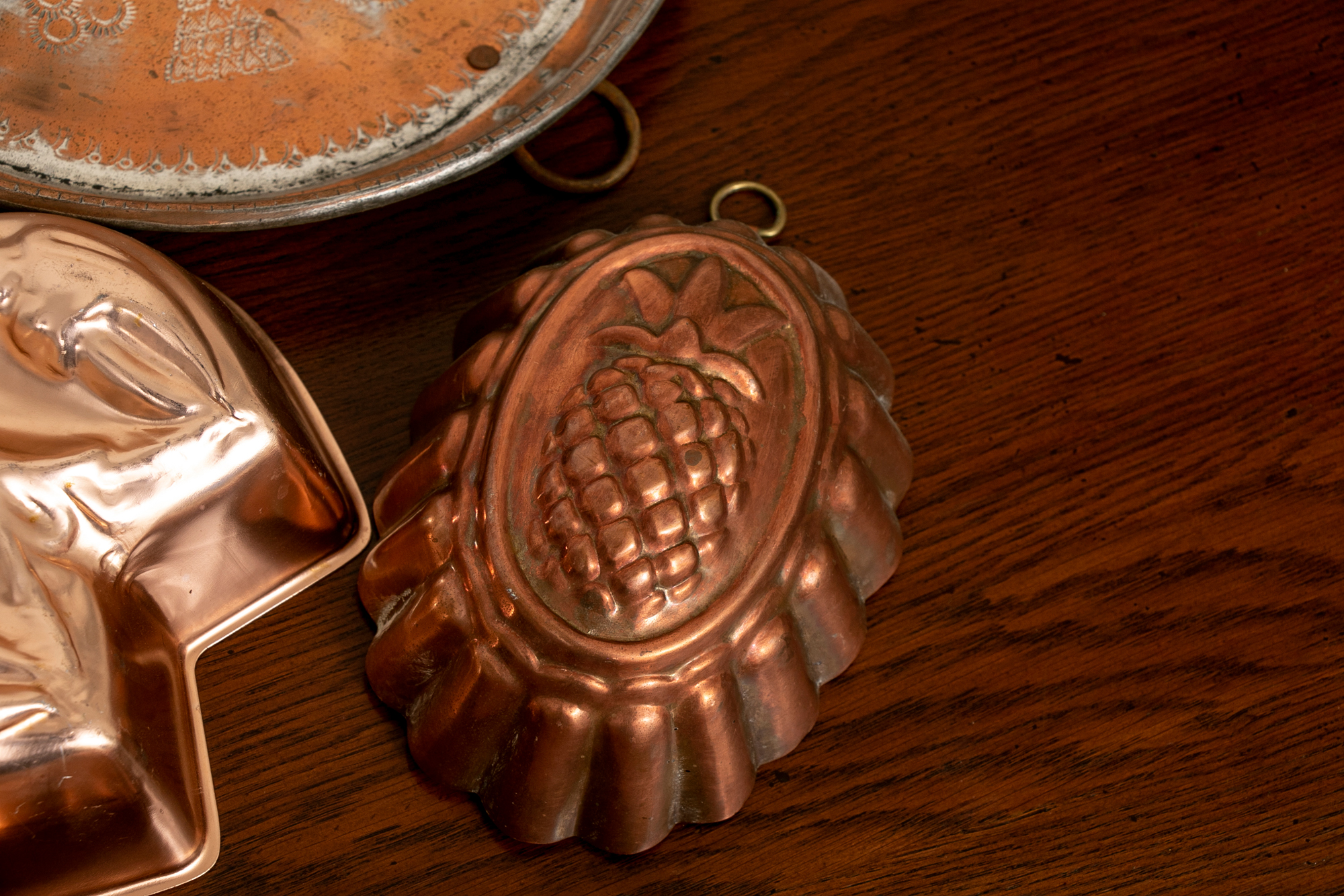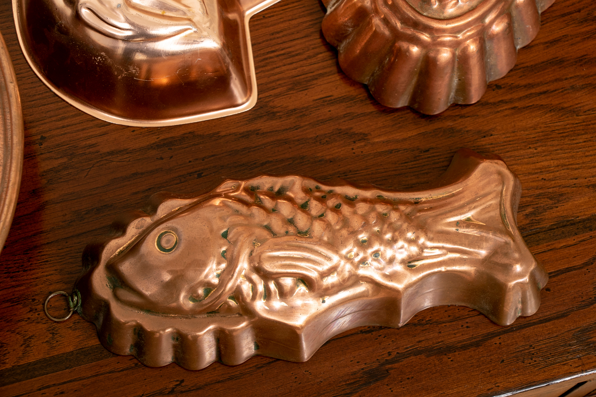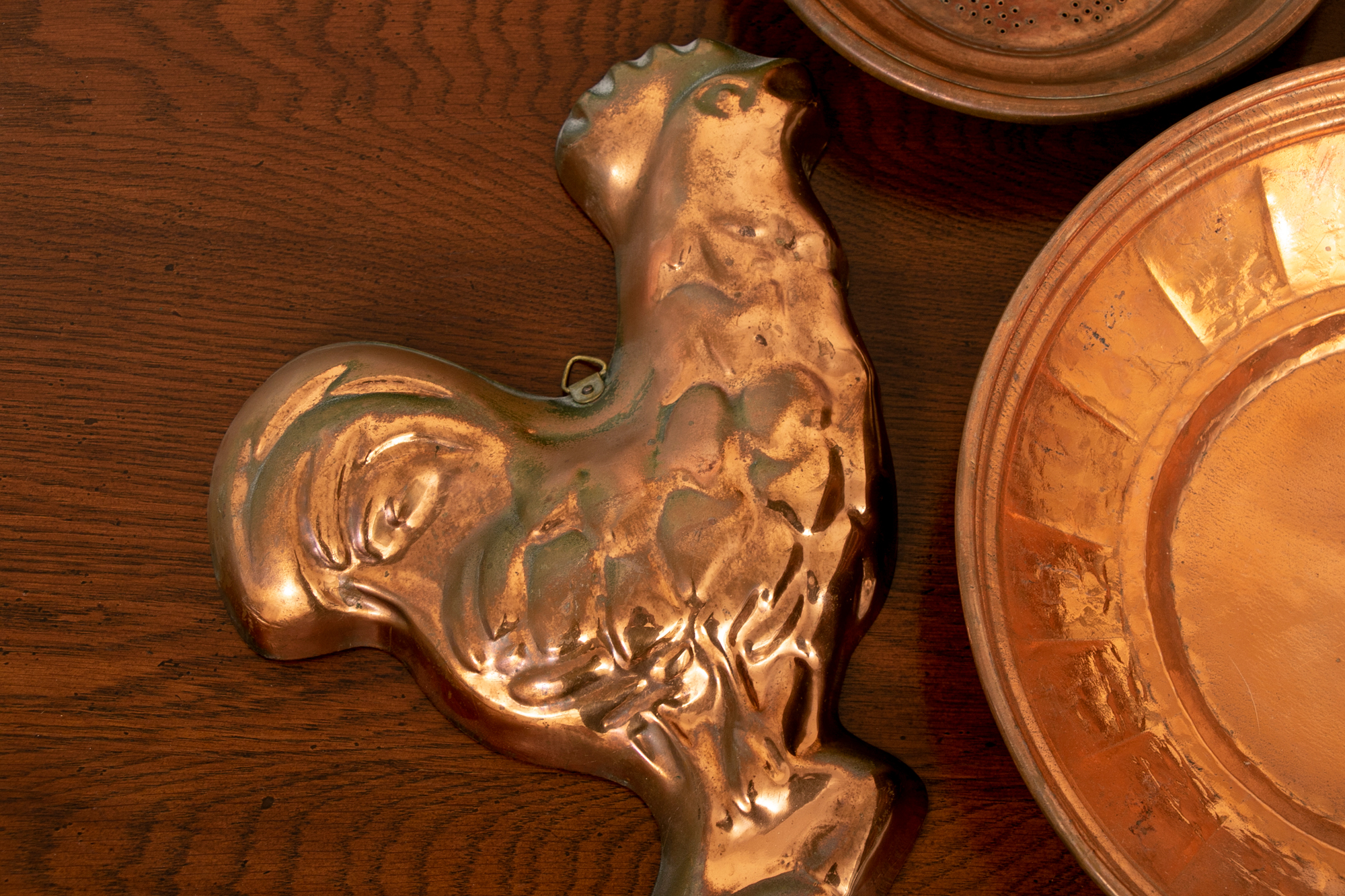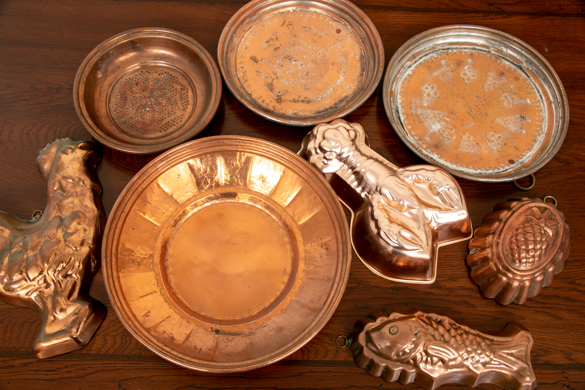 Add to your collection or start decorating a wall with this extensive collection of four copper molds and four plates plates.
