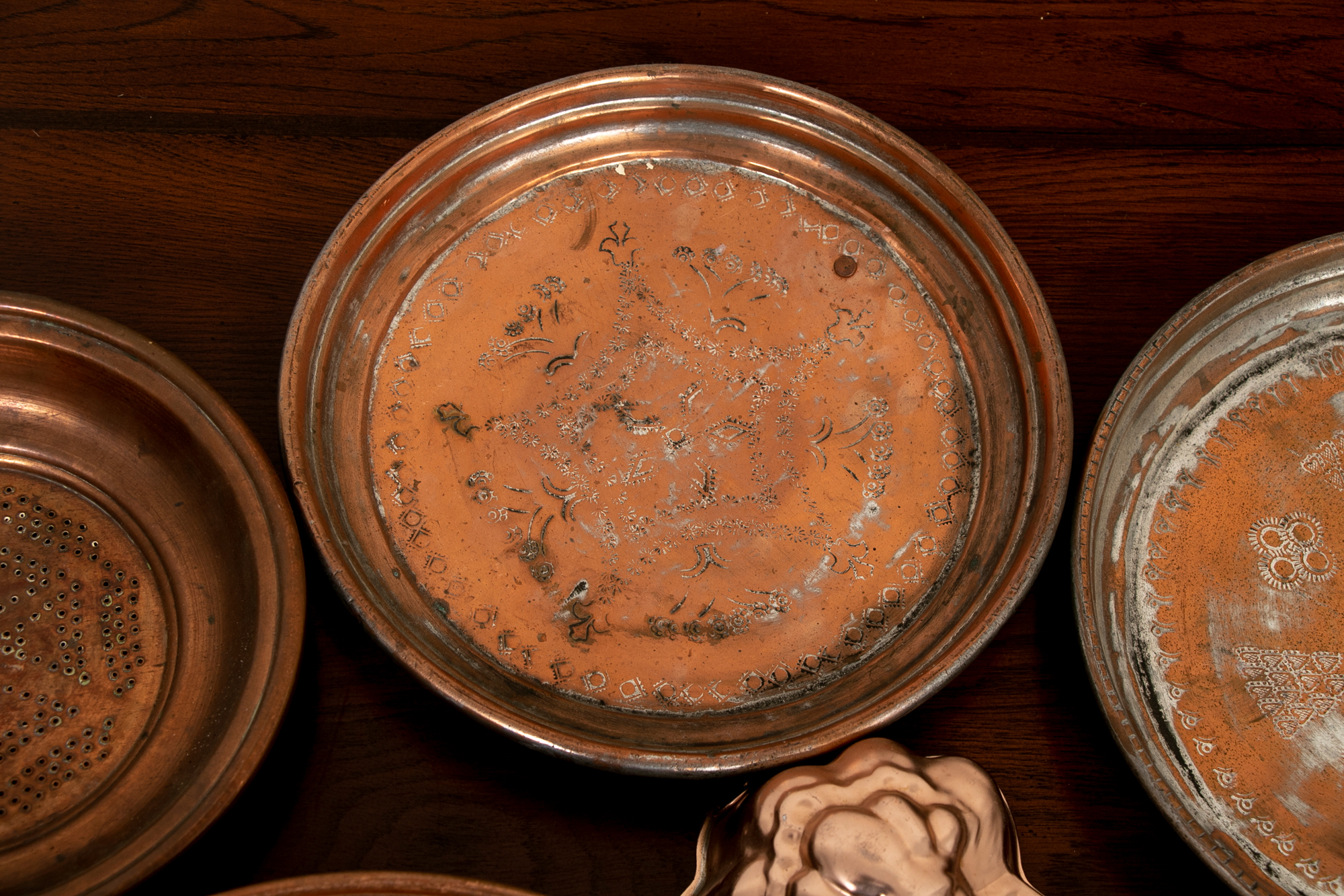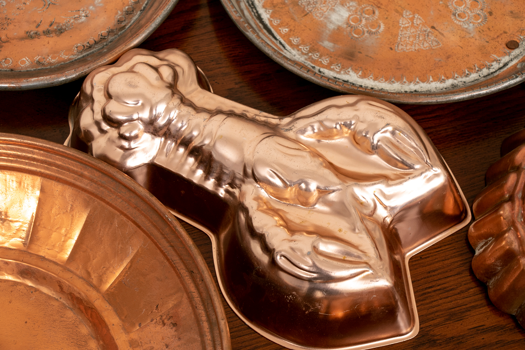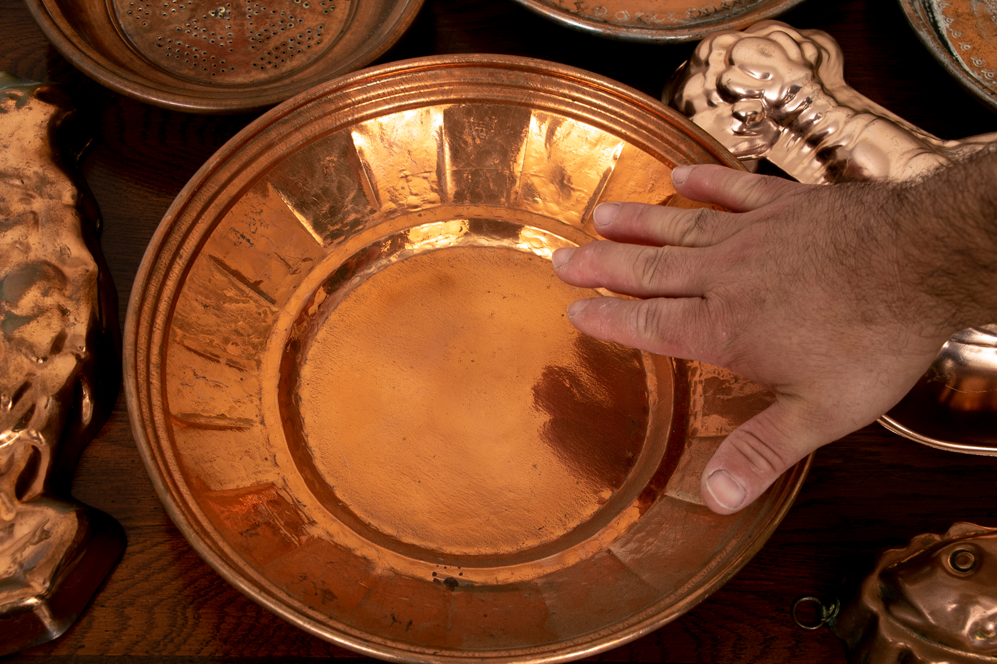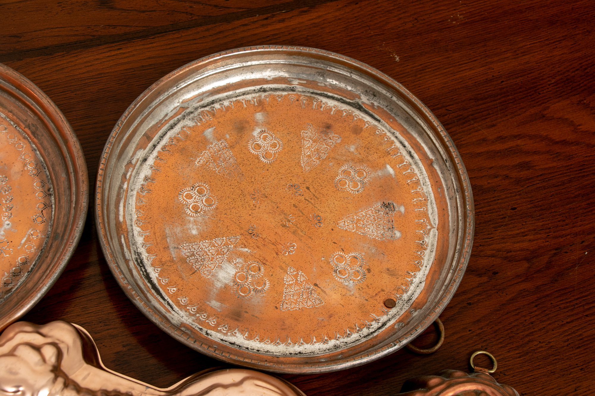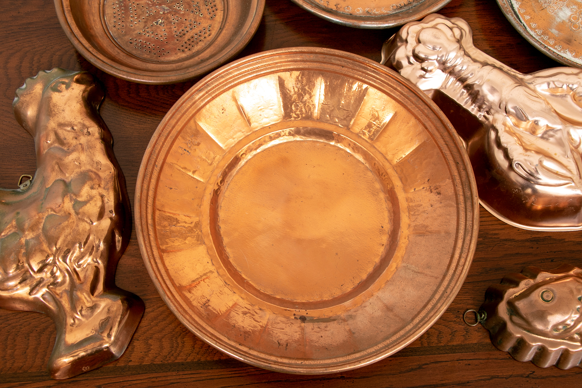 Add to your collection or start decorating a wall with this extensive collection of four copper molds and four plates plates.