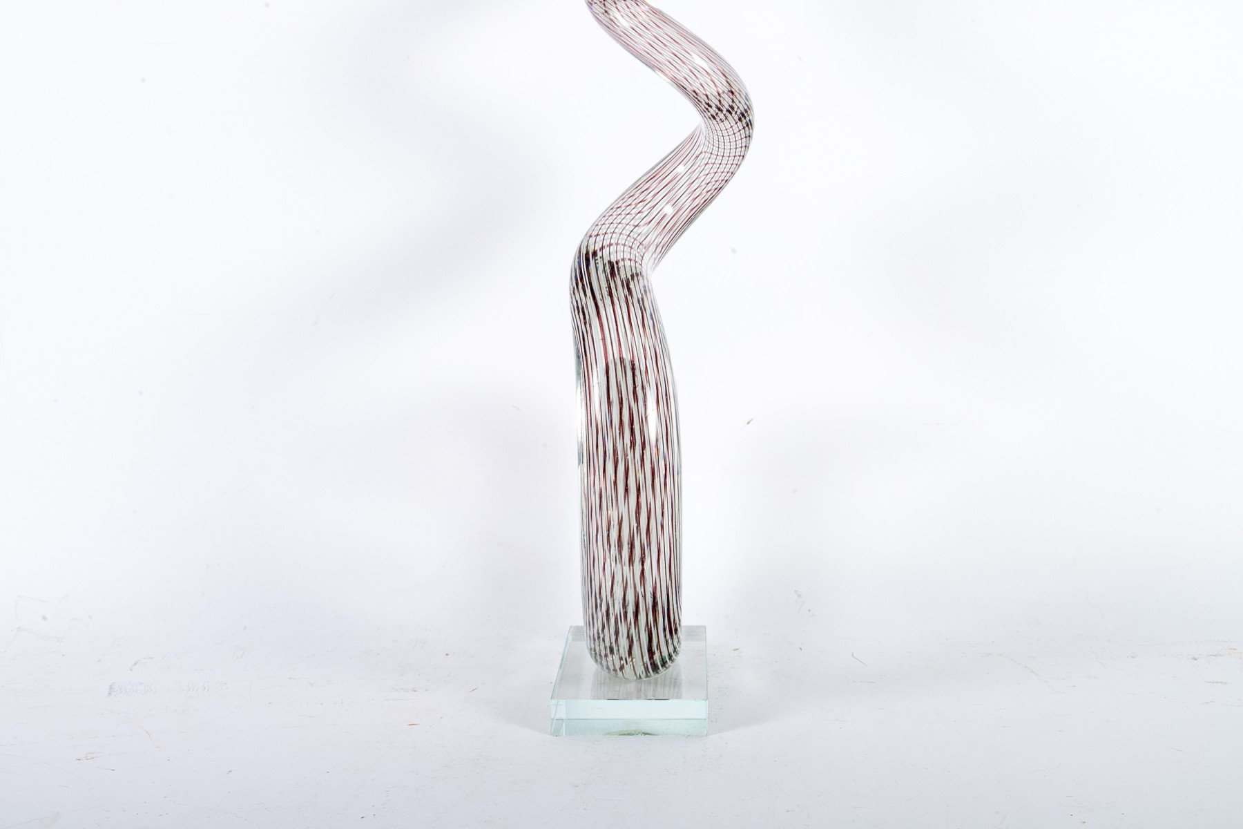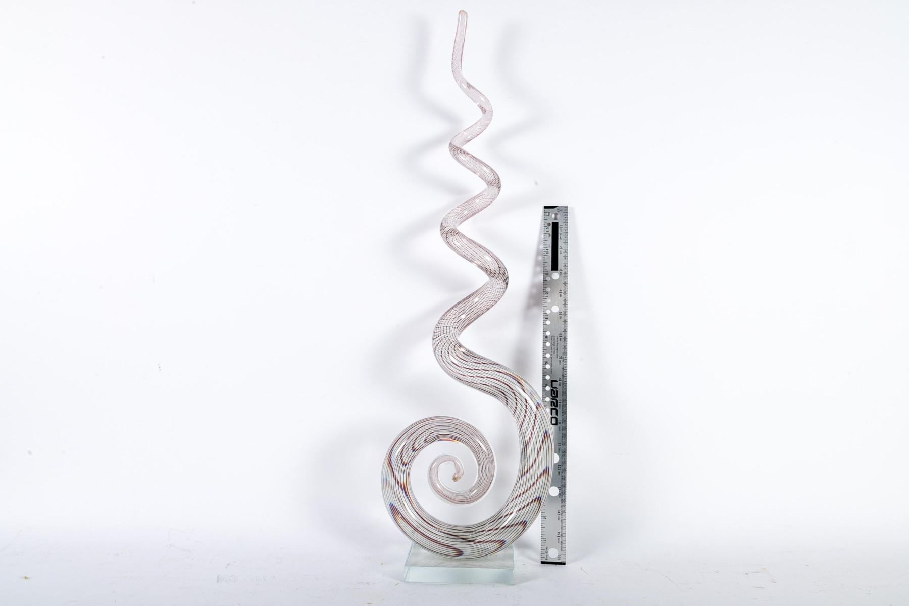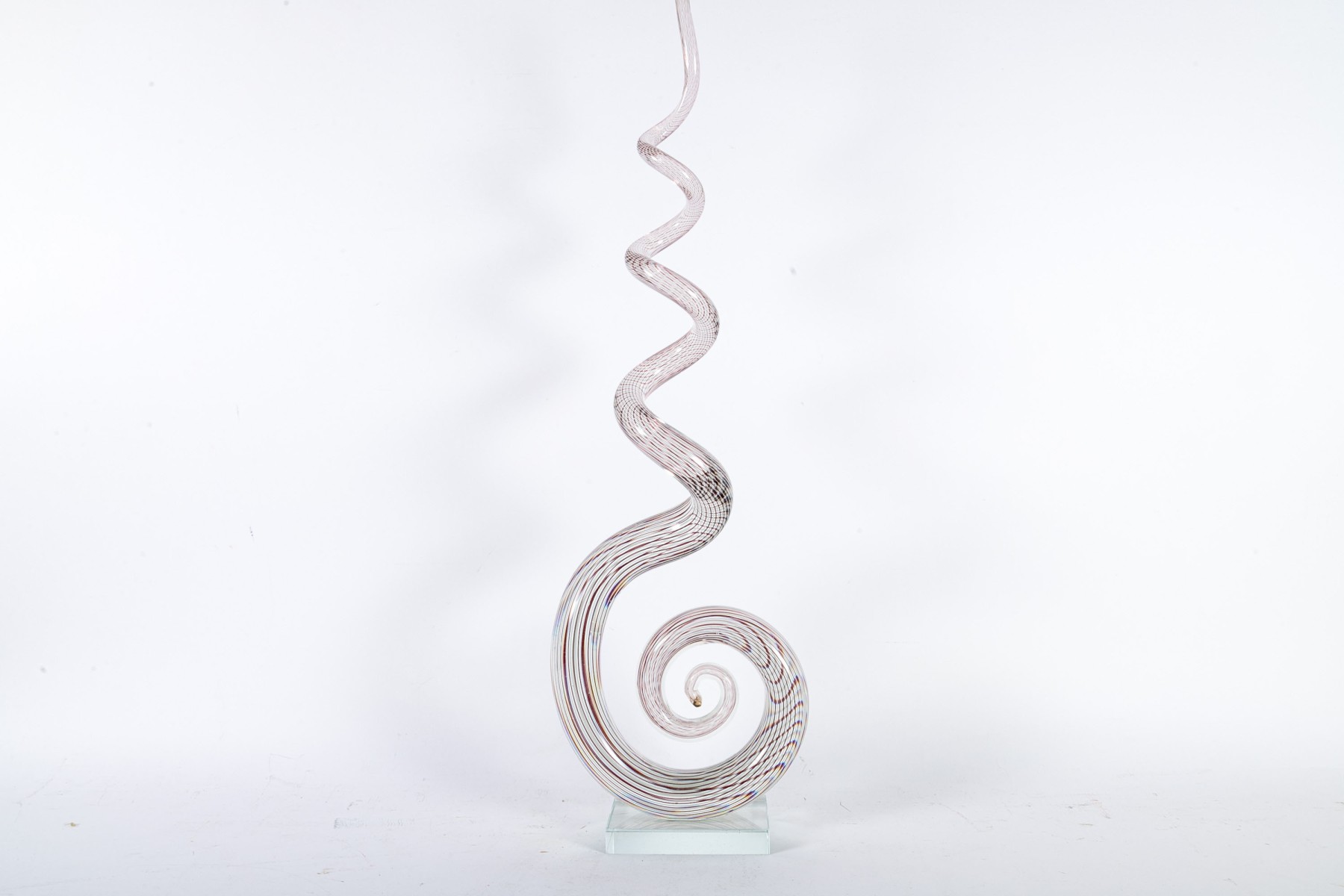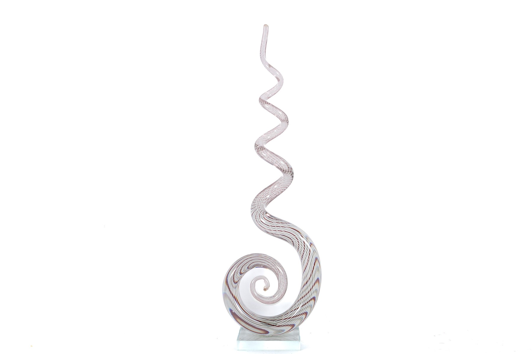 An impressive art glass sculpture displaying a tall, spiraling corkscrew form with purple and white stripes along a clear body mounted to a rectangular base.