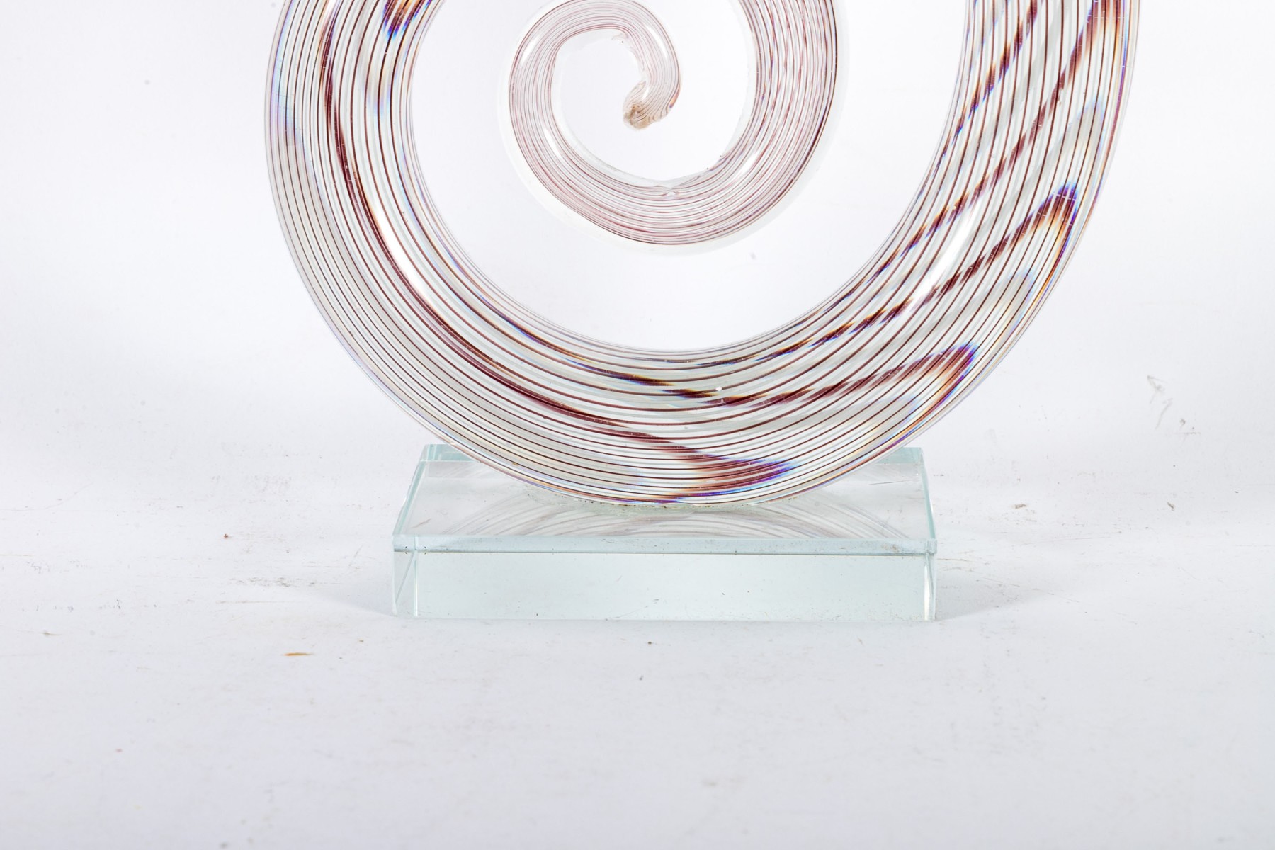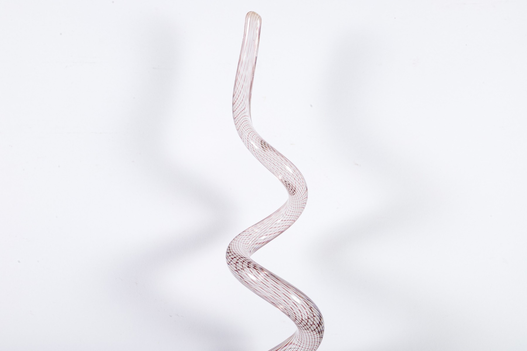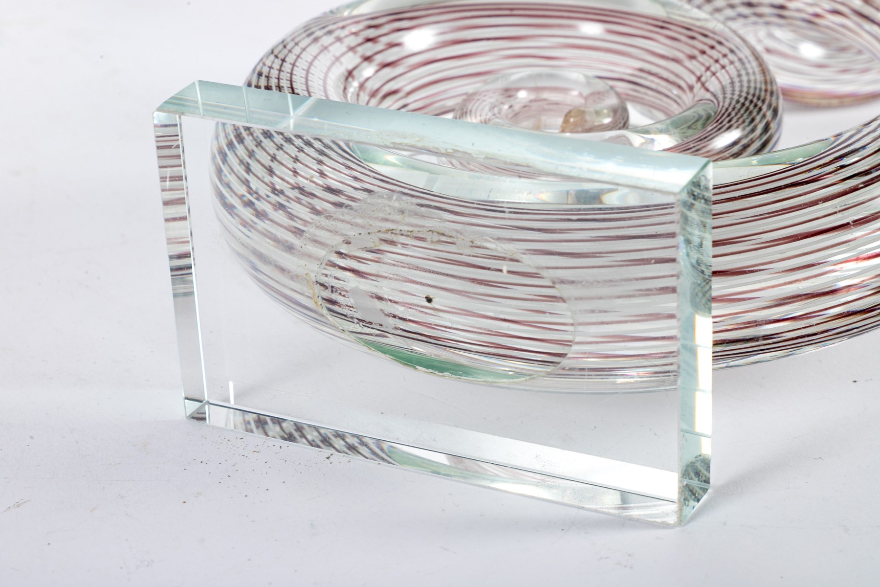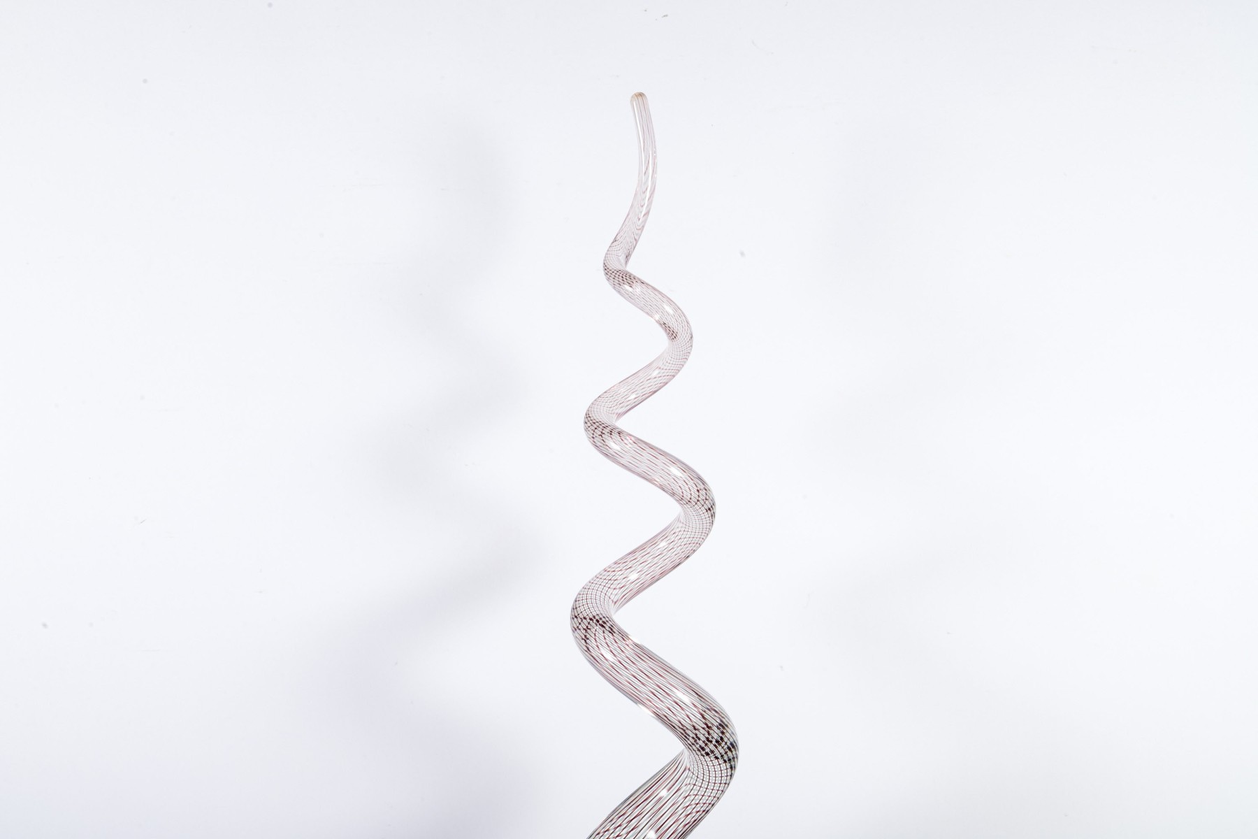 An impressive art glass sculpture displaying a tall, spiraling corkscrew form with purple and white stripes along a clear body mounted to a rectangular base.