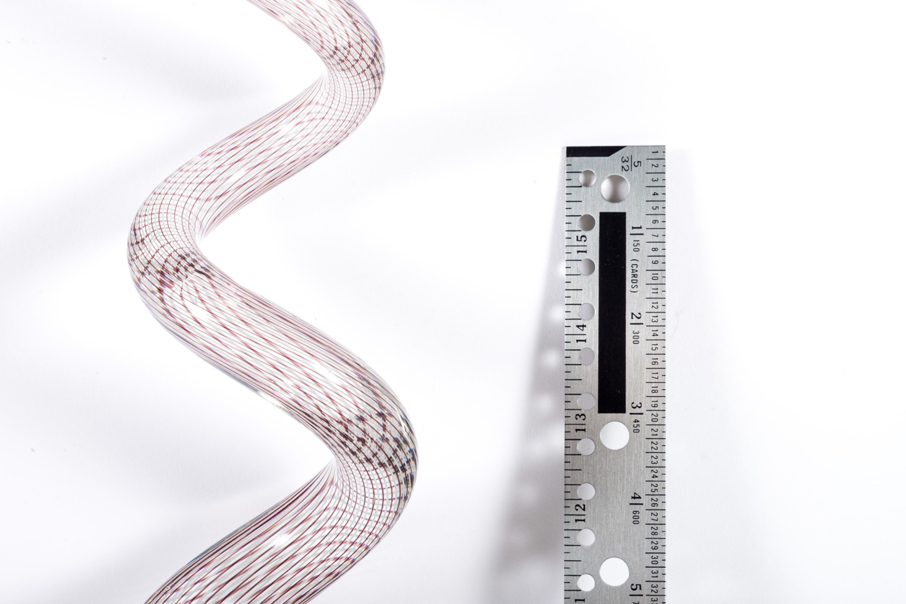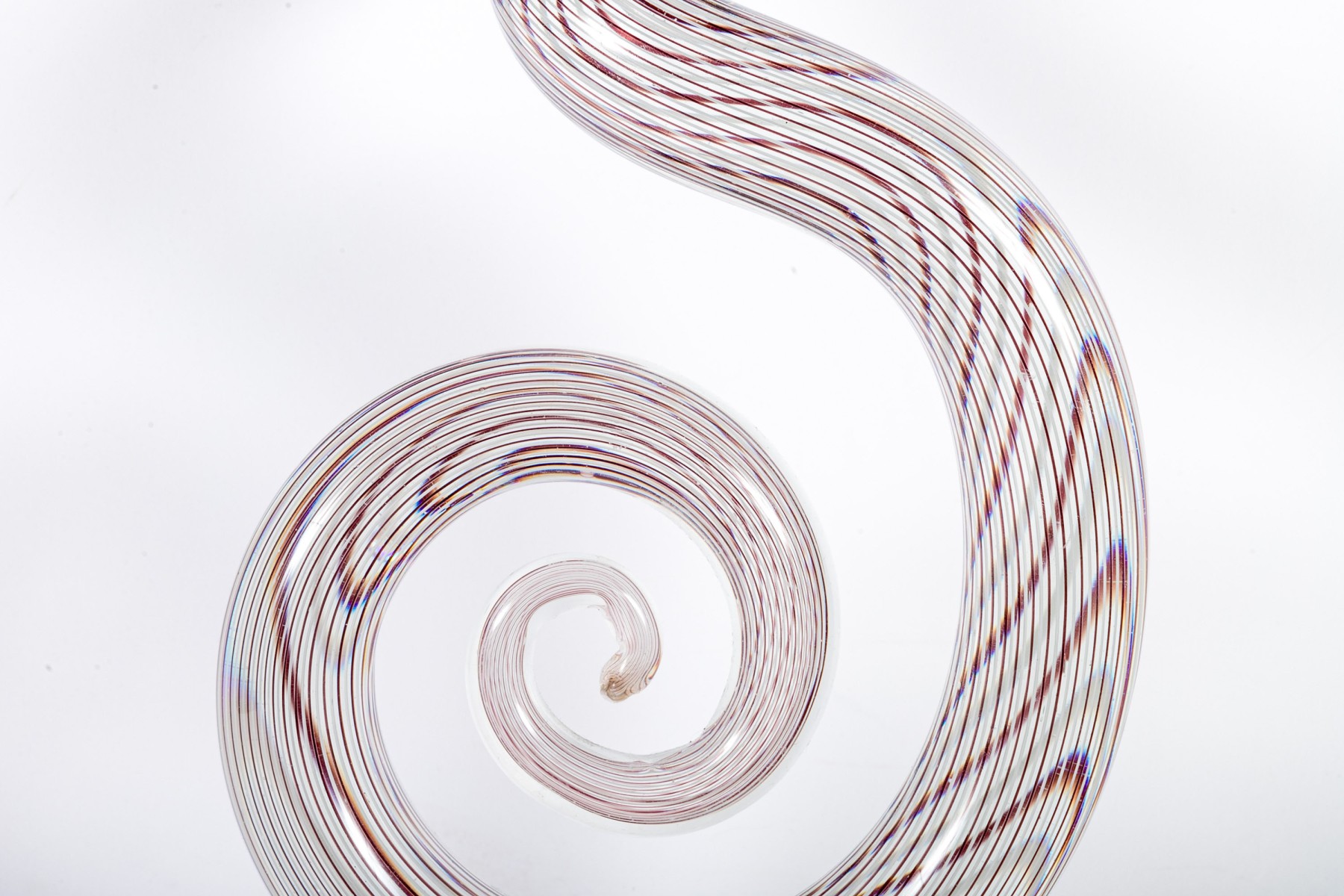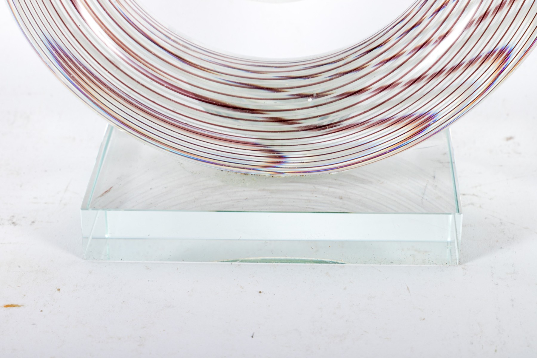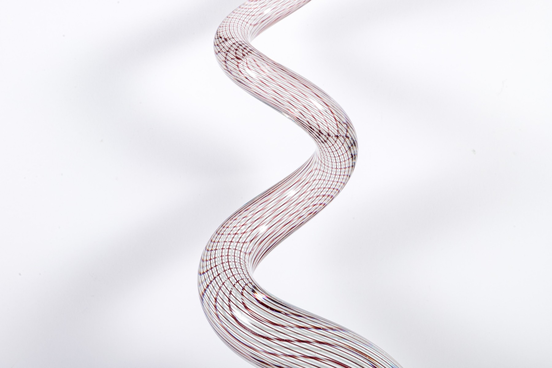 An impressive art glass sculpture displaying a tall, spiraling corkscrew form with purple and white stripes along a clear body mounted to a rectangular base.