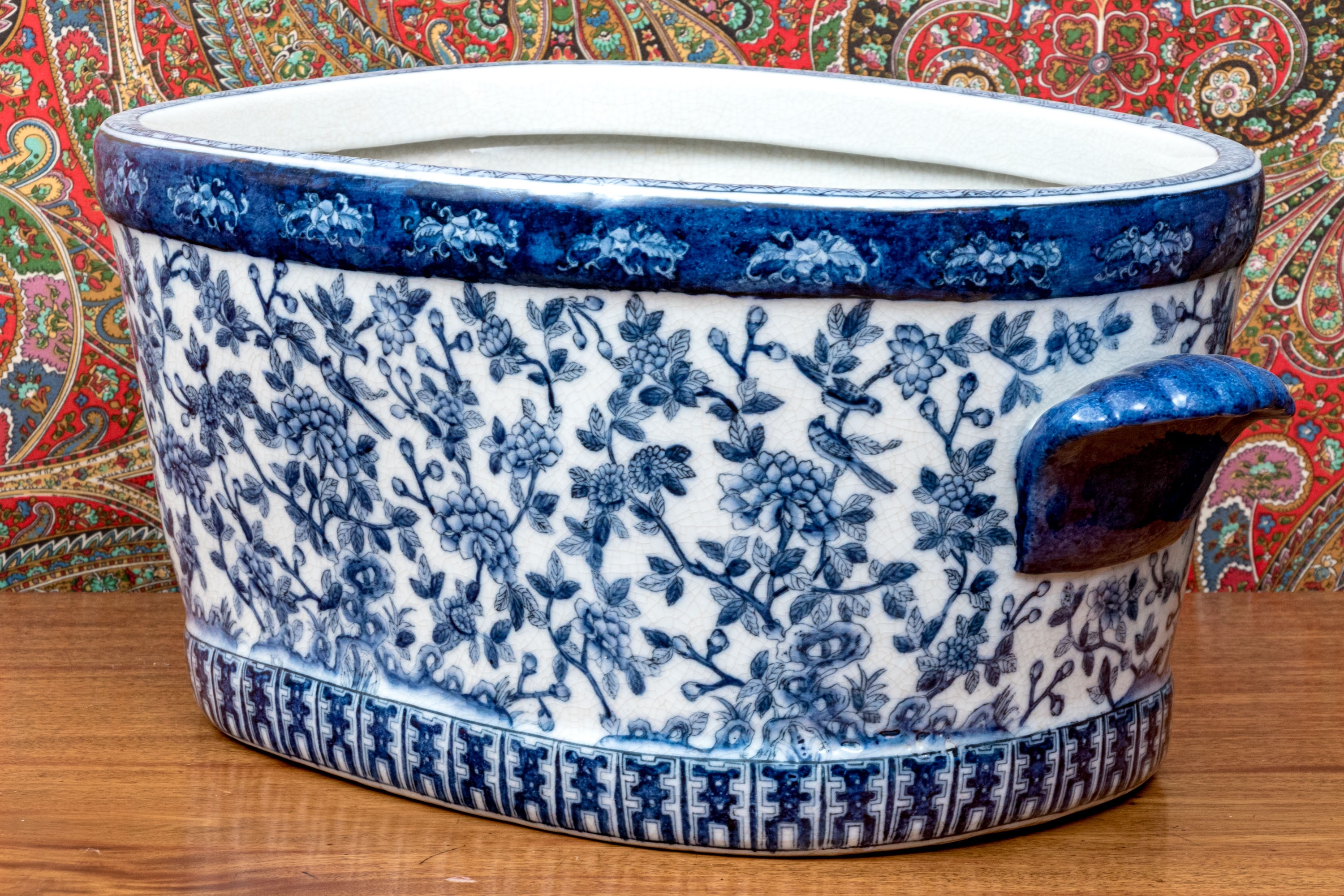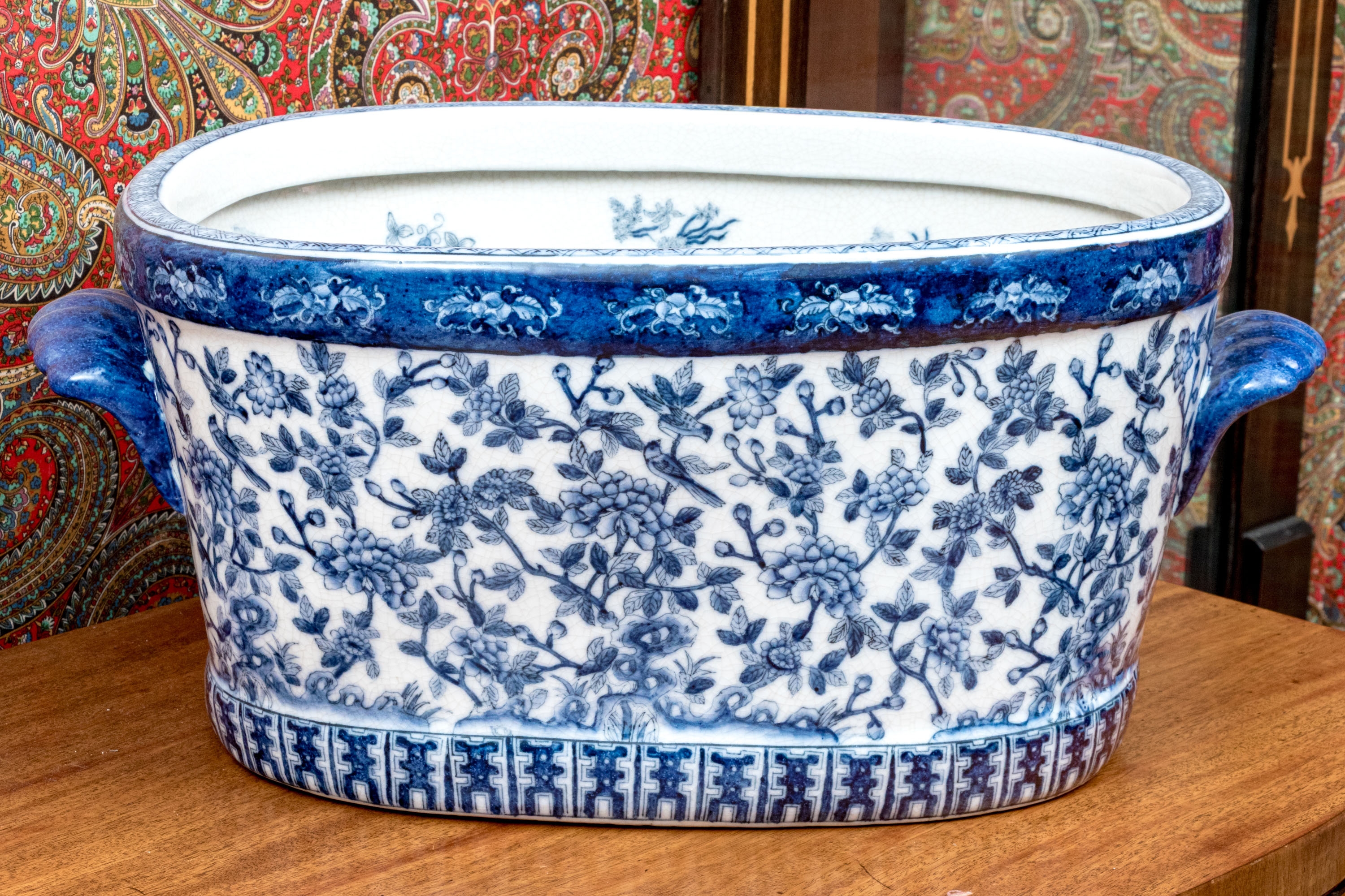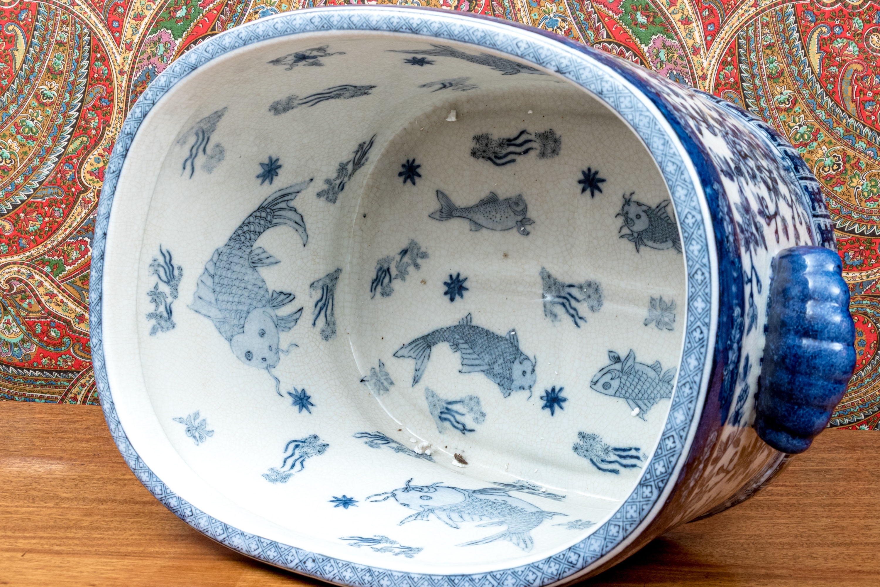 A gorgeous porcelain oval footbath with excellent Chinese export style, showcasing an interior decorated with koi or carp motifs. The exterior features a blue banded rim, blue bracket handles, and ornate monochromatic blue decoration incorporating birds, flowering branches, and rockery. Marked underfoot.