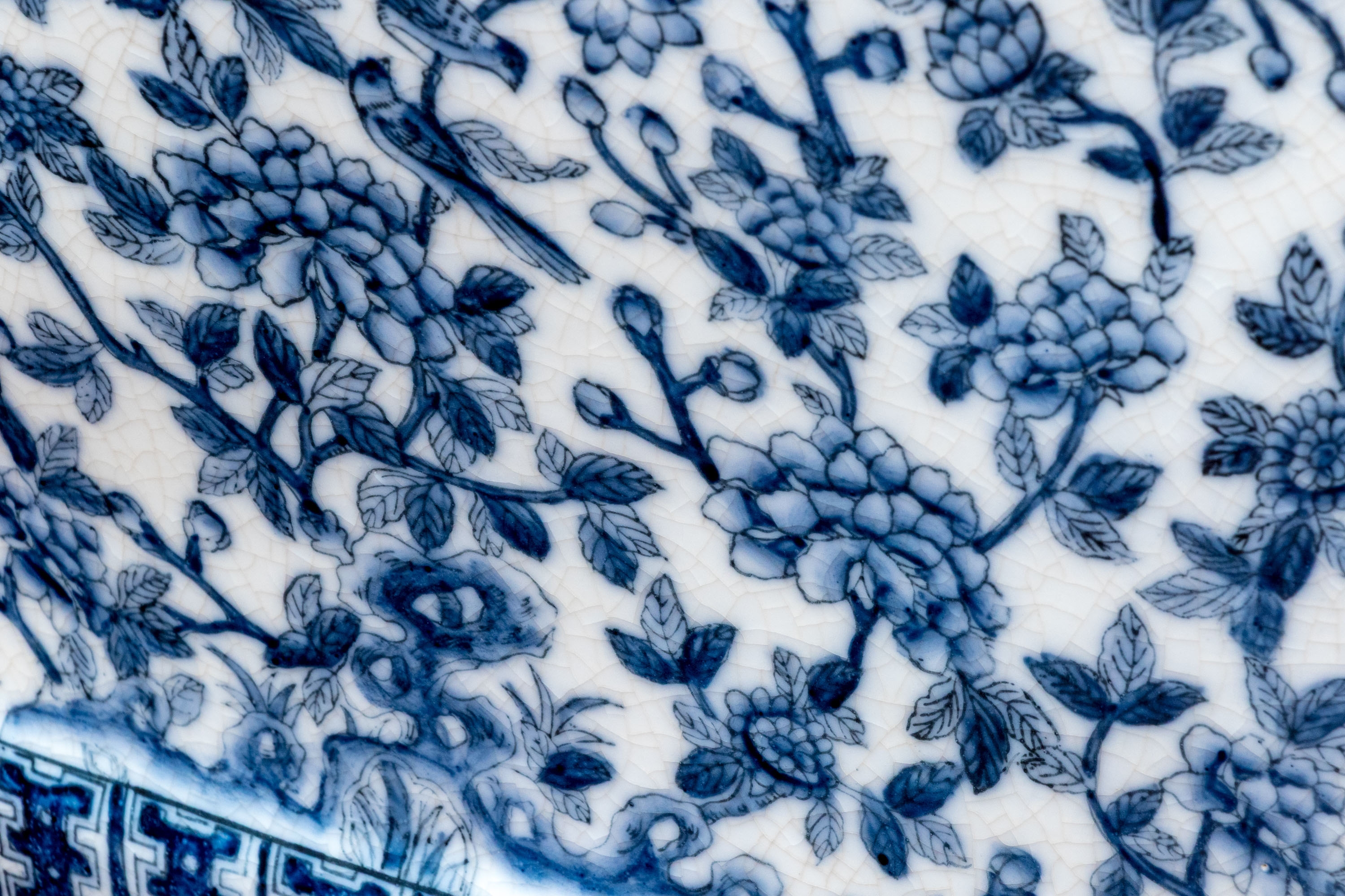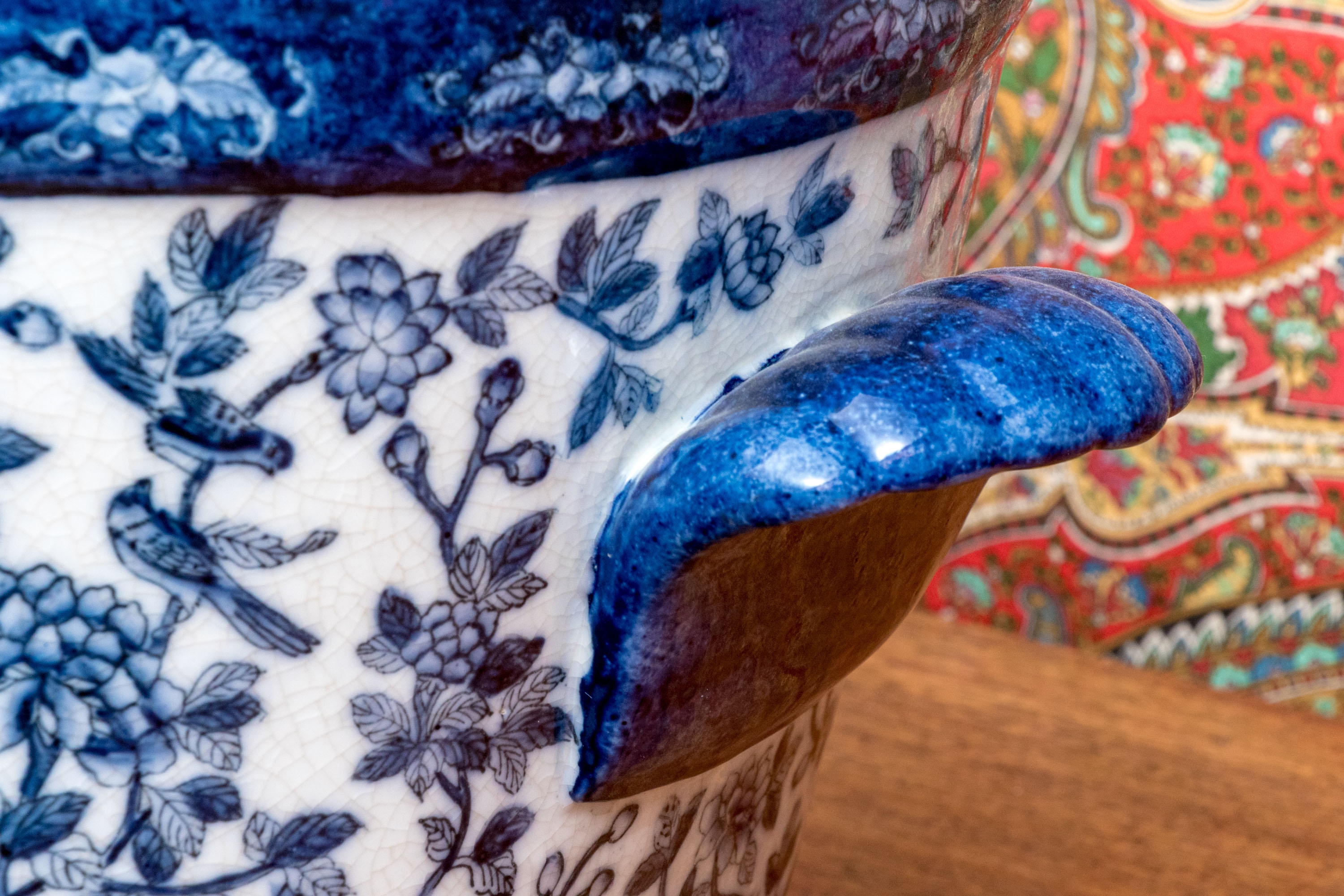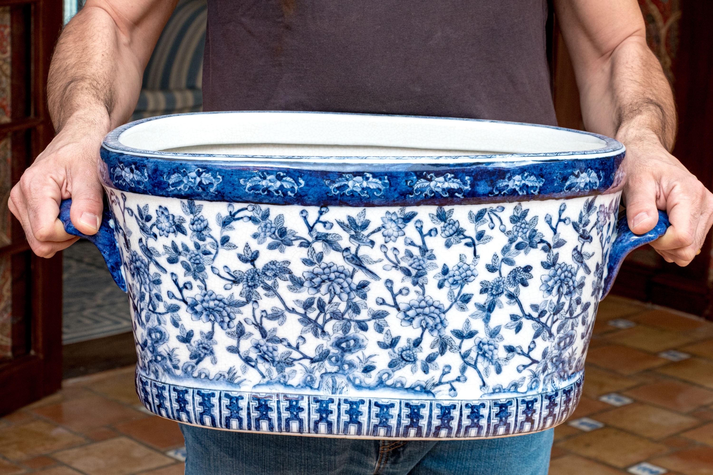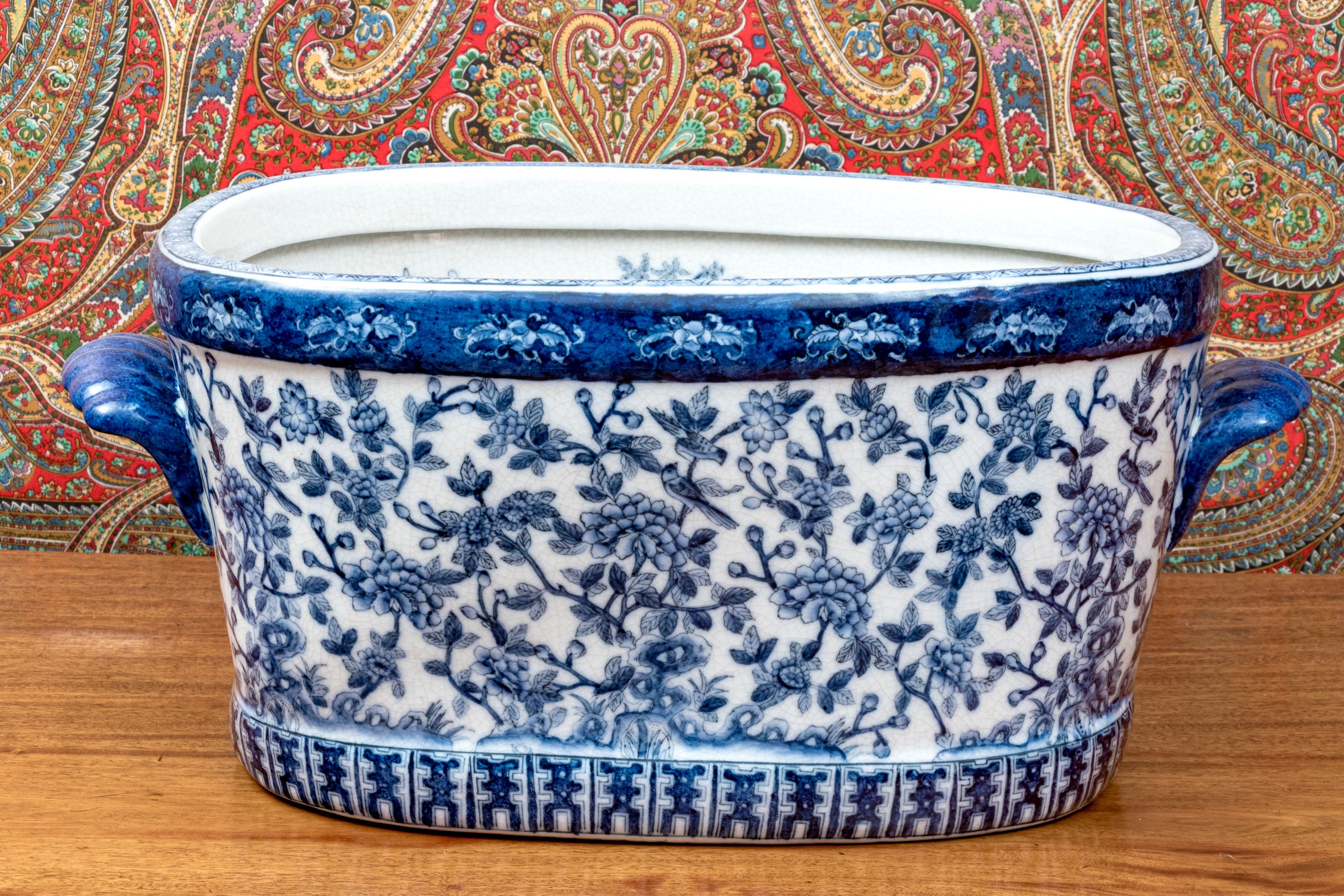 A gorgeous porcelain oval footbath with excellent Chinese export style, showcasing an interior decorated with koi or carp motifs. The exterior features a blue banded rim, blue bracket handles, and ornate monochromatic blue decoration incorporating birds, flowering branches, and rockery. Marked underfoot.