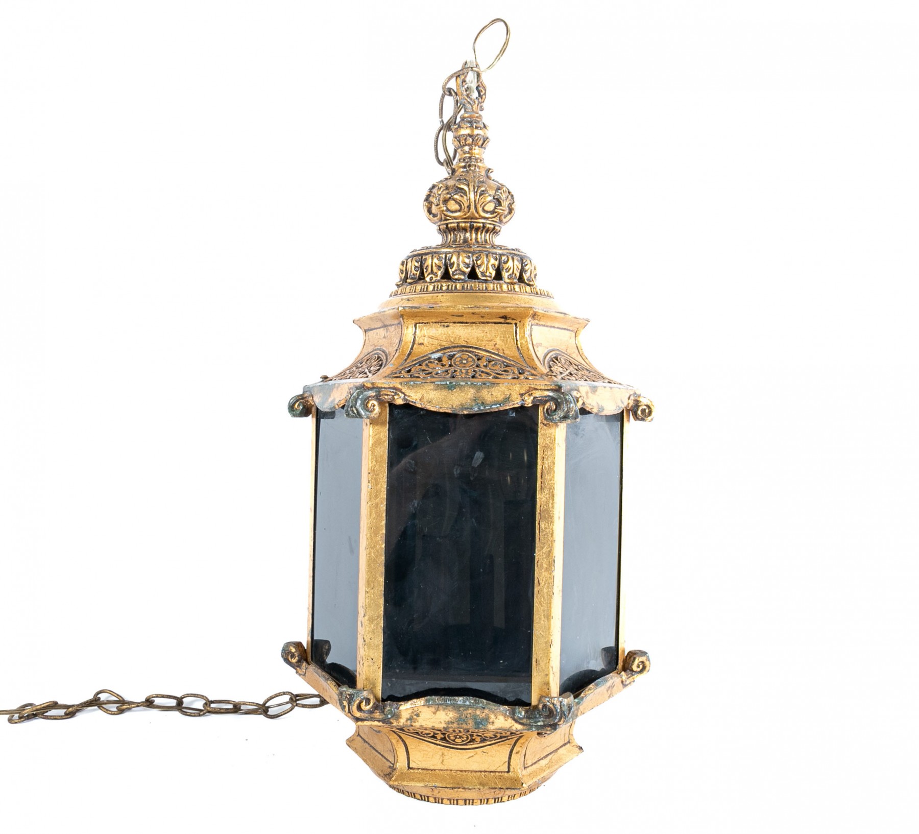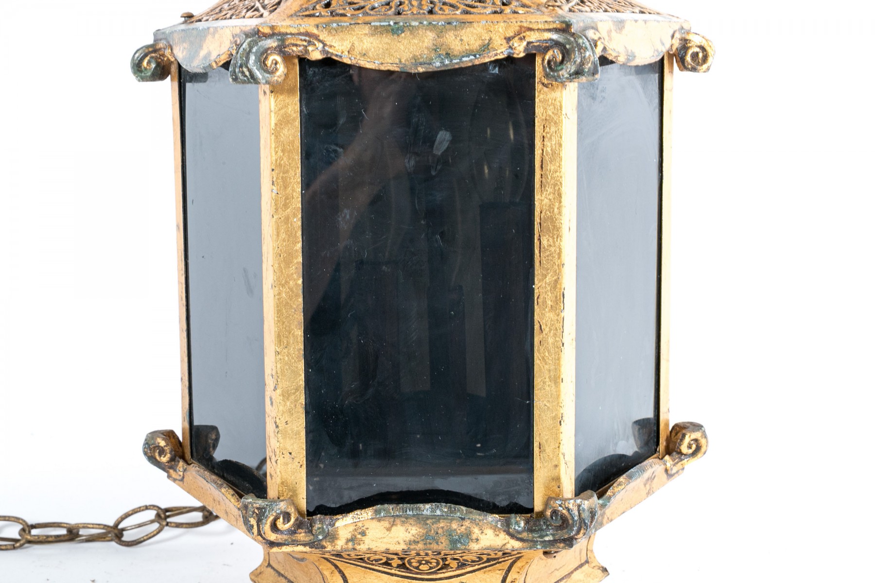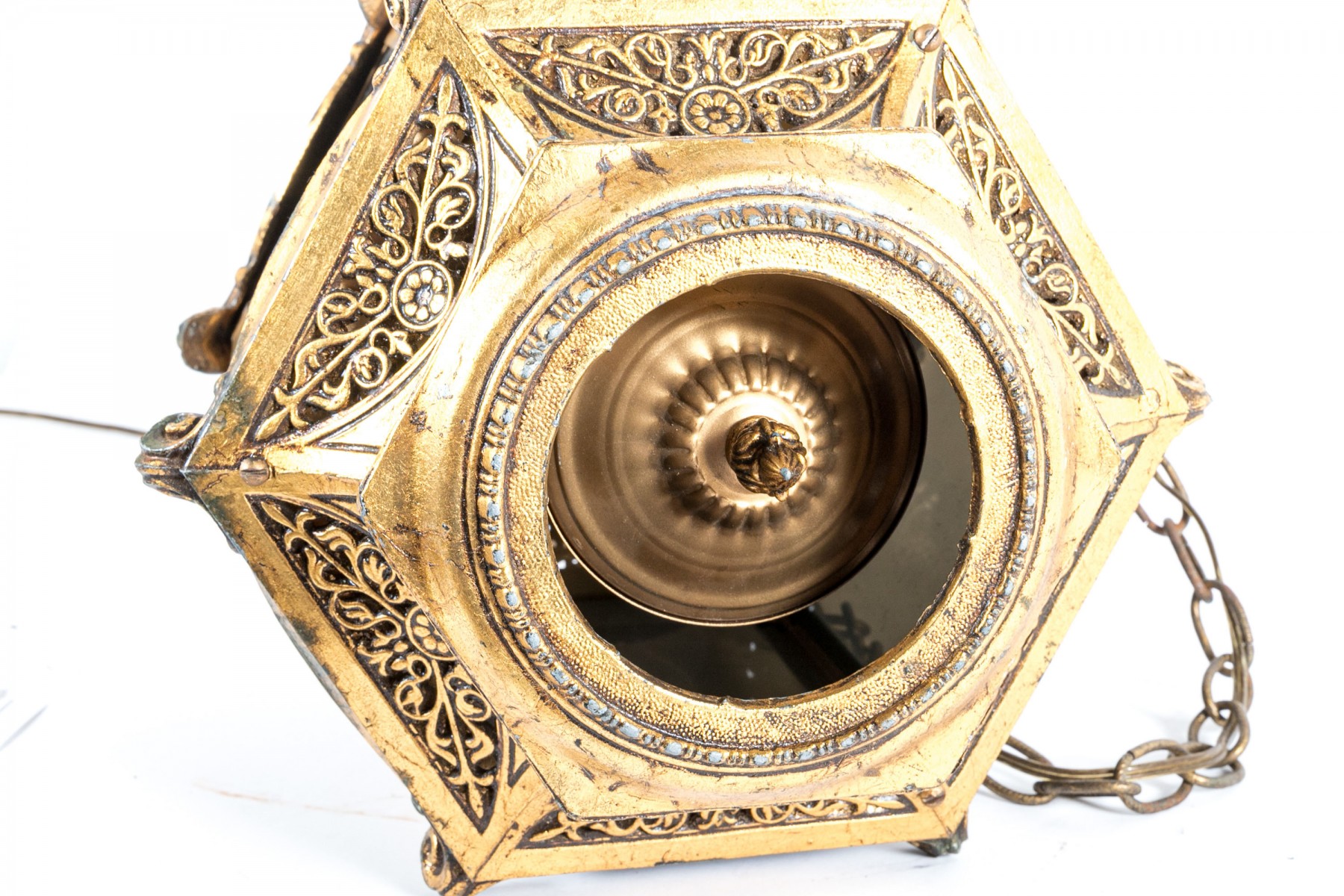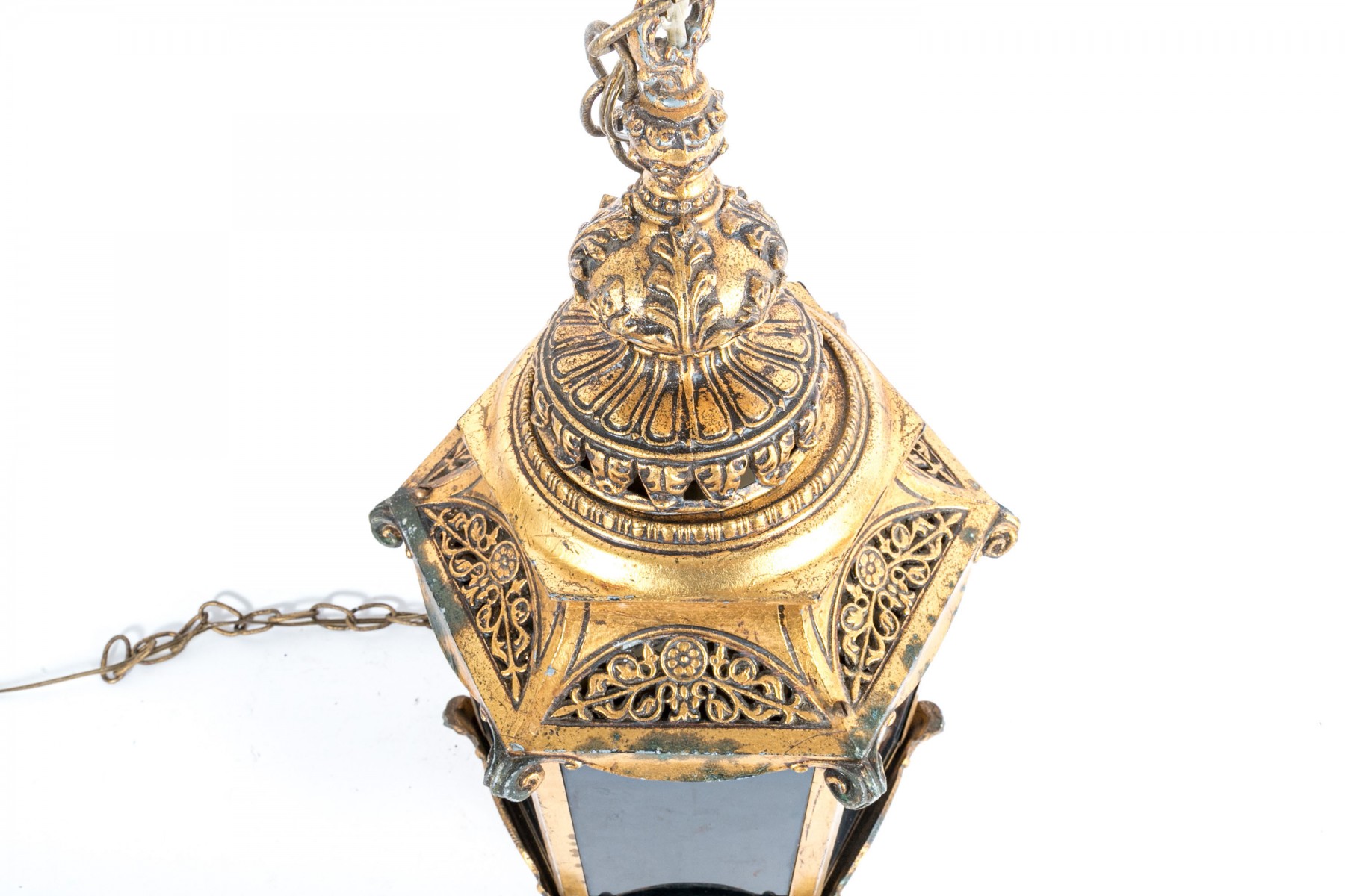 An impressive lantern-form pendant light displaying ornately tiered relief at the top, with foliate and scrolled motifs leading to a hexagonal body with scrolled adornments at the corners of black plexiglass panels. Illuminated using three electric candle sockets.