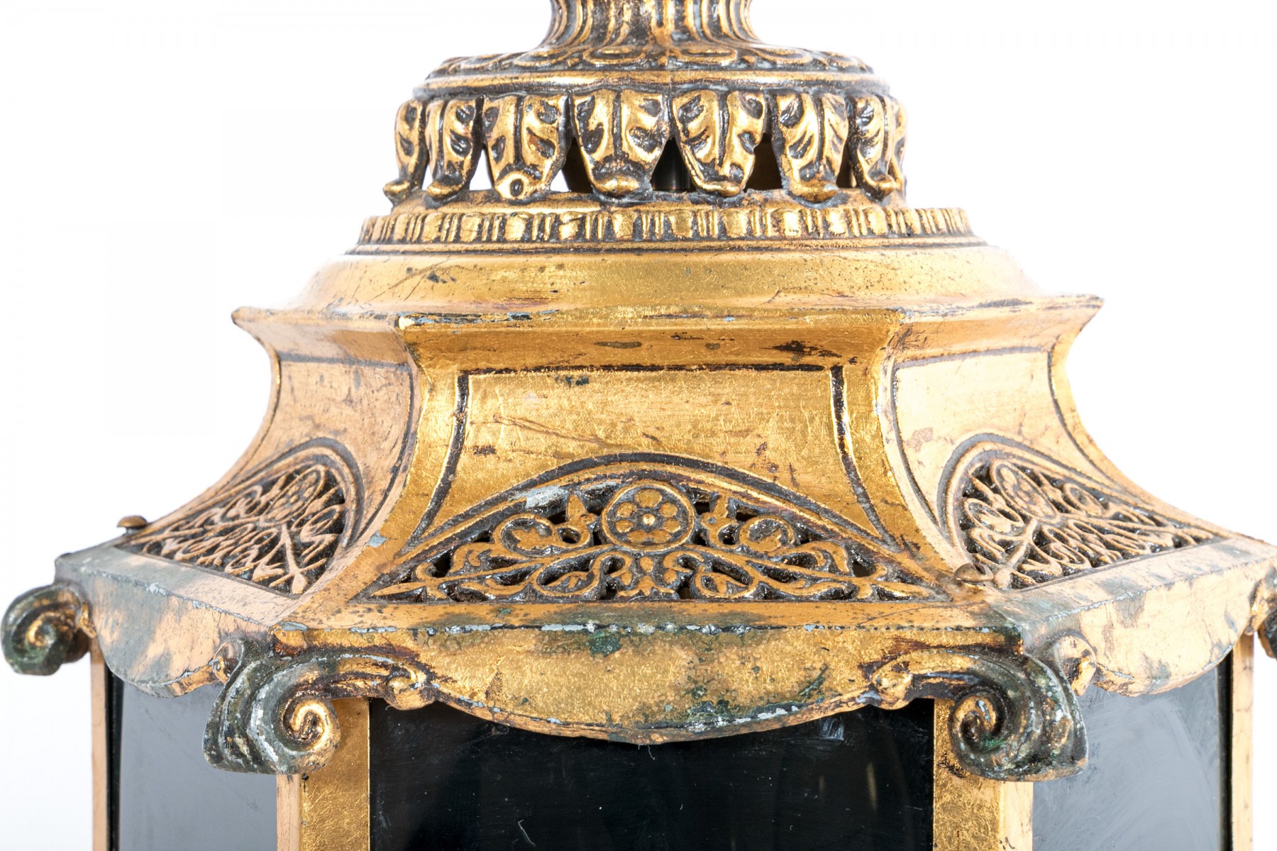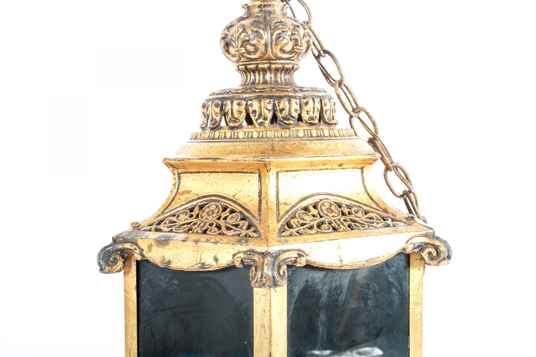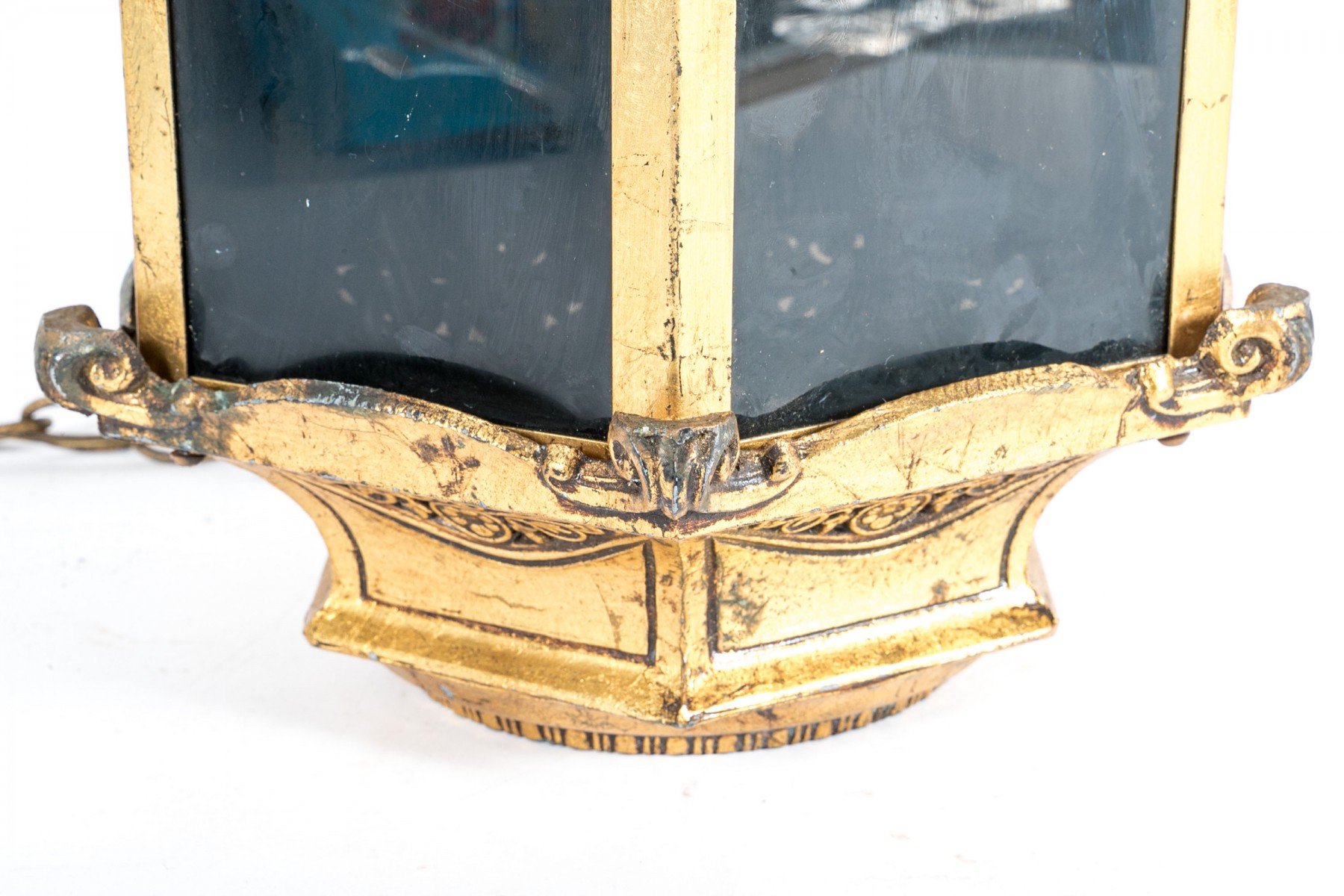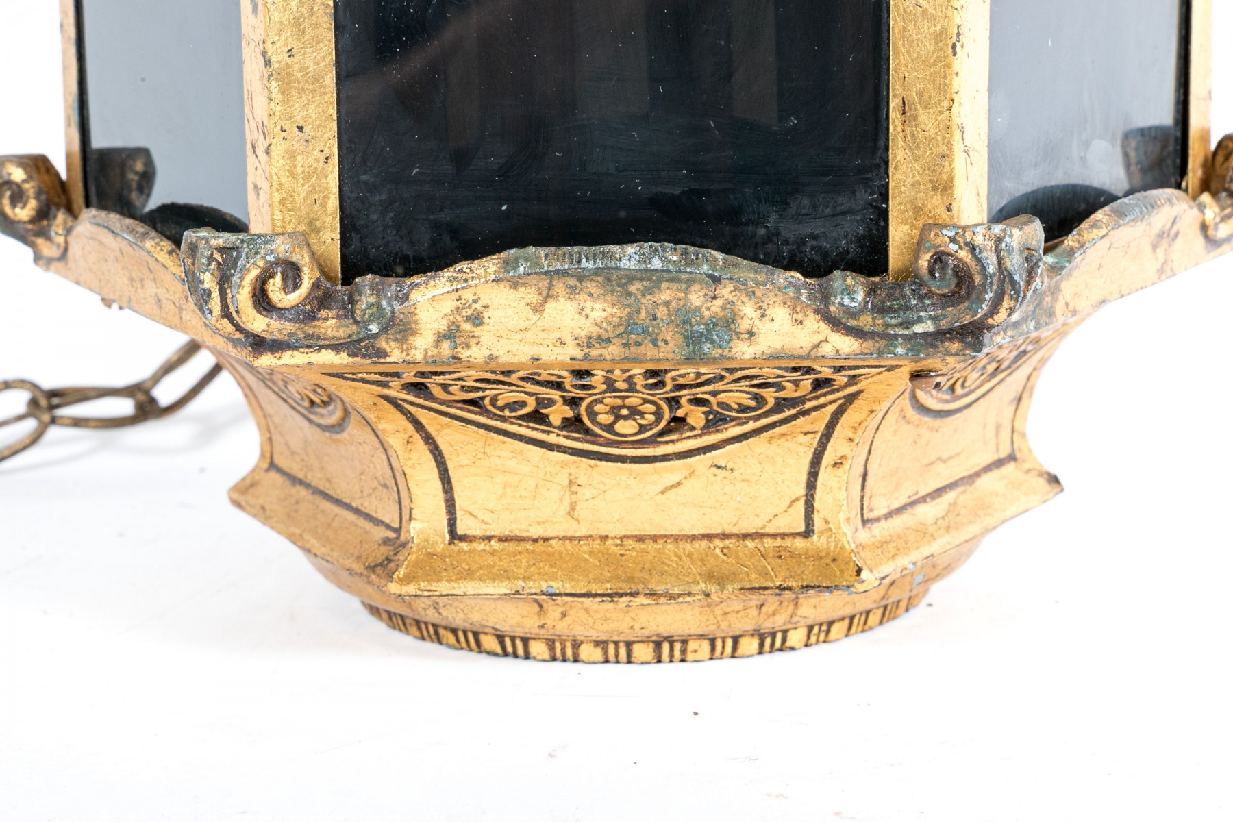 An impressive lantern-form pendant light displaying ornately tiered relief at the top, with foliate and scrolled motifs leading to a hexagonal body with scrolled adornments at the corners of black plexiglass panels. Illuminated using three electric candle sockets.