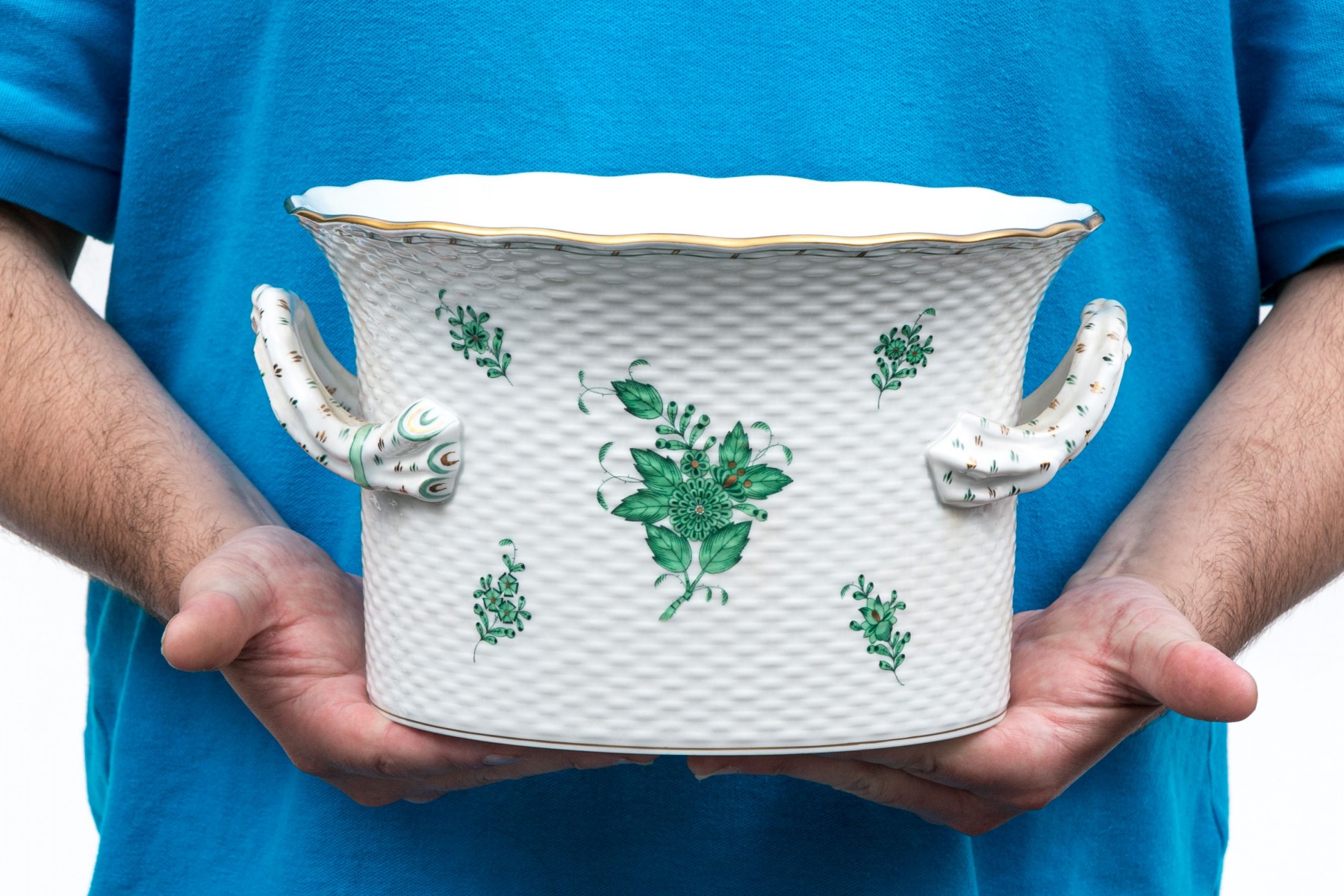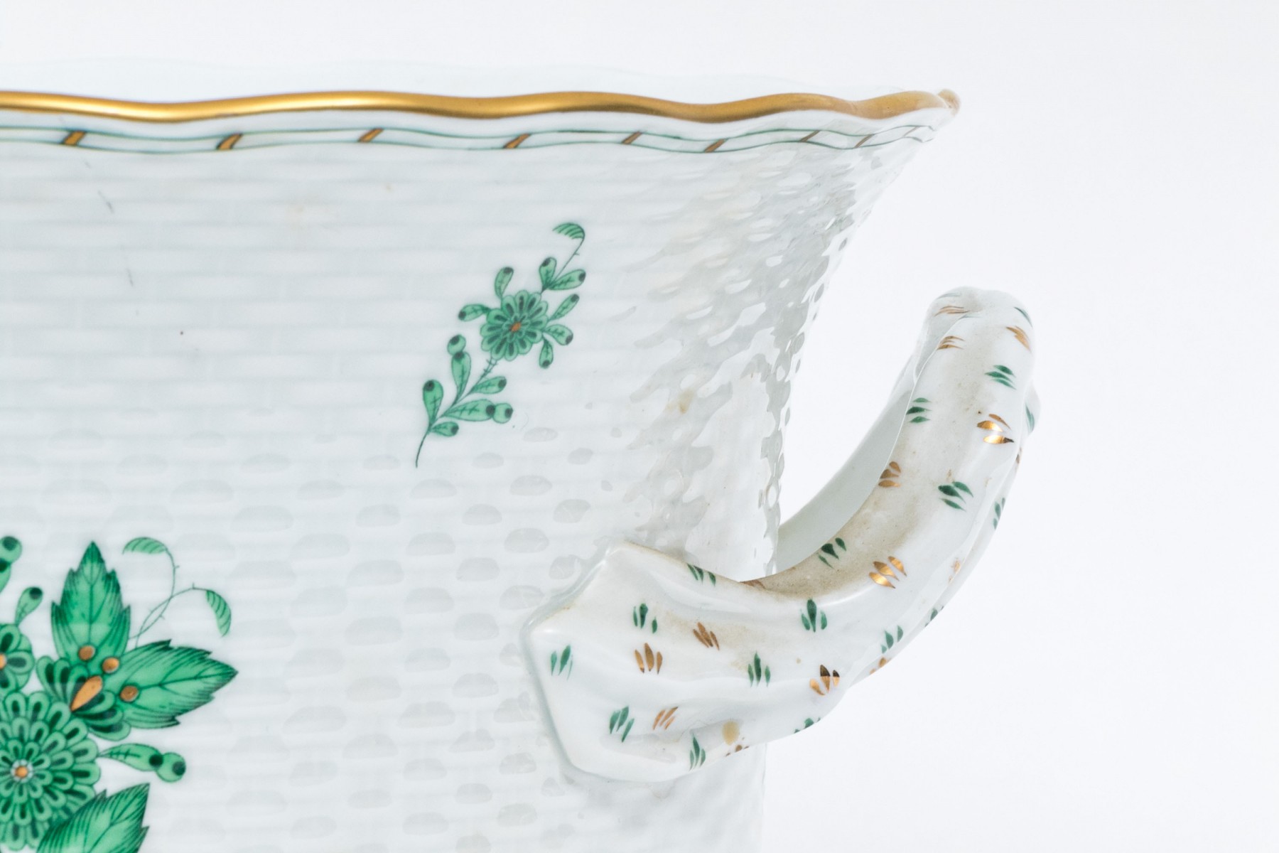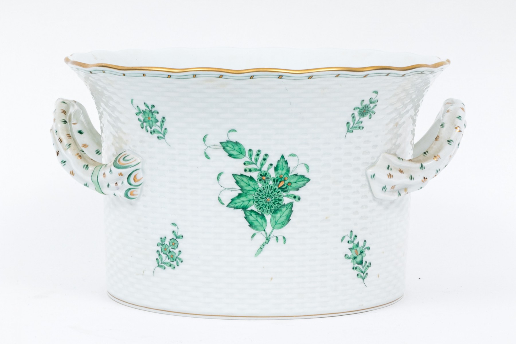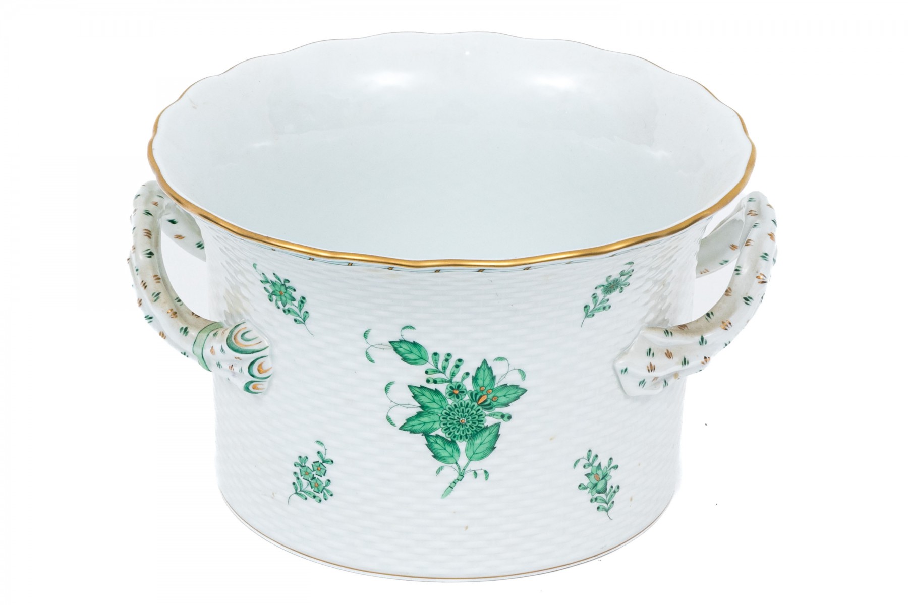 A fabulous Herend, Hungarian hand painted, two handled porcelain wine cooler. Scalloped trim with two moulded handles and a wonderful decorative scheme in green.