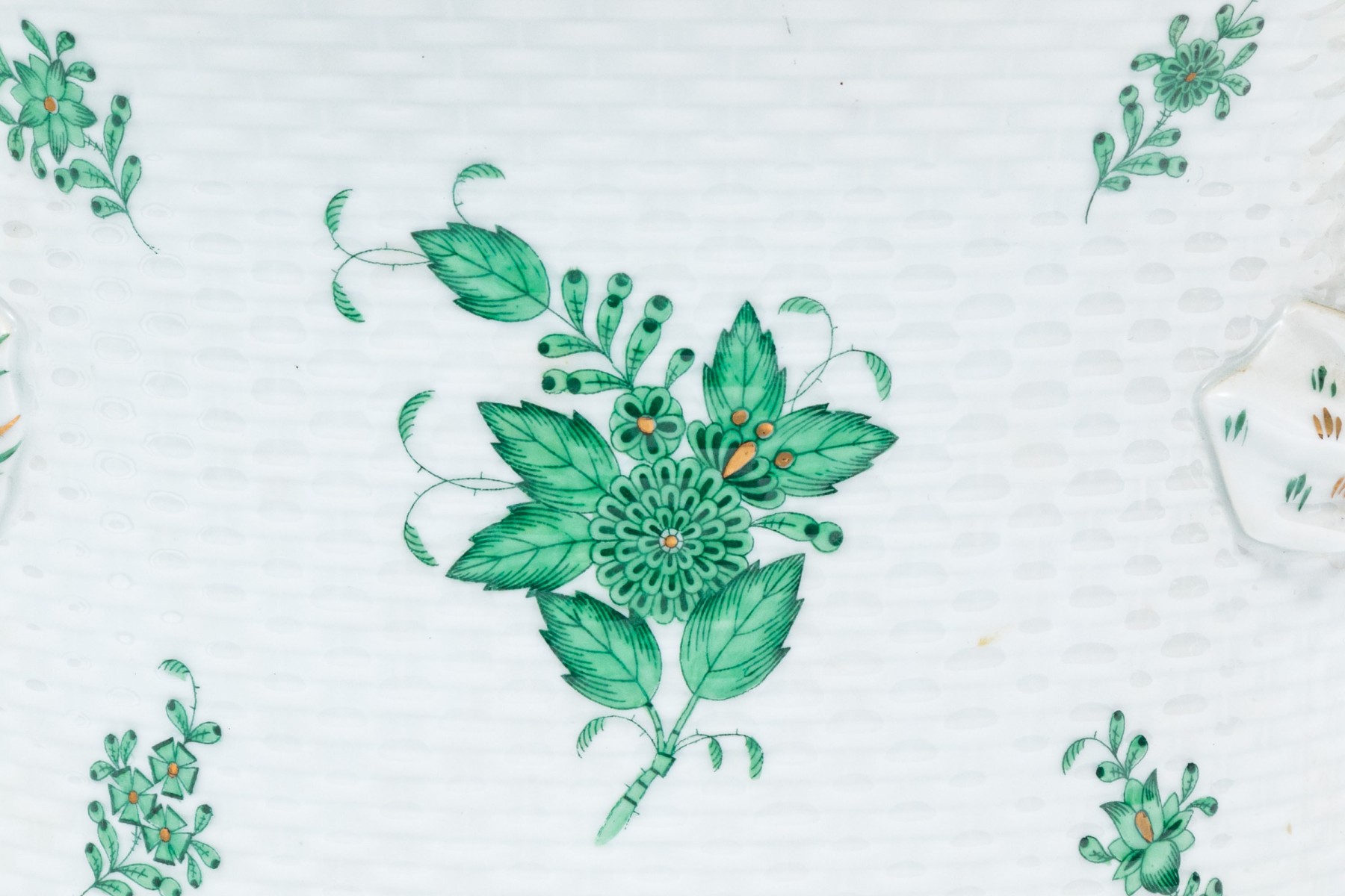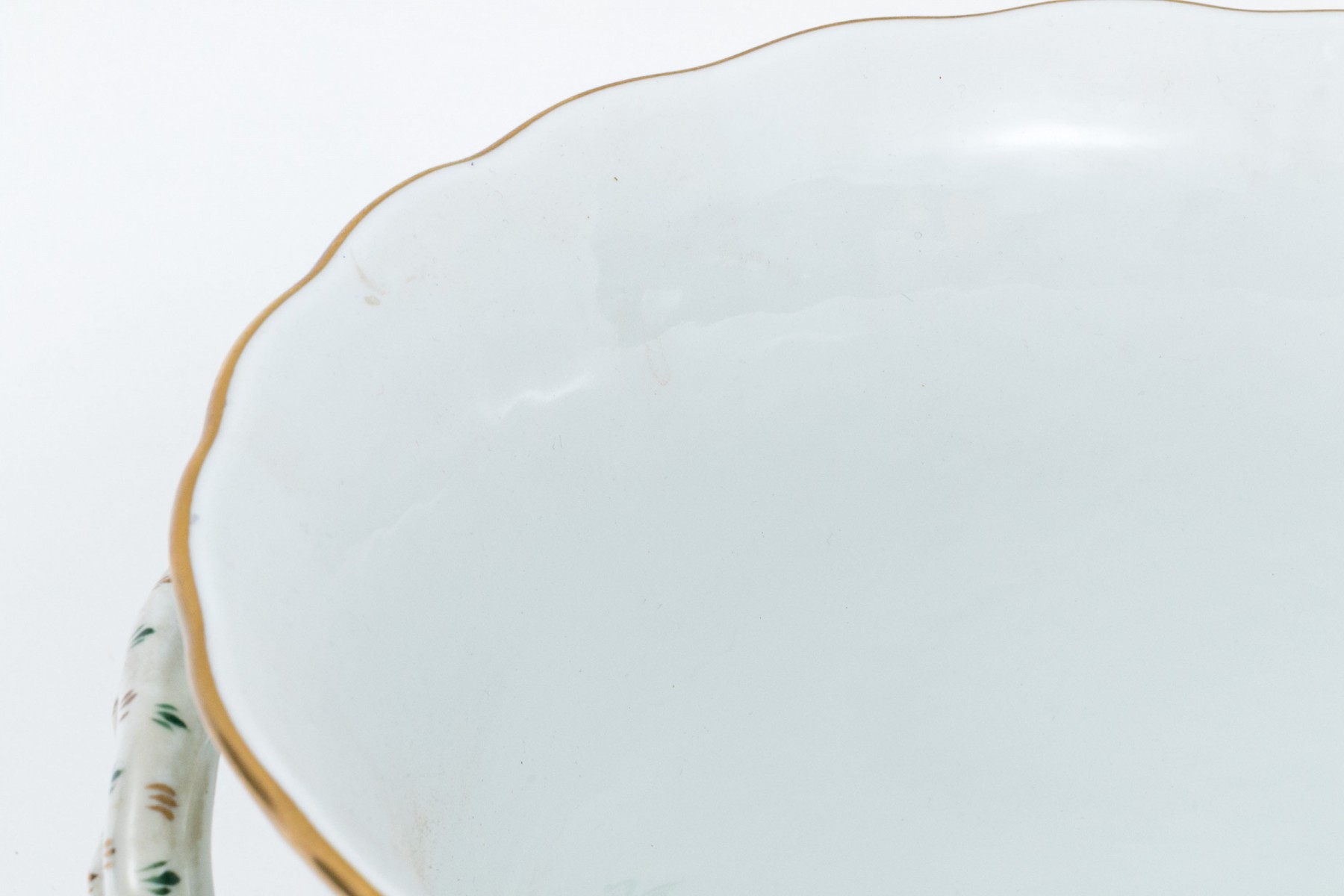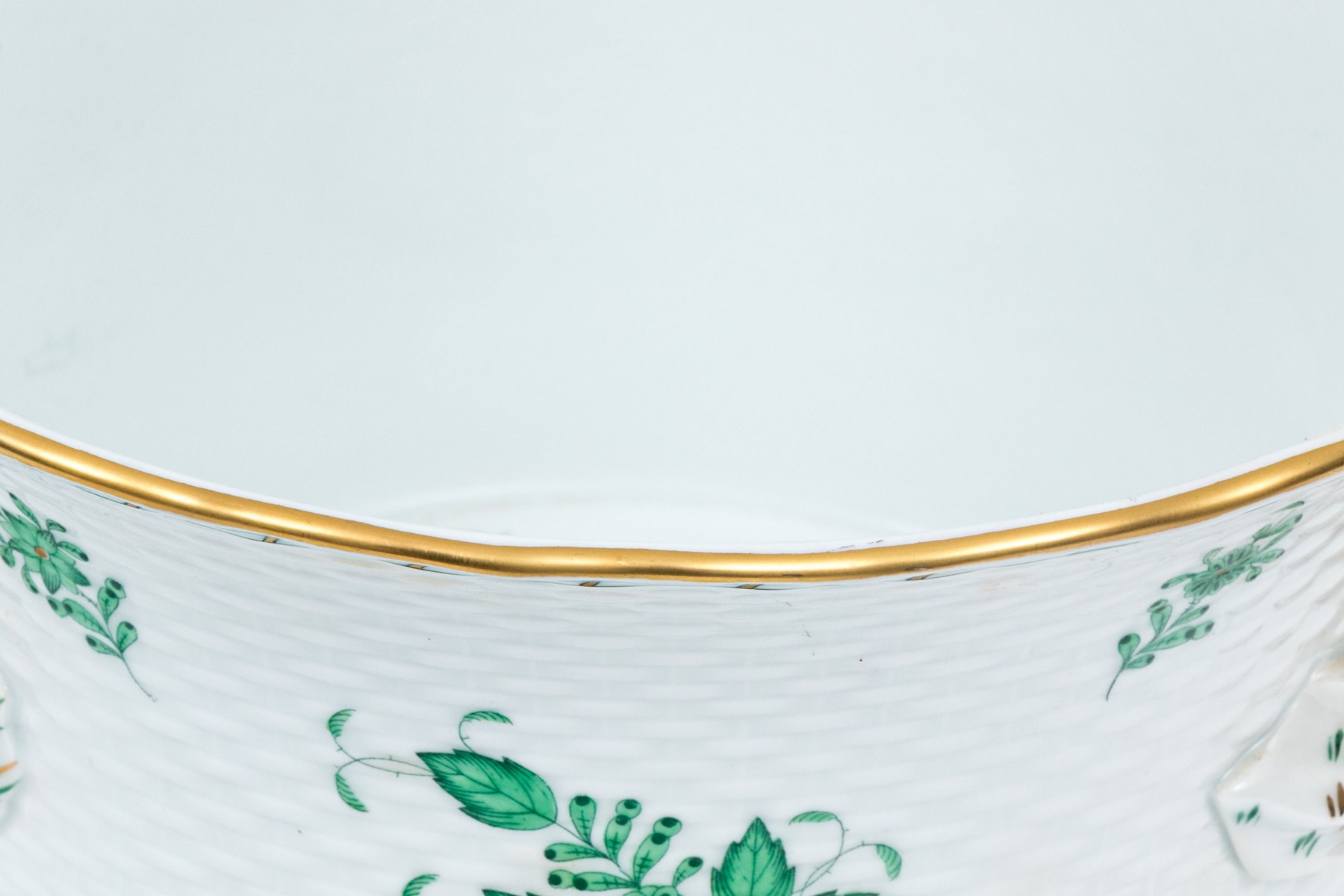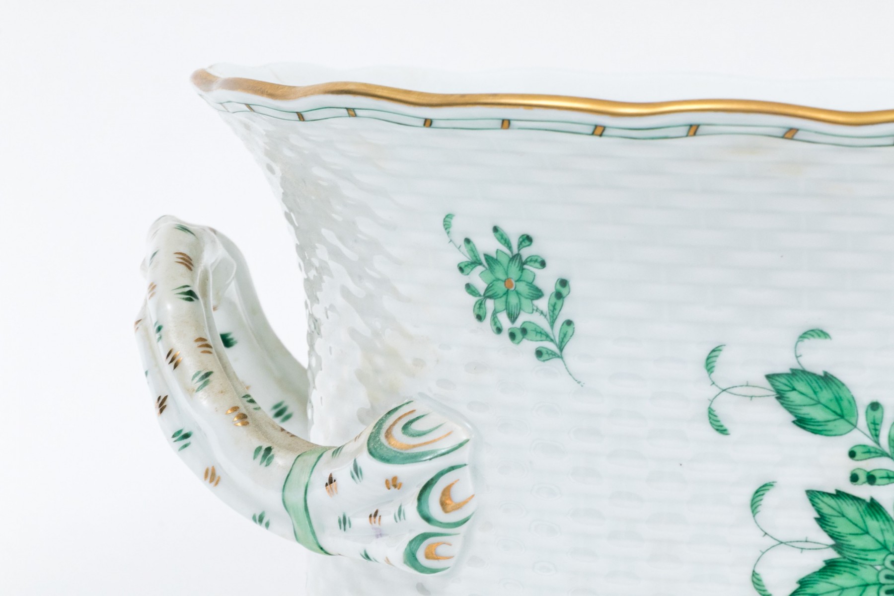 A fabulous Herend, Hungarian hand painted, two handled porcelain wine cooler. Scalloped trim with two moulded handles and a wonderful decorative scheme in green.
