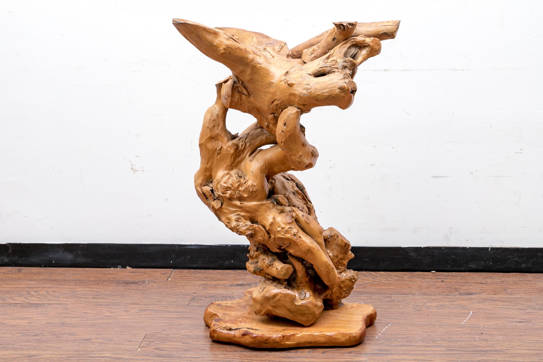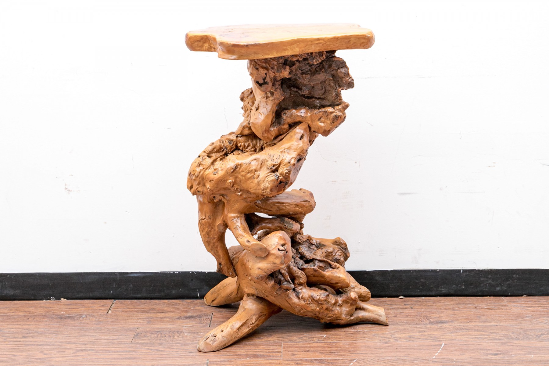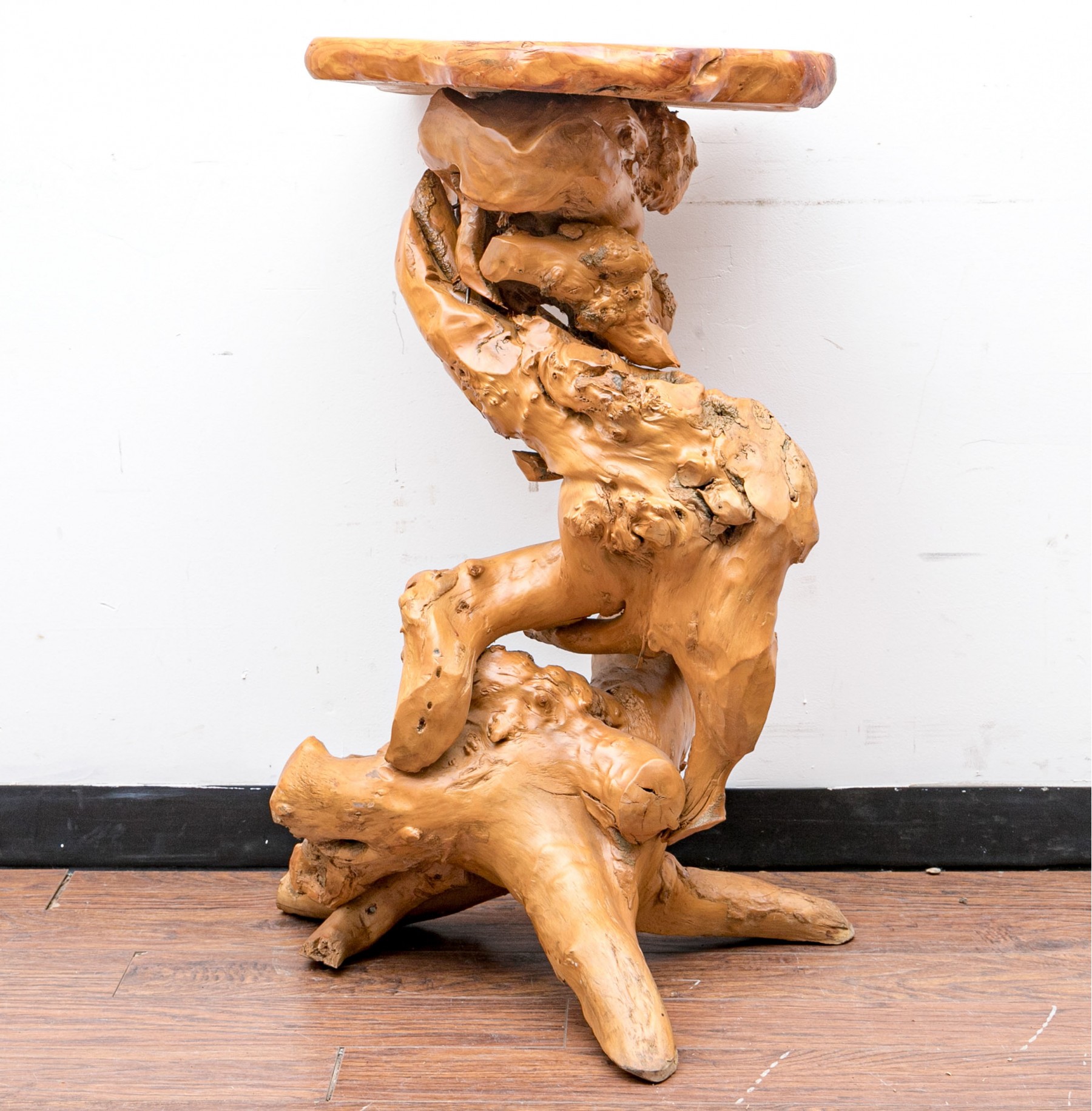 An impressive knotty wood stand in honeyed light brown, displaying intertwining branches for an organically flowing, asymmetrical form.