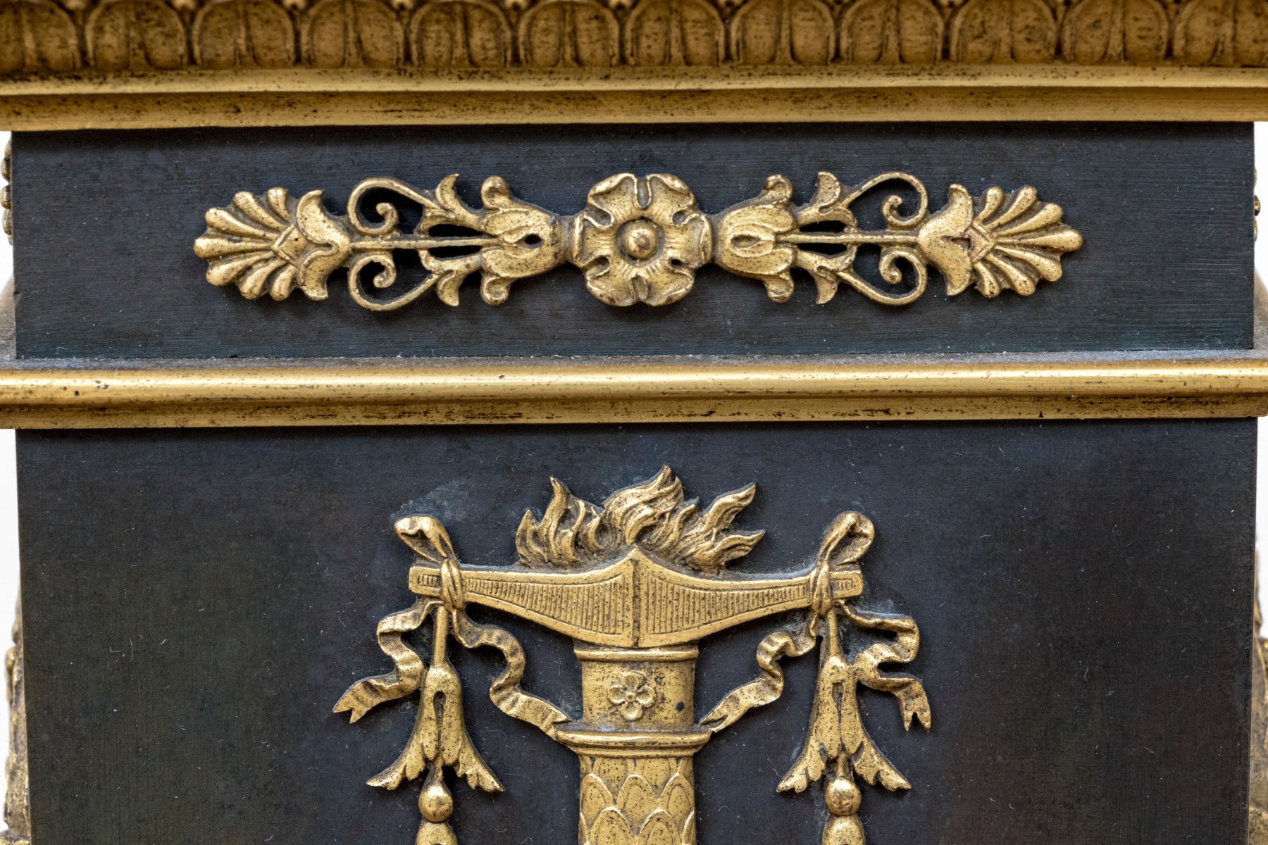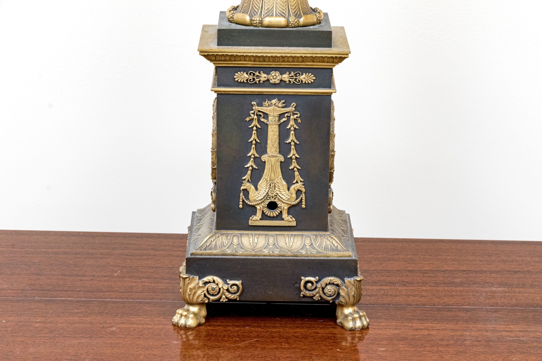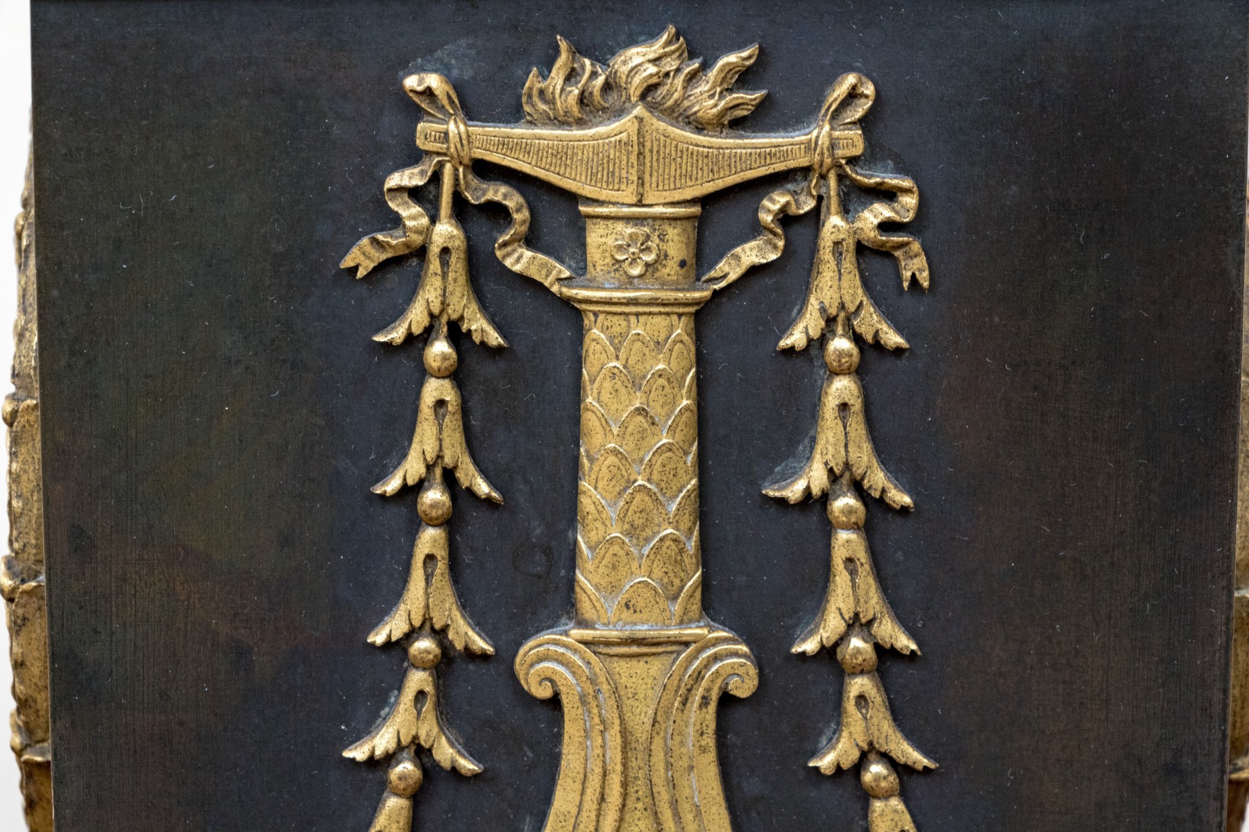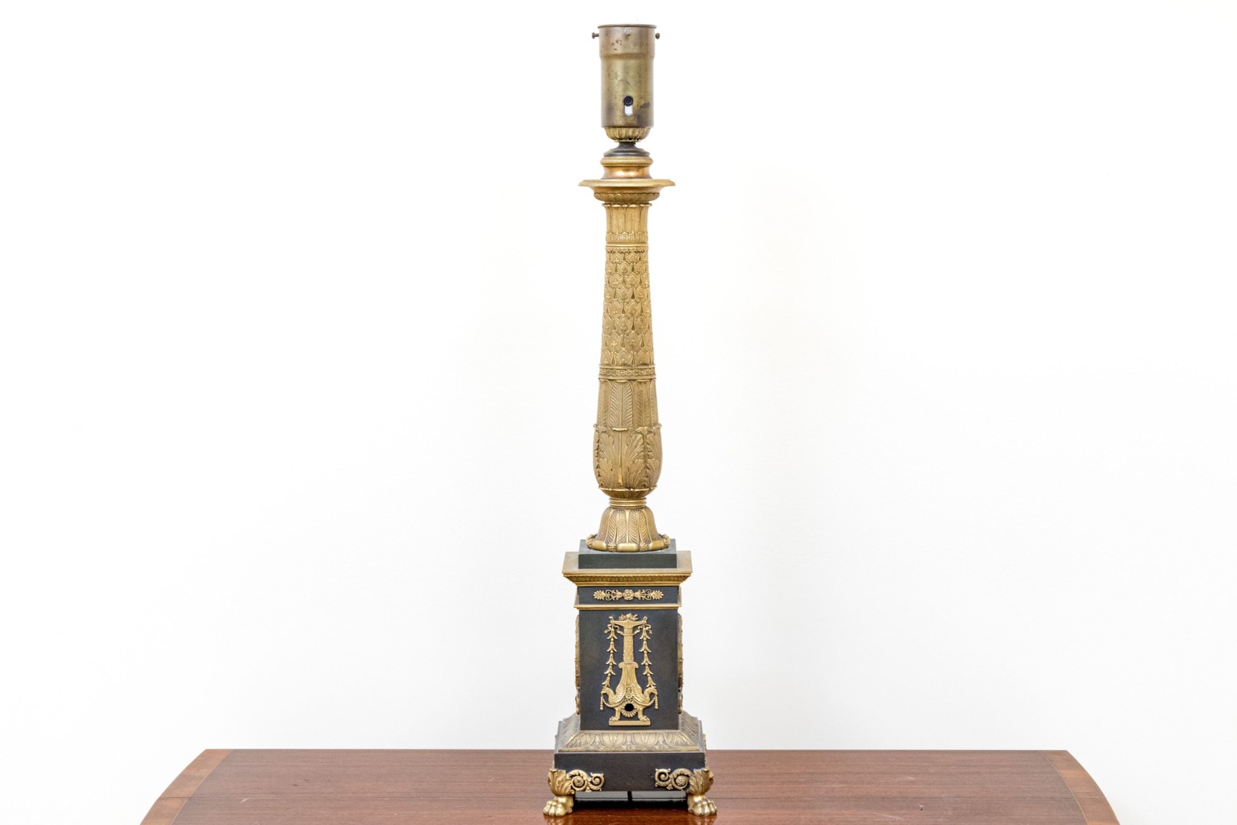 Elaborately decorated brass with black metal. The brass column support with a leafy capital over dense tiers of leafy motifs and a flared leafy foot. Mounted on a large tiered pedestal in brass and black metal decorated with appliques of wreaths with bows on two sides and tall flaming stands with griffin supports on the other two sides. The black base with leafy top band and raised on foliate scrolled and lion paw feet. The top mount lacking the shade, probably glass.