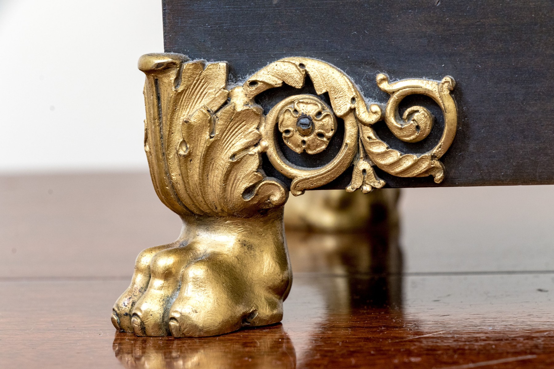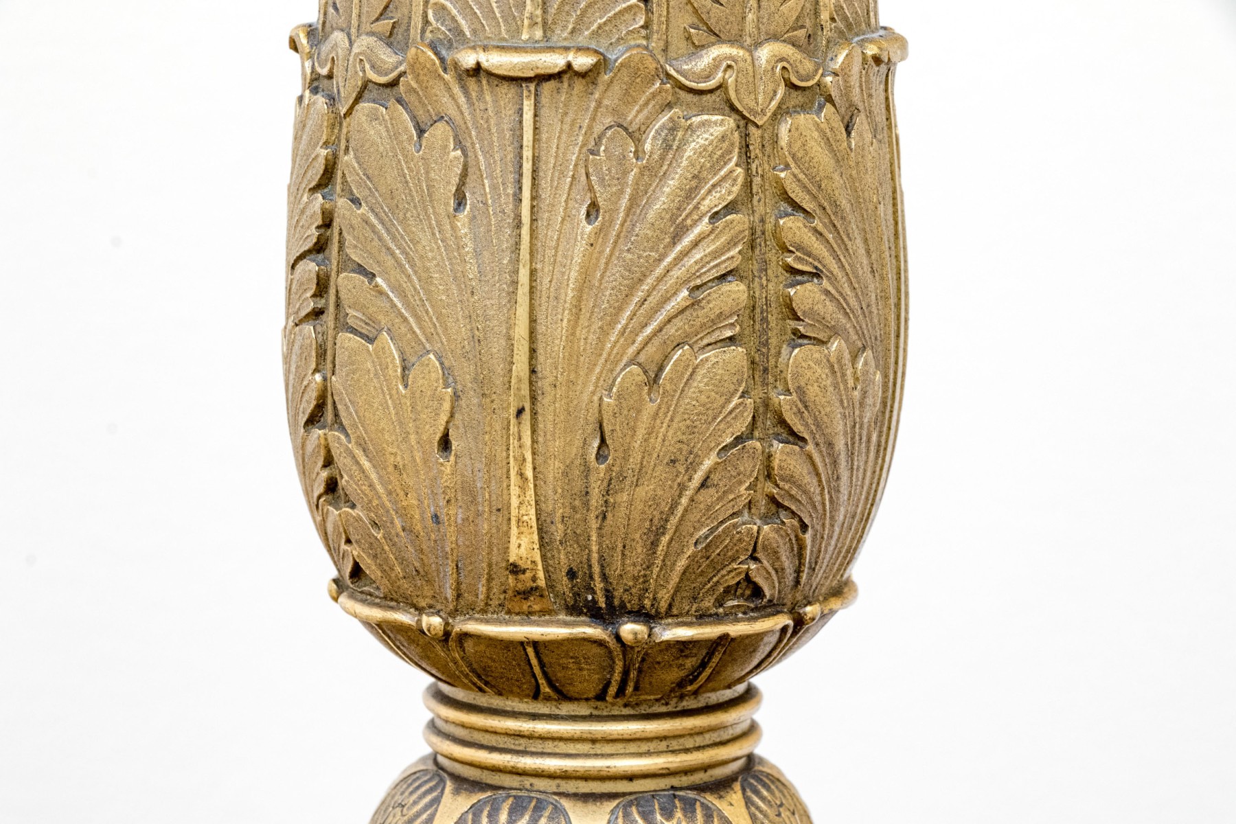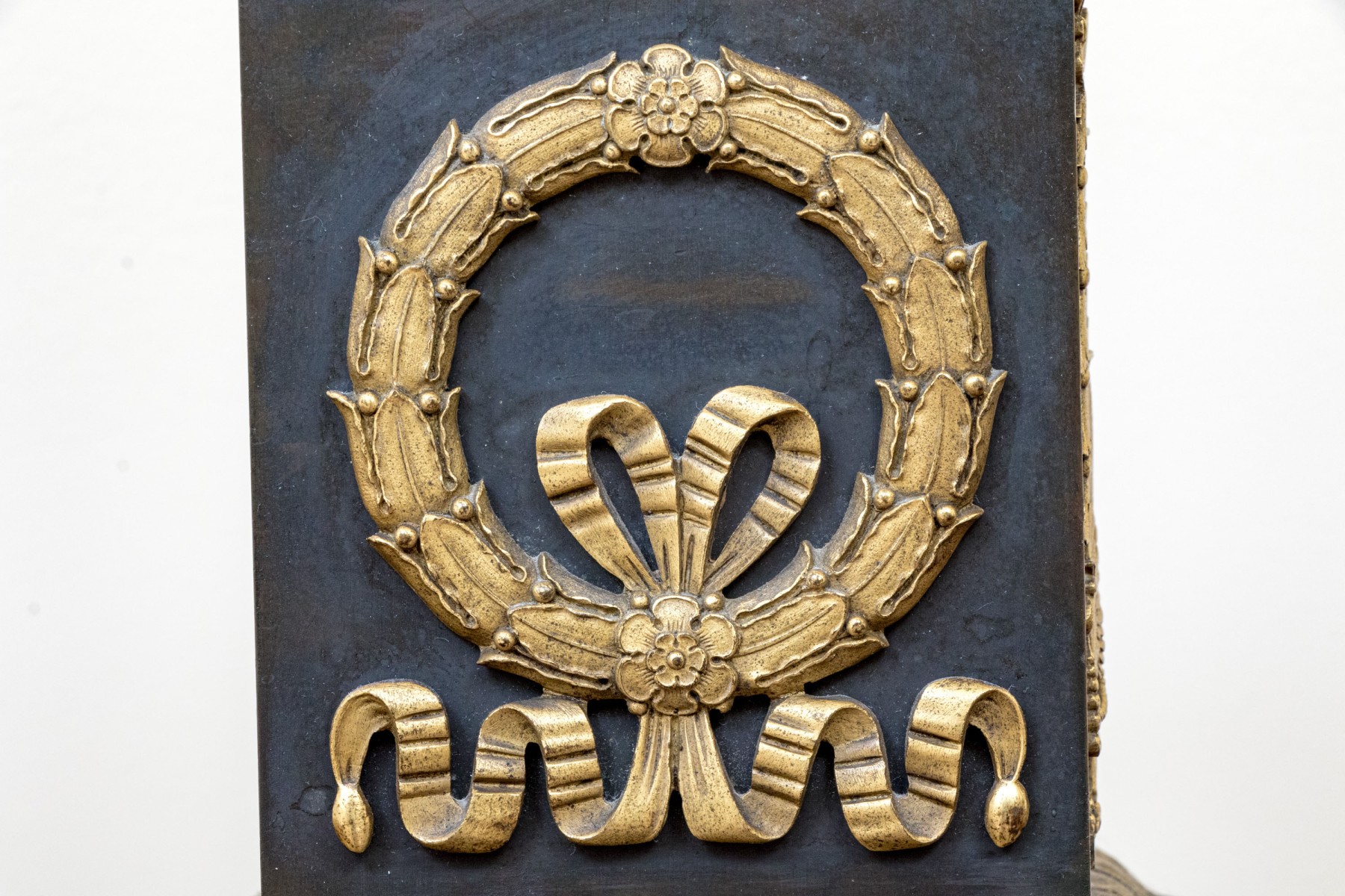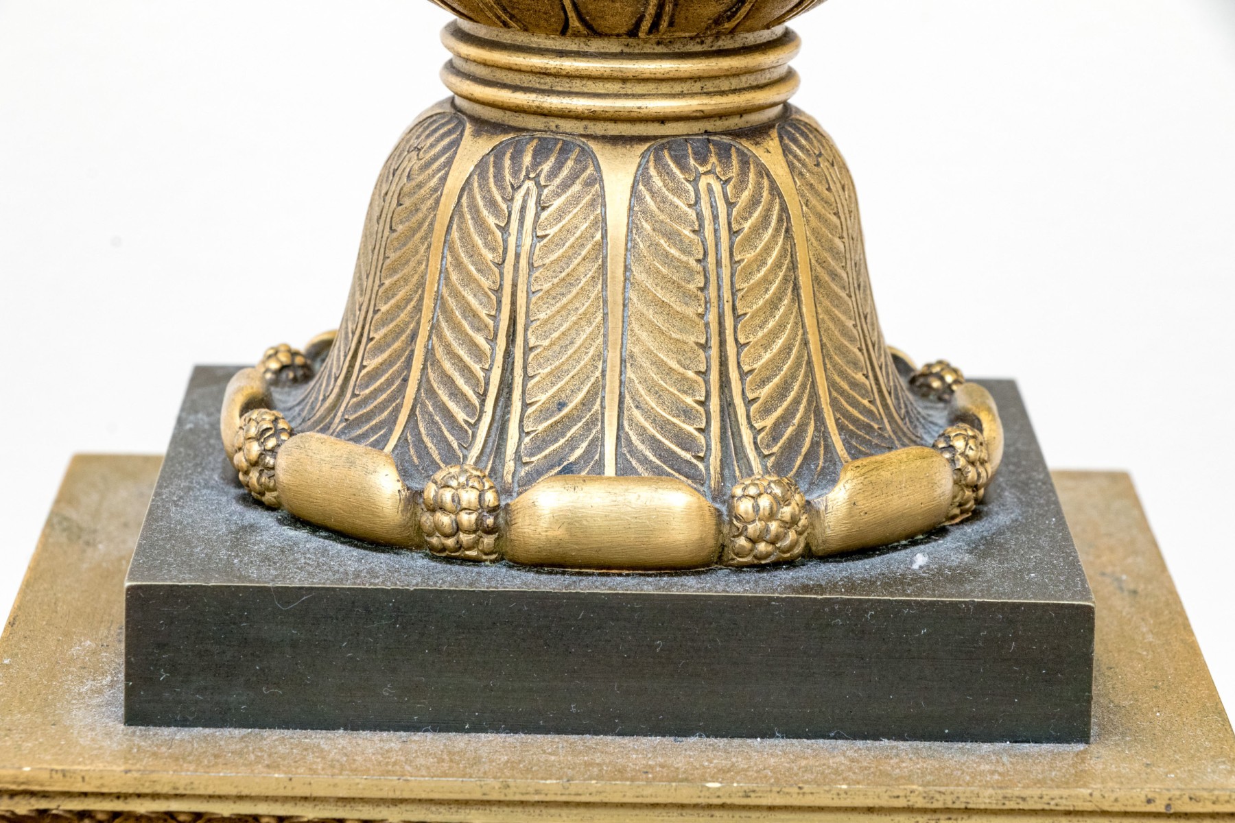 Elaborately decorated brass with black metal. The brass column support with a leafy capital over dense tiers of leafy motifs and a flared leafy foot. Mounted on a large tiered pedestal in brass and black metal decorated with appliques of wreaths with bows on two sides and tall flaming stands with griffin supports on the other two sides. The black base with leafy top band and raised on foliate scrolled and lion paw feet. The top mount lacking the shade, probably glass.
