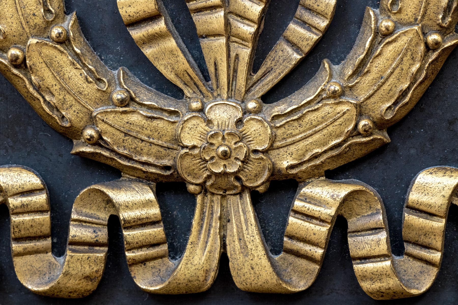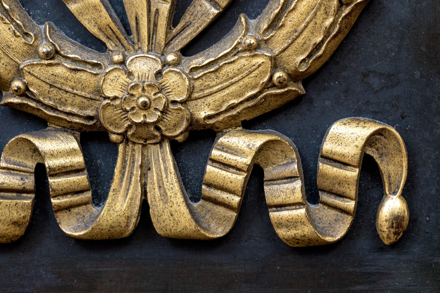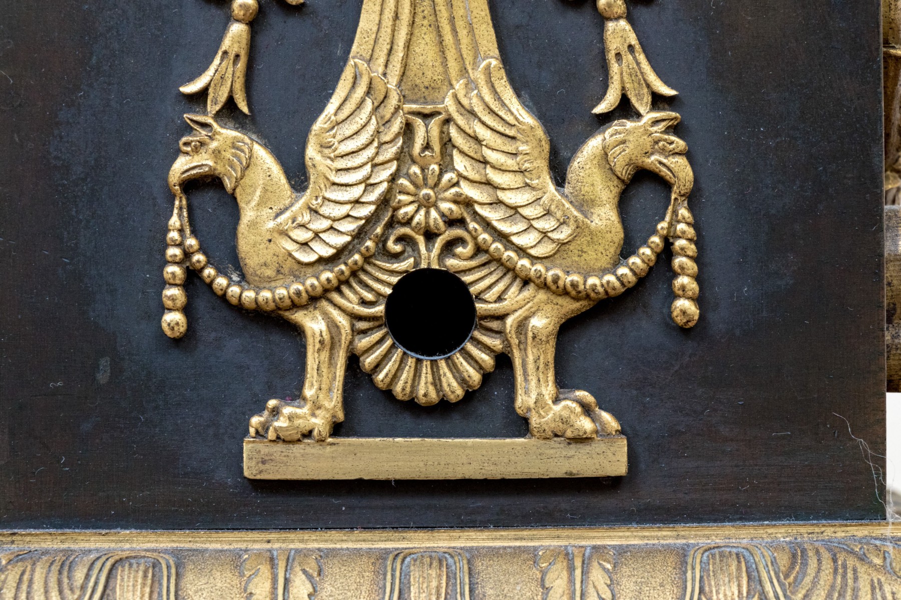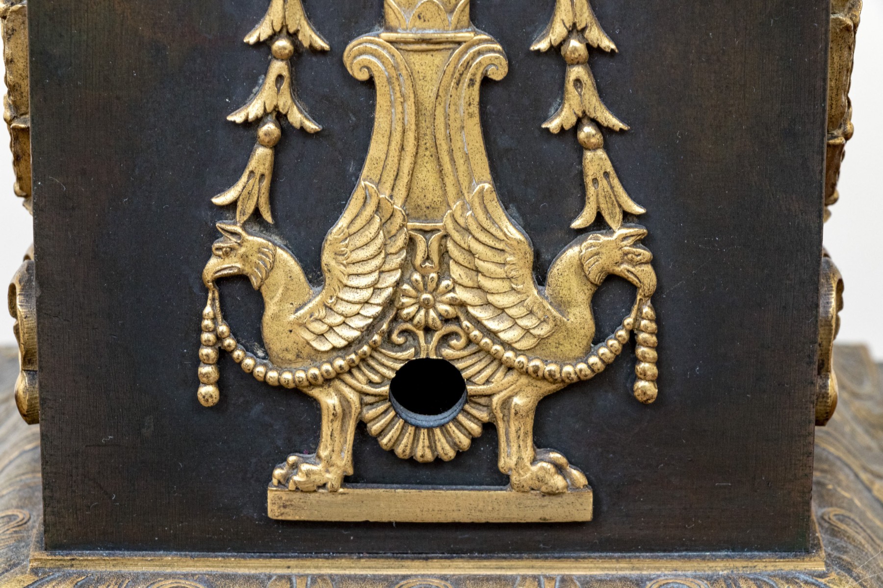Elaborately decorated brass with black metal. The brass column support with a leafy capital over dense tiers of leafy motifs and a flared leafy foot. Mounted on a large tiered pedestal in brass and black metal decorated with appliques of wreaths with bows on two sides and tall flaming stands with griffin supports on the other two sides. The black base with leafy top band and raised on foliate scrolled and lion paw feet. The top mount lacking the shade, probably glass.