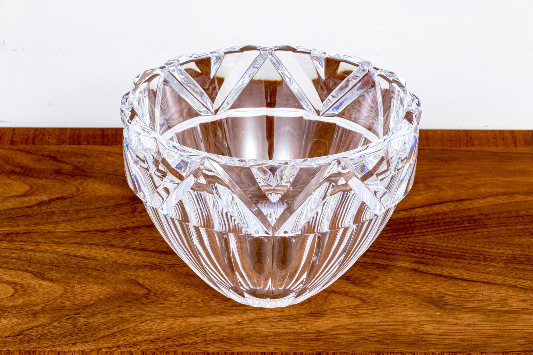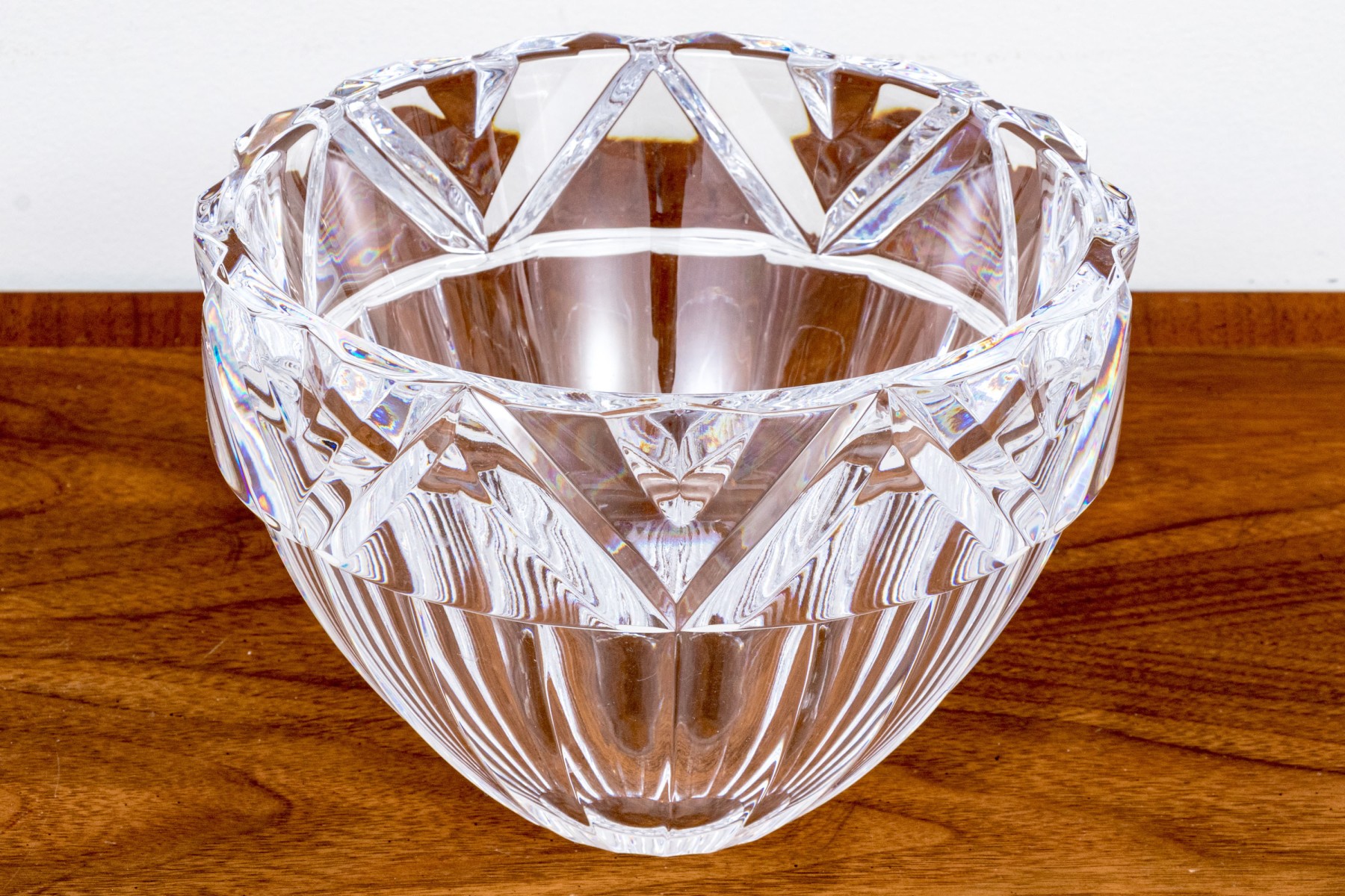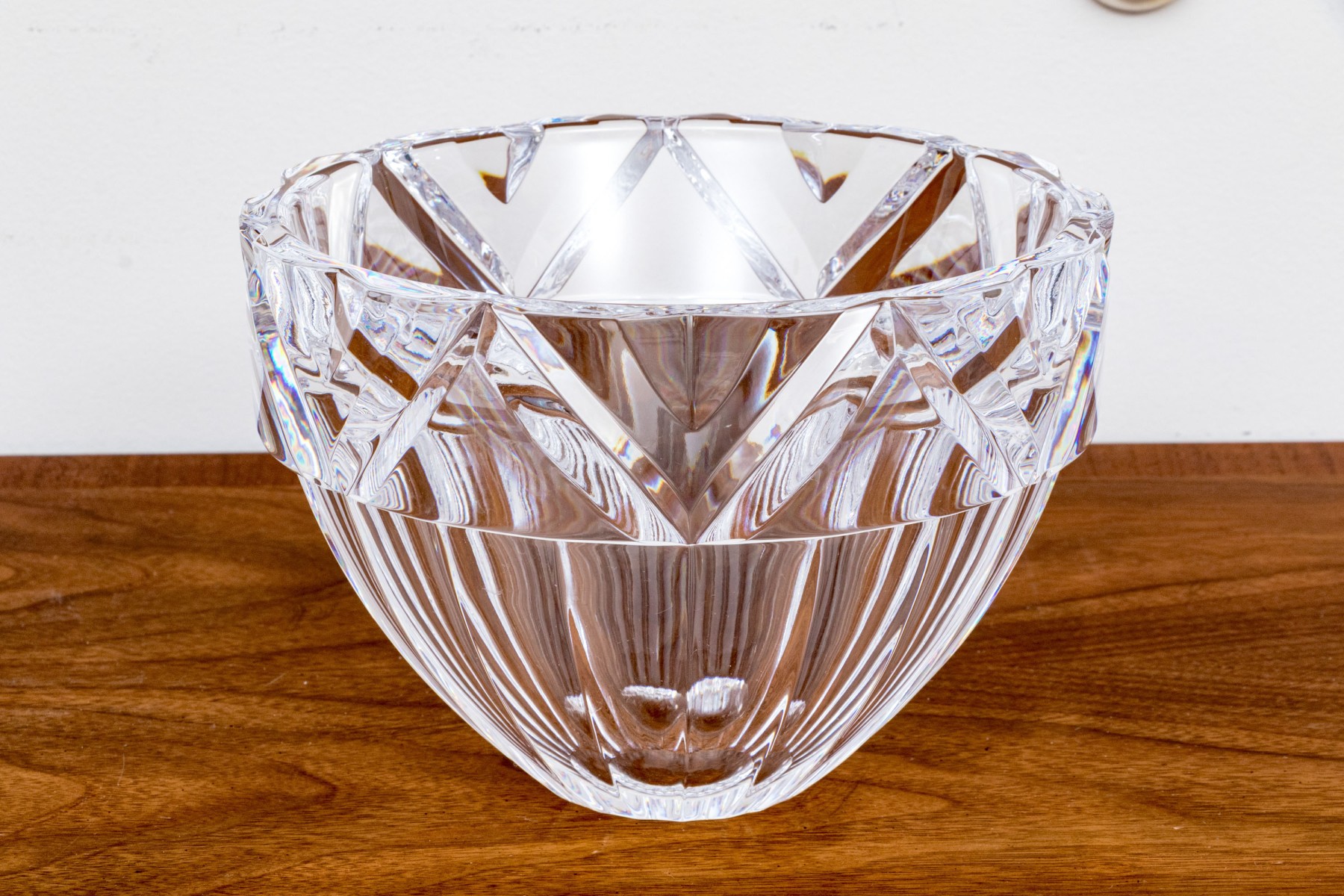 Orrefors “Erika Lagerbielke” cut crystal bowl displaying a wide, raised rim cut with dramatic V motifs overhanging an elegantly gadrooned body.