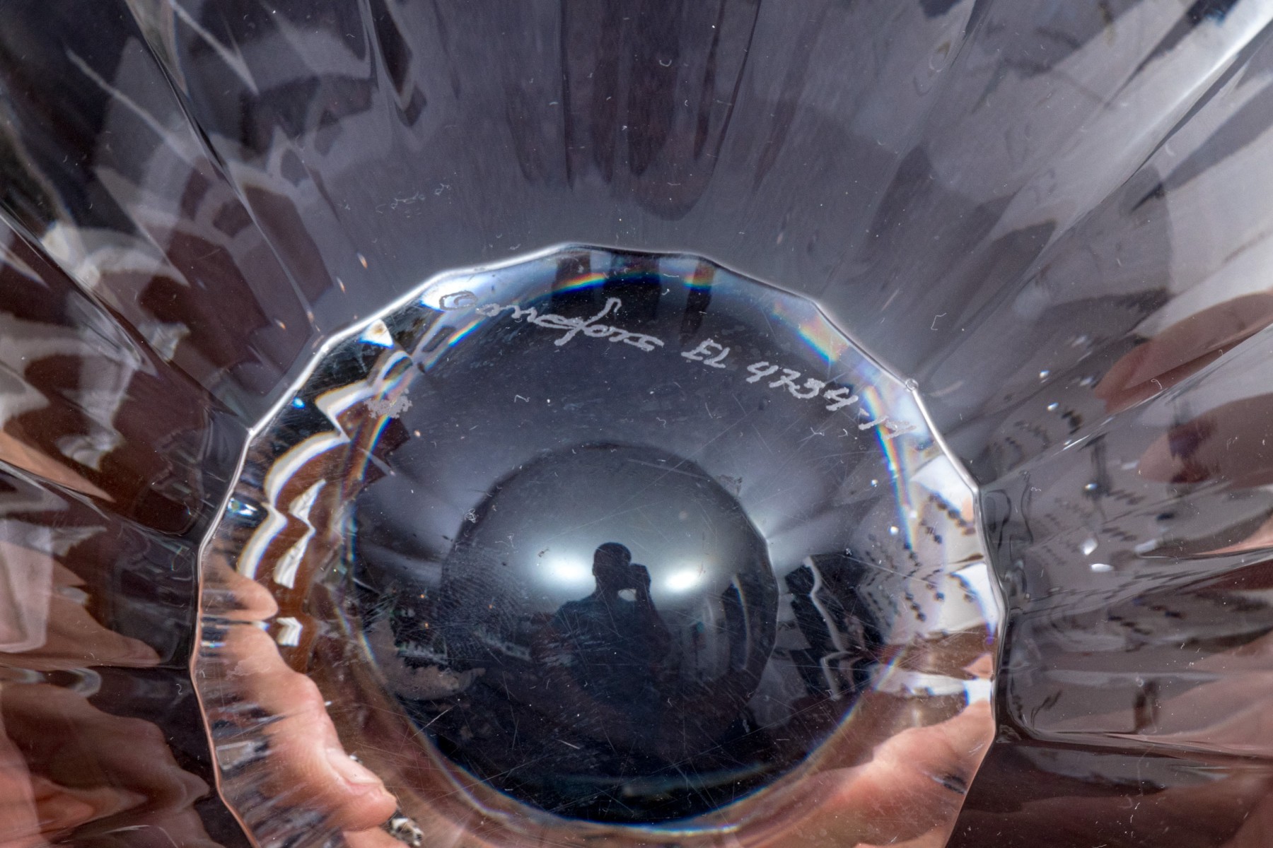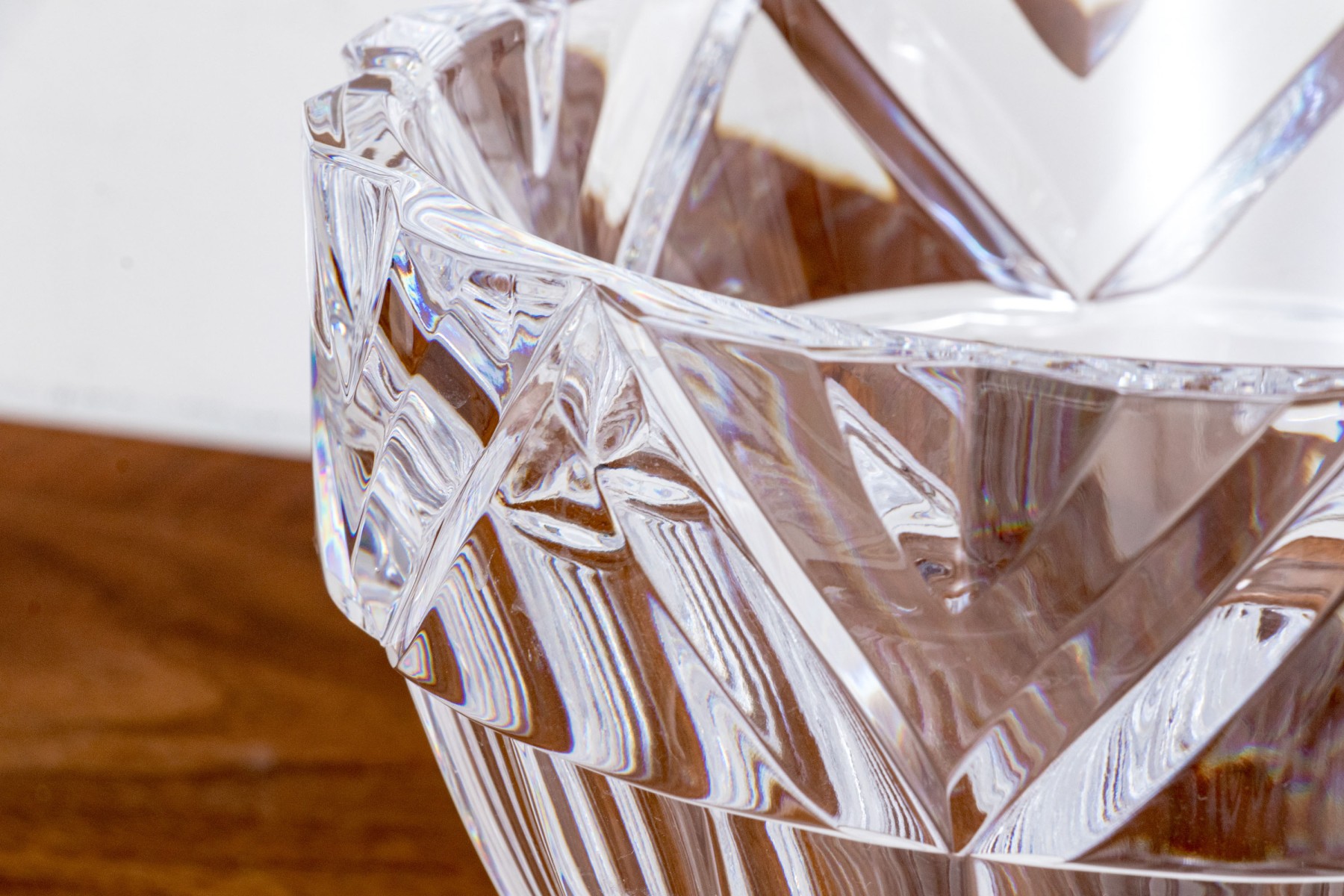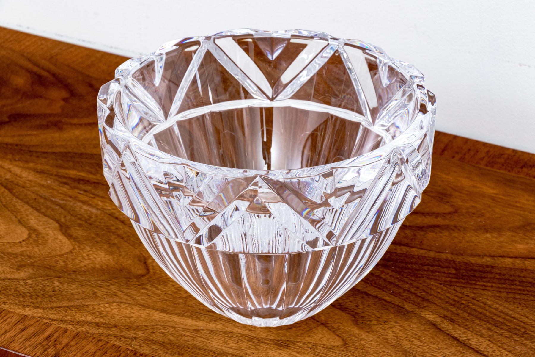 Orrefors “Erika Lagerbielke” cut crystal bowl displaying a wide, raised rim cut with dramatic V motifs overhanging an elegantly gadrooned body.