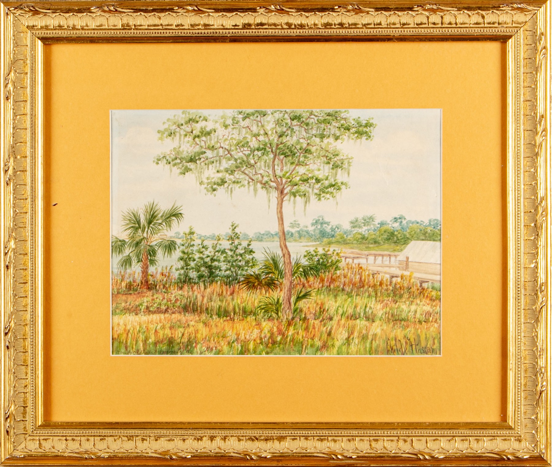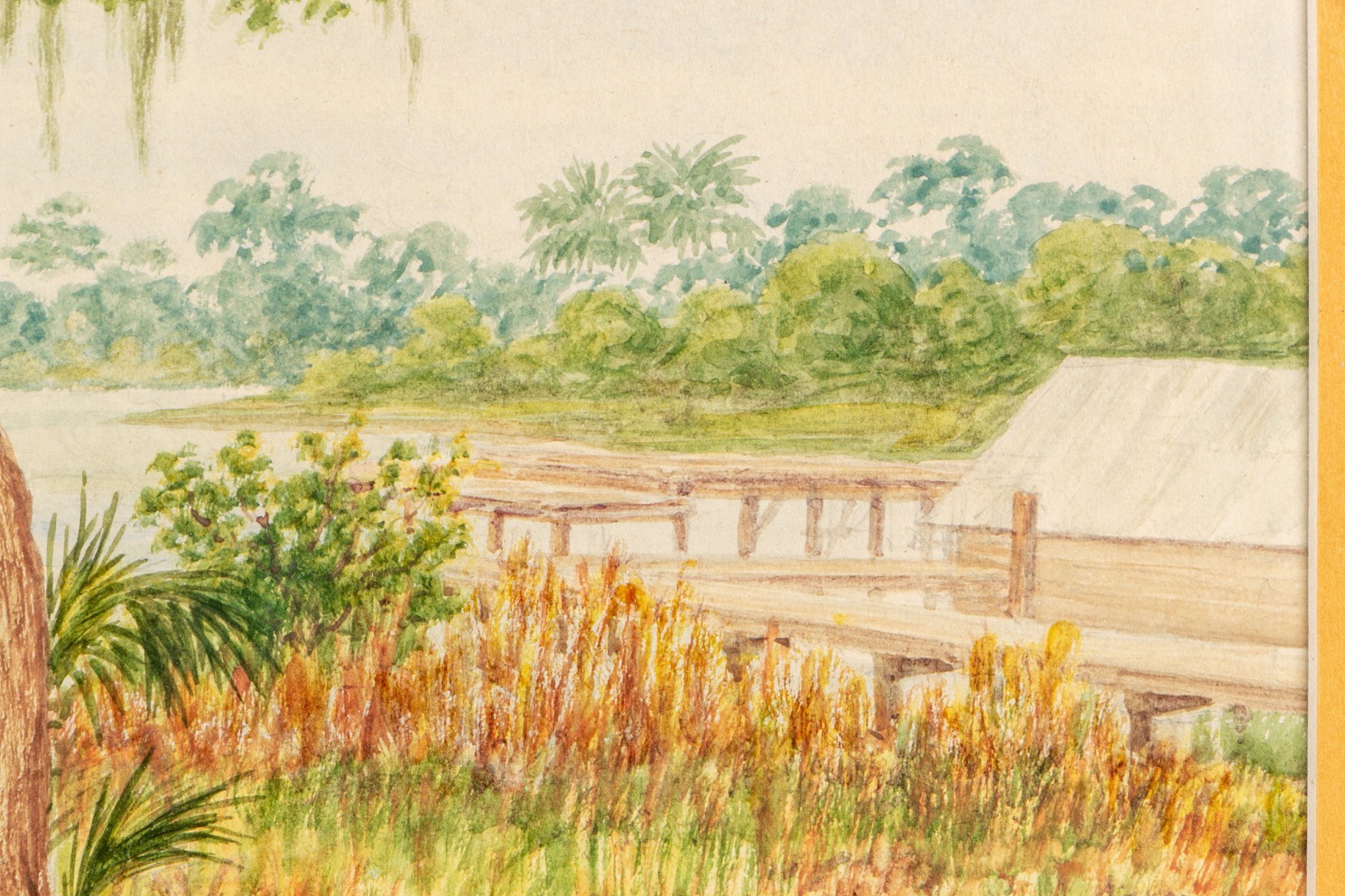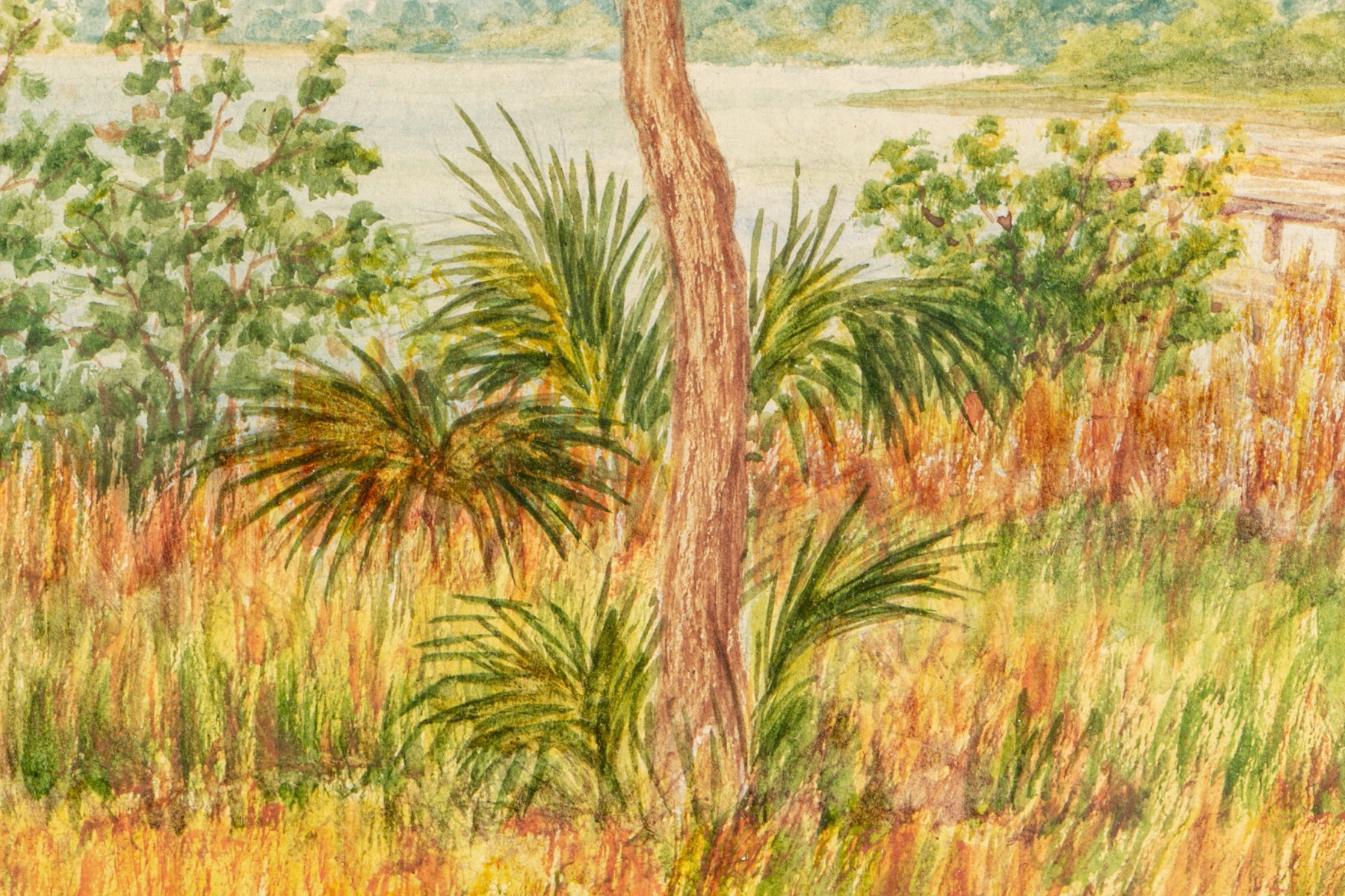 Watercolor depicting a coastal landscape with cattails in the foreground with a central tree, a structure and dock off to the right and the water in the distance.