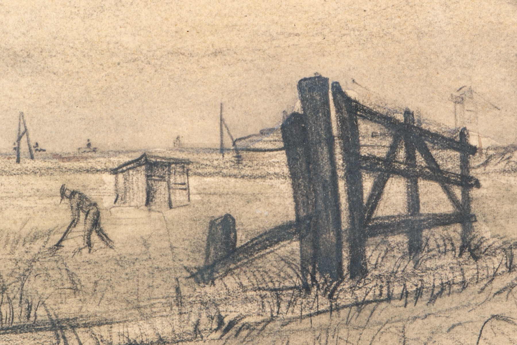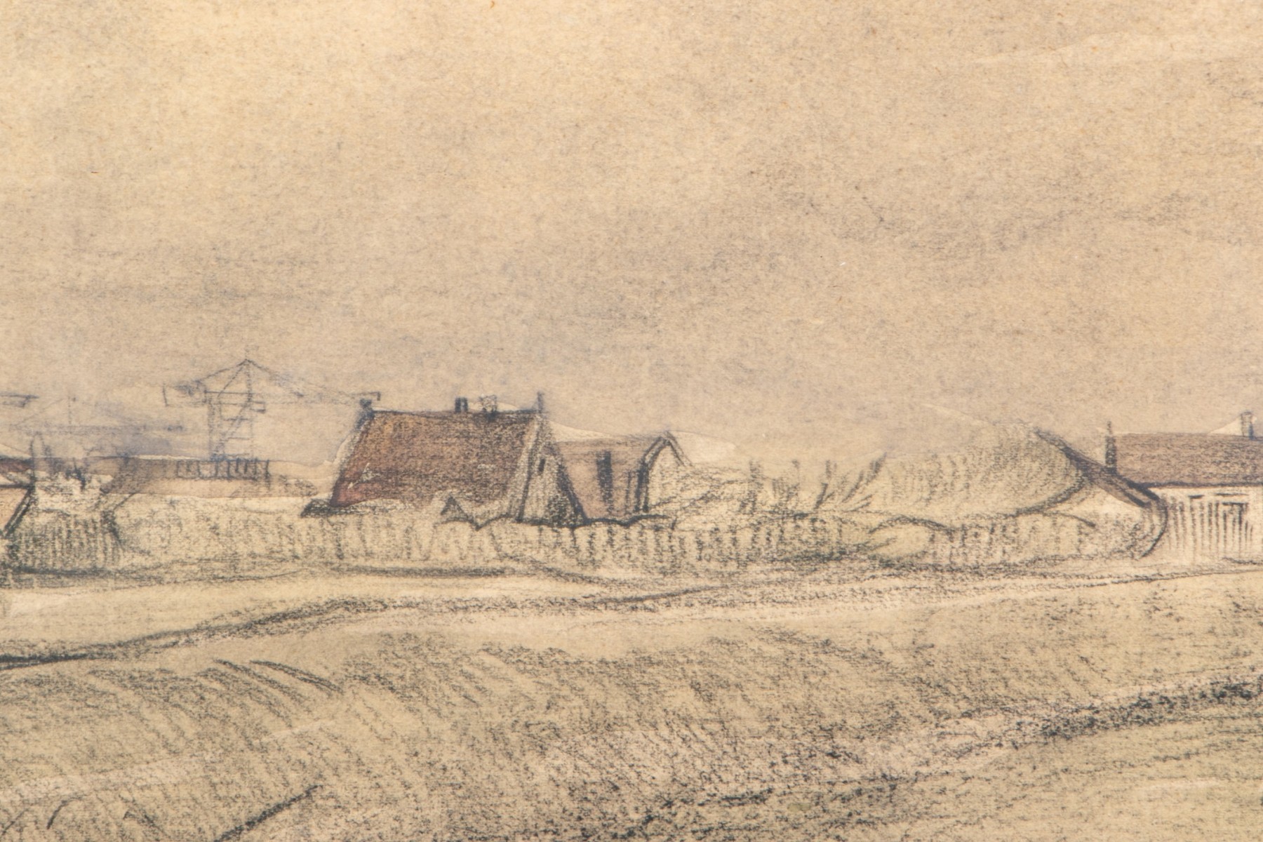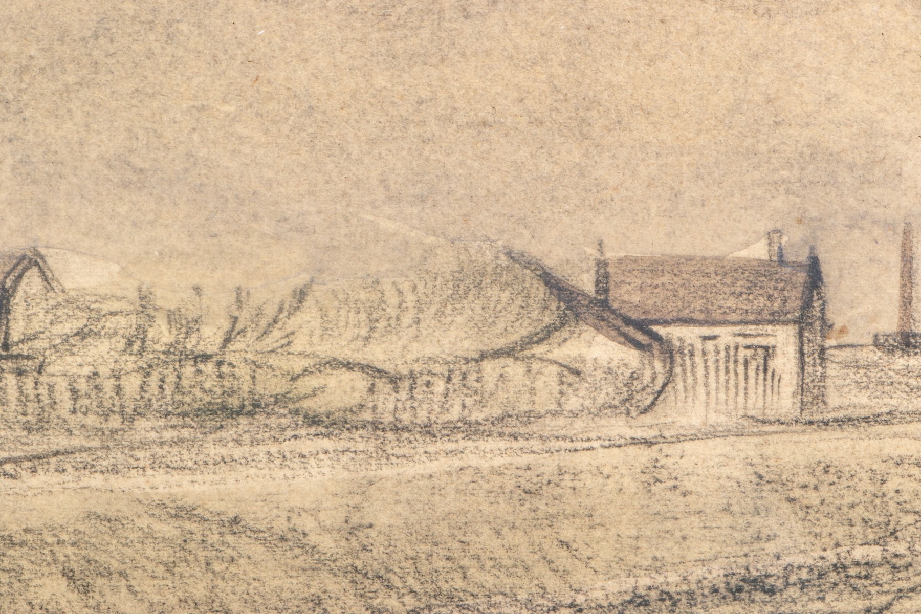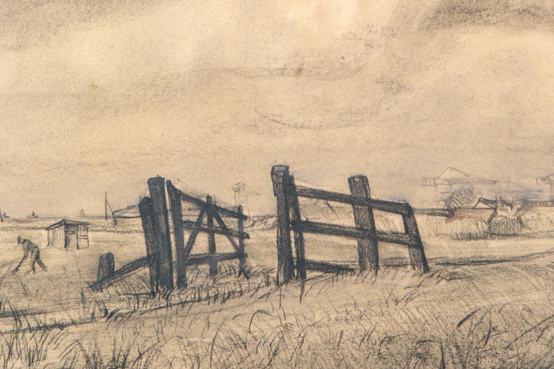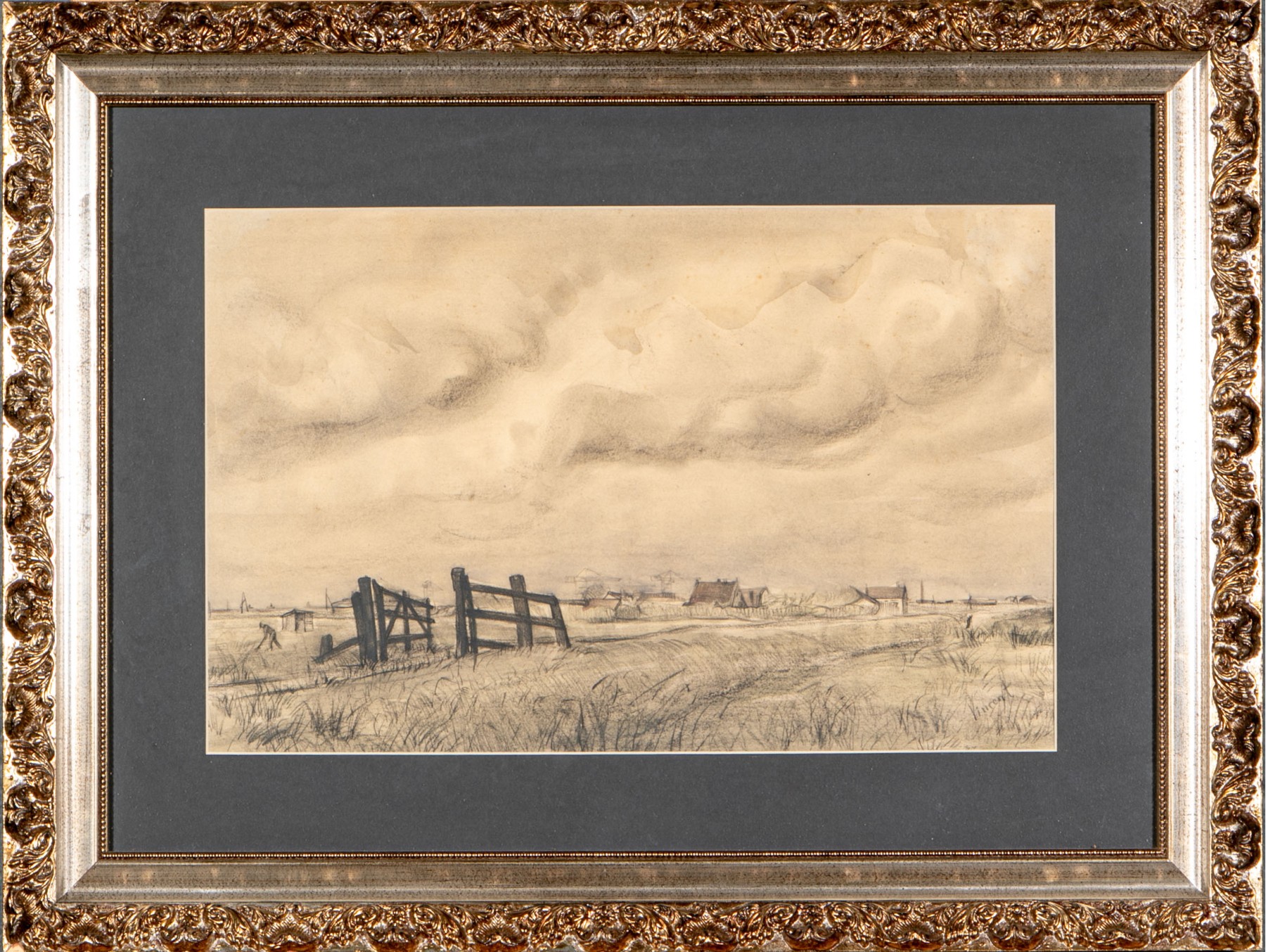 Pencil on paper depicting a vast farmstead with fence posts in the foreground, a figure working in the field and structures off in the distance.