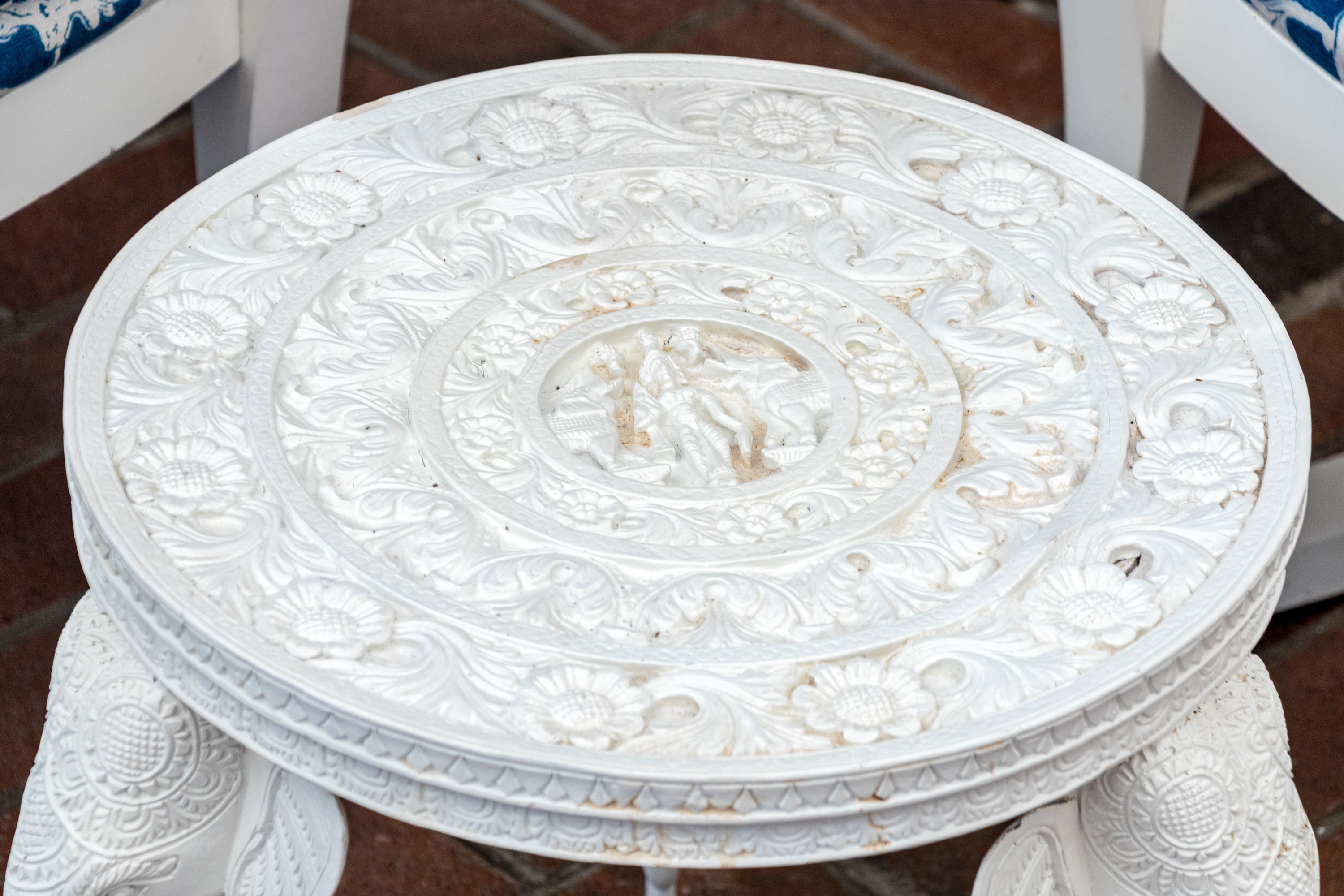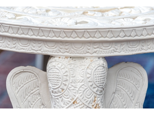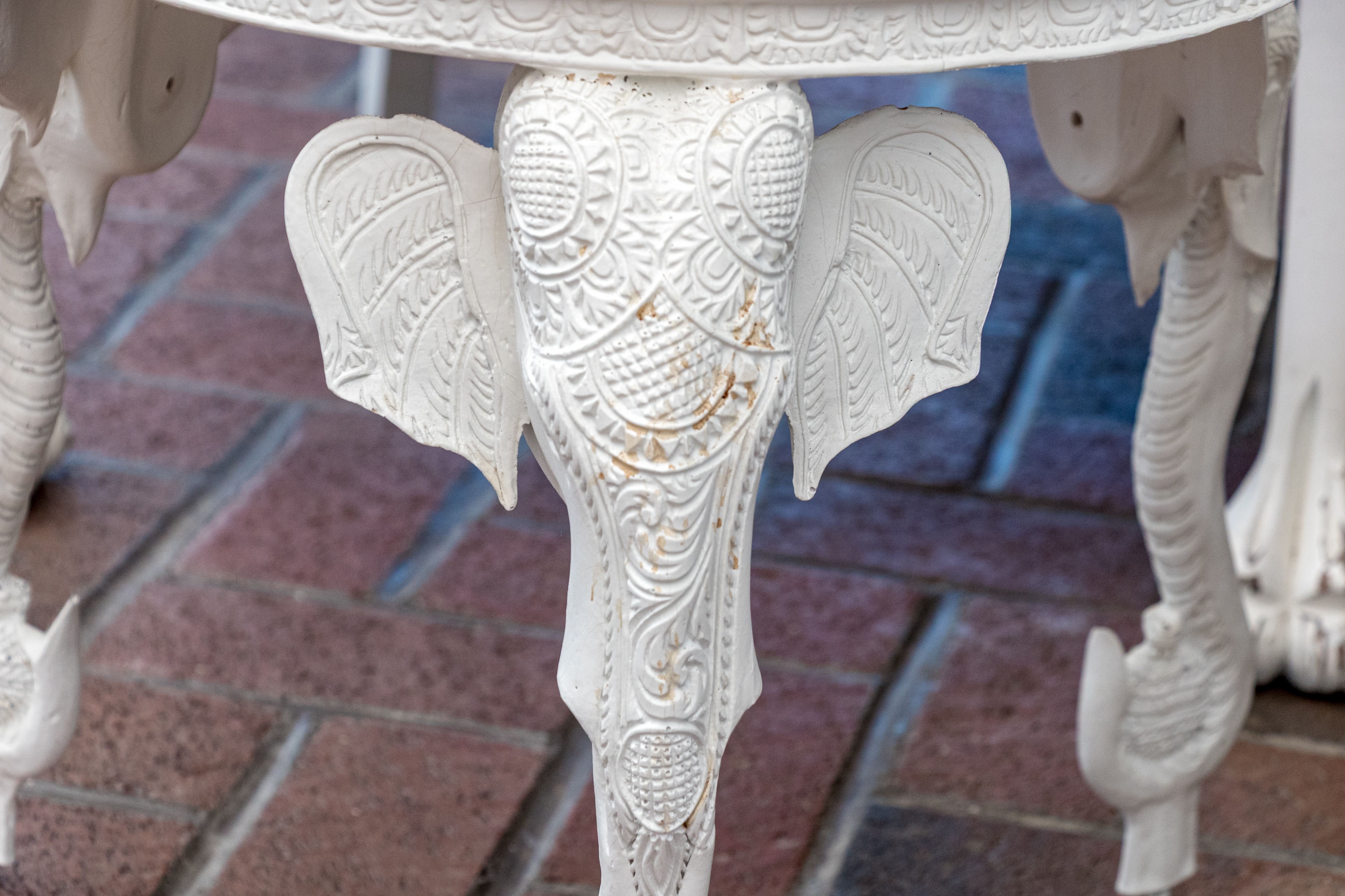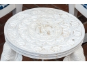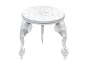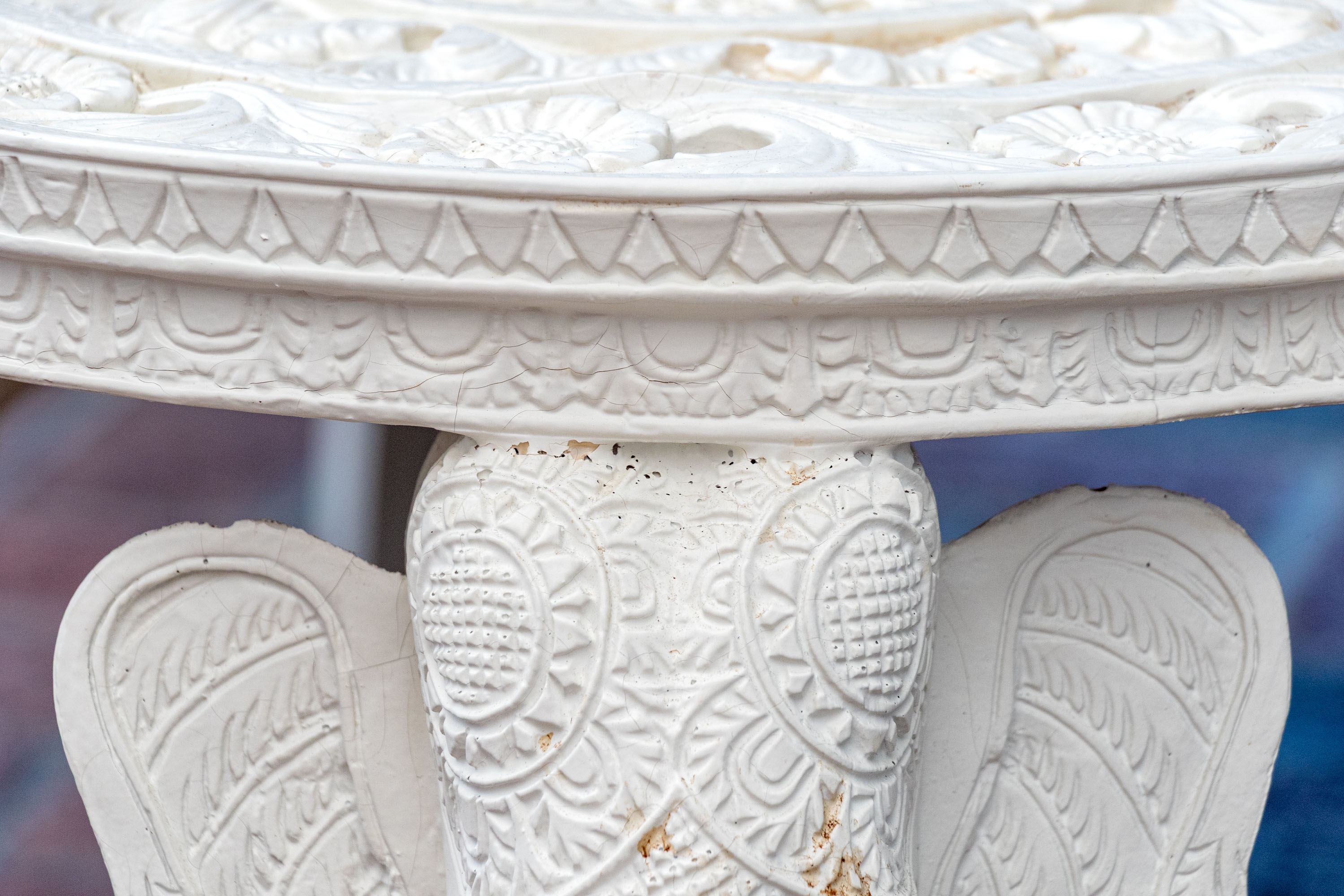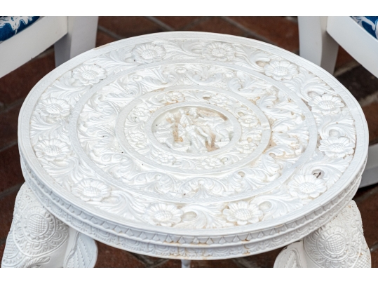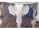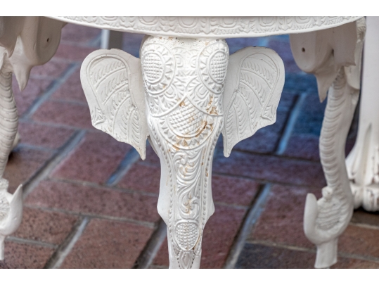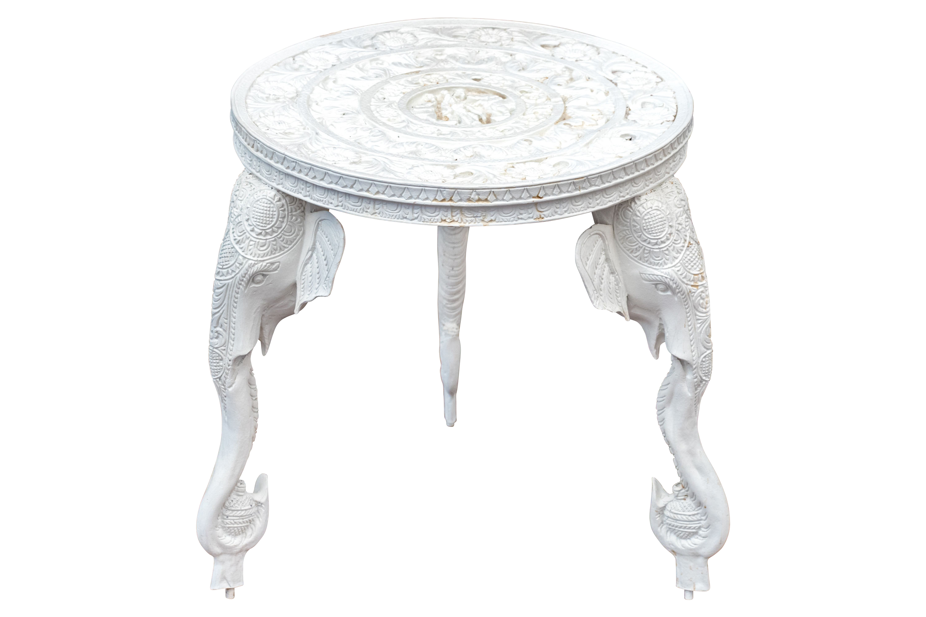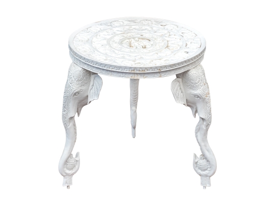 A finely carved India accent table in white paint. With a round top with white finished frame with elephant head and trunk form legs with ornately carved table top.