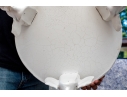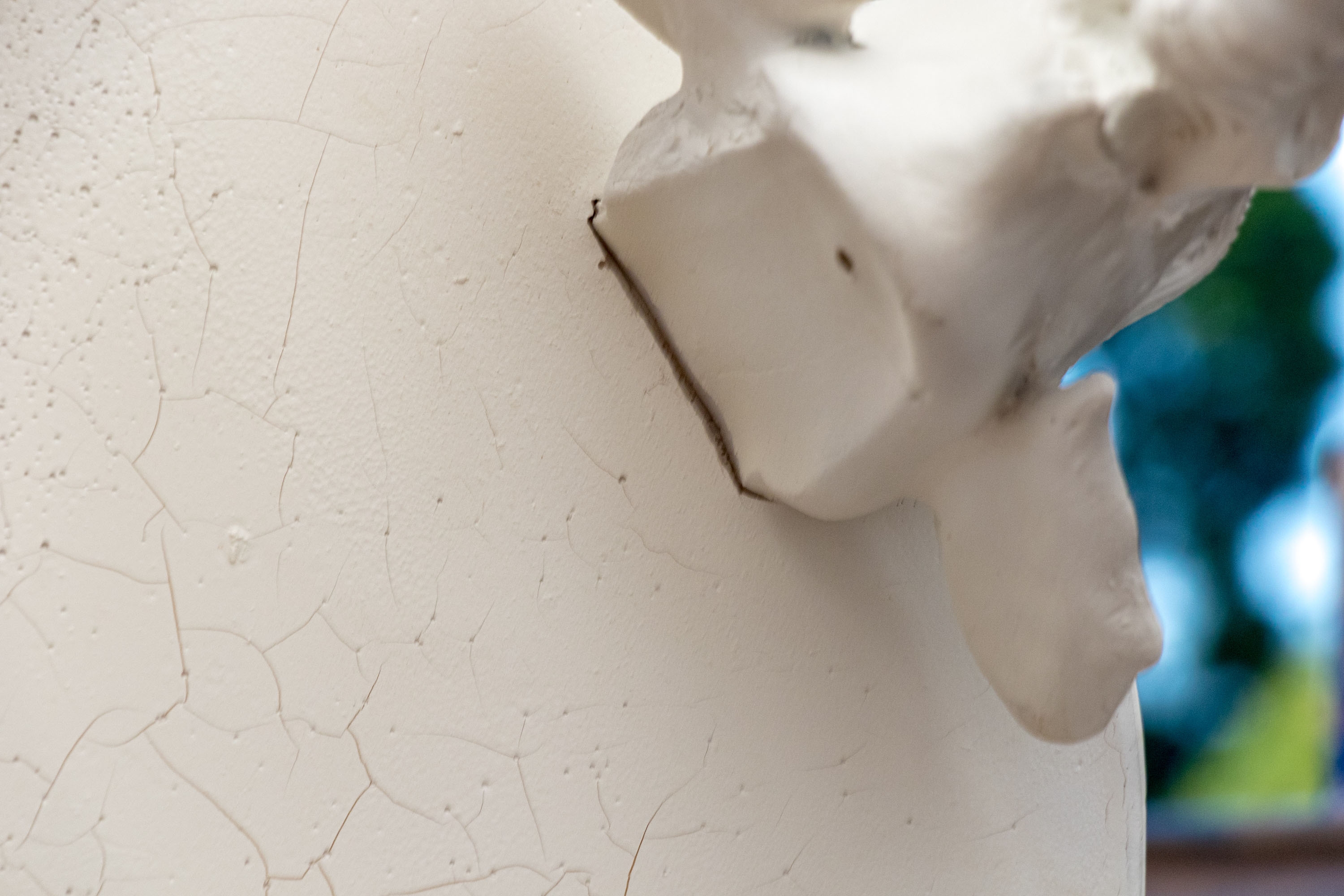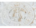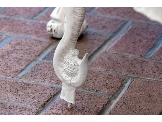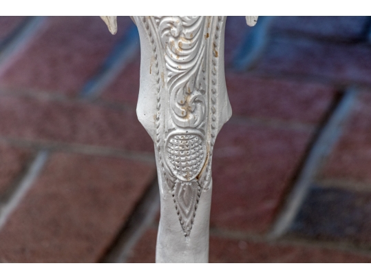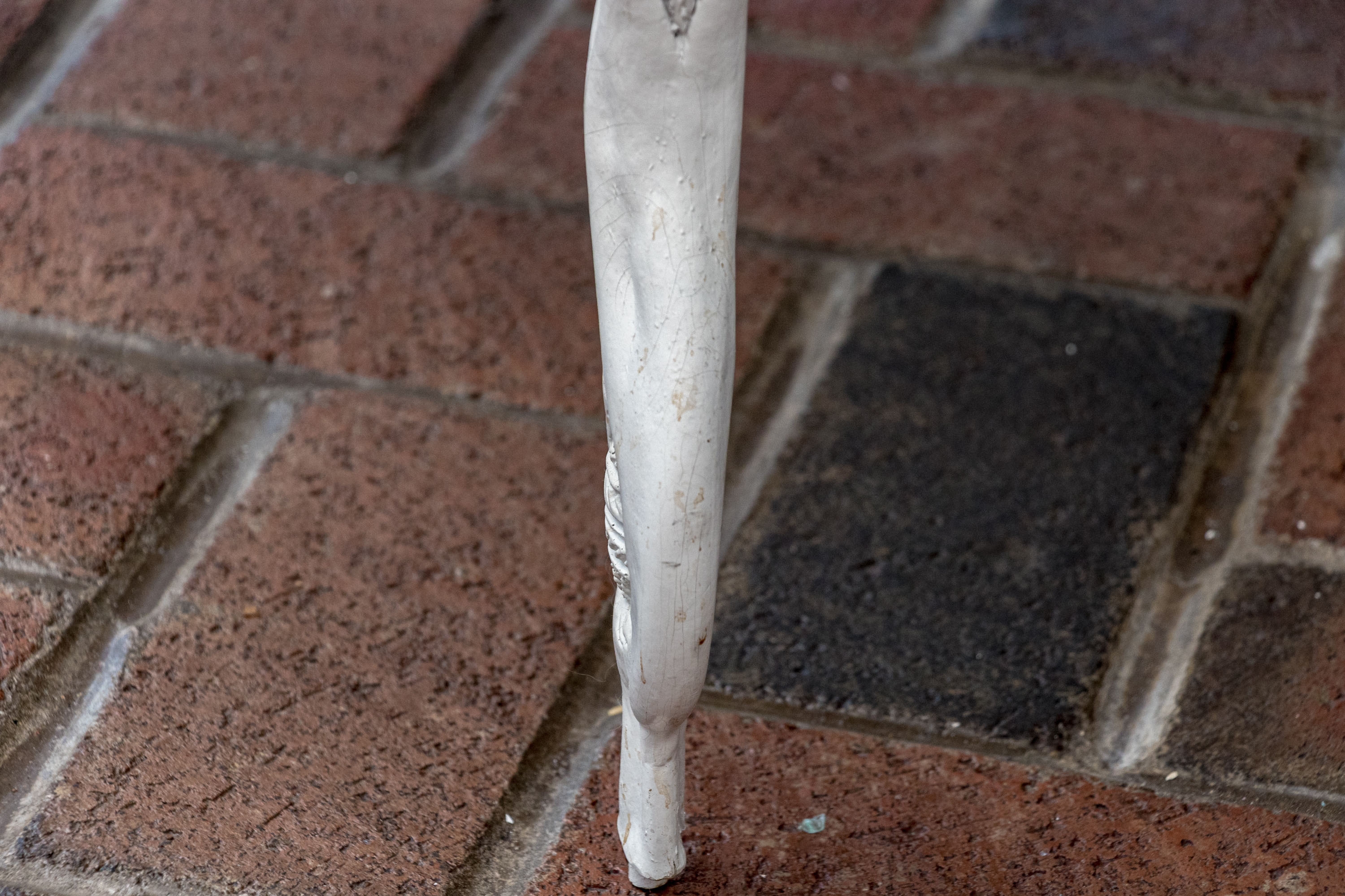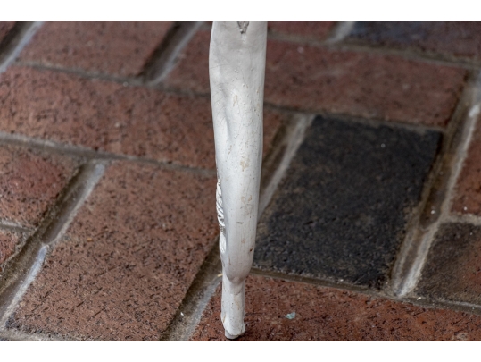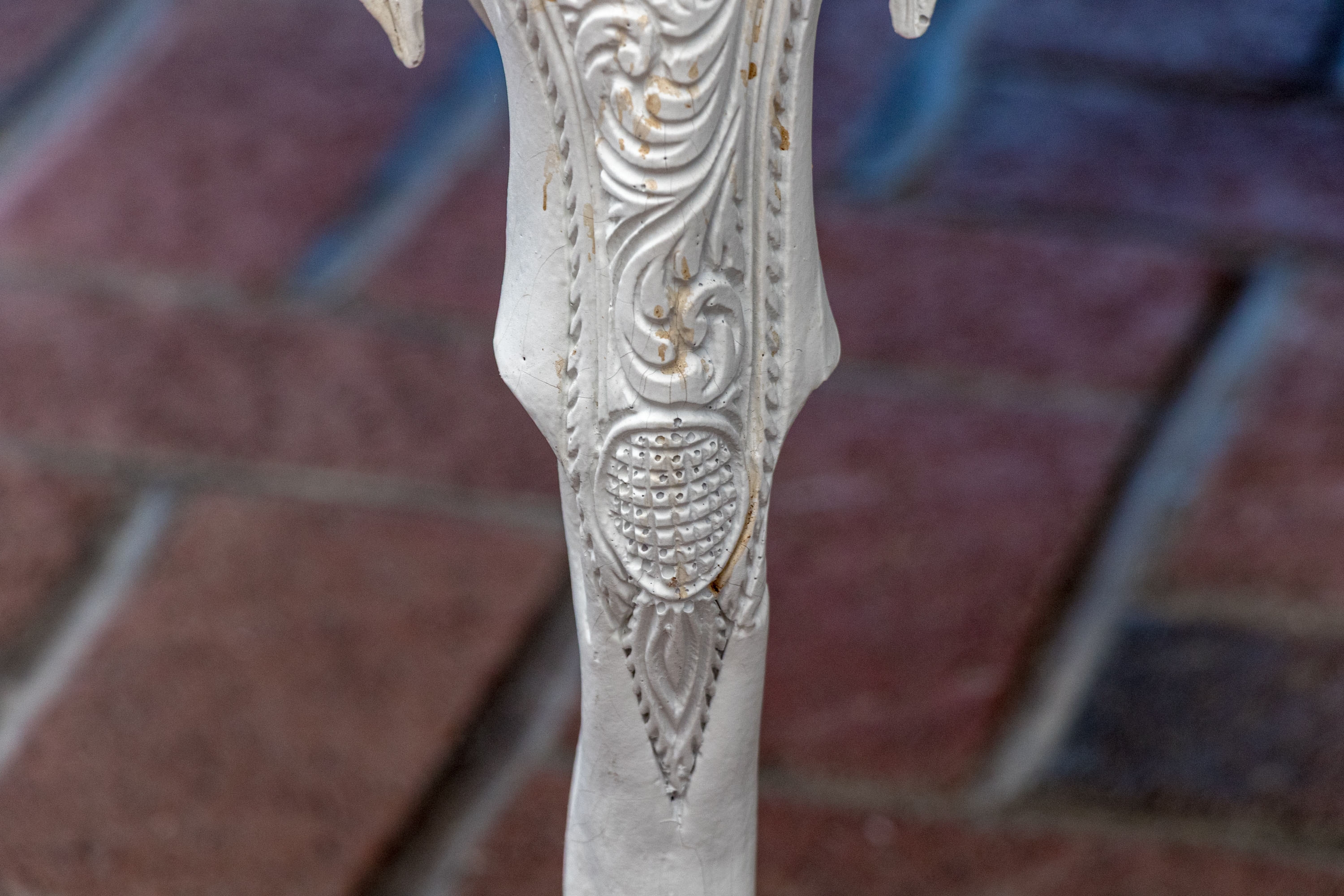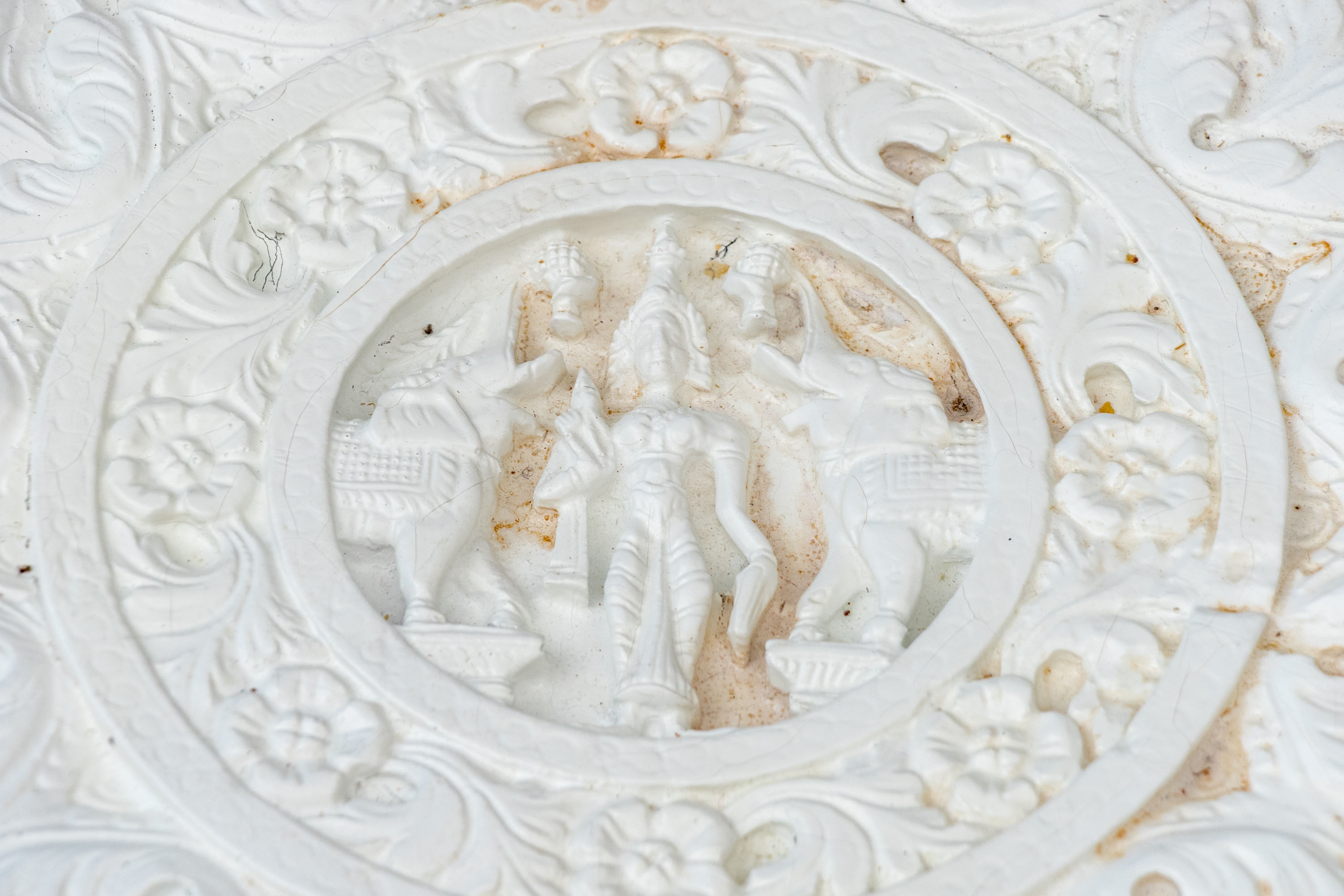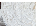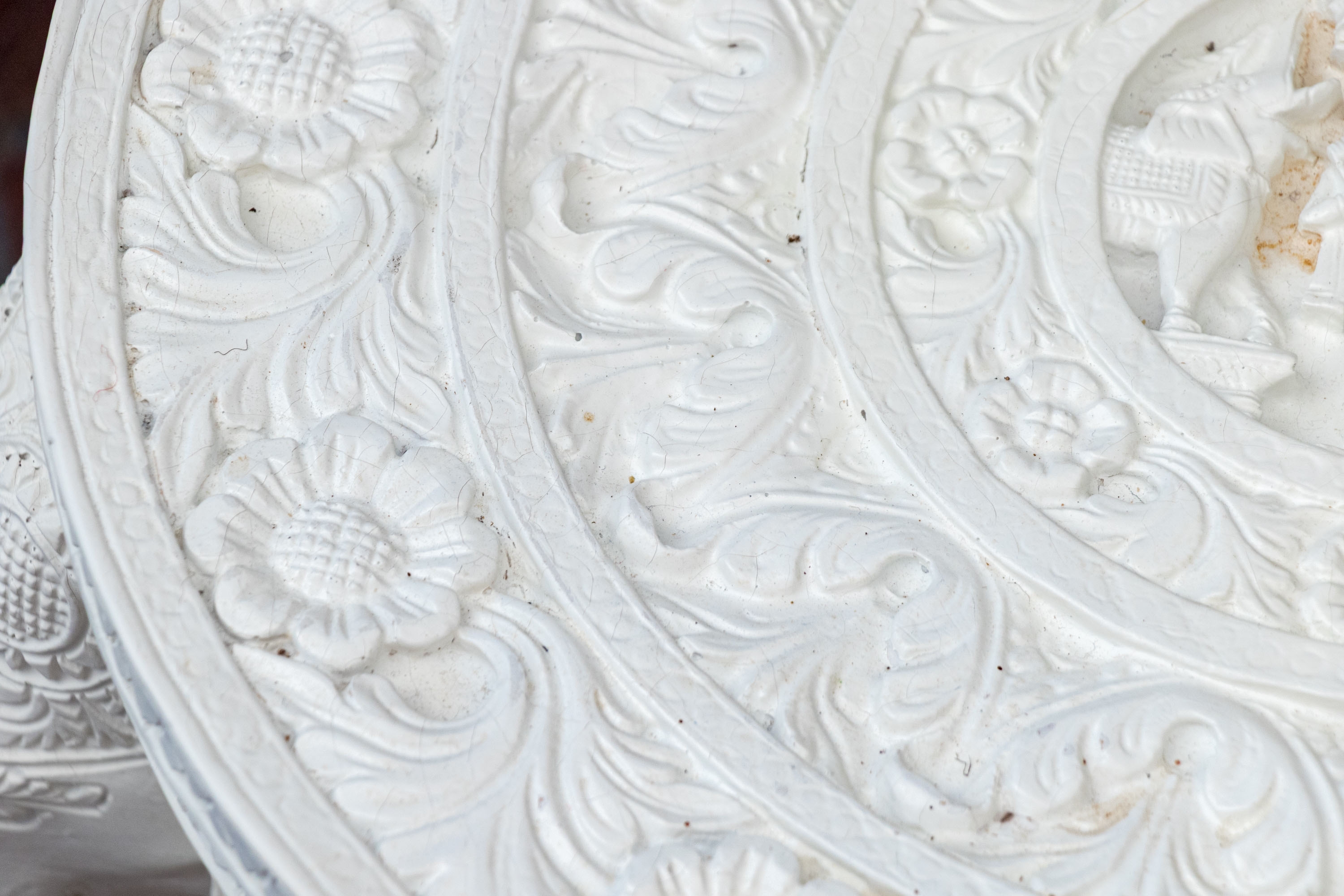 A finely carved India accent table in white paint. With a round top with white finished frame with elephant head and trunk form legs with ornately carved table top.