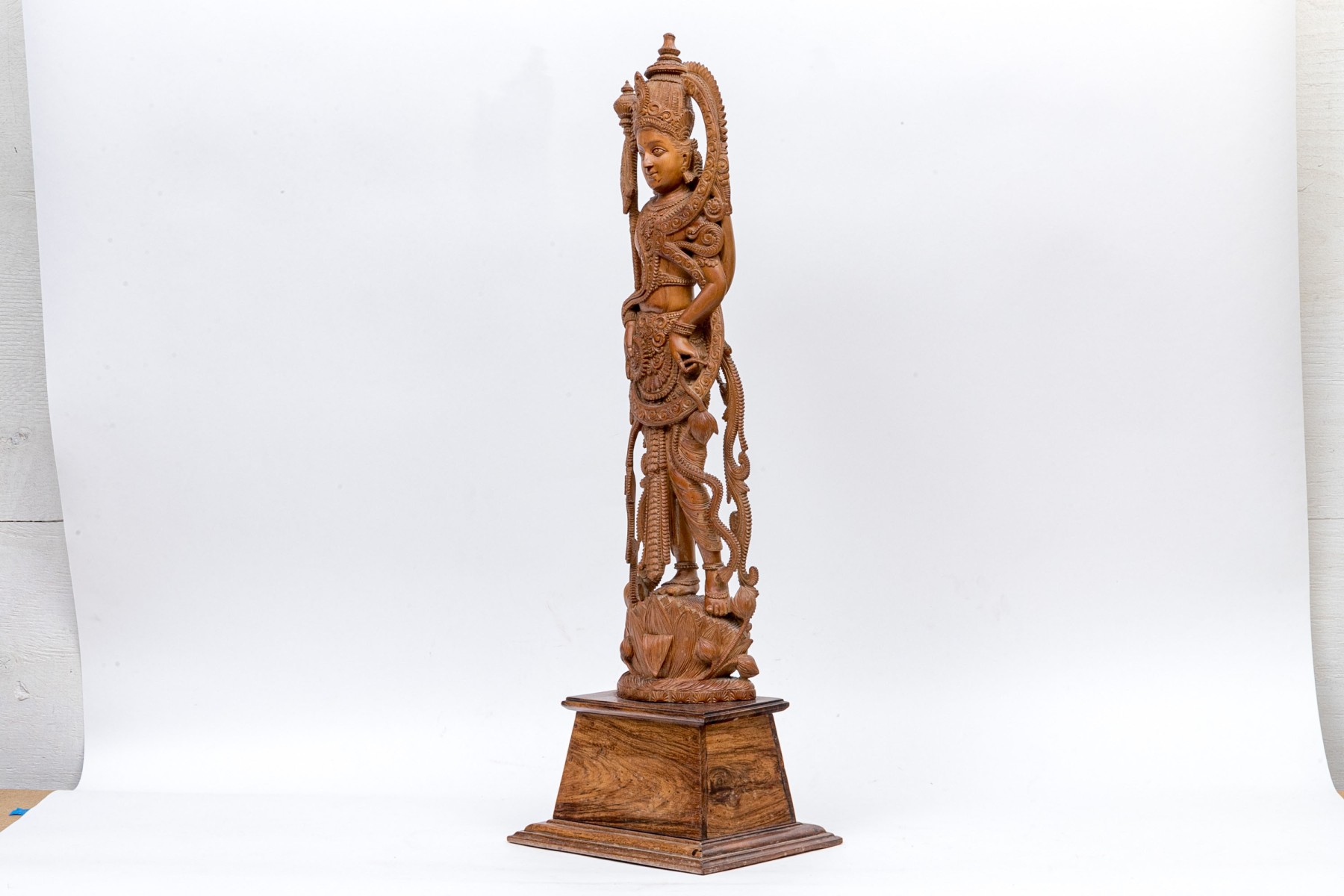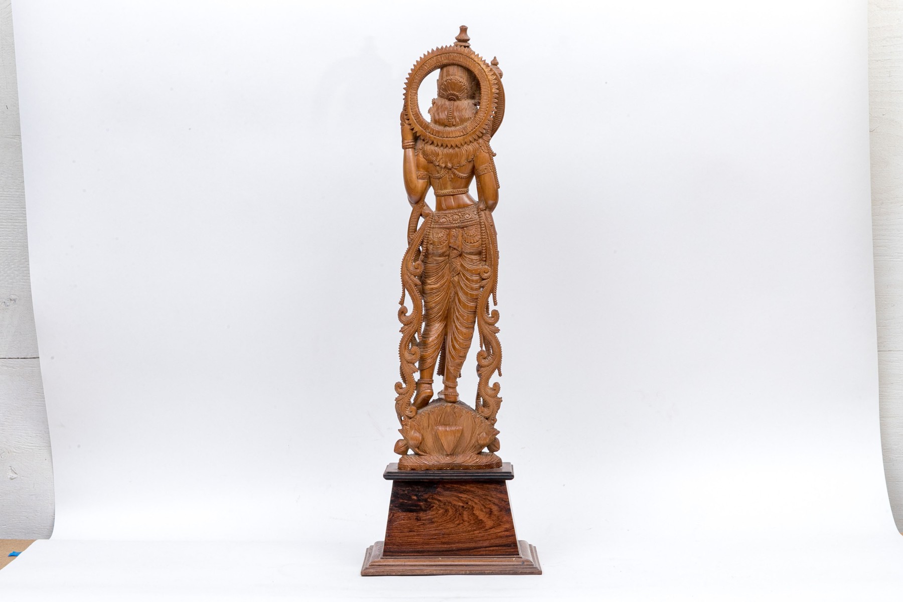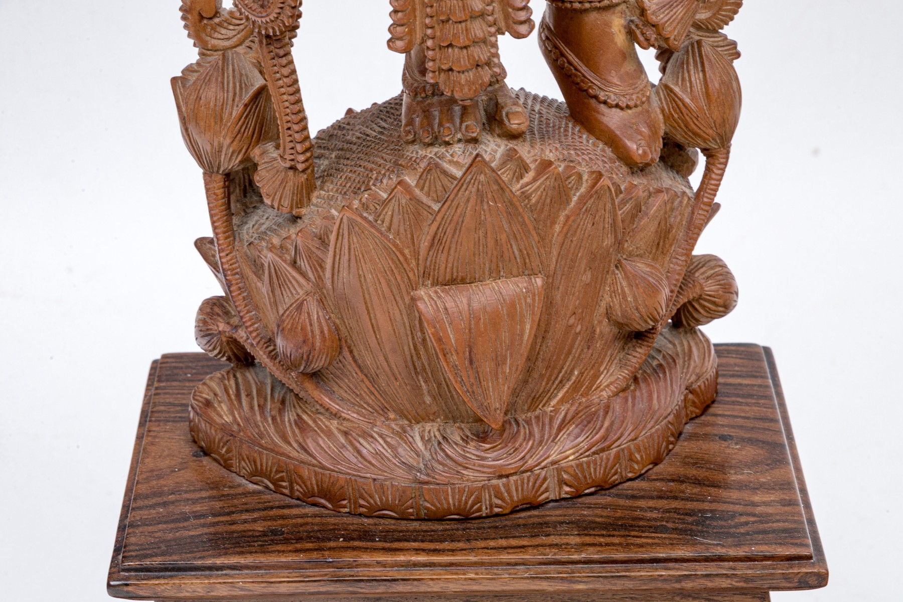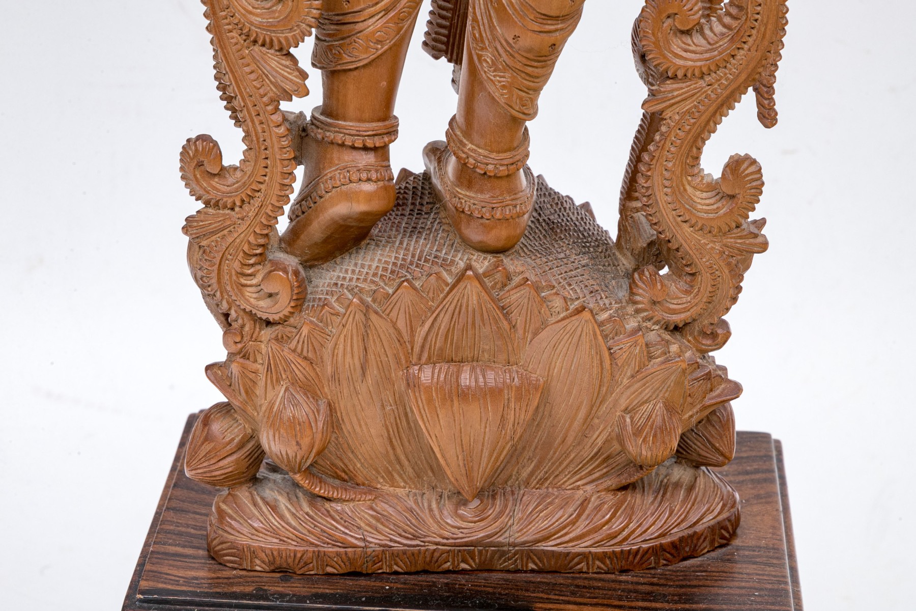 An elaborately carved wood deity front and back, with four arms, a halo, and wearing g a finely patterned garment. It holds a lotus flower vine in one hand and a staff in the other and stands on a lotus base. Mounted on a pedestal in another type of fine wood.