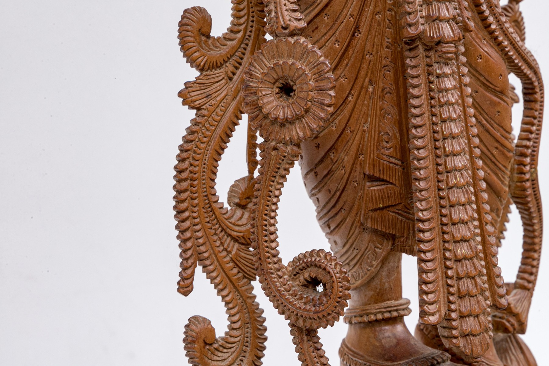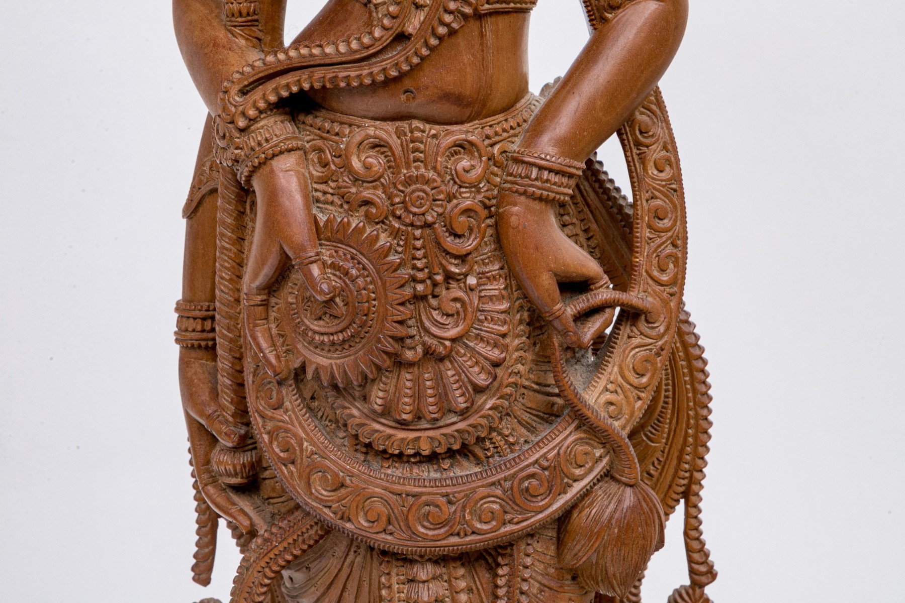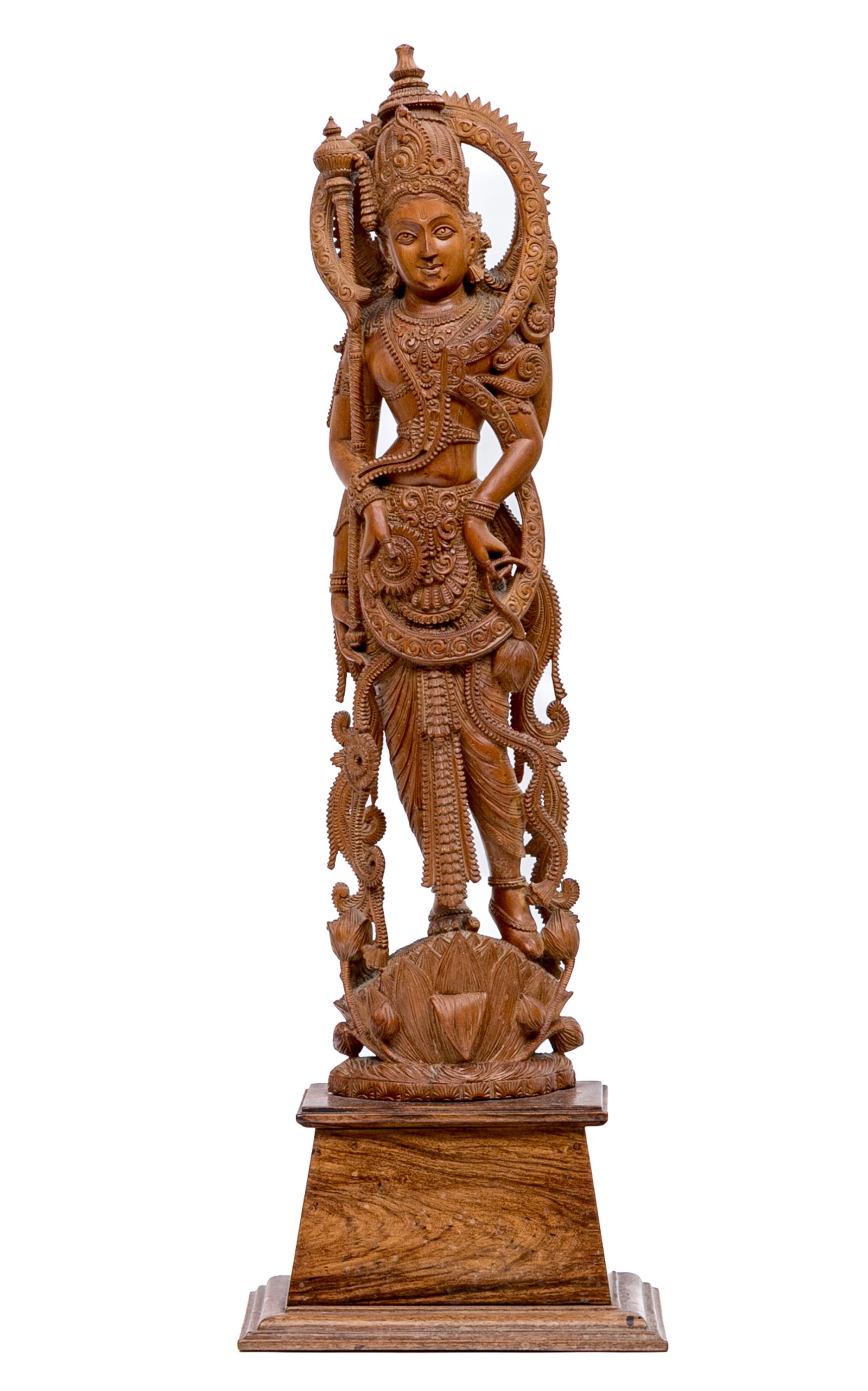 An elaborately carved wood deity front and back, with four arms, a halo, and wearing g a finely patterned garment. It holds a lotus flower vine in one hand and a staff in the other and stands on a lotus base. Mounted on a pedestal in another type of fine wood.