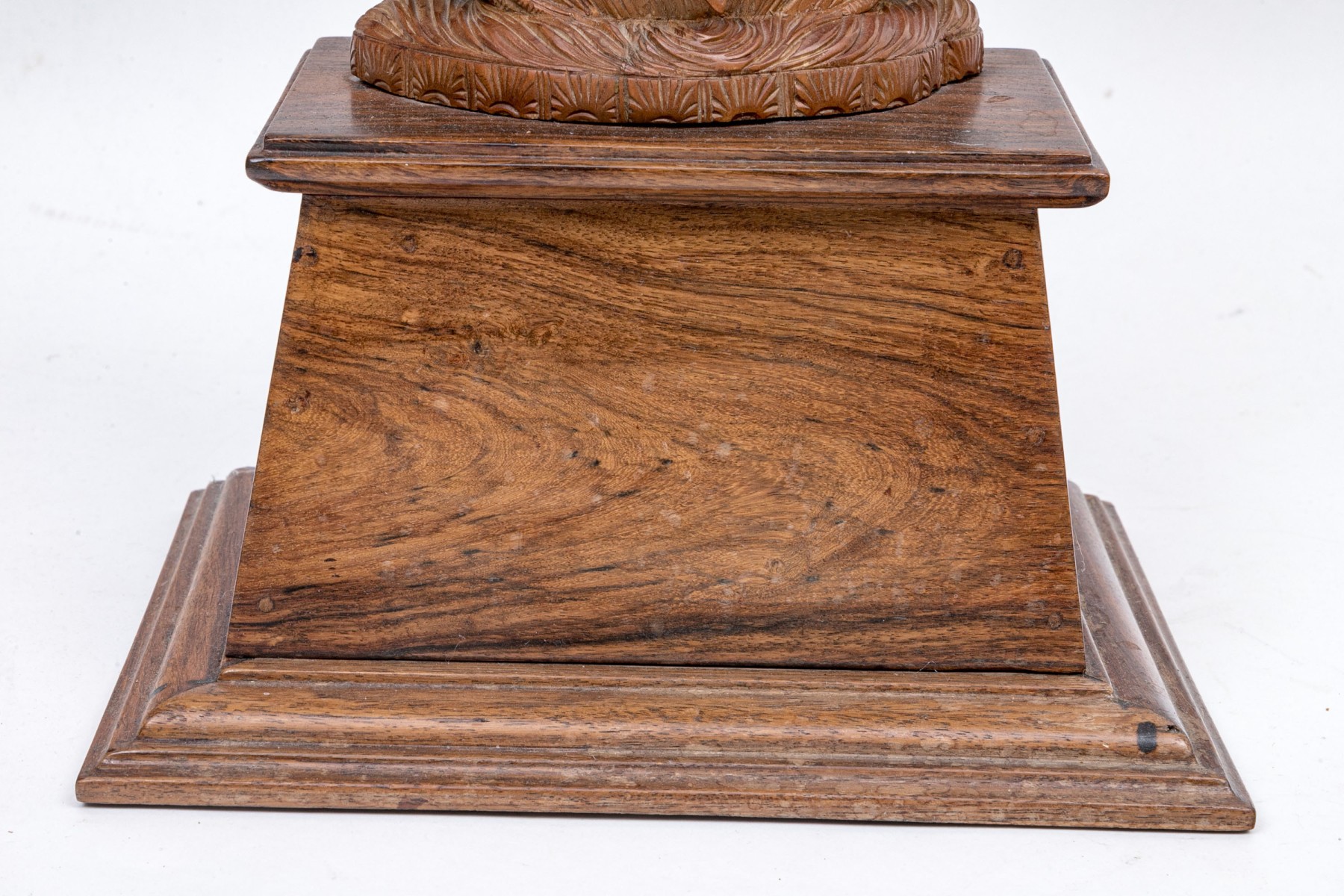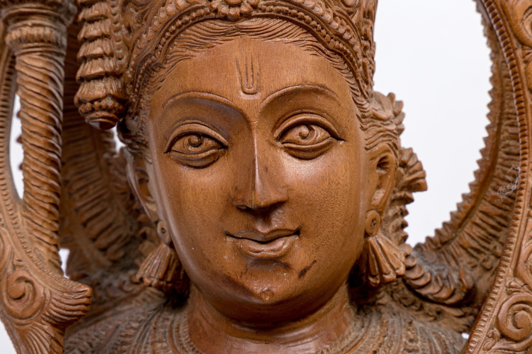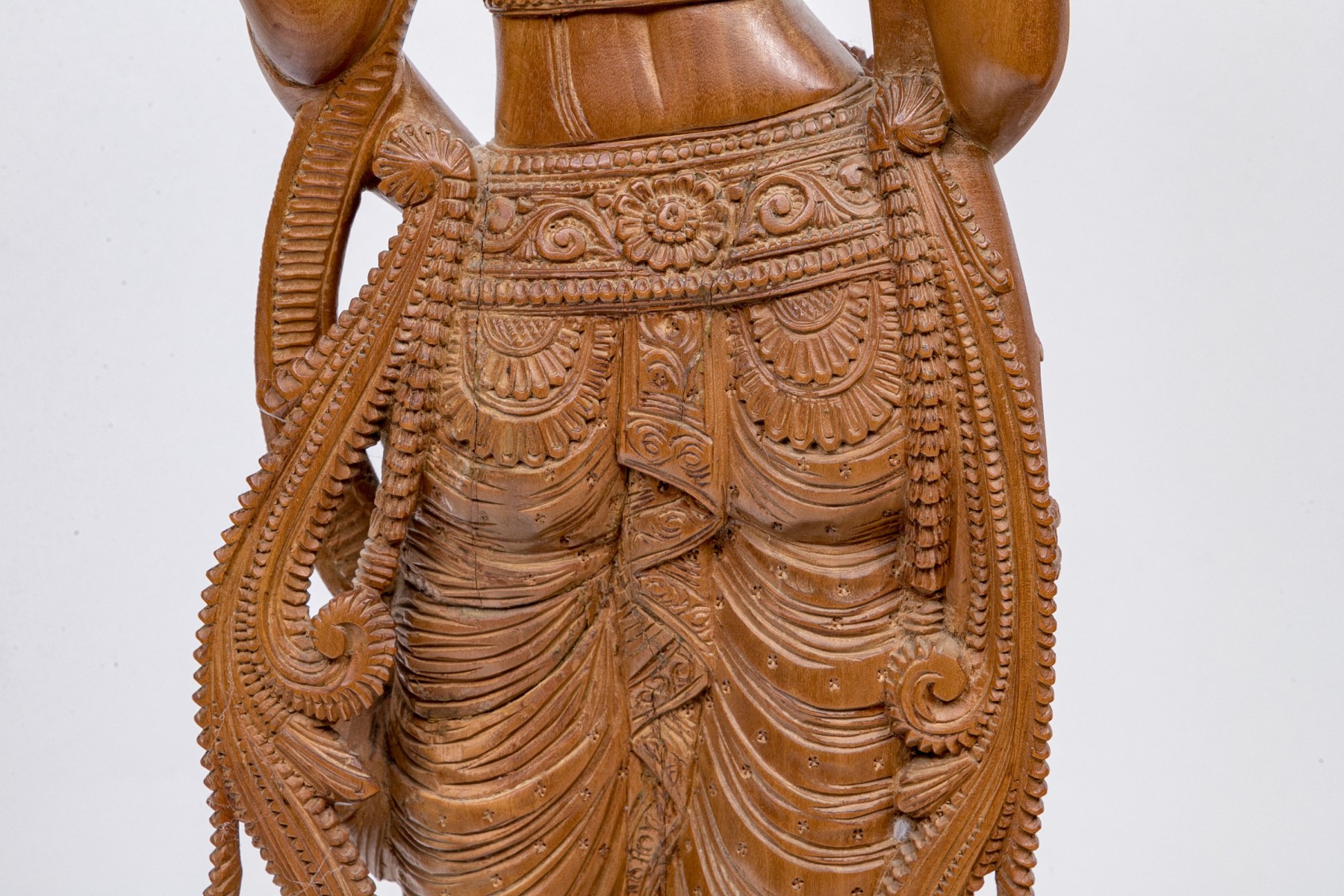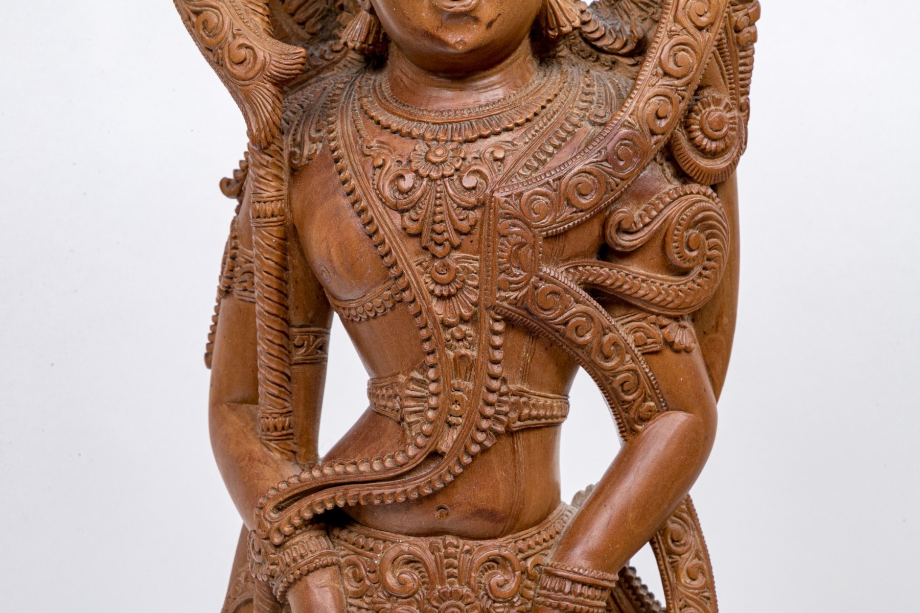 An elaborately carved wood deity front and back, with four arms, a halo, and wearing g a finely patterned garment. It holds a lotus flower vine in one hand and a staff in the other and stands on a lotus base. Mounted on a pedestal in another type of fine wood.