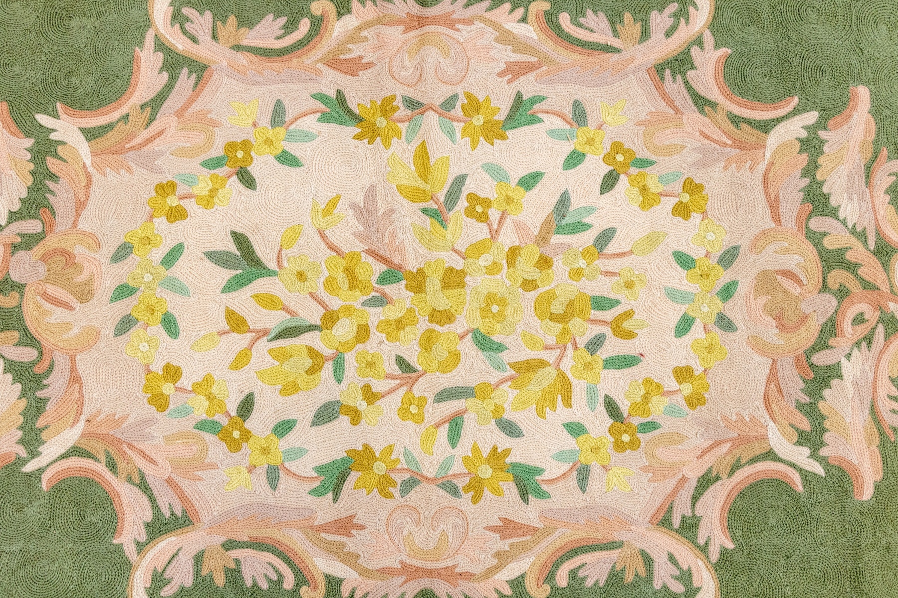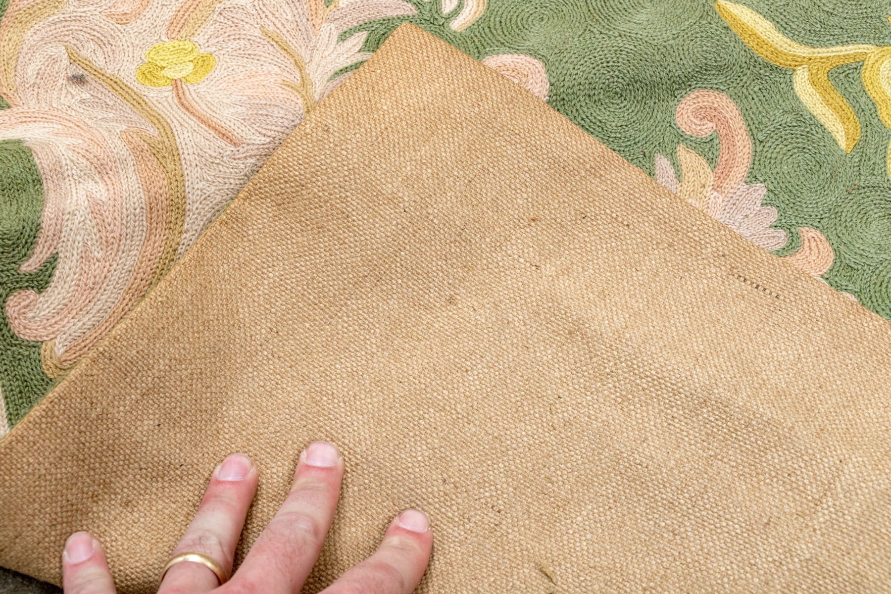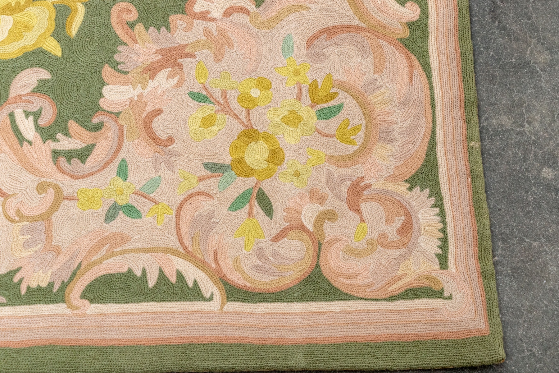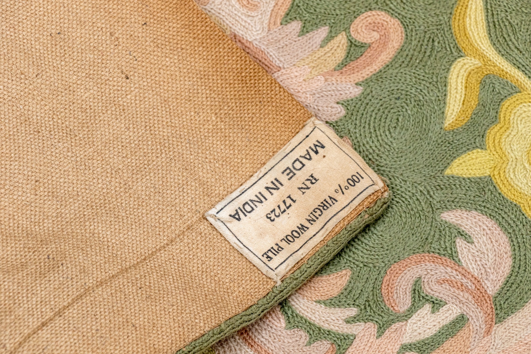 Green ground with backing bearing a label states it is 100% pure virgin wool and the carpet is Made in India.