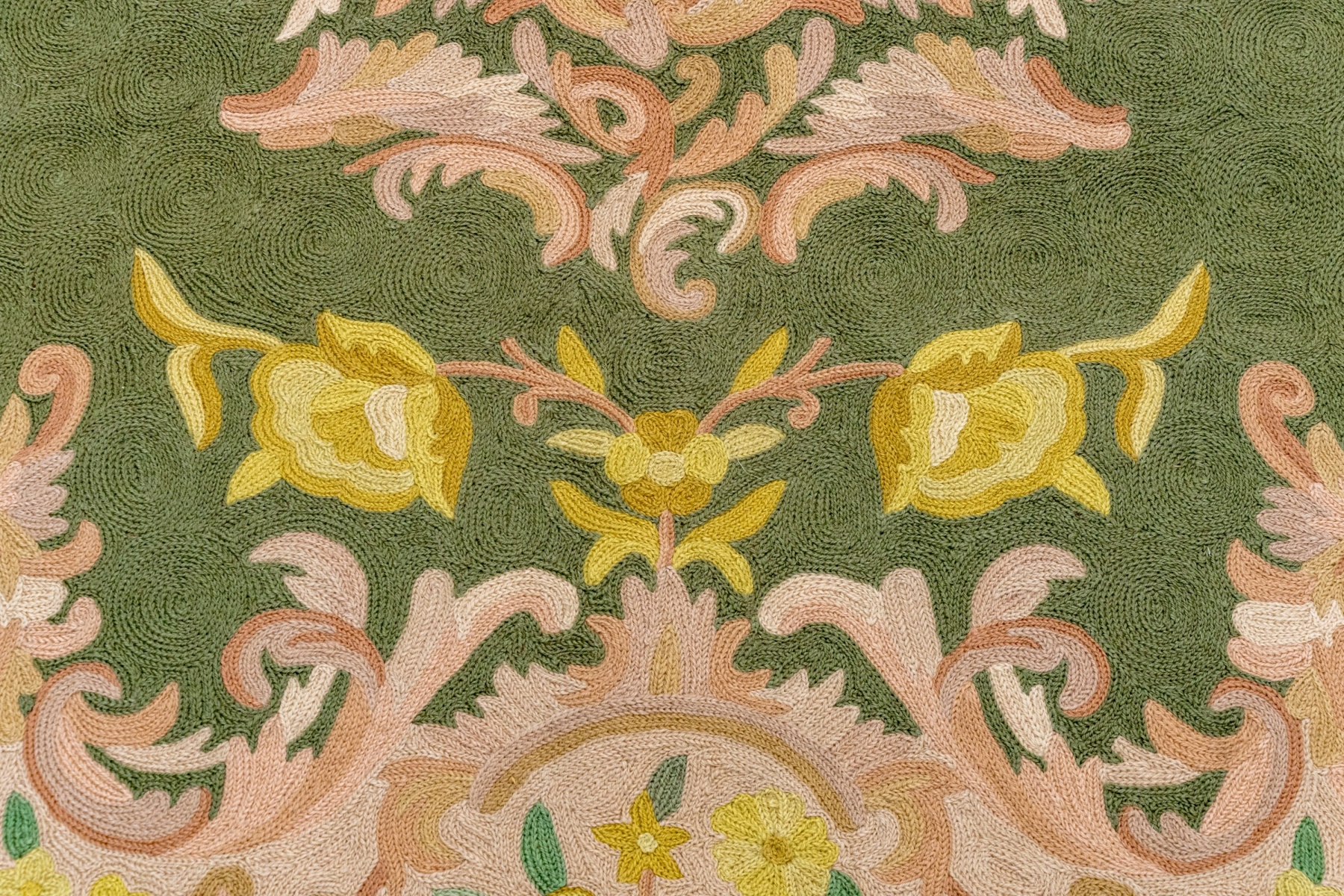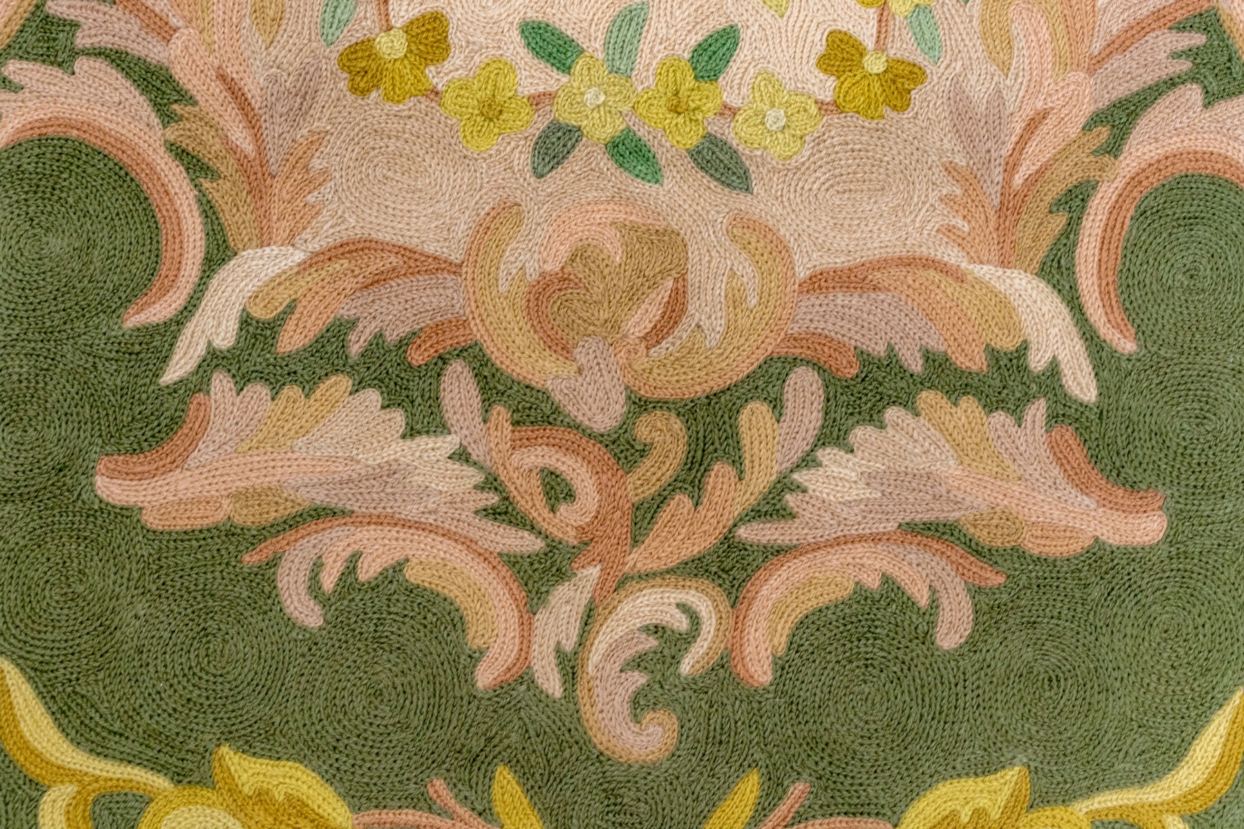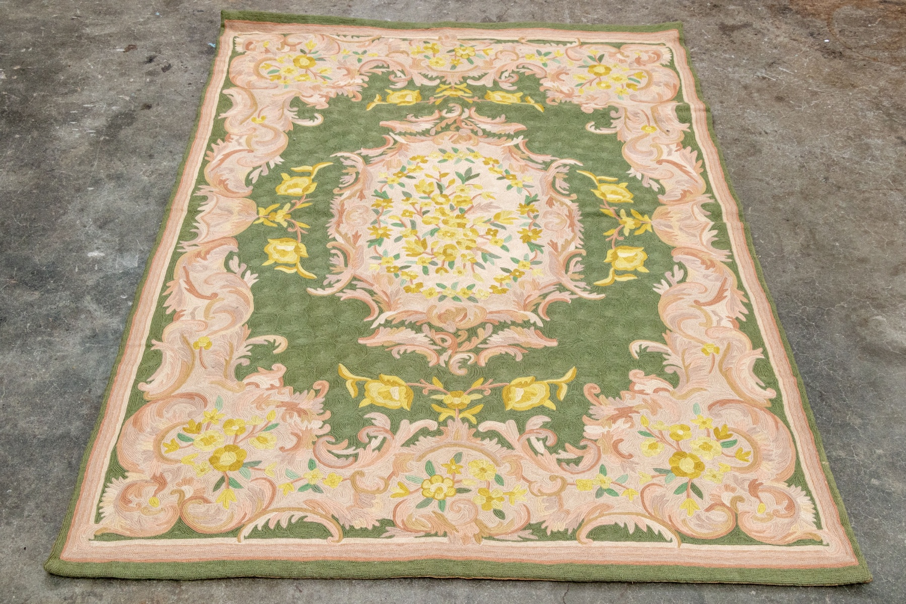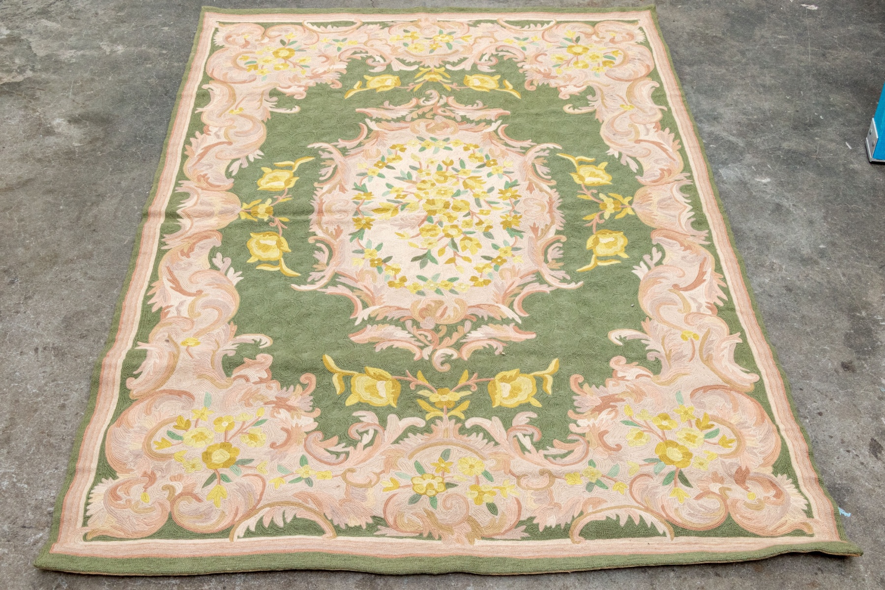 Green ground with backing bearing a label states it is 100% pure virgin wool and the carpet is Made in India.