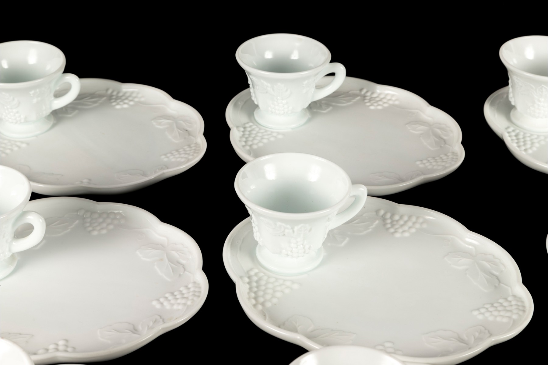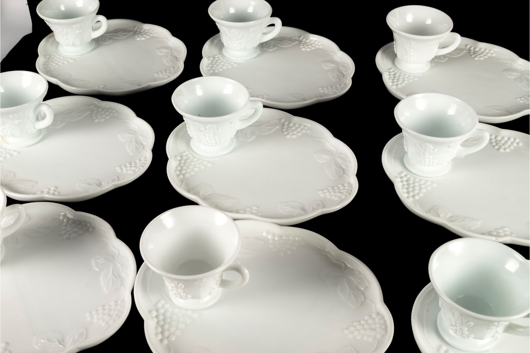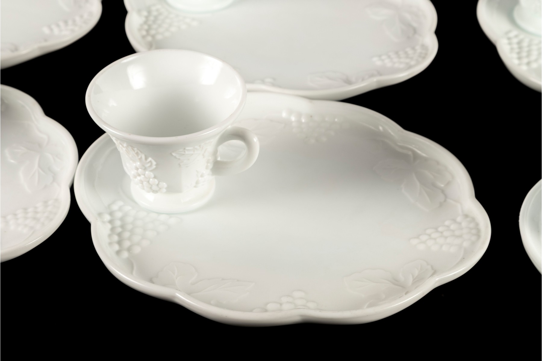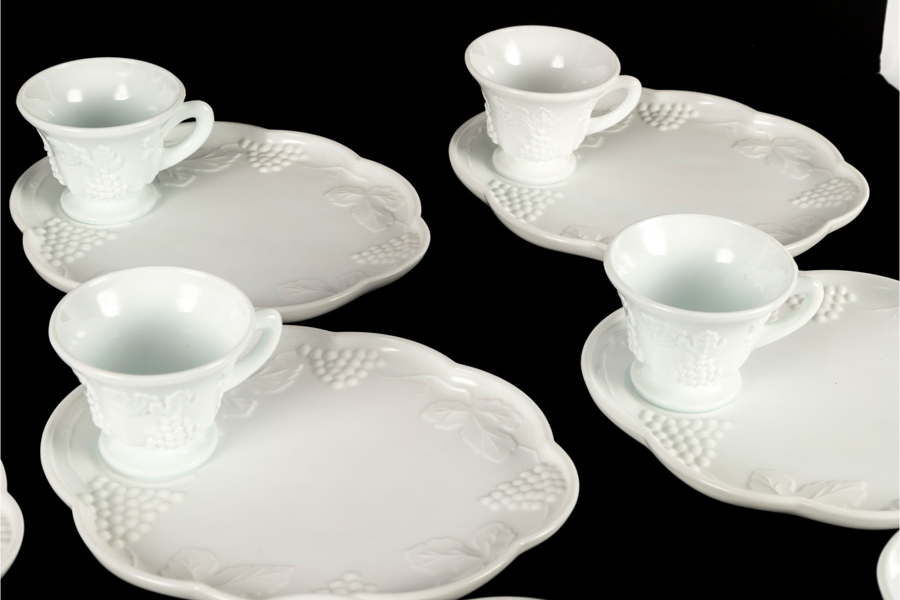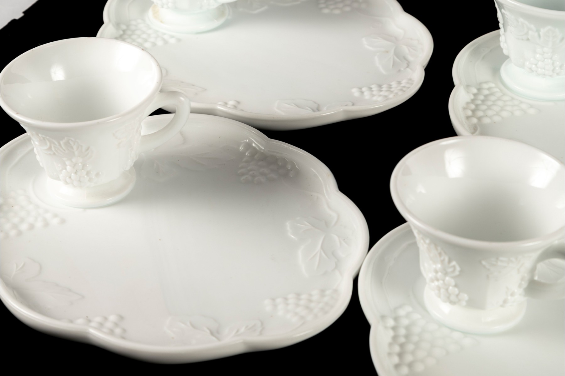 A vintage “Colony Harvest” milk glass snack set by Indiana Glass, featuring raised grape and leaf motifs around the rims. This elegant embossed pattern was produced in the mid-to-late 20th century.