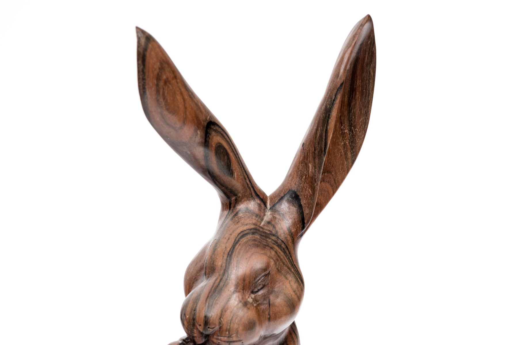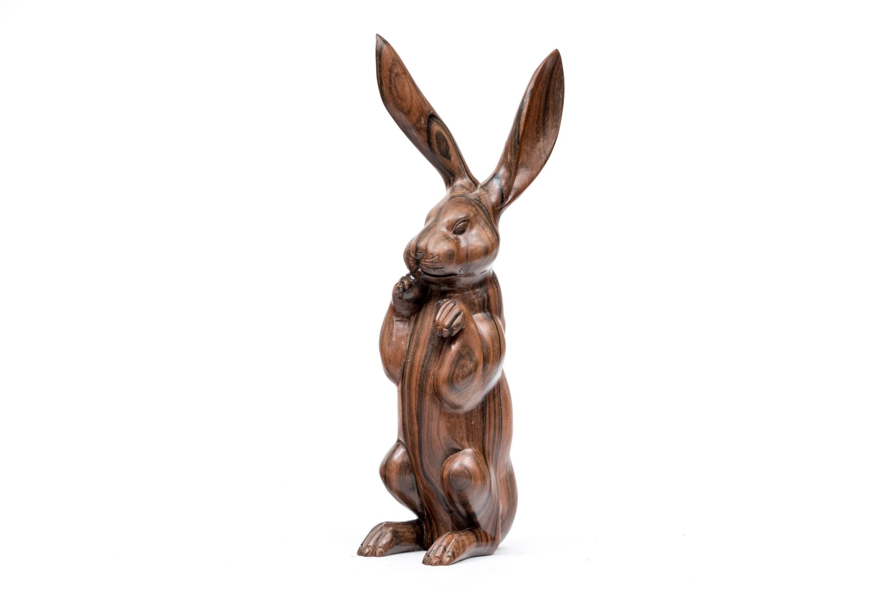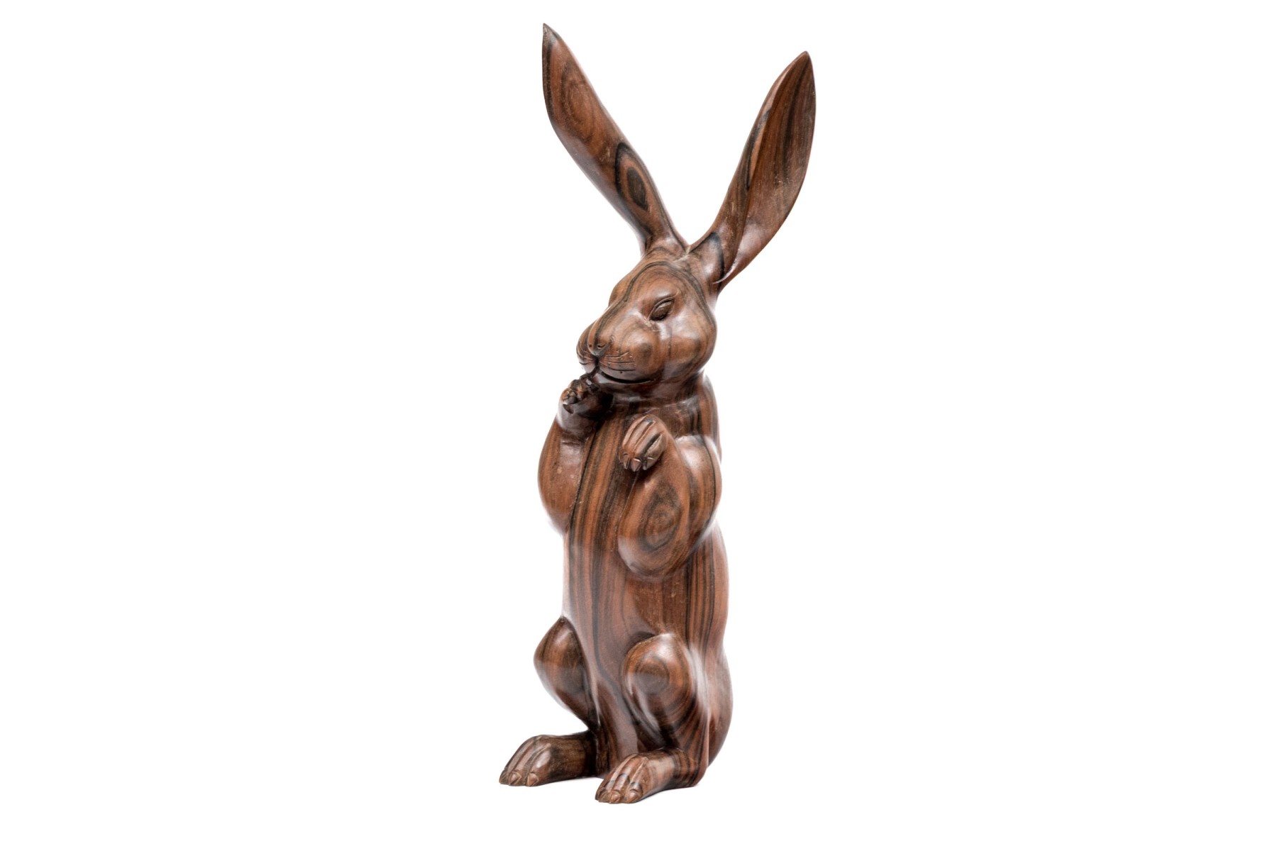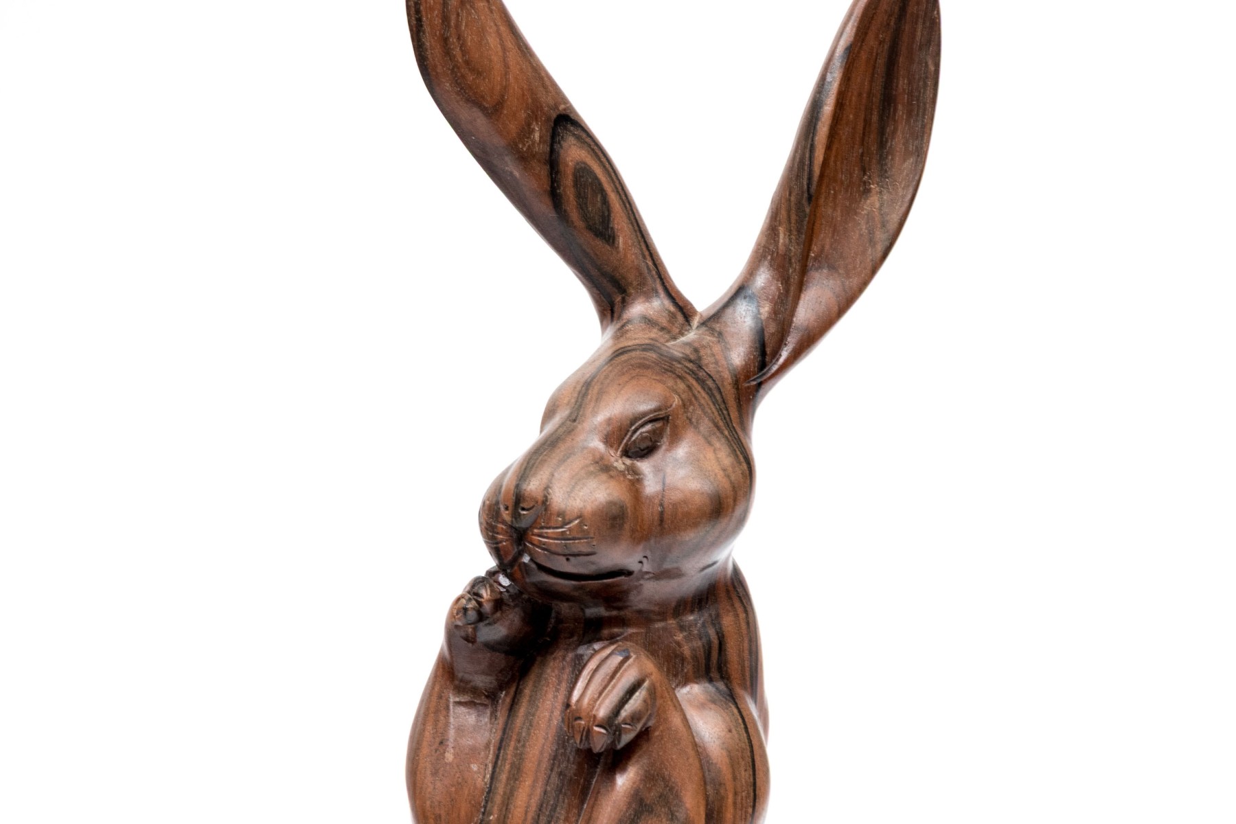 A delightful Hadi Handicraft rabbit figure carved from gorgeous warm-toned brown wood with striking dark brown wood grain. The rabbit poses seated on its hind legs with paws curled up by its face, its long ears extending far into the air. Beautifully crafted with great detail throughout. Affixed with a sticker label underfoot.