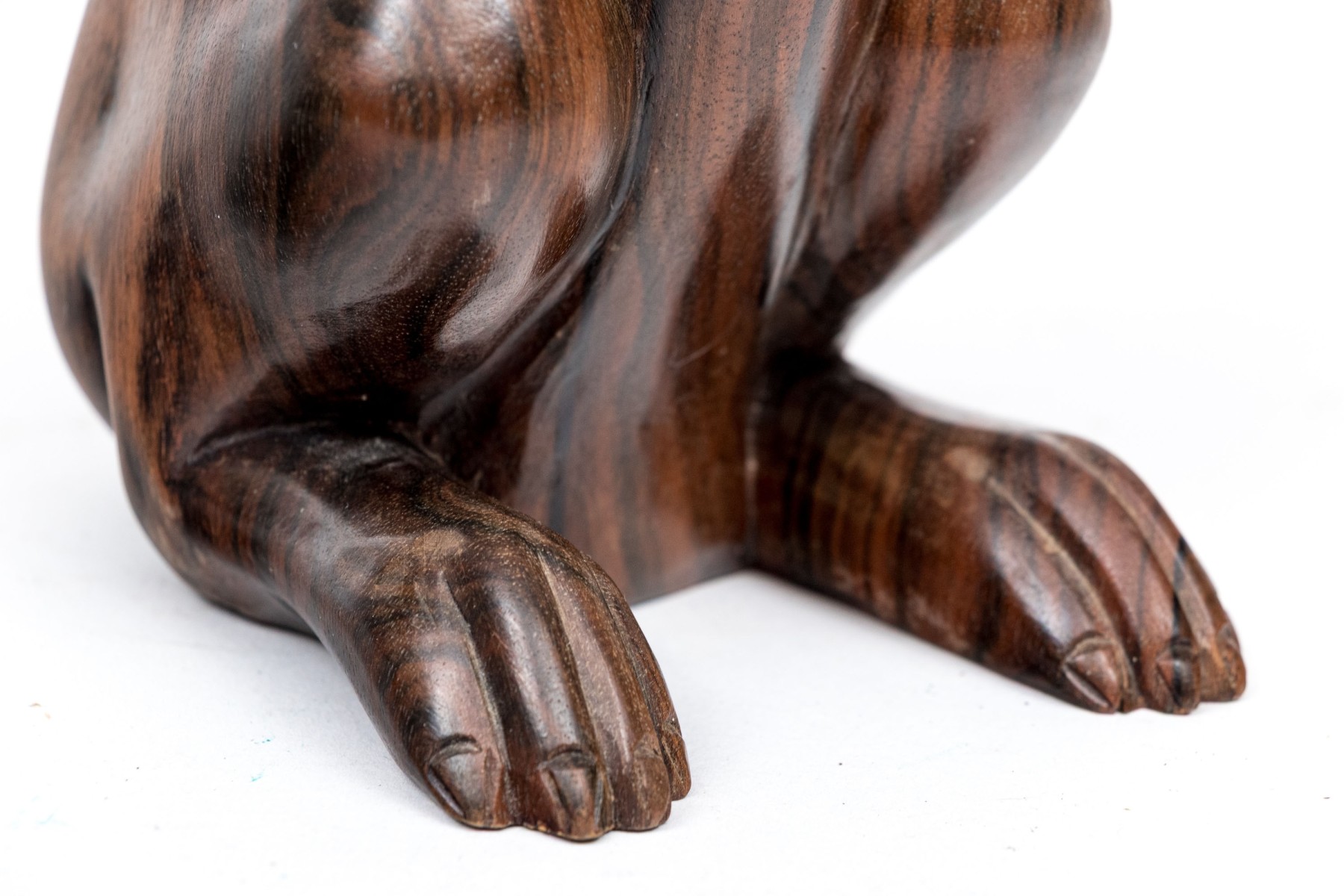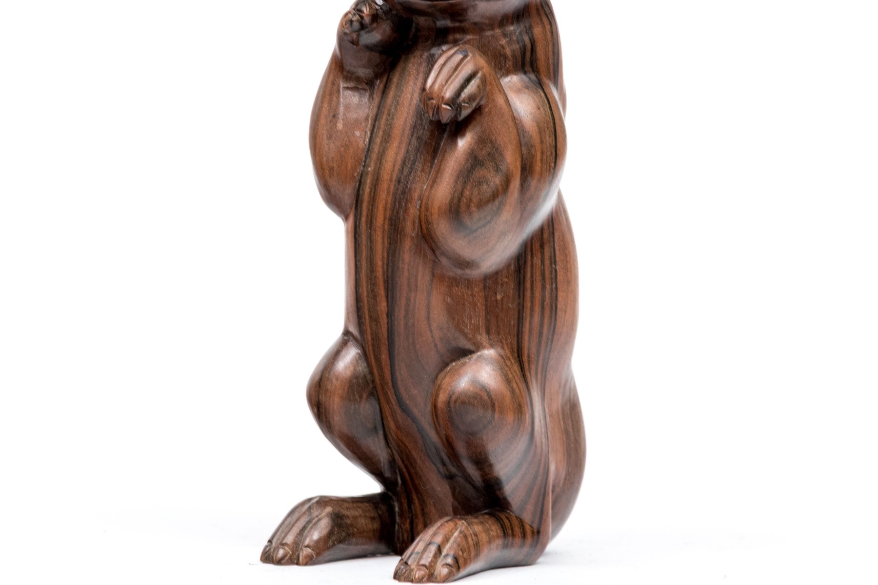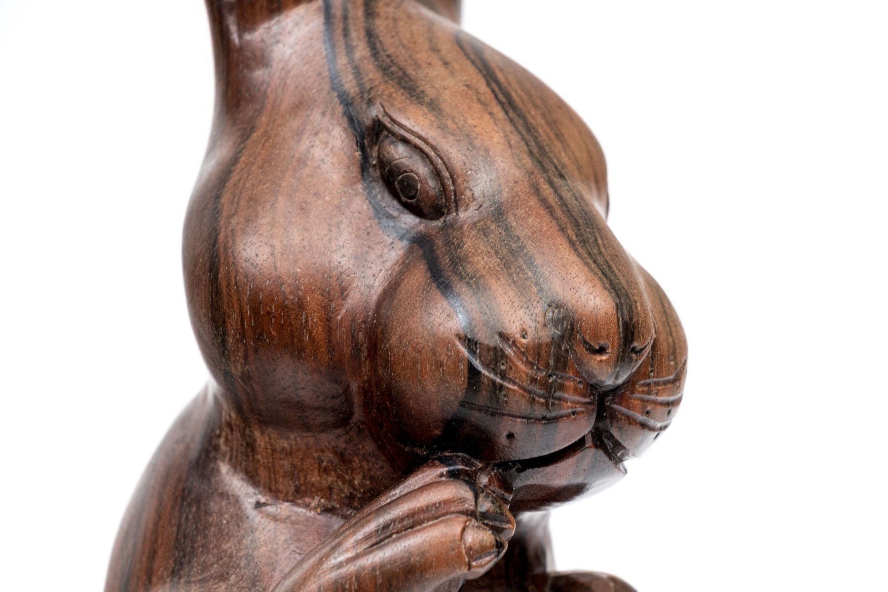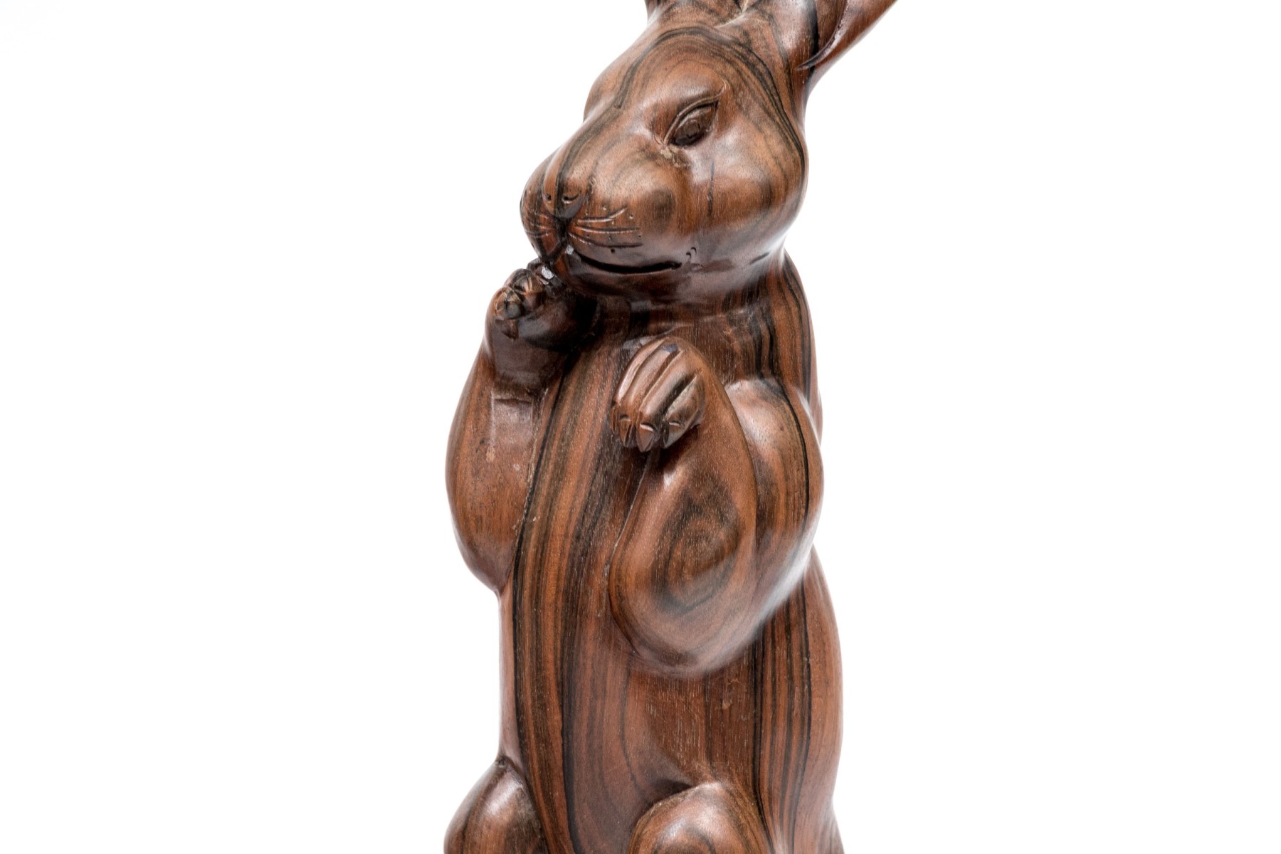 A delightful Hadi Handicraft rabbit figure carved from gorgeous warm-toned brown wood with striking dark brown wood grain. The rabbit poses seated on its hind legs with paws curled up by its face, its long ears extending far into the air. Beautifully crafted with great detail throughout. Affixed with a sticker label underfoot.