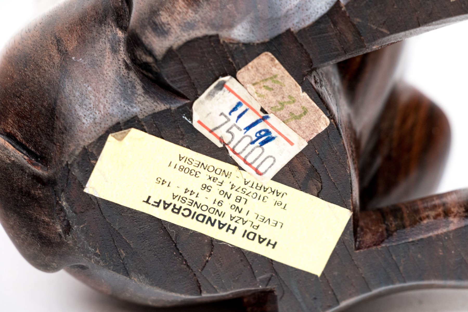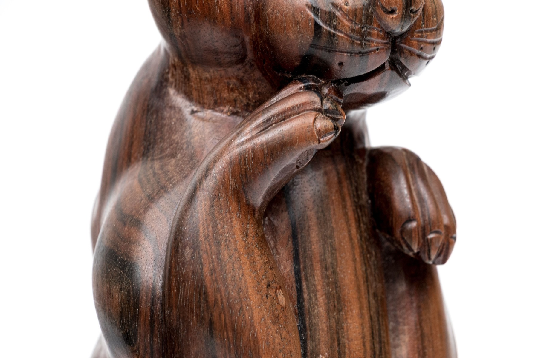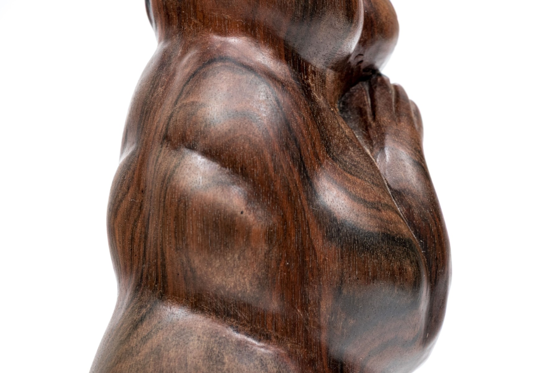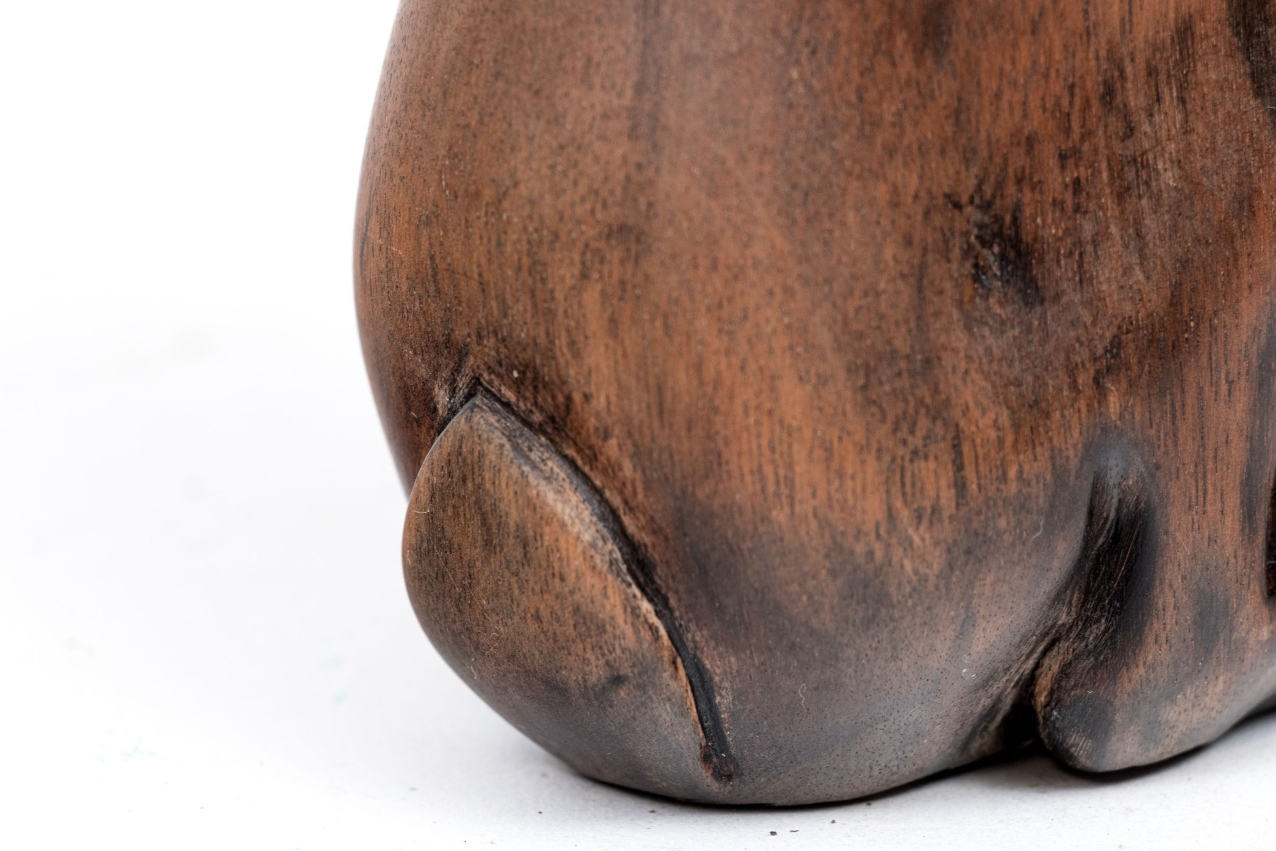 A delightful Hadi Handicraft rabbit figure carved from gorgeous warm-toned brown wood with striking dark brown wood grain. The rabbit poses seated on its hind legs with paws curled up by its face, its long ears extending far into the air. Beautifully crafted with great detail throughout. Affixed with a sticker label underfoot.