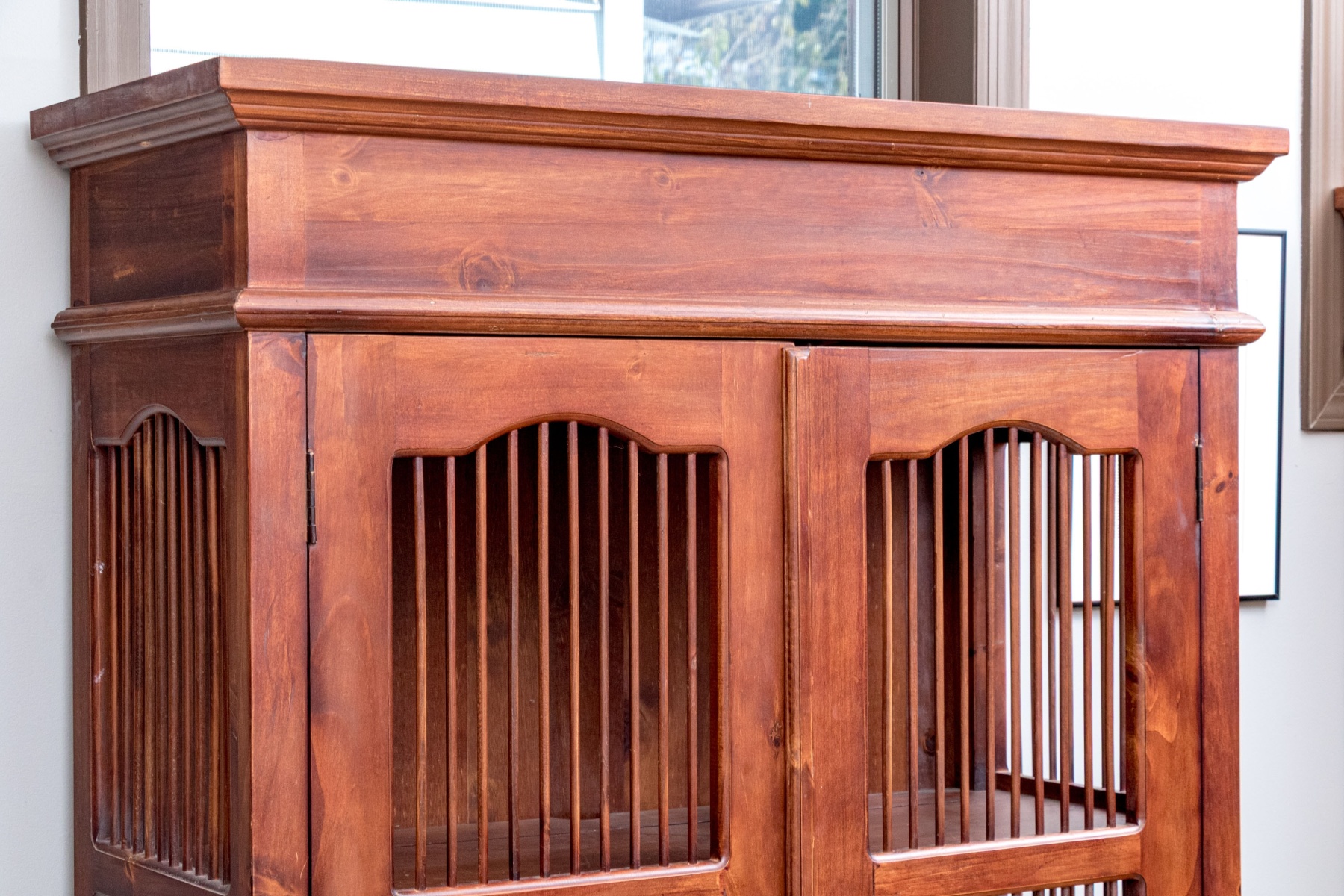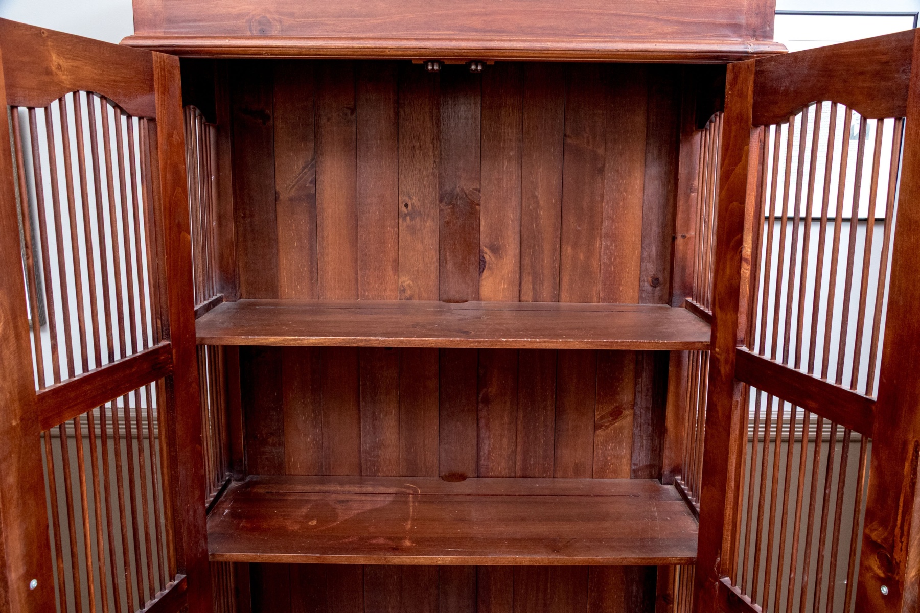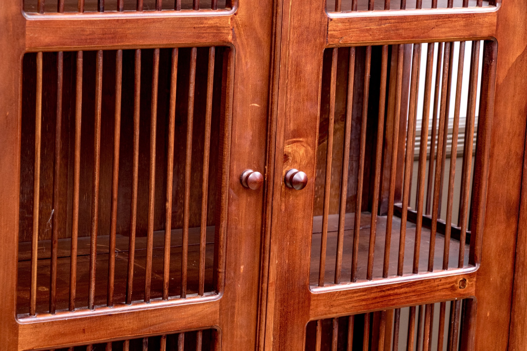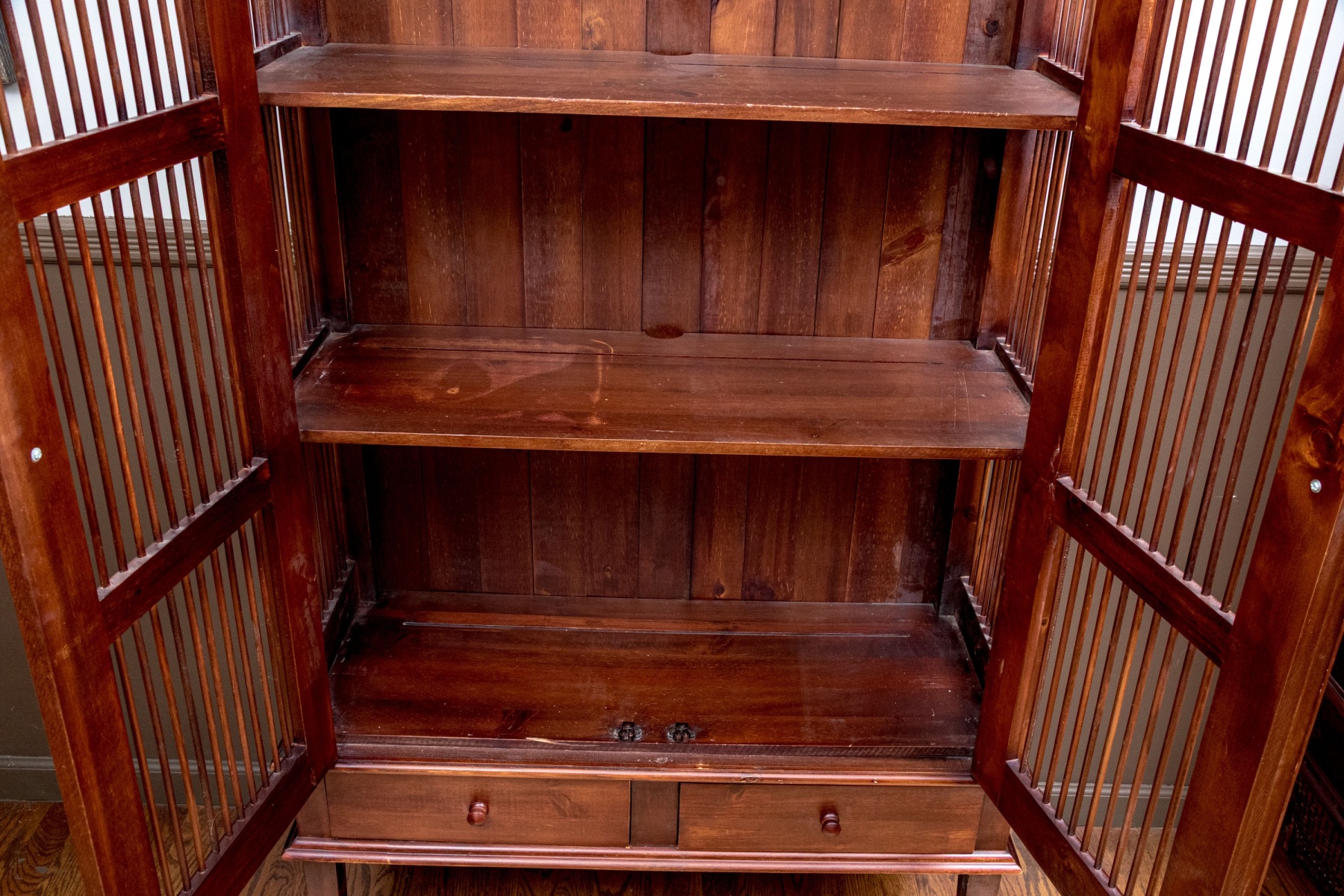 A stylish bookcase with great Indonesian flair, likely Pier 1 Imports, well crafted in warm-toned red-brown wood with a moulded crown overhanging double doors and sides with dowel rails lending a charming birdcage appearance. Doors open to three wood shelves within, leading down to two drawers below supported by straight, tapered legs.