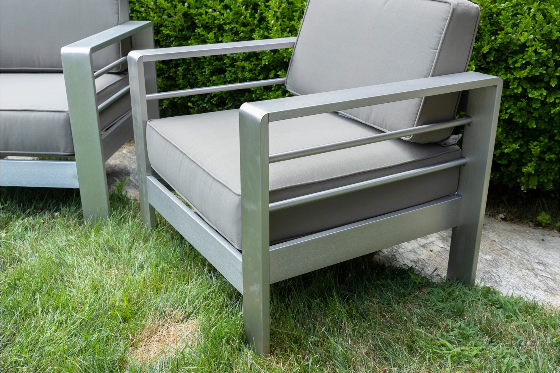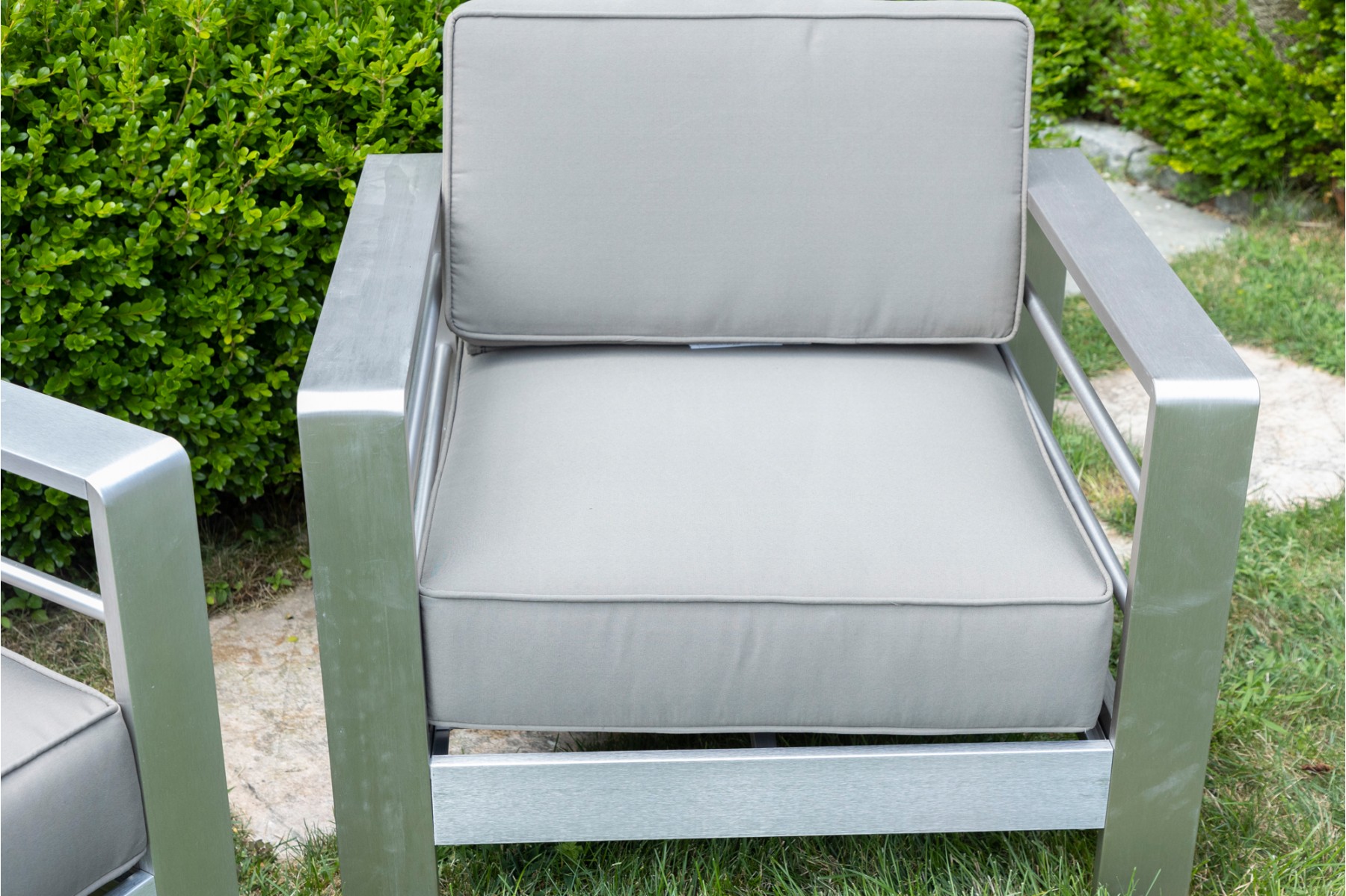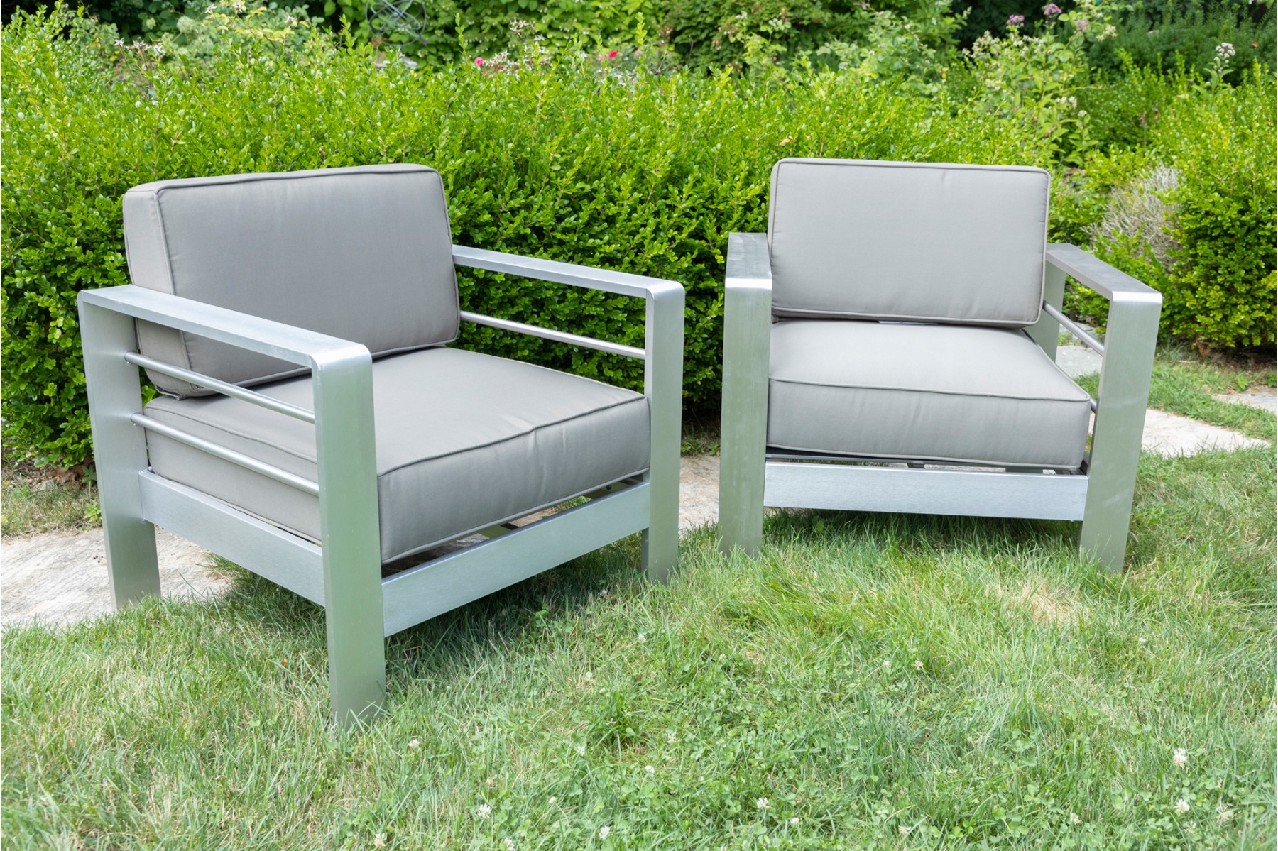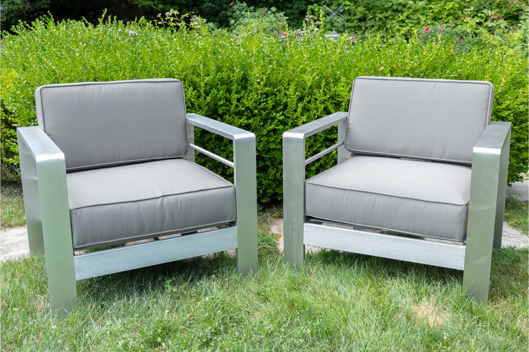 Modern, club chairs provide comfortable seating options both inside and out. These chairs, with a sturdy metal frame, crafted in a sophisticated silver finish, have water-resistant detachable cushions in a taupe color. The covers can be removed for easy cleaning. The back cushions have a Velcro flap that adheres to the back of the seat cushions, keeping them in place. There are matching sofas in this auction.