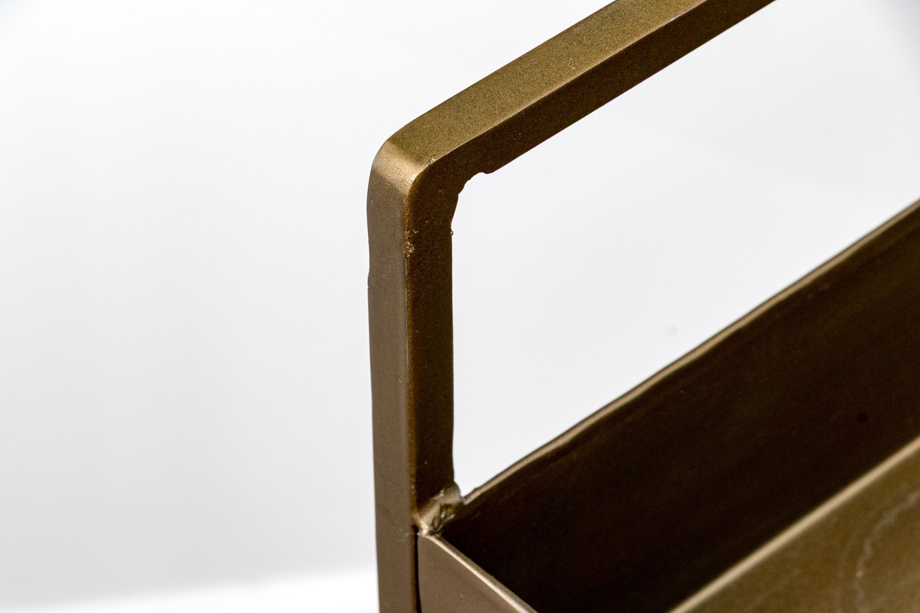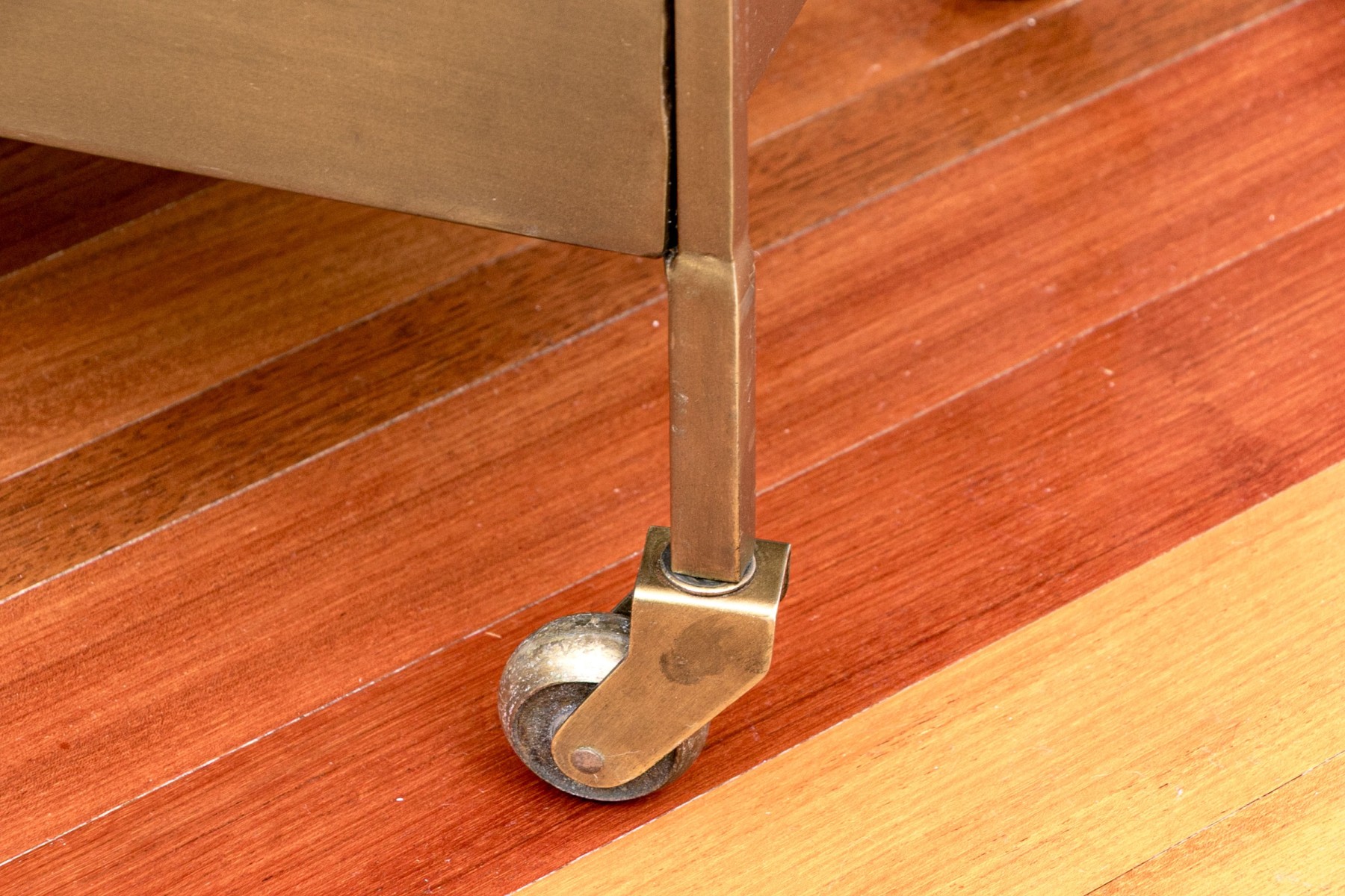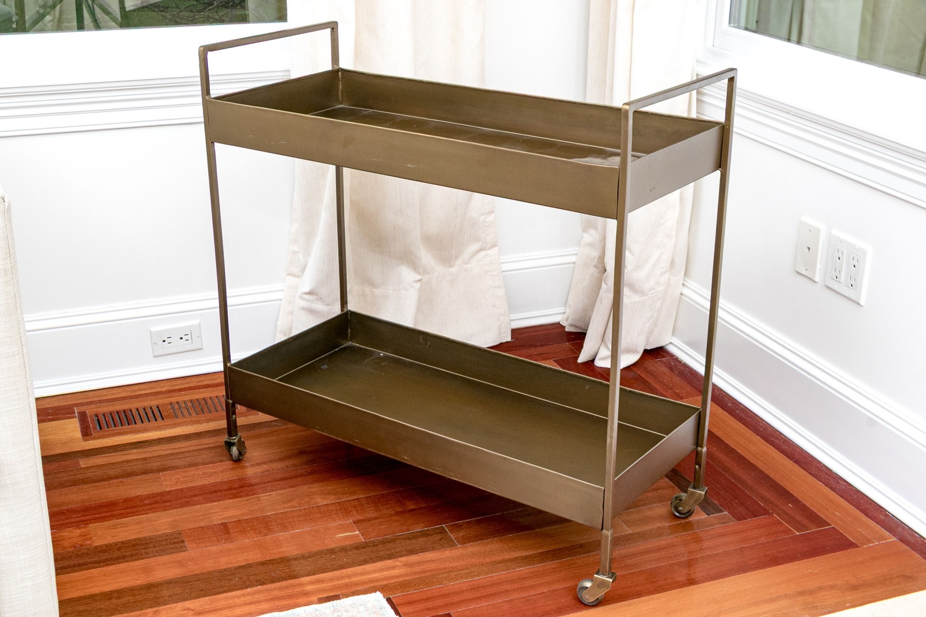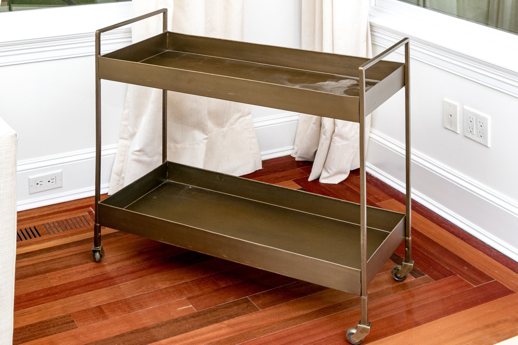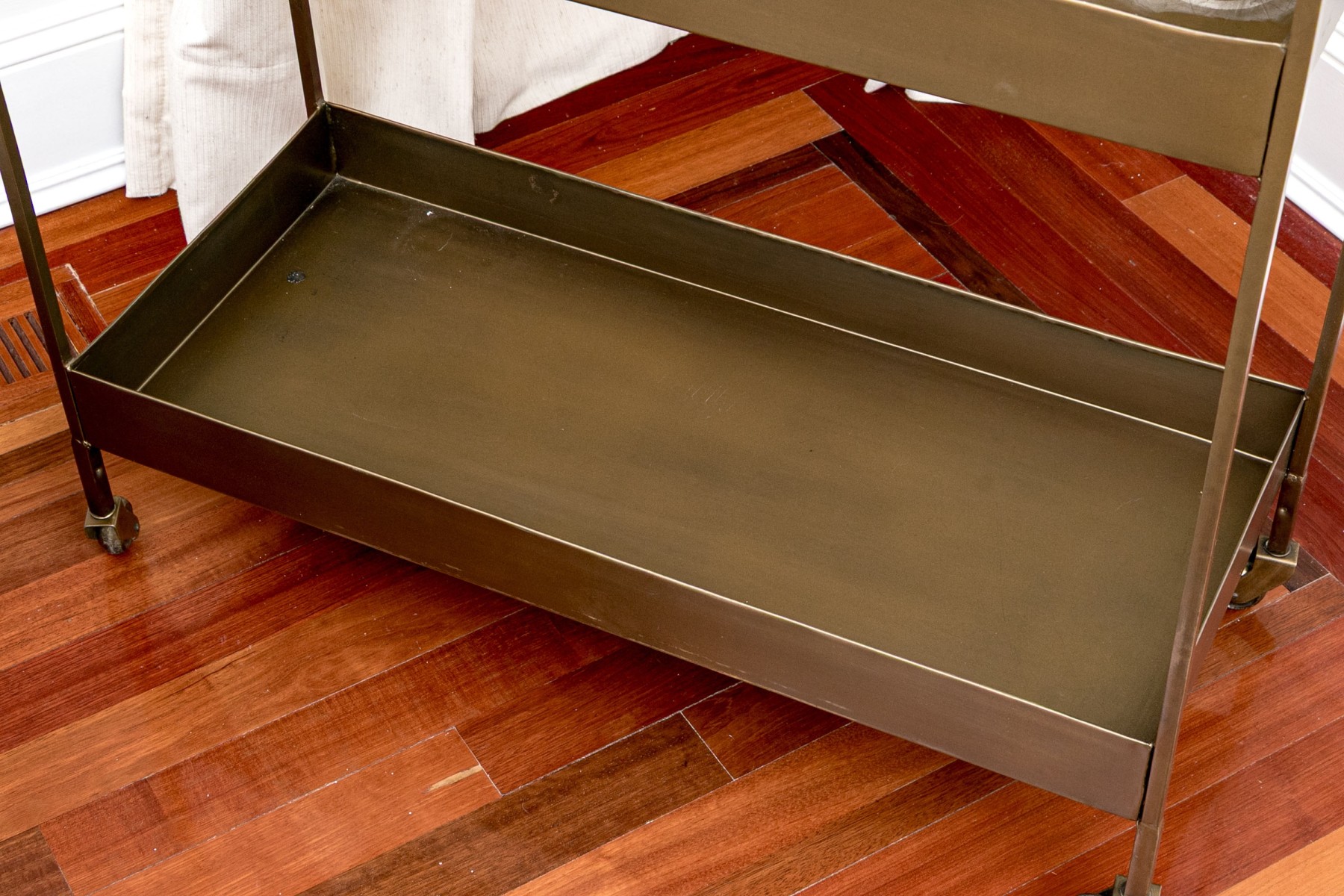 A fabulous two-tier bar cart with a great antiqued brass tone, showcasing a minimalist rectangular design with gently rounded corners on the handles seamlessly transitioning into the legs before terminating over casters. The sleek design lends itself perfectly to an industrial chic aesthetic with a touch of understated Art Deco appeal.