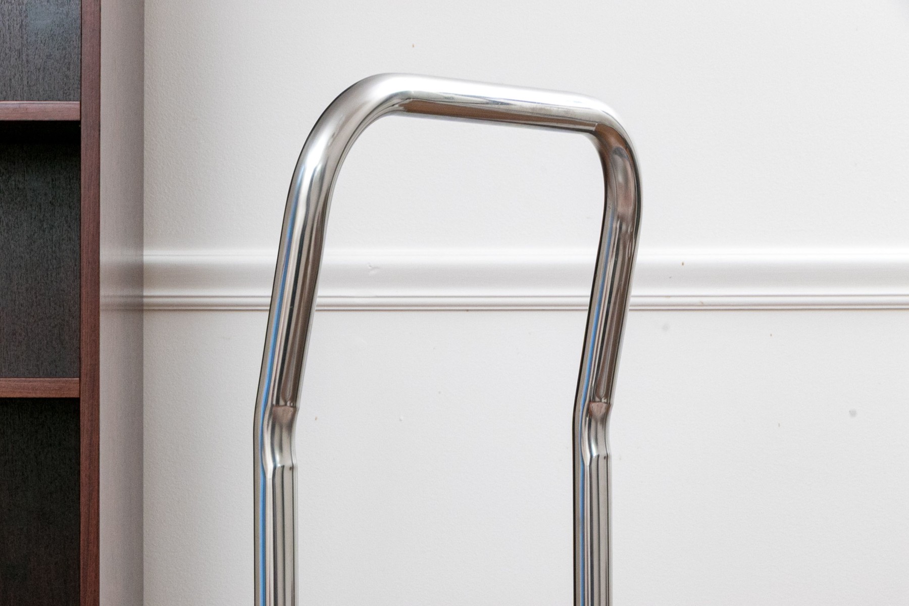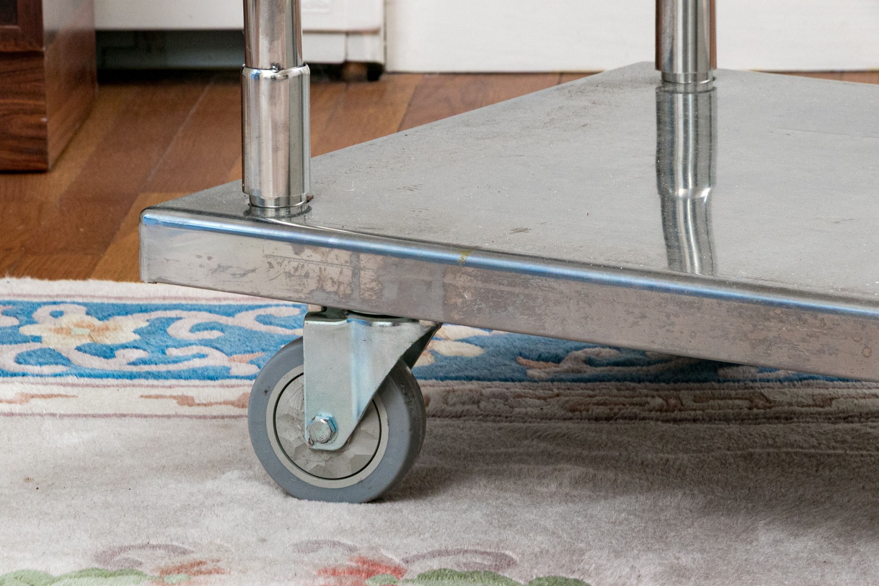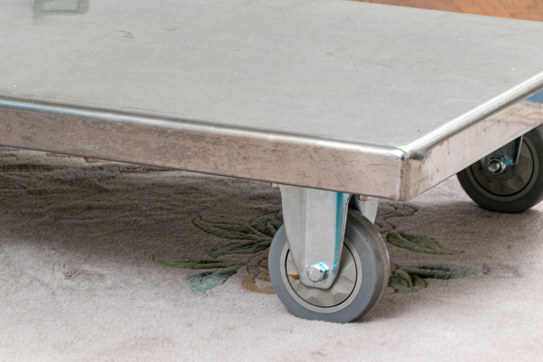 A useful industrial quality steel dolly on four wheels, two which swivel. The dolly features a rectangular frame and a handlebar to one end.