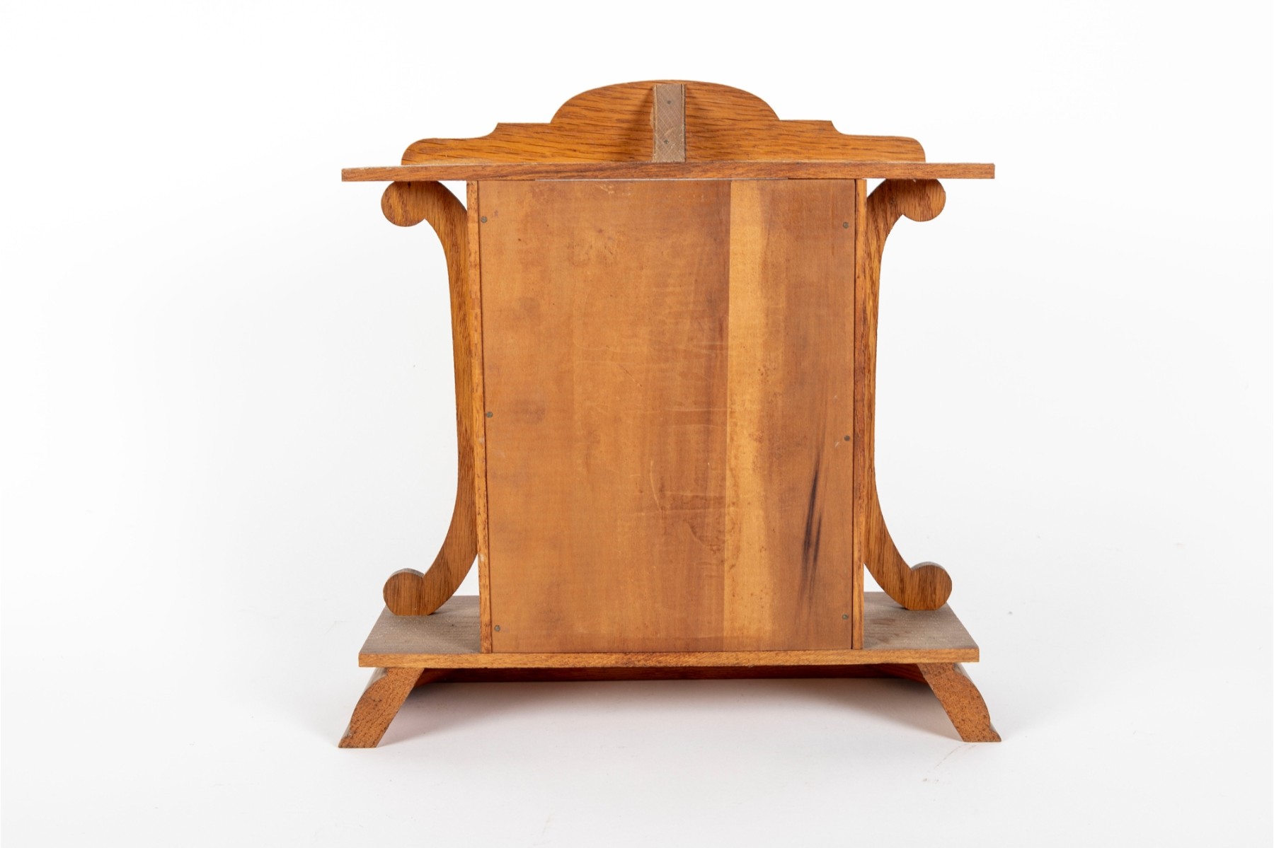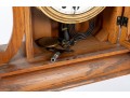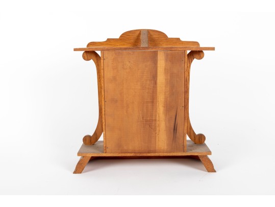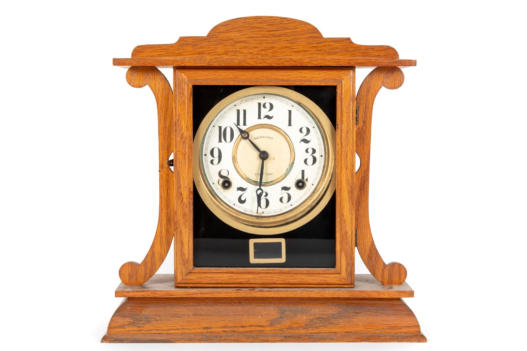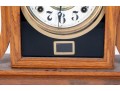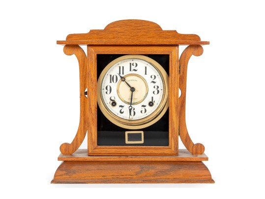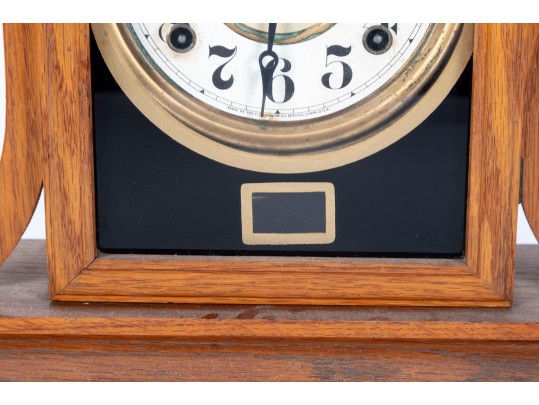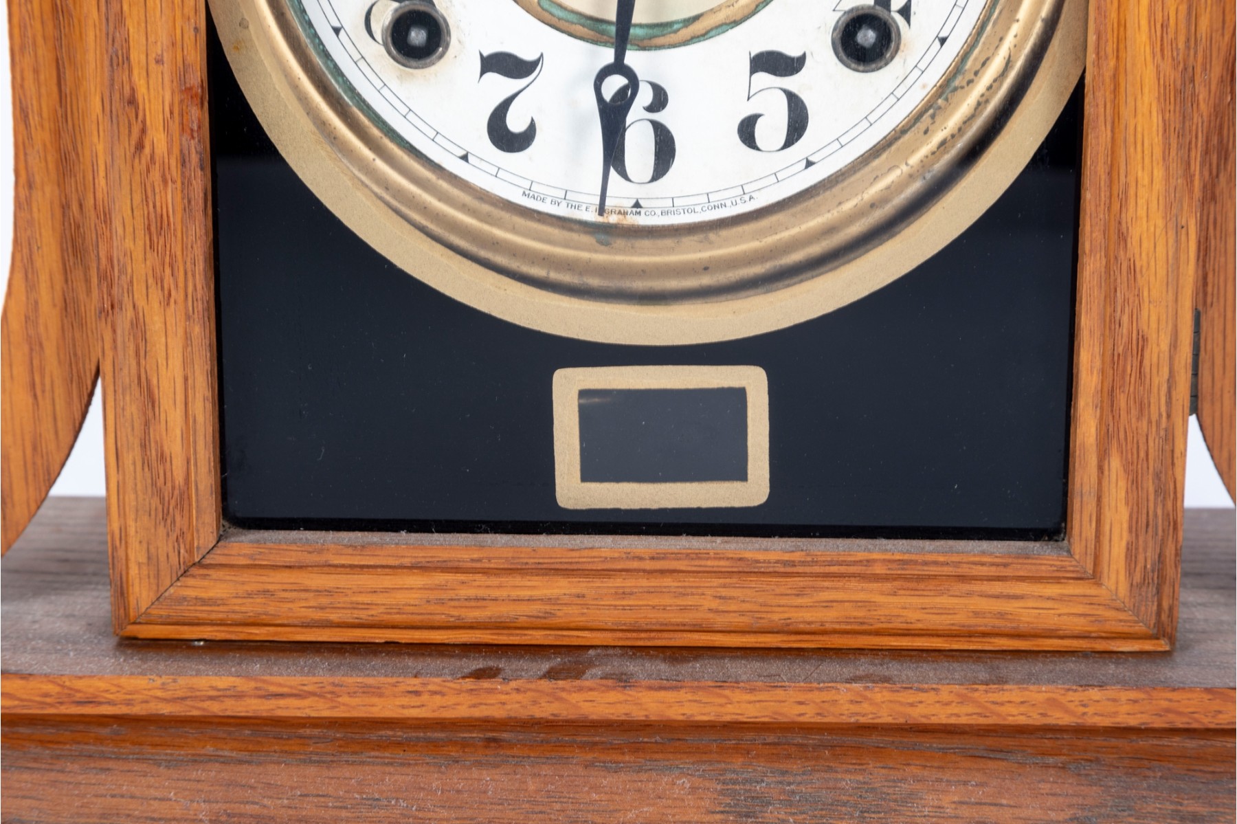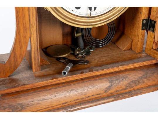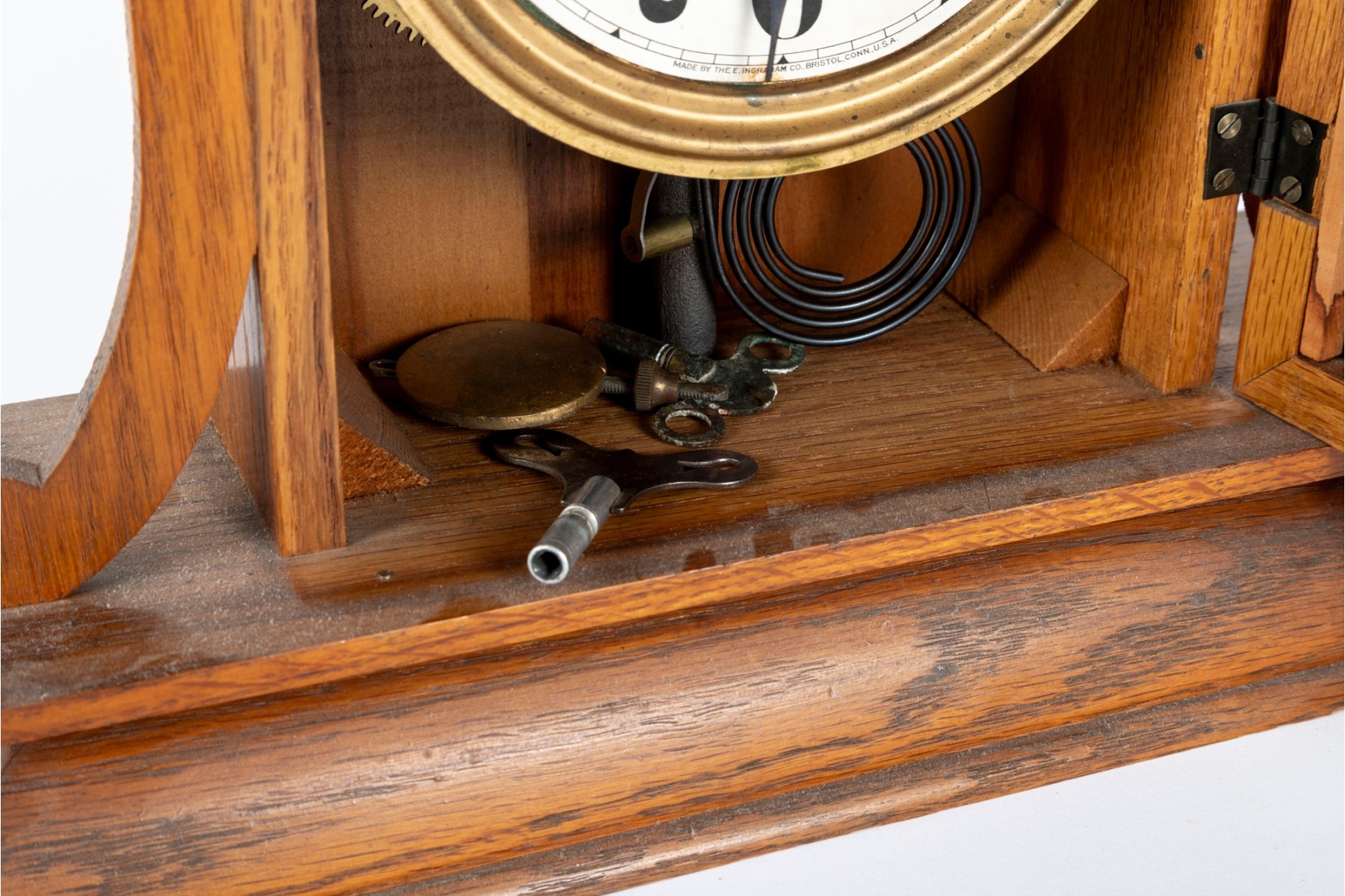 An antique Ingraham eight-day mantel clock with oak wood case, handsomely scrolled with decorative trim. Key and pendulum included.