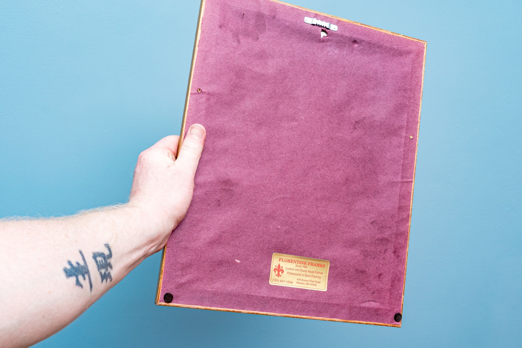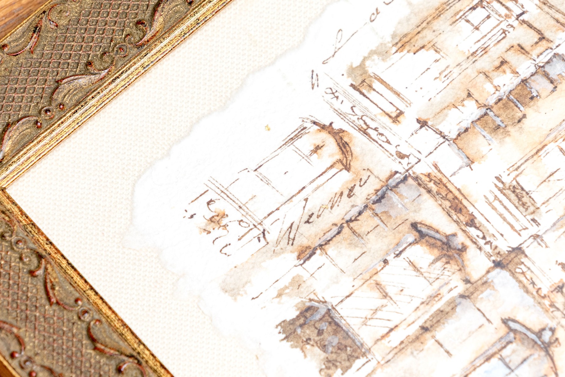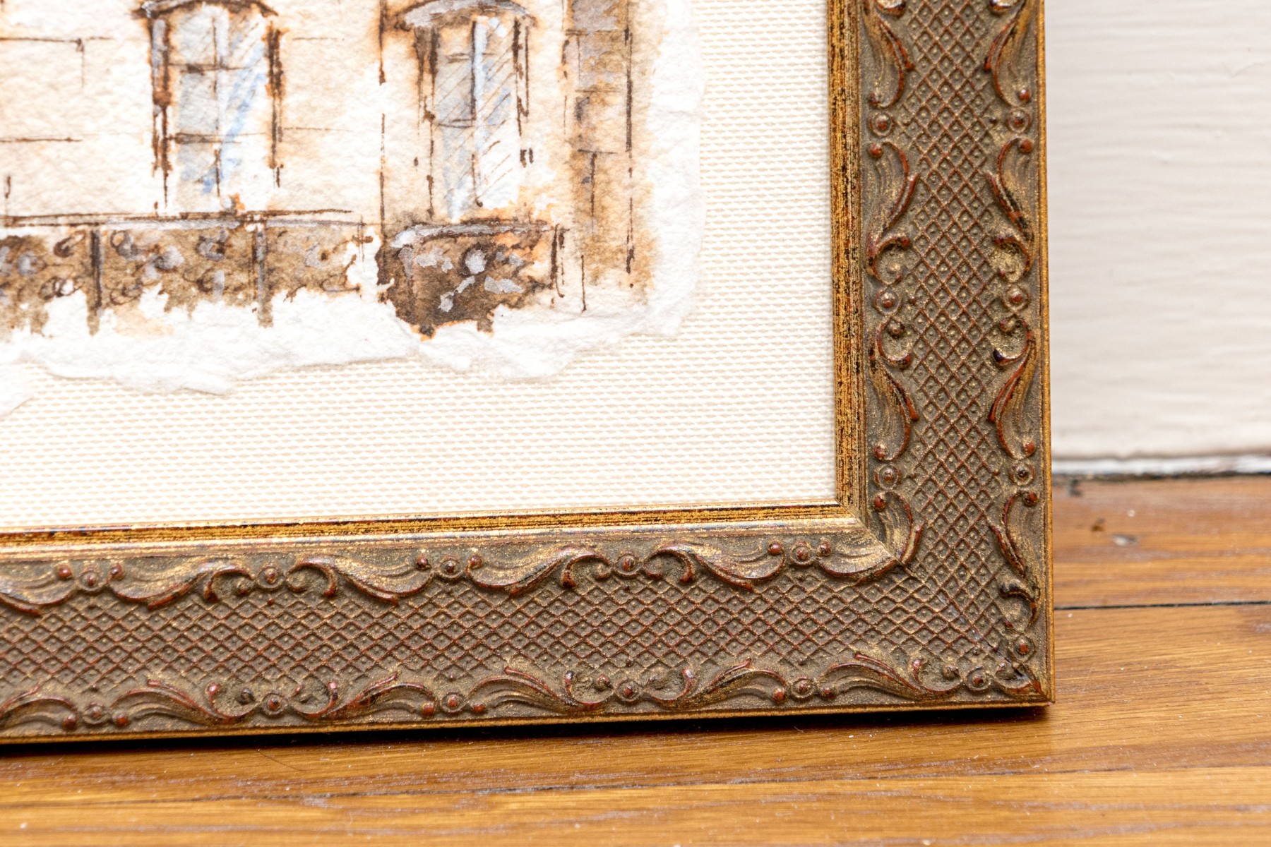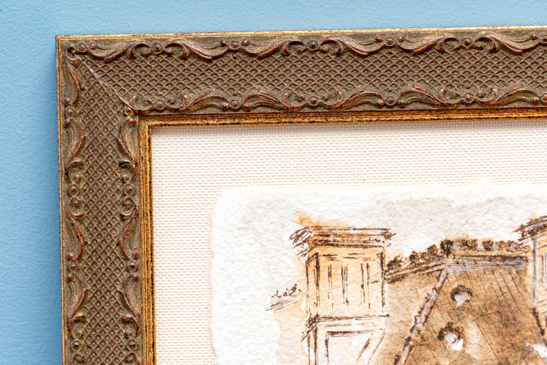 The paper is mounted to a canvas backing and displayed in a gilt frame with textural relief.