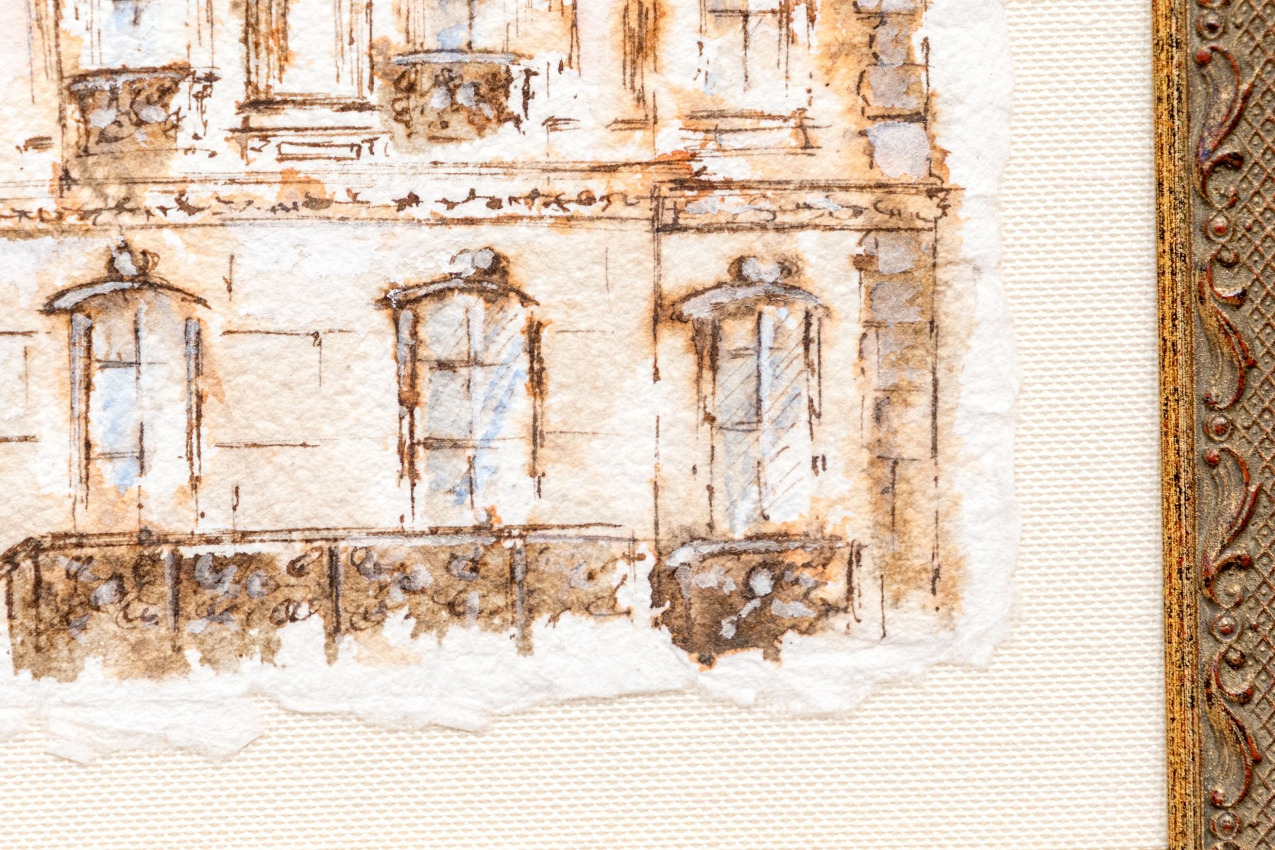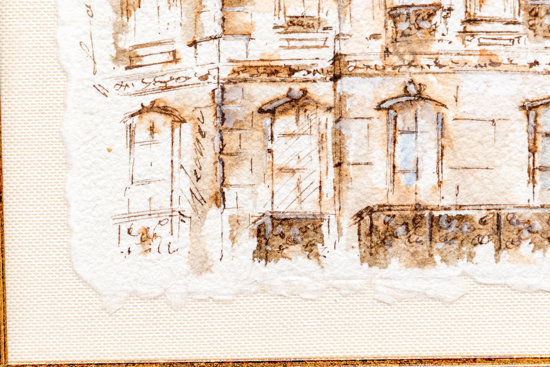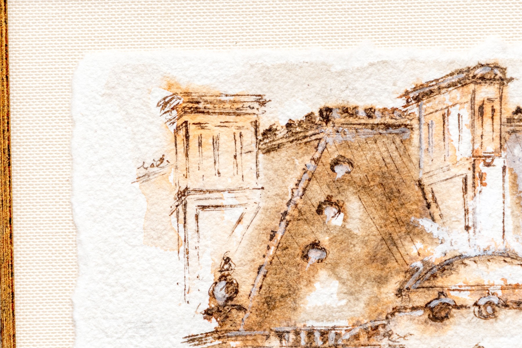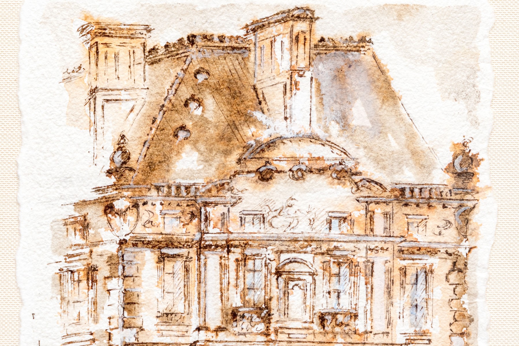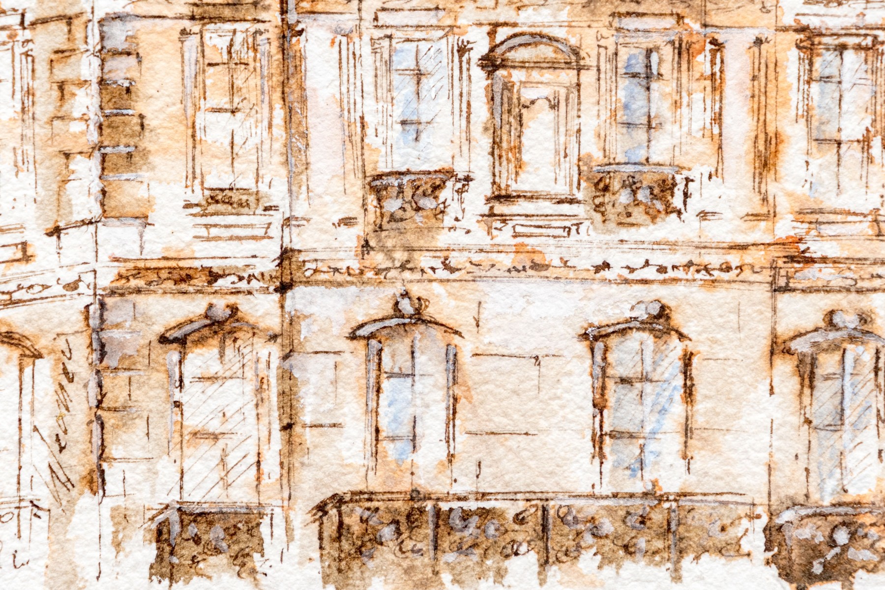 A gorgeous ink and wash illustration on paper depicting a multi-story stone building with tall, narrow chimneys and a tall roof at the top. Rendered in warm brown with hints of blue.