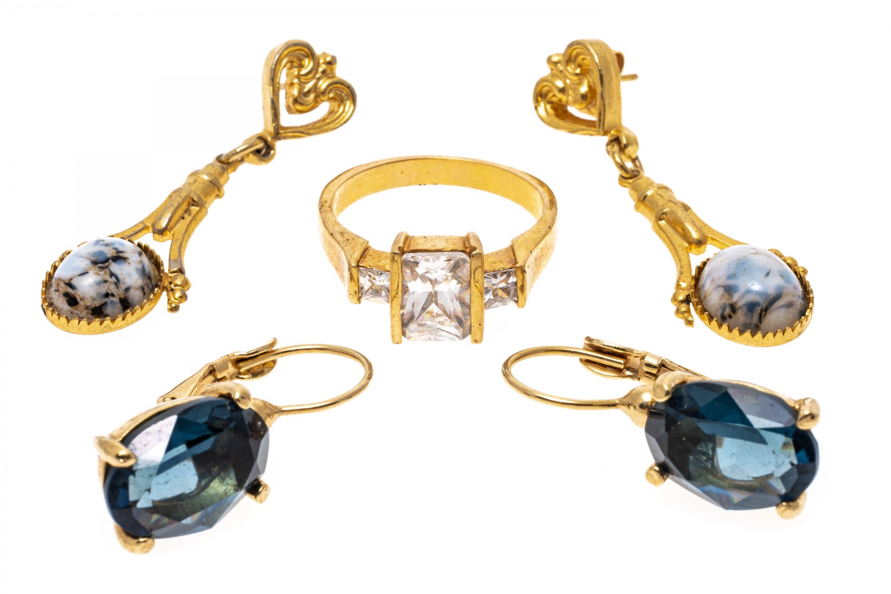 Small and interesting group of costume jewelry. A pair of drop earrings with an oval cabochon cut piece at the base (post backing). A pair of earrings with bright blue synthetic stone earrings (hook and leaver backings) and a ring with a white cubic zirconia (size 7).