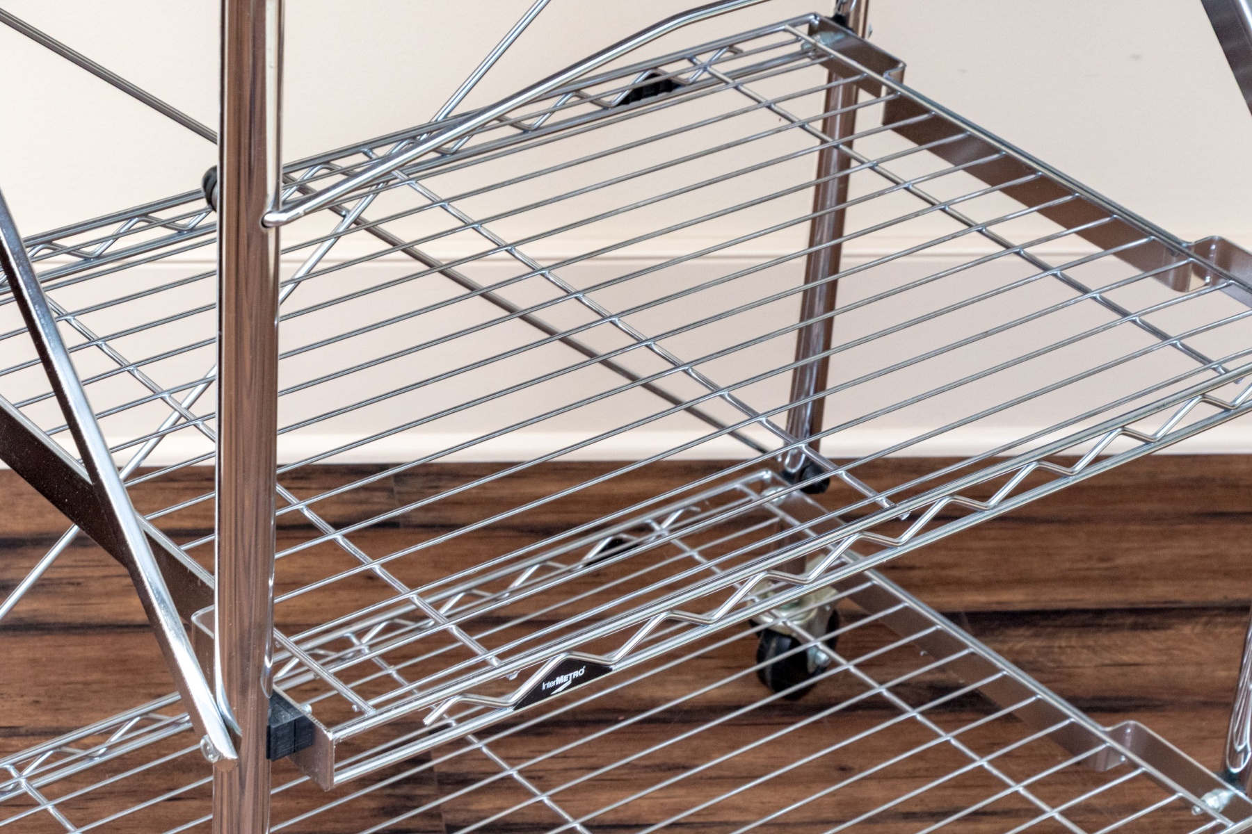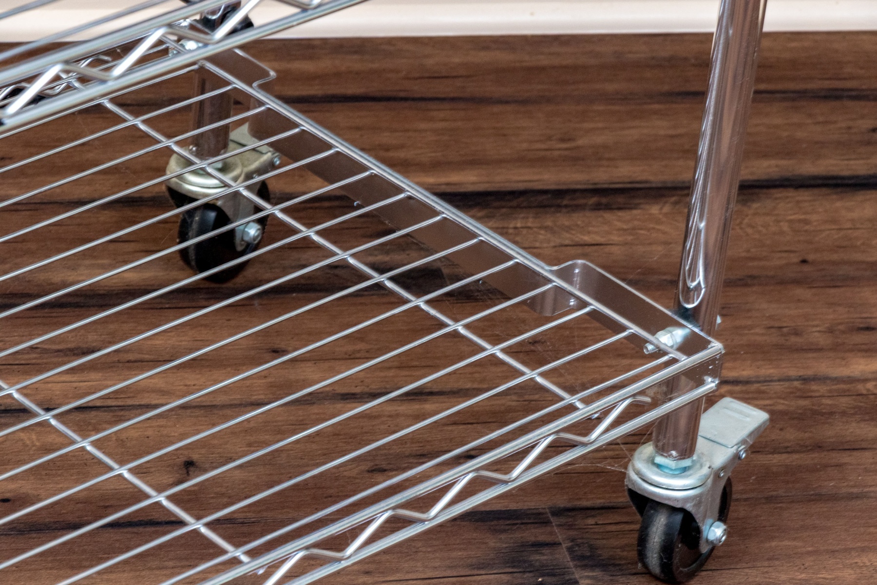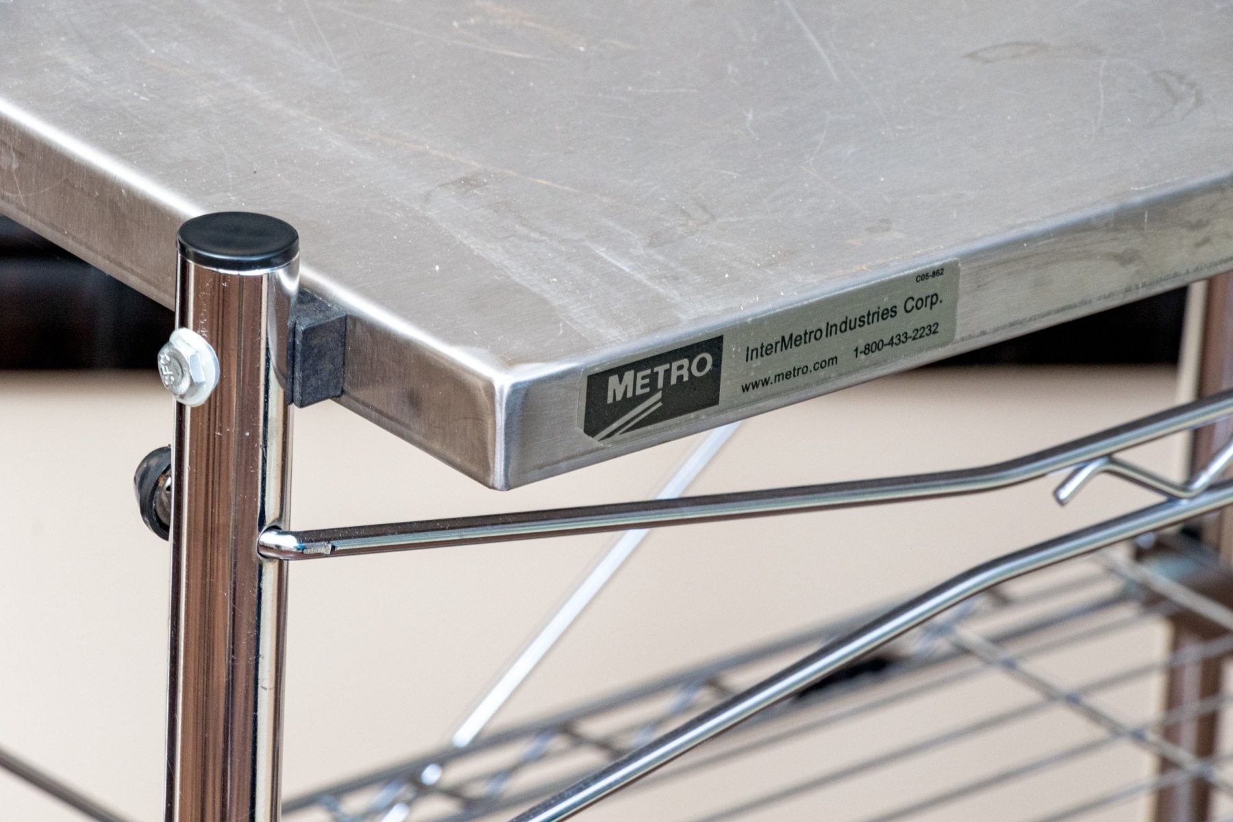 A handy utilitarian Intermetro kitchen cart in gray stainless steel metal, designed with a solid rectangular top and two rack tiers below. Raised on casters for easy mobility.